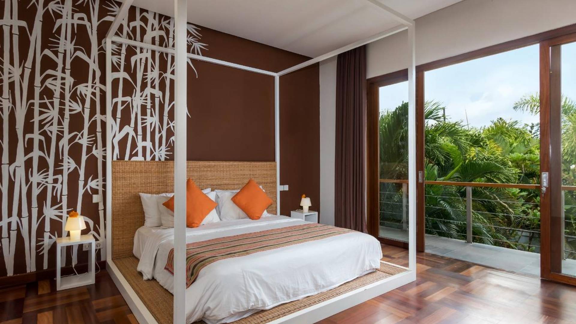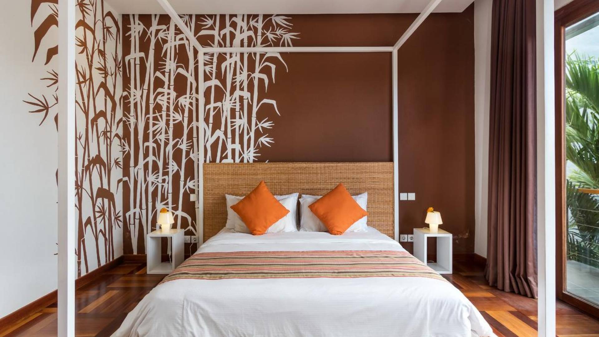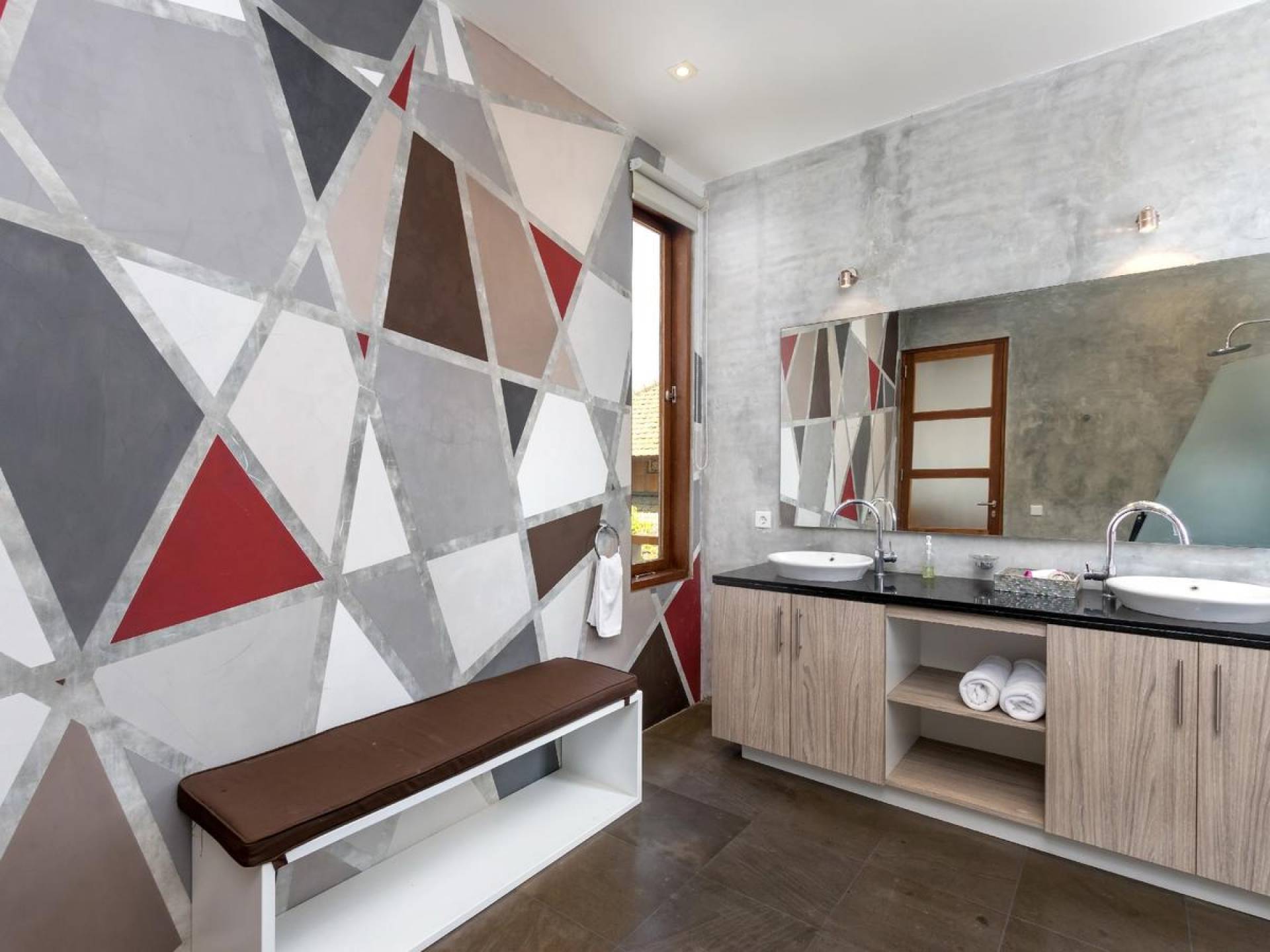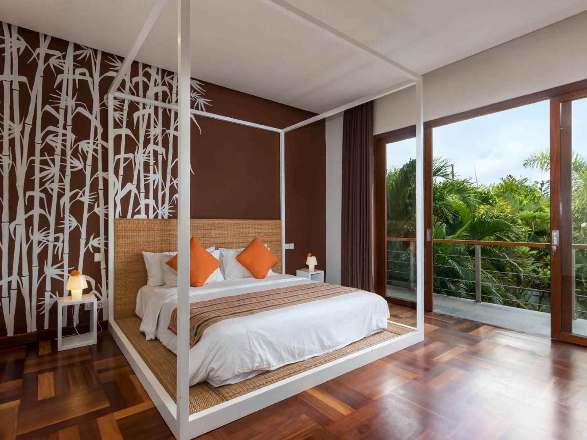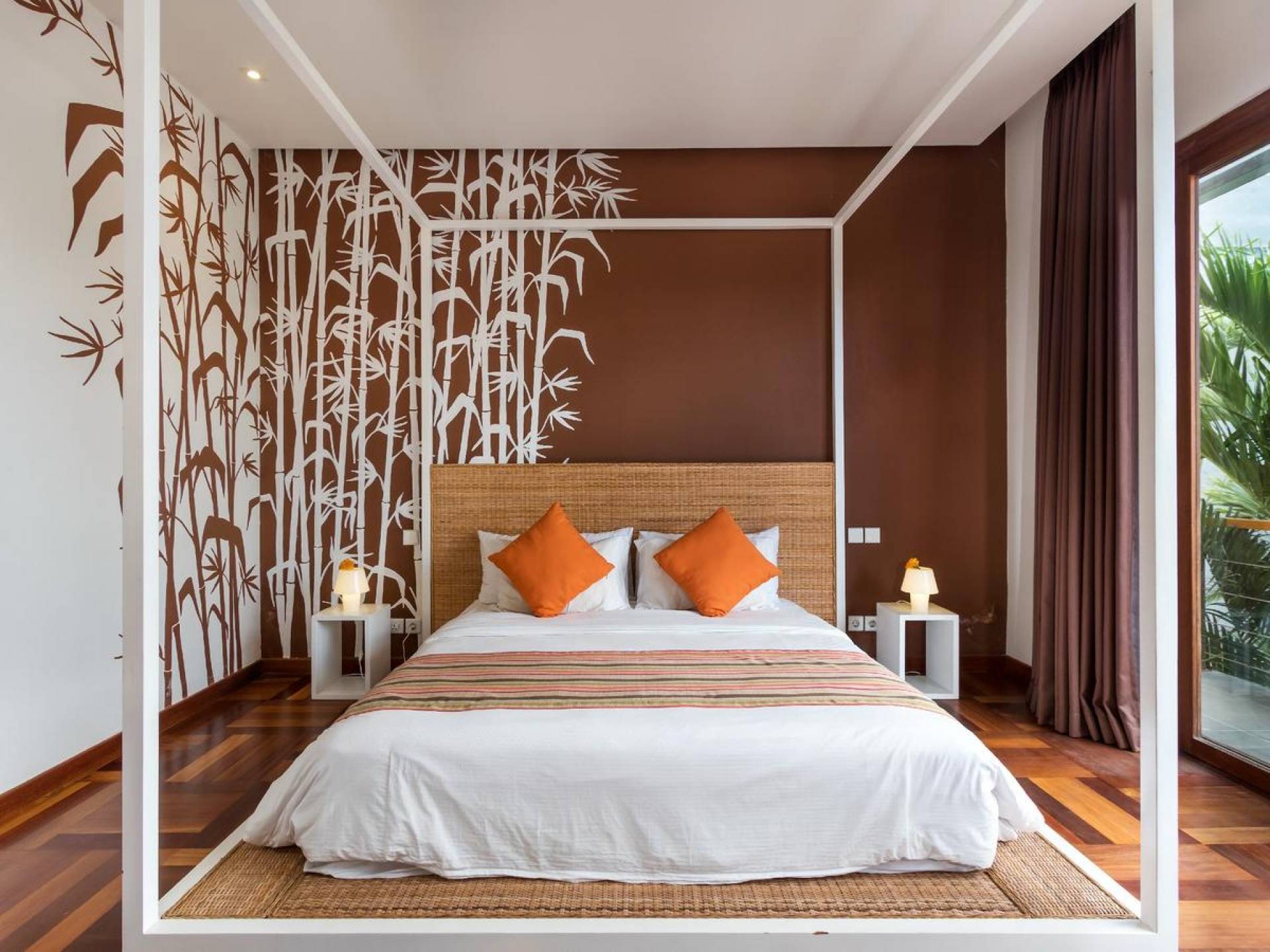 Next door, you will find Villa Casa Cinta 2 - the 3-bedroom twin sister of Casa Cinta 1 and they can be rented out together for larger traveling groups. The interior design is of Villa Casa Cinta 1 is chic and contemporary. There is a lounge/entertainment corner, a dining area, and a well-equipped state-of-the-art kitchen. From the comfy cushioned sofas, you can sit back to enjoy the garden view (in air-conditioned comfort that is!), or you can watch movies on the flat-screen cable TV with 60 international channels. A stack of DVDs and board games are provided for endless family fun. The timber dining table for 6 stands on an oriental carpet, next to a floor-to-ceiling mural painting of a tree.