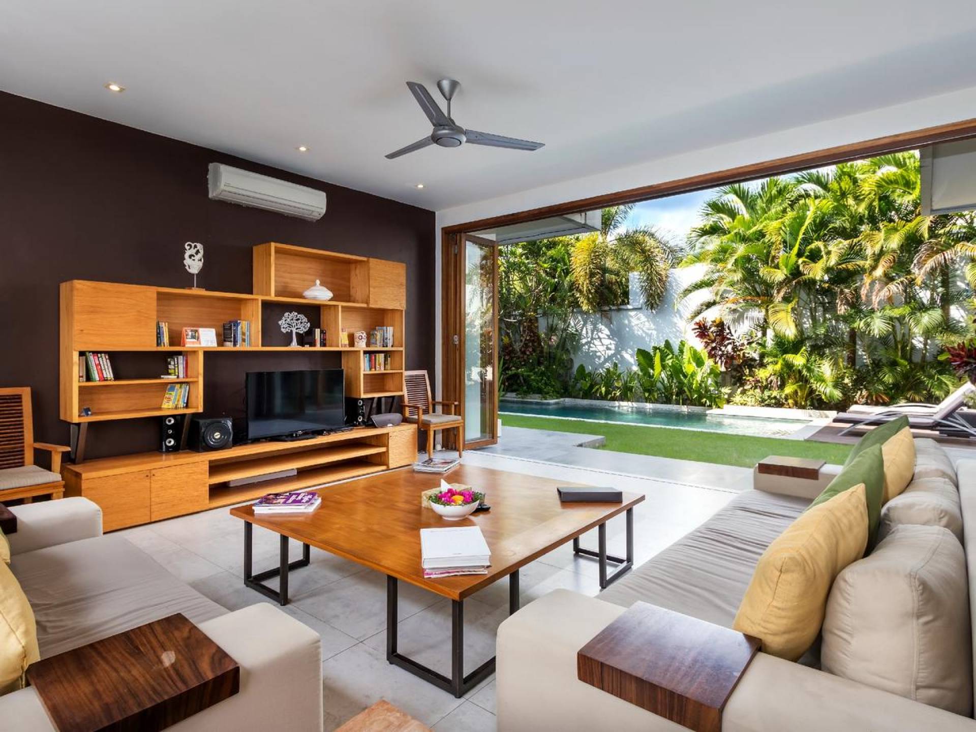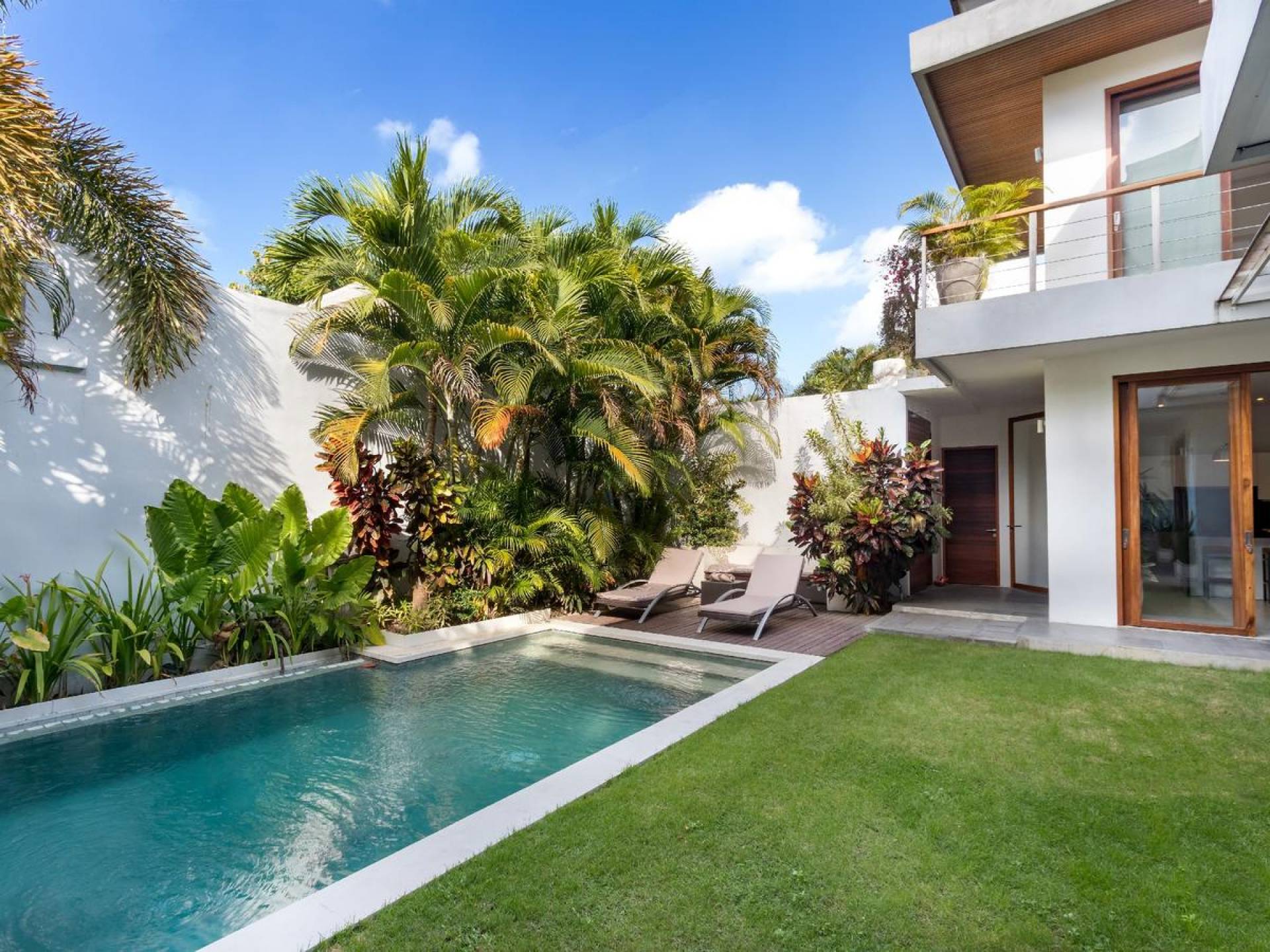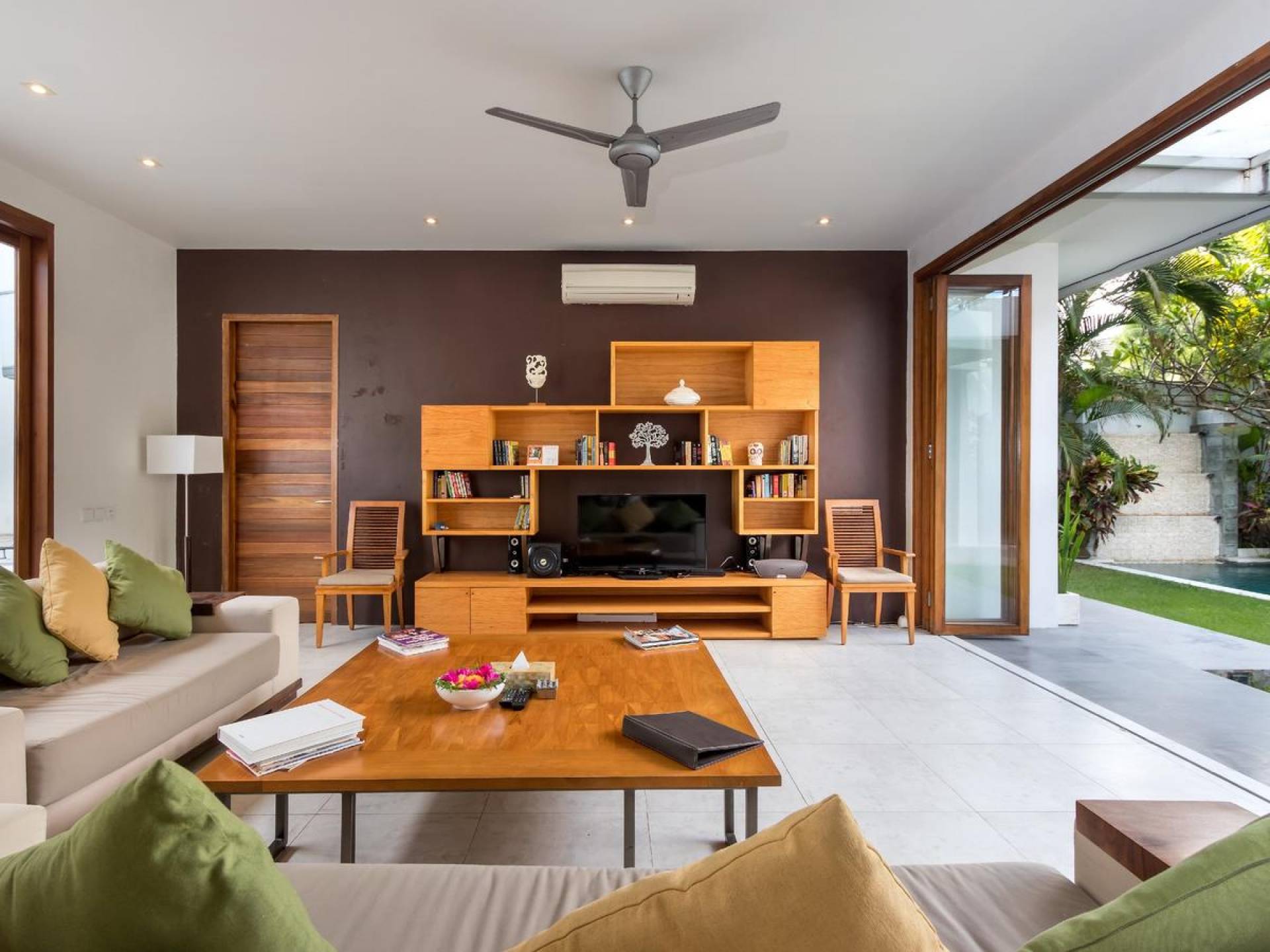The chic, contemporary kitchen comes with a bar and 3 stools to sit and have coffee in the morning, beers in the afternoon, and cocktails in the evening. The air-conditioned living room is easily configured into a tropical open-plan living space, giving almost direct access to the pool and the long chairs under the sun. Upon the first floor, there is another lounge area, furnished with a pull-out sofa-bed and a library of books. The walled garden is tropical as can be, featuring green foliage growing lushly by the side of the crystal clear, glistening swimming pool. The waterfall feature tops it off. The sound of rippling water certainly adds to the tranquil ambiance of this luxury oasis of Batu Belig.