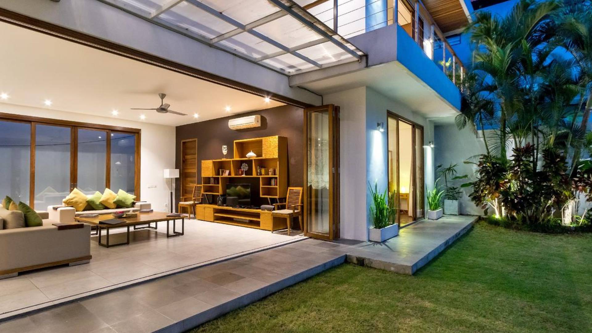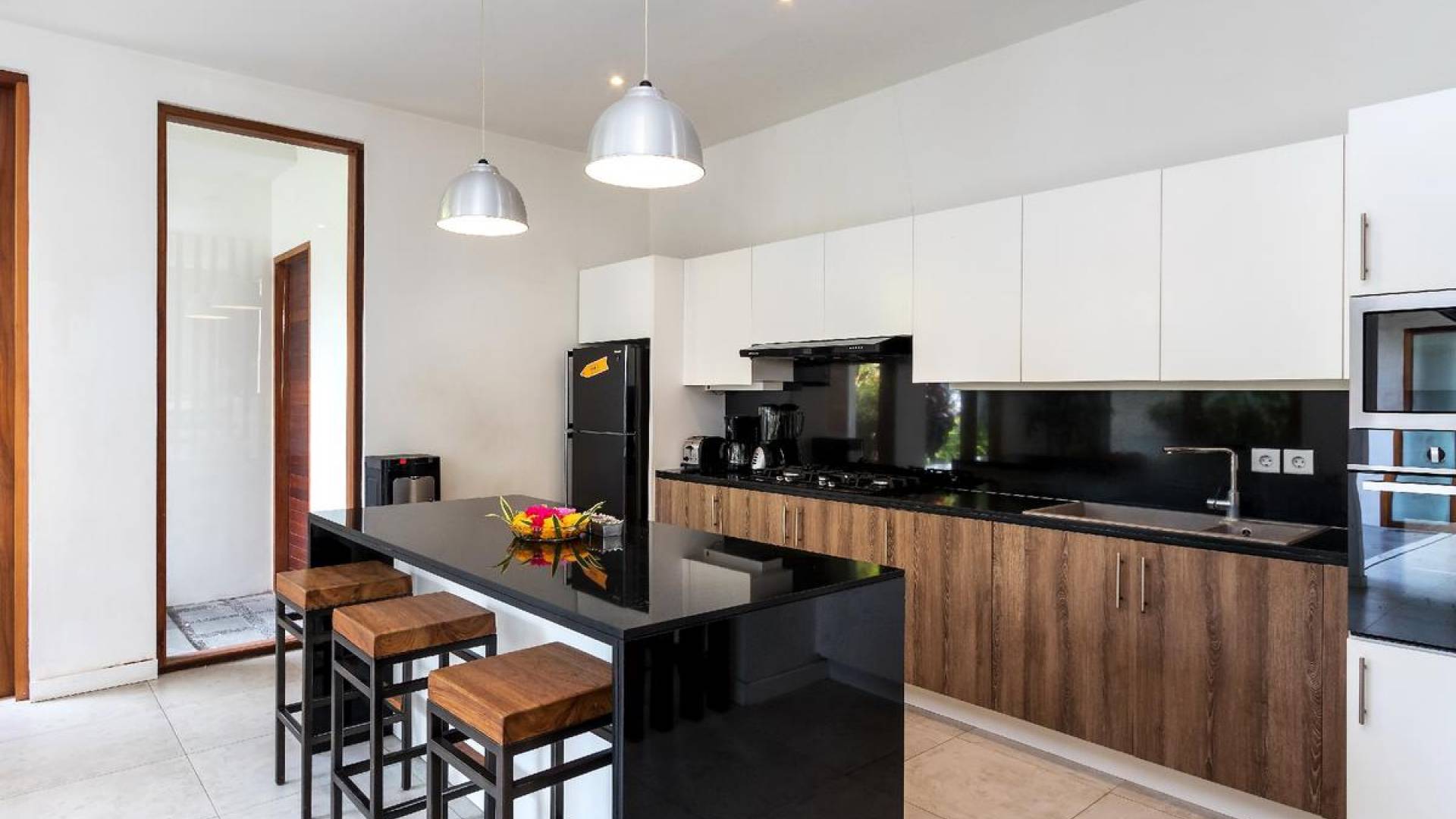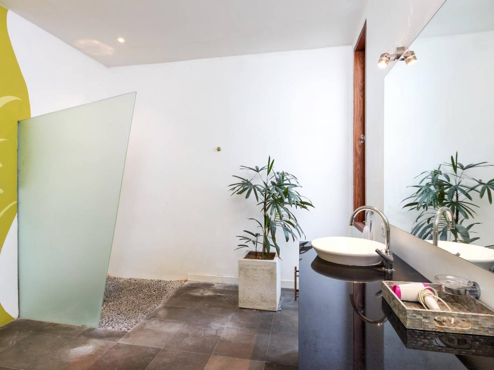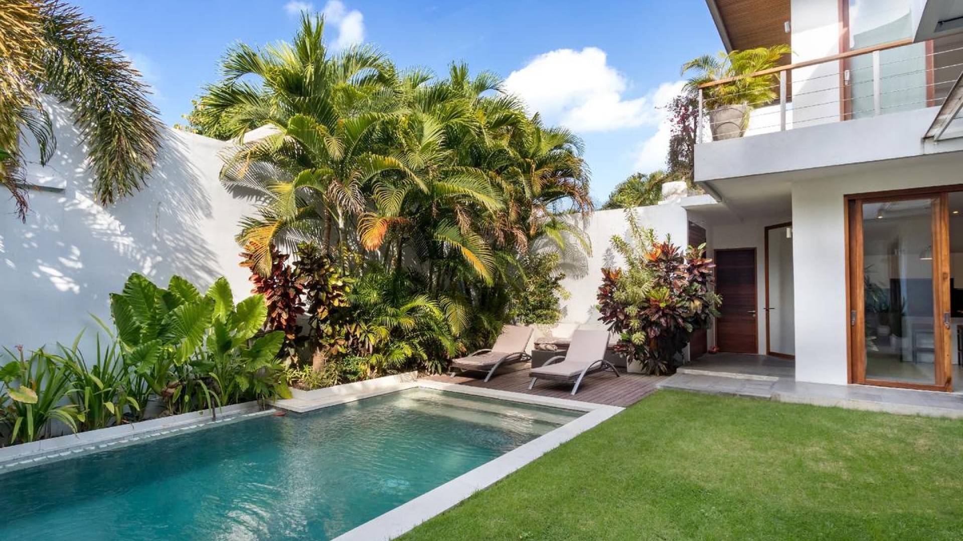 The chic, contemporary kitchen comes with a bar and 3 stools to sit and have coffee in the morning, beers in the afternoon, and cocktails in the evening. The air-conditioned living room is easily configured into a tropical open-plan living space, giving almost direct access to the pool and the long chairs under the sun. Upon the first floor, there is another lounge area, furnished with a pull-out sofa-bed and a library of books. The walled garden is tropical as can be, featuring green foliage growing lushly by the side of the crystal clear, glistening swimming pool. The waterfall feature tops it off. The sound of rippling water certainly adds to the tranquil ambiance of this luxury oasis of Batu Belig.