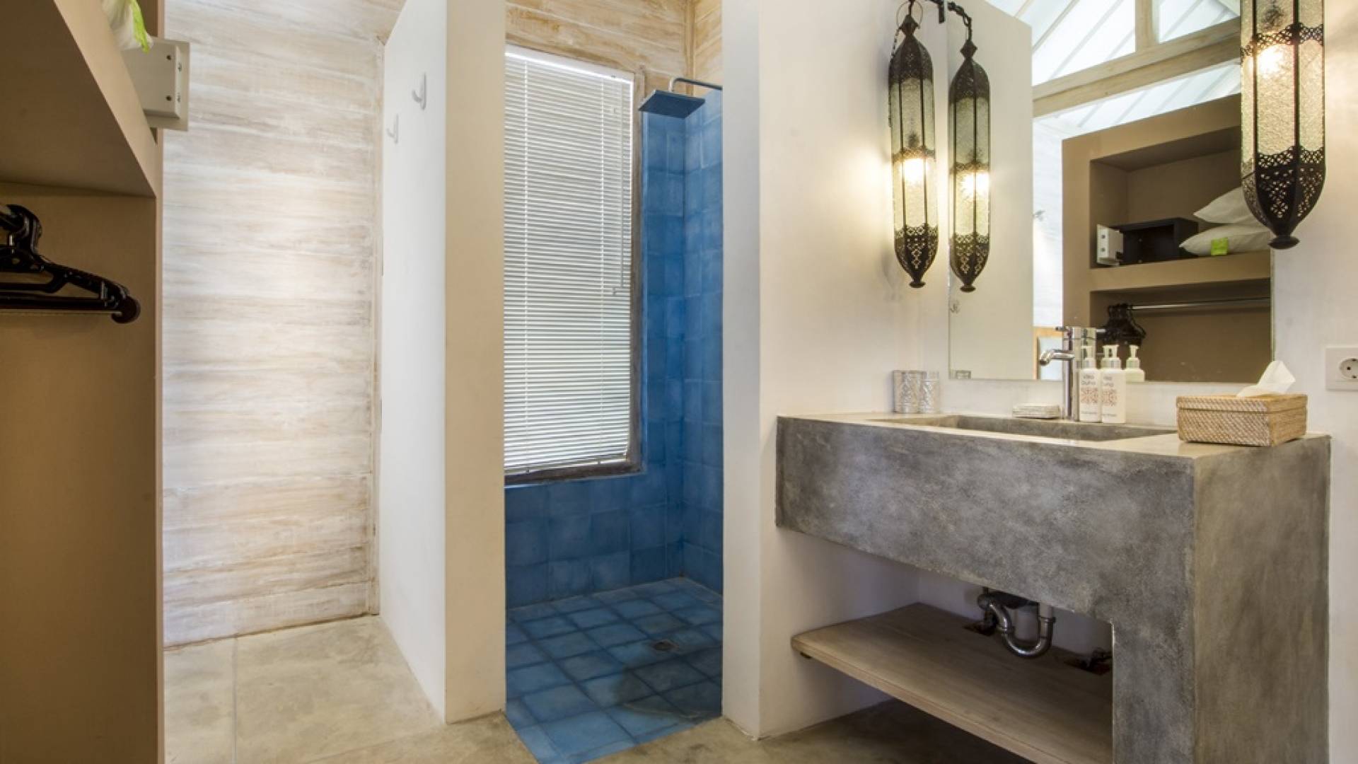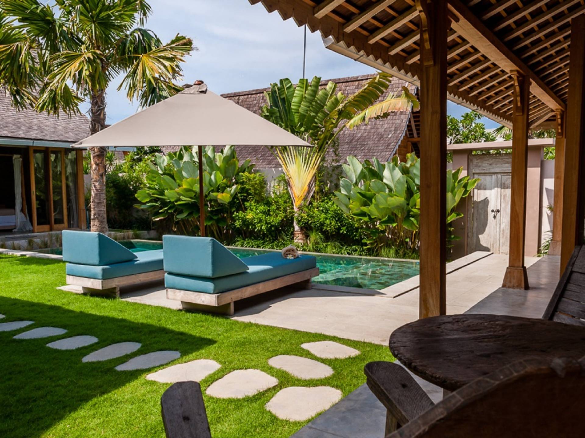 The sunny tropical garden features a 10-meter natural tiled swimming pool fringed by all kinds of tropical greenery and palm trees. Timber sun-loungers tucked with comfy blue mattresses are placed by the poolside for sunbathing. A big parasol provides shades for those wanting to read or take a daytime nap. The veranda makes a nice place to sit together, enjoying some snacks and drinks, watching the kids play in the pool.