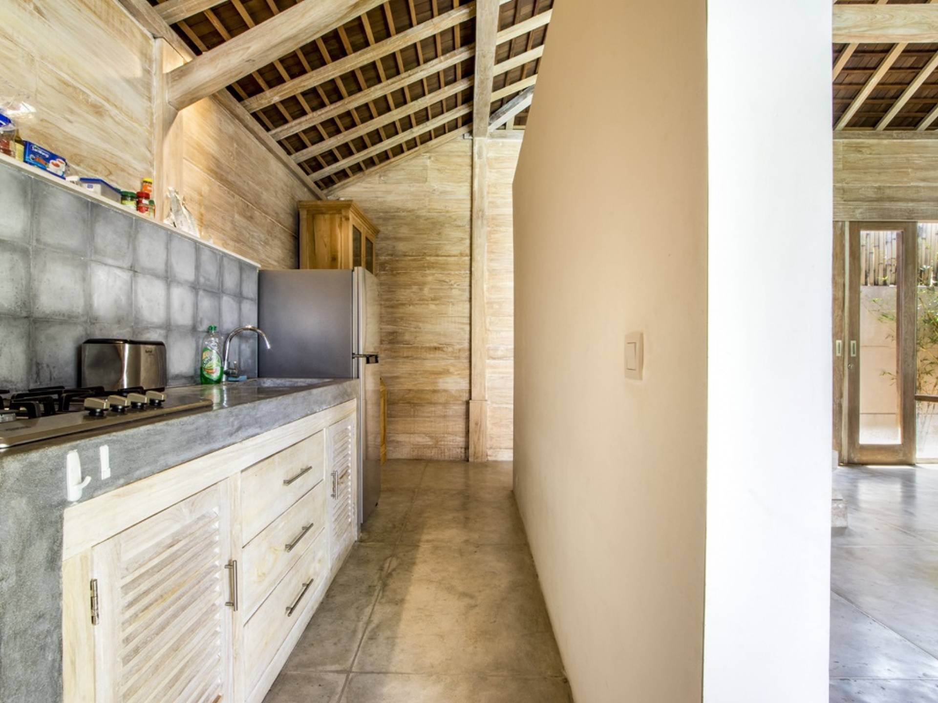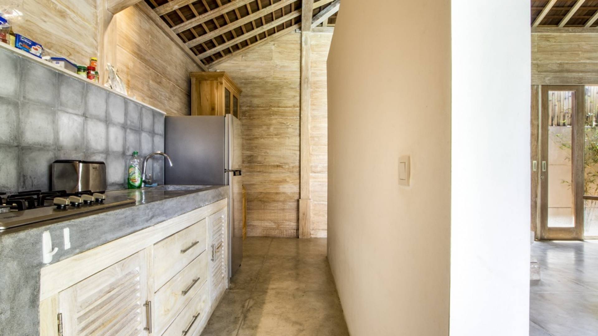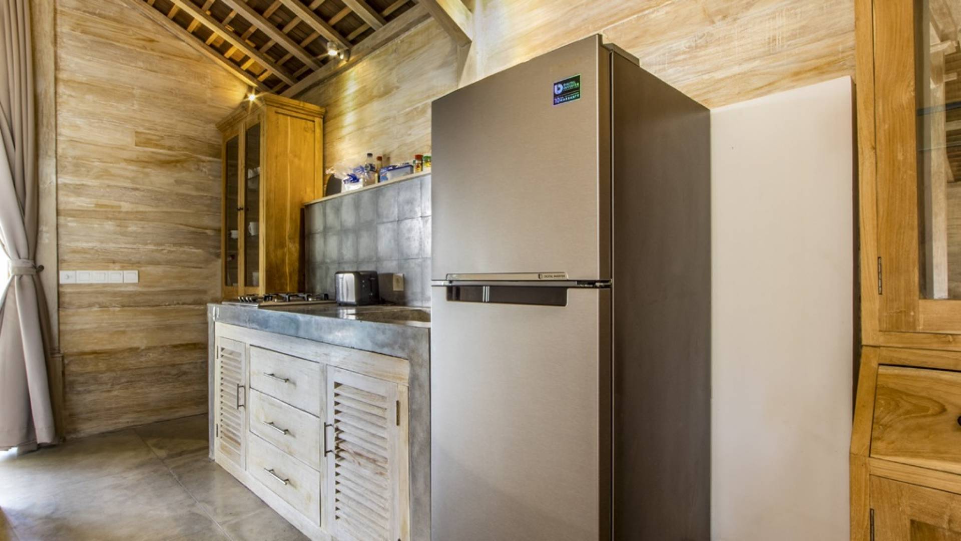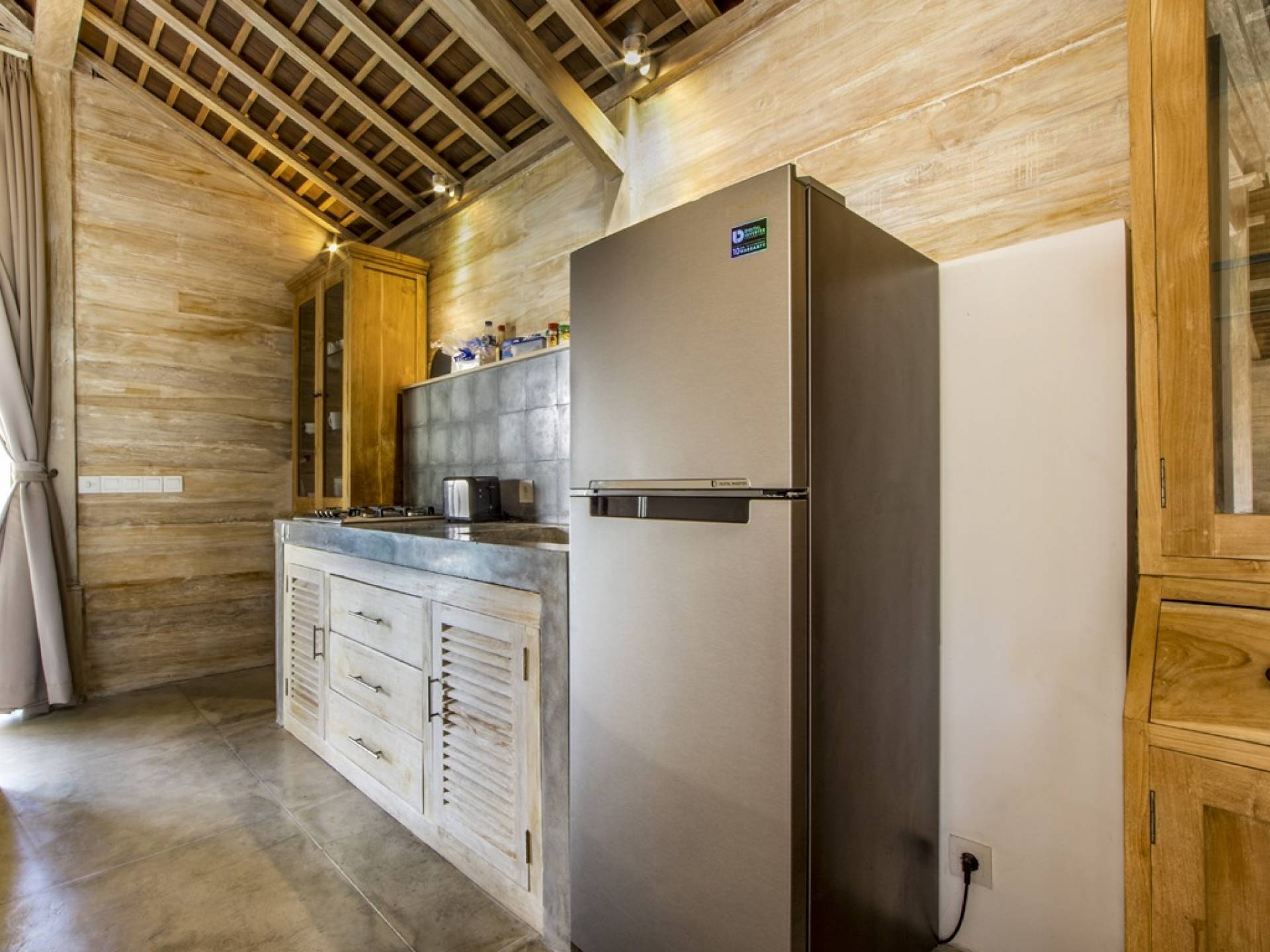 Inside Villa Du Ho Bali is furnished tastefully with a matching wooden interior design and traditional artwork and sculptures. Guests also get to enjoy modern comforts while staying at this traditional villa. There is air-conditioning, making it a nice and cool escape from the tropical heat outside. The sofa lounge corner faces a flat-screen satellite TV to provide entertainment for the whole family and there is a fully equipped western kitchen. A 6-seater teak timber dining table is placed in the center of the Joglo and from the high soaring ceiling hangs an impressive rattan designer's lamp, creating the perfect ambiance for an intimate in-villa family dinner.