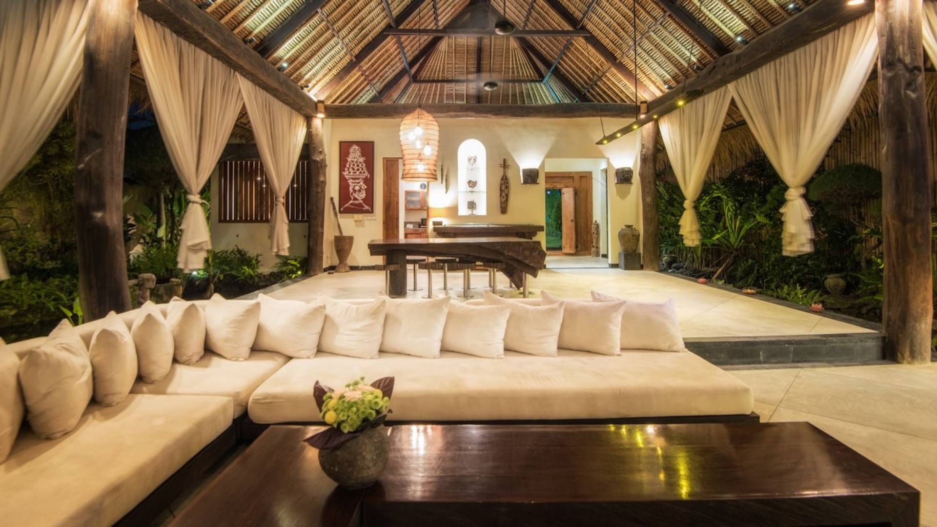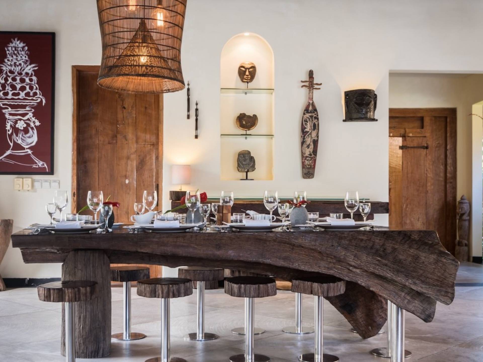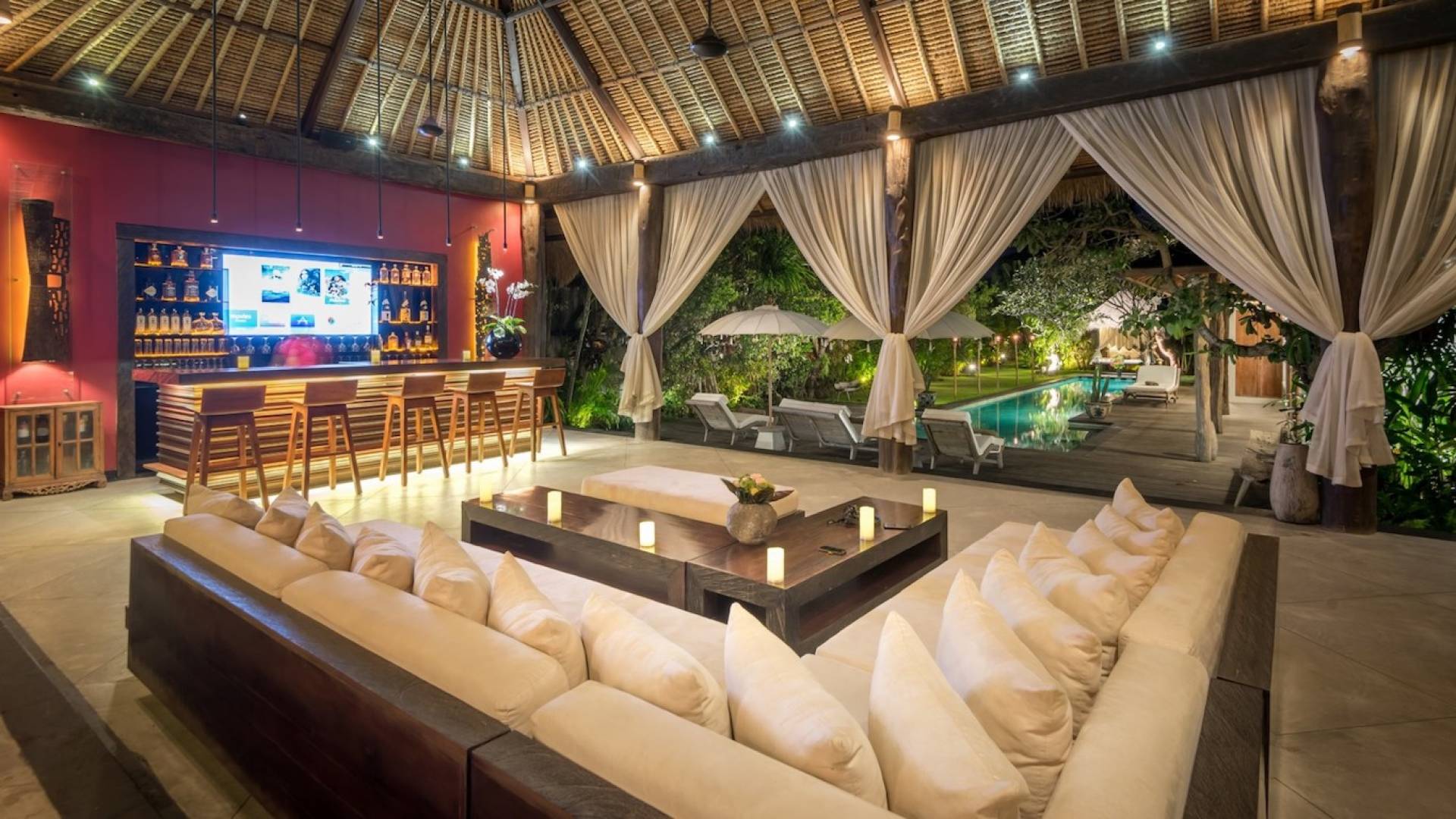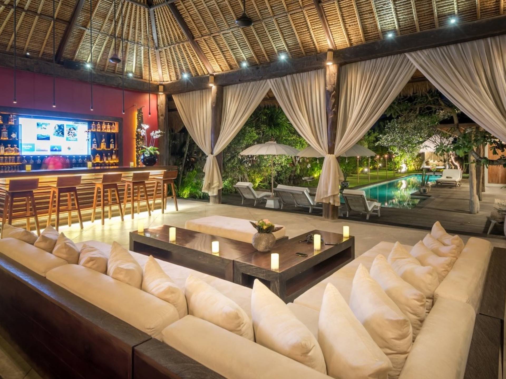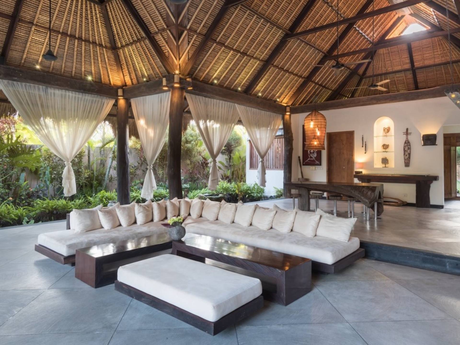 A traditional wooden carved door leads you over a bridge across a tranquil ornamental pond into the traditional Balinese open-plan living room, designed with a high soaring thatched rooftop and a natural interior design ruled by teak wood, rattan, and tribal artwork. The free-form dining table is crafted out of reclaimed teak wood, accompanied by teak wooden stools, and illuminated by a birdcage-style rattan lamp. The comfy L-shaped sofa enjoys wonderful views of the garden and pool and there is a very chic bar with stools to get your cocktails, spirits, and juices. It comes as a great and very welcome surprise to find out, that the bar is equipped with a huge 75-inch flat-screen Apple TV with satellite channels, so you don't have to miss out on watching your favorite game of sports or television show. You can watch it from the sofa or the bar stools.
