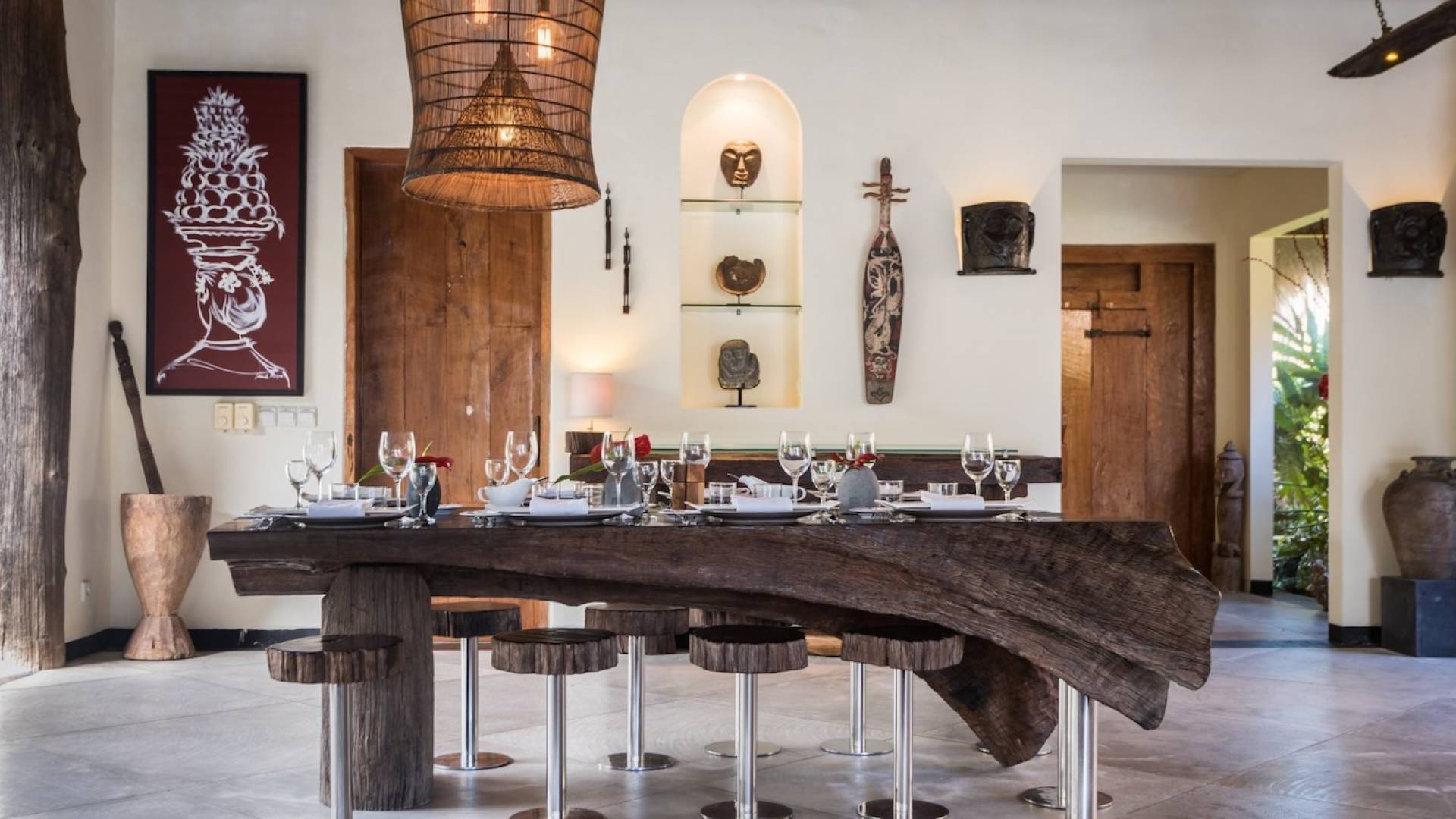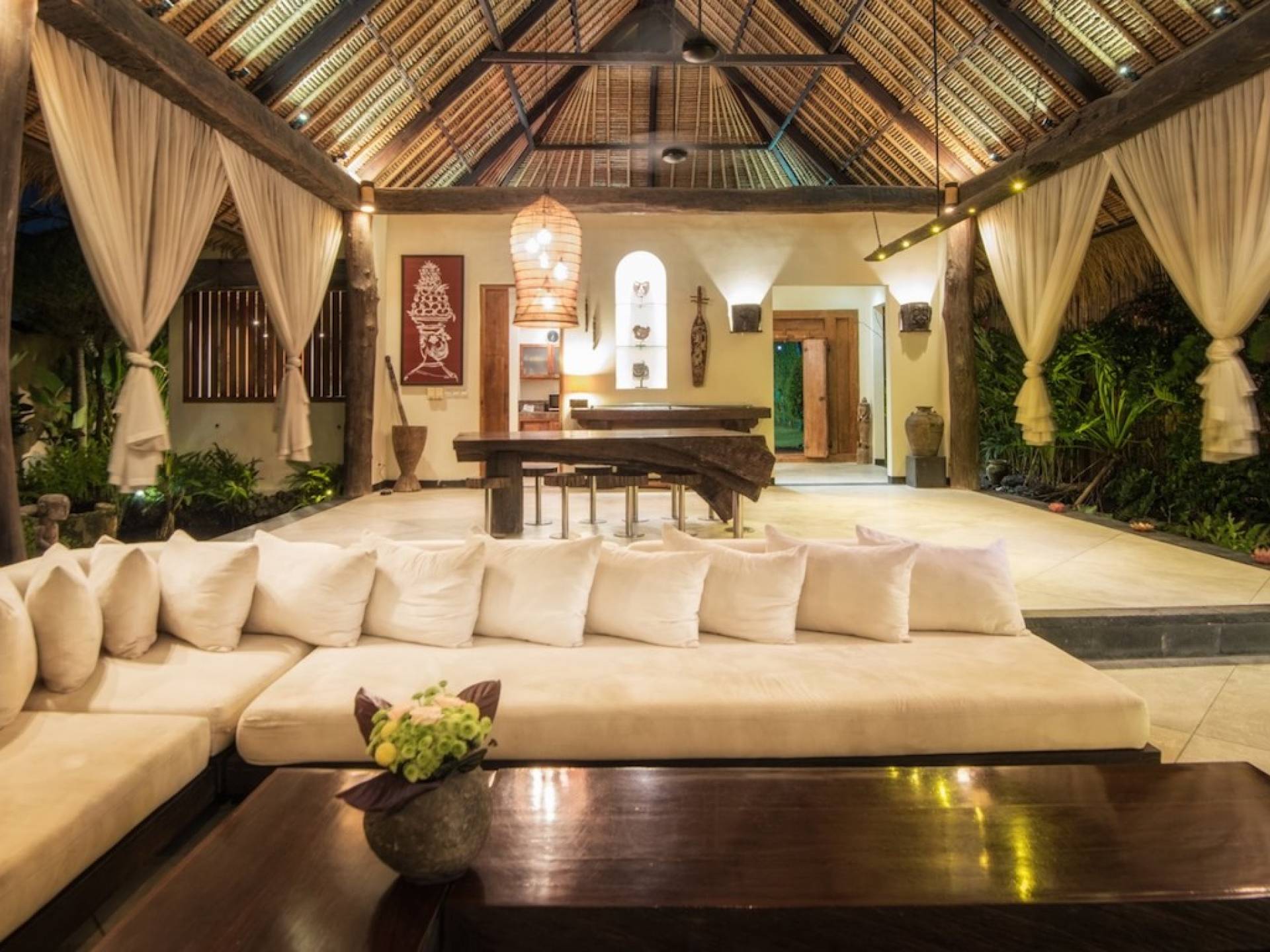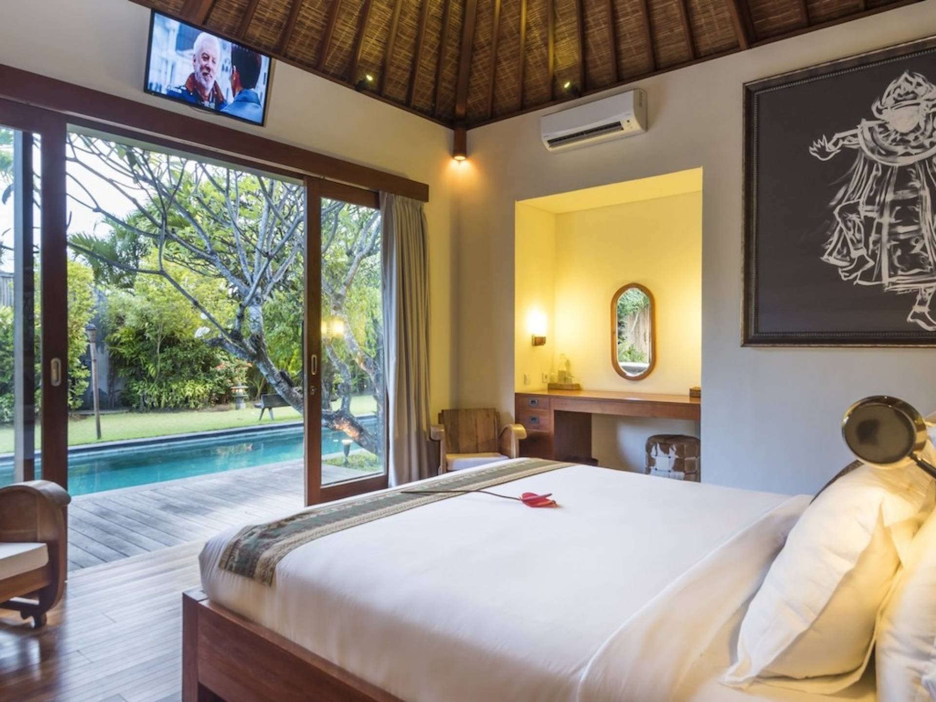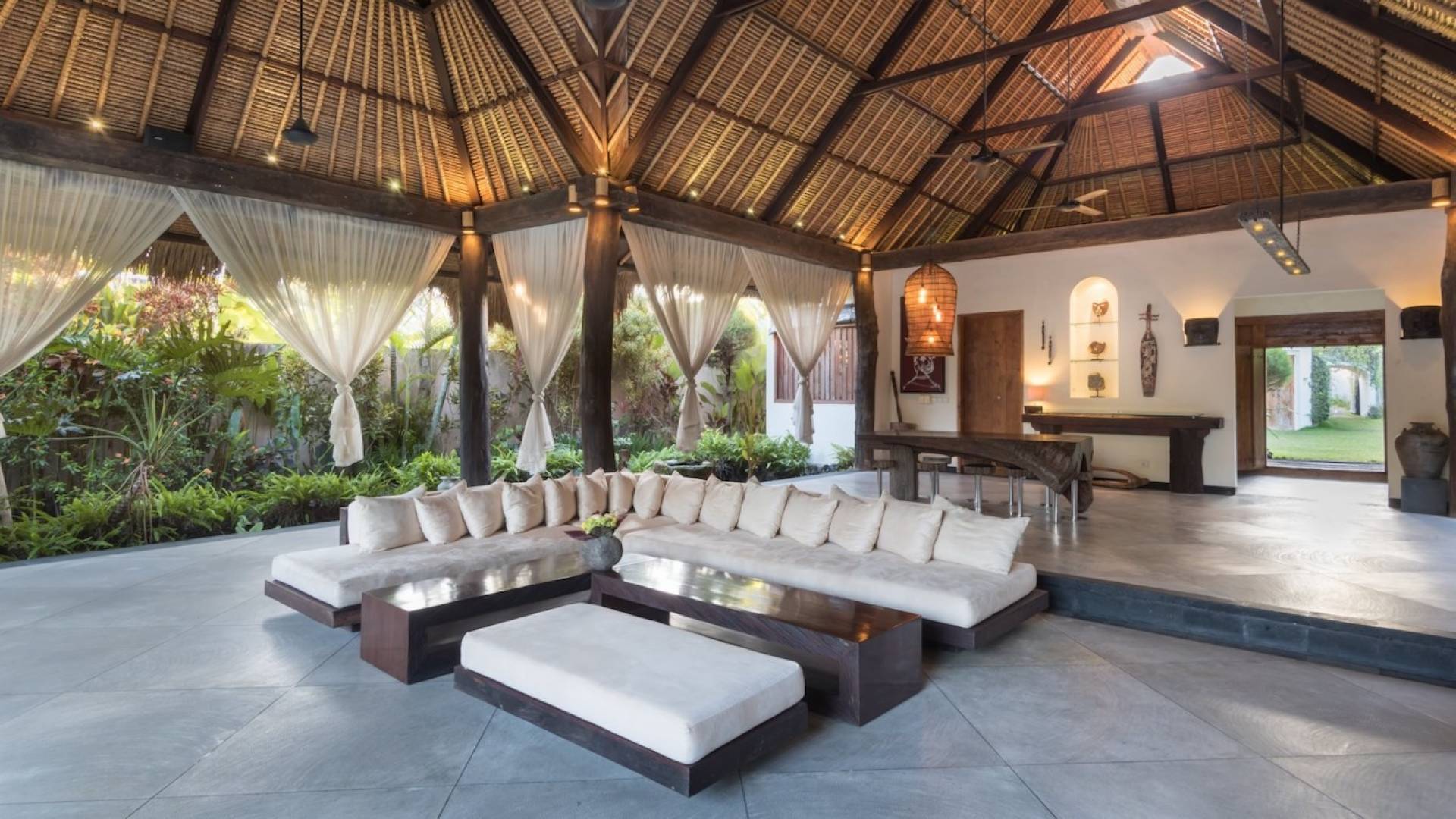 A traditional wooden carved door leads you over a bridge across a tranquil ornamental pond into the traditional Balinese open-plan living room, designed with a high soaring thatched rooftop and a natural interior design ruled by teak wood, rattan, and tribal artwork. The free-form dining table is crafted out of reclaimed teak wood, accompanied by teak wooden stools, and illuminated by a birdcage-style rattan lamp. The comfy L-shaped sofa enjoys wonderful views of the garden and pool and there is a very chic bar with stools to get your cocktails, spirits, and juices. It comes as a great and very welcome surprise to find out, that the bar is equipped with a huge 75-inch flat-screen Apple TV with satellite channels, so you don't have to miss out on watching your favorite game of sports or television show. You can watch it from the sofa or the bar stools.