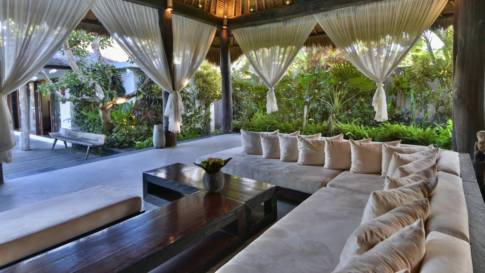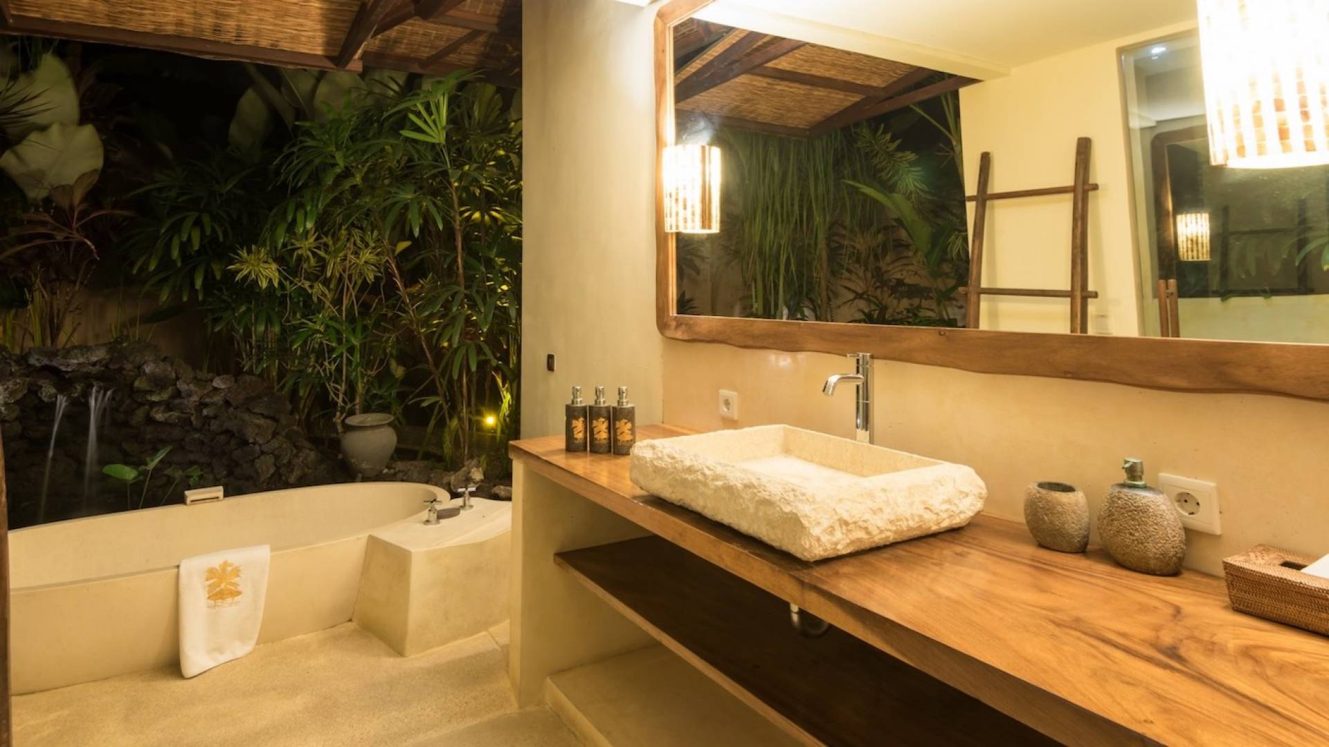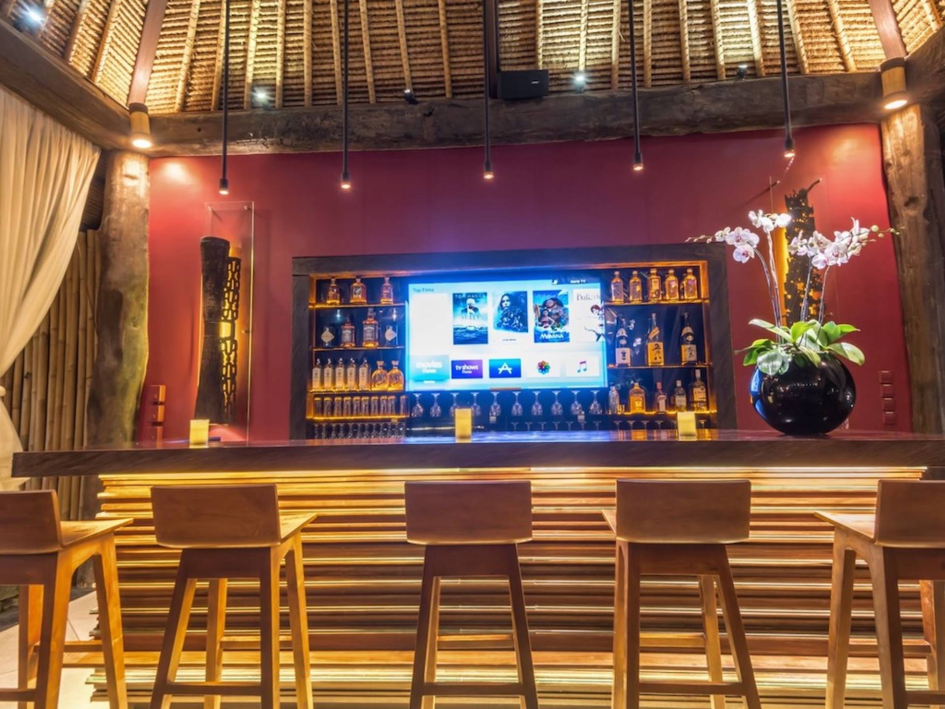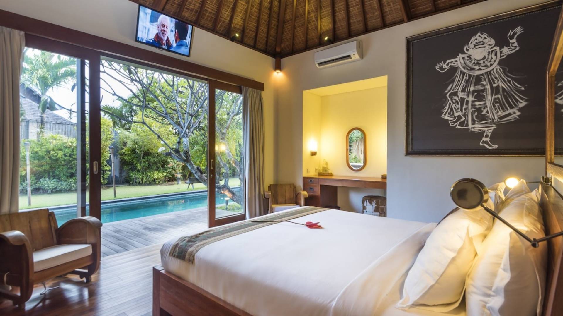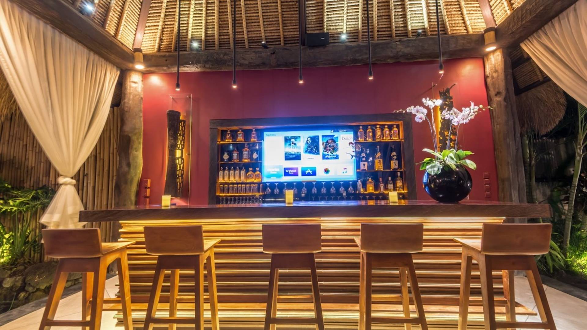 A traditional wooden carved door leads you over a bridge across a tranquil ornamental pond into the traditional Balinese open-plan living room, designed with a high soaring thatched rooftop and a natural interior design ruled by teak wood, rattan, and tribal artwork. The free-form dining table is crafted out of reclaimed teak wood, accompanied by teak wooden stools, and illuminated by a birdcage-style rattan lamp. The comfy L-shaped sofa enjoys wonderful views of the garden and pool and there is a very chic bar with stools to get your cocktails, spirits, and juices. It comes as a great and very welcome surprise to find out, that the bar is equipped with a huge 75-inch flat-screen Apple TV with satellite channels, so you don't have to miss out on watching your favorite game of sports or television show. You can watch it from the sofa or the bar stools.