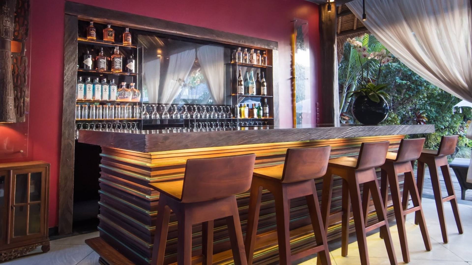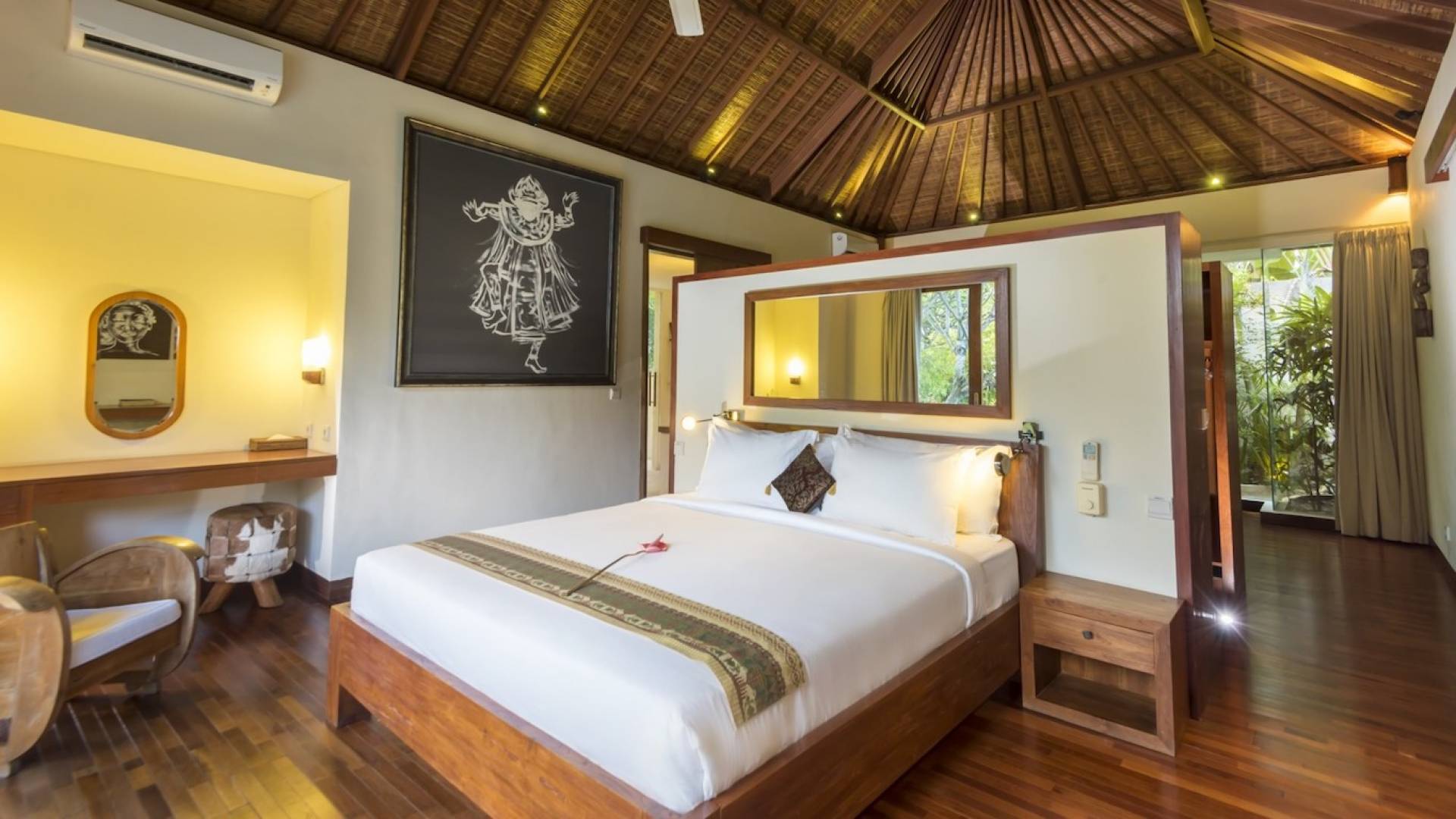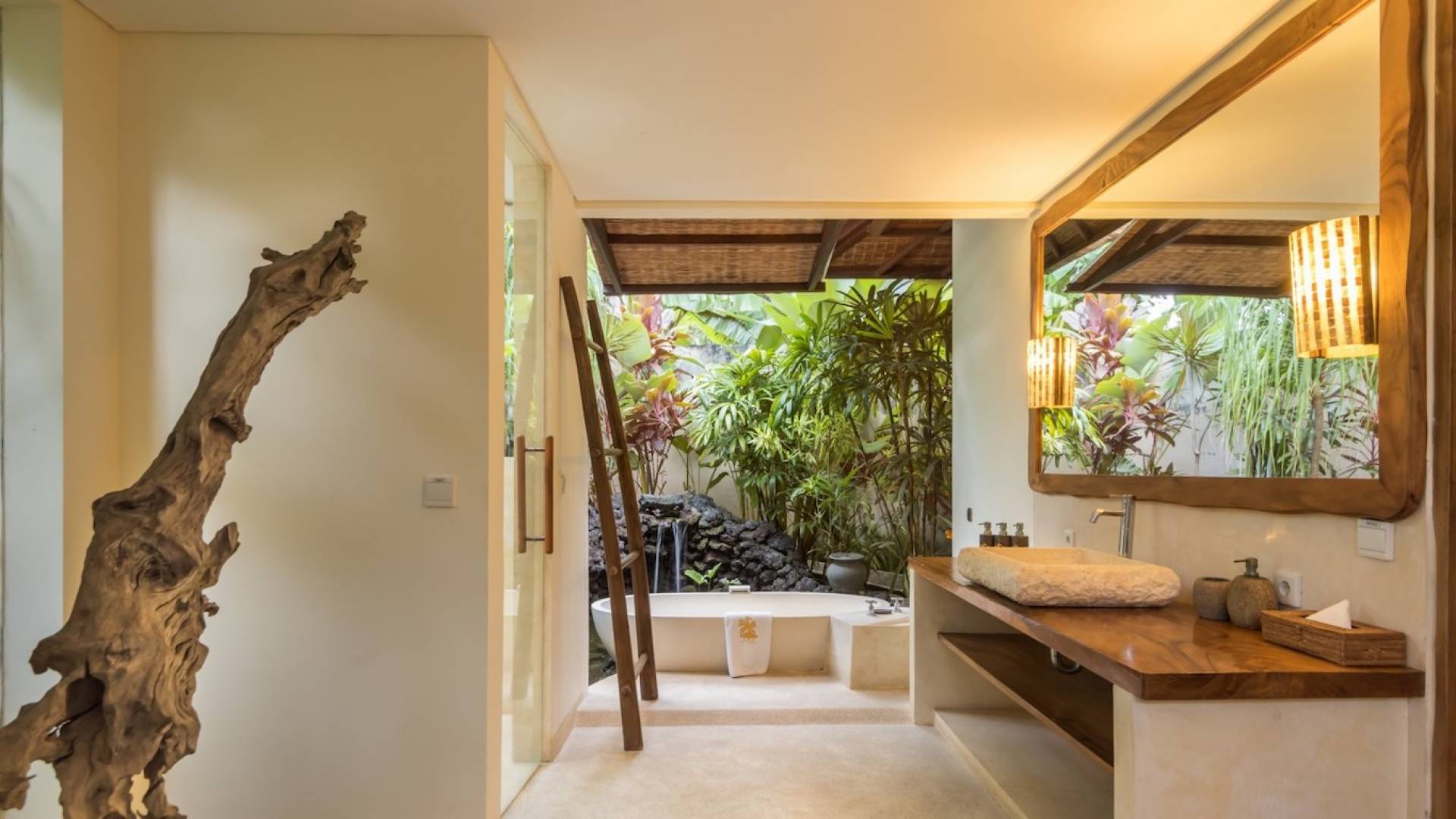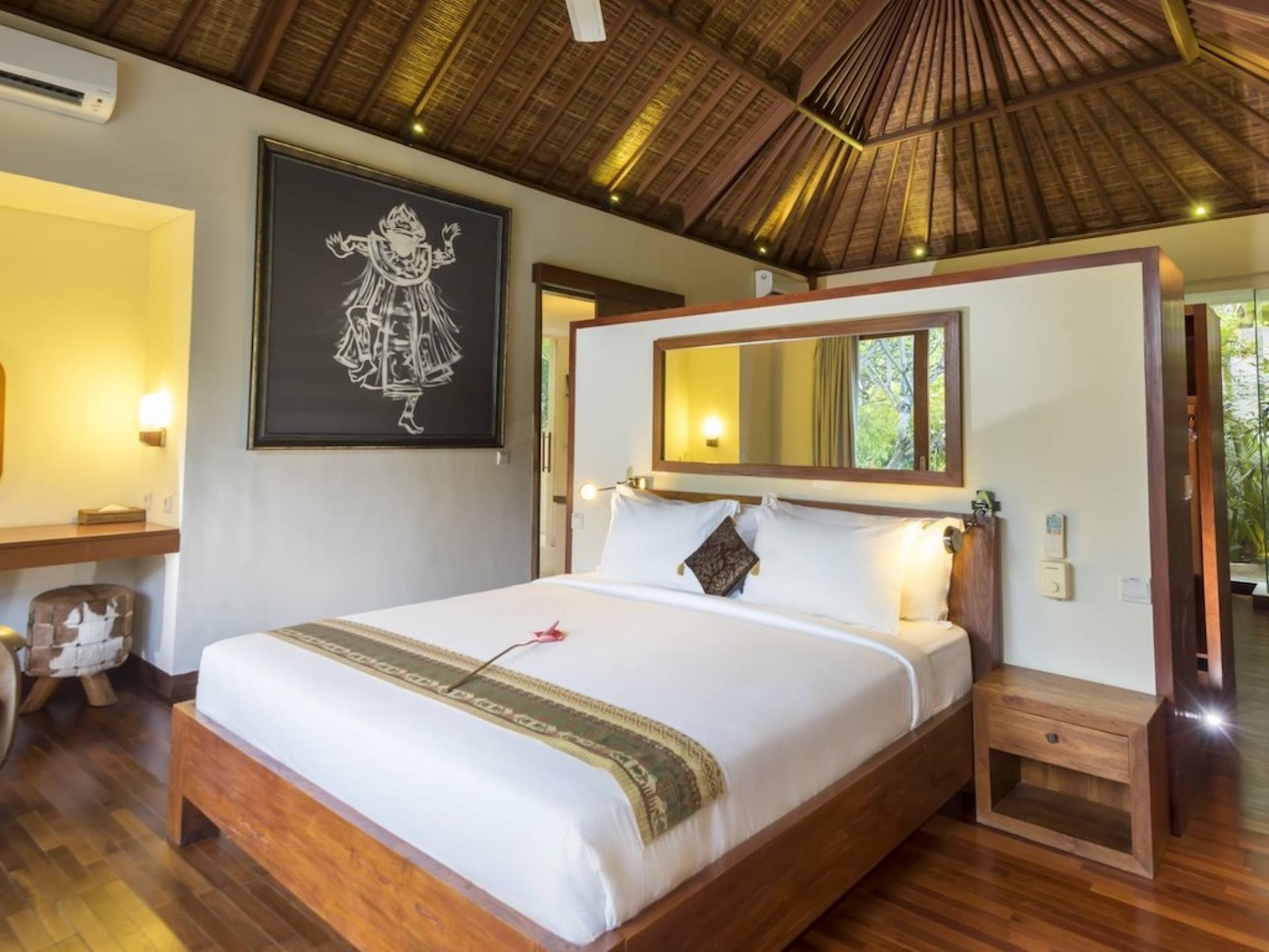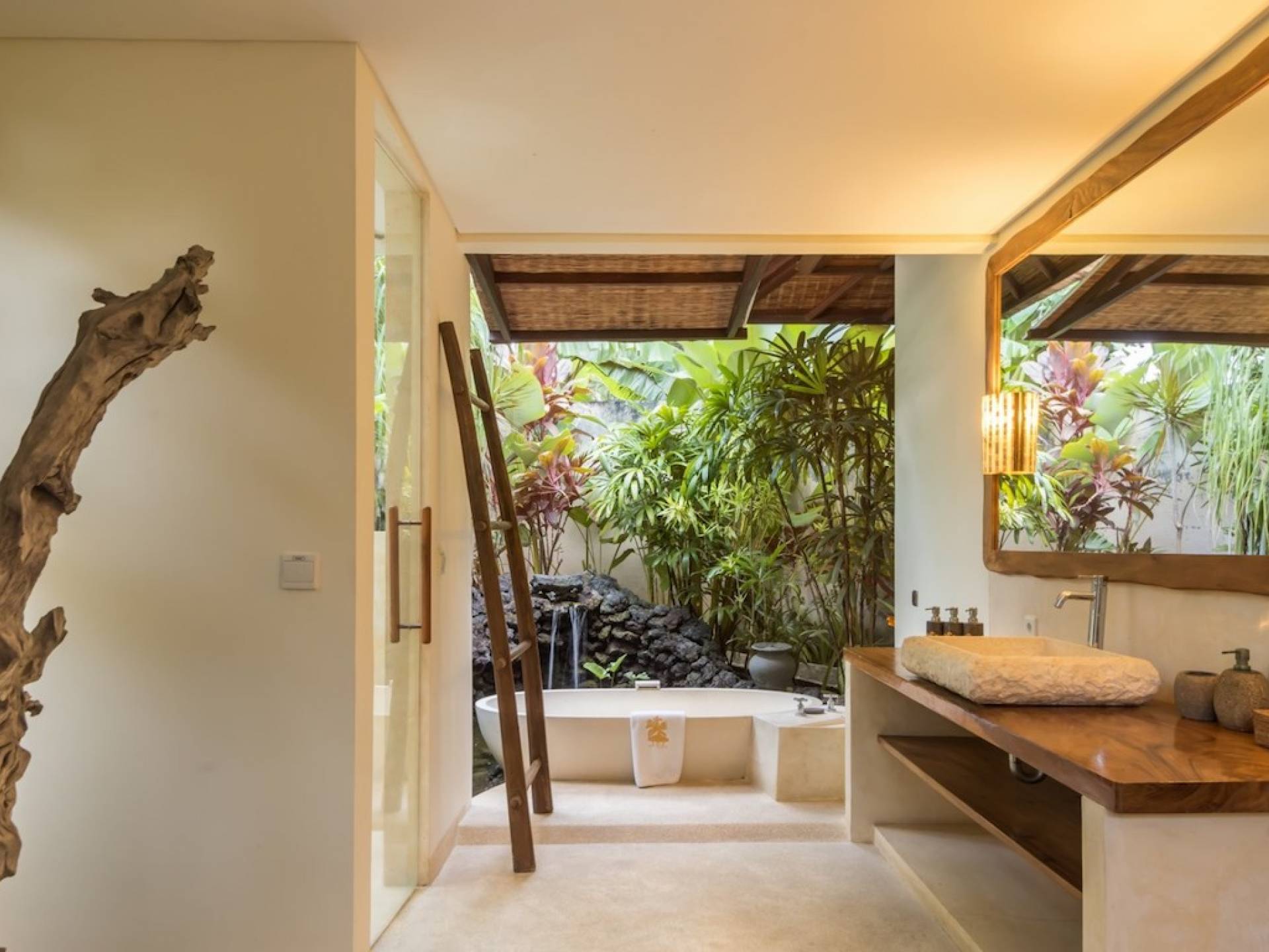 A traditional wooden carved door leads you over a bridge across a tranquil ornamental pond into the traditional Balinese open-plan living room, designed with a high soaring thatched rooftop and a natural interior design ruled by teak wood, rattan, and tribal artwork. The free-form dining table is crafted out of reclaimed teak wood, accompanied by teak wooden stools, and illuminated by a birdcage-style rattan lamp. The comfy L-shaped sofa enjoys wonderful views of the garden and pool and there is a very chic bar with stools to get your cocktails, spirits, and juices. It comes as a great and very welcome surprise to find out, that the bar is equipped with a huge 75-inch flat-screen Apple TV with satellite channels, so you don't have to miss out on watching your favorite game of sports or television show. You can watch it from the sofa or the bar stools.
