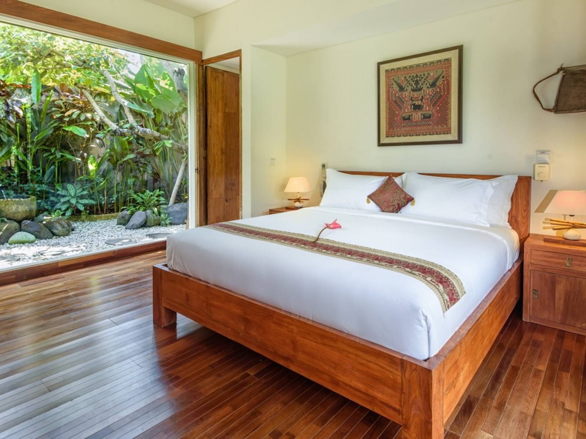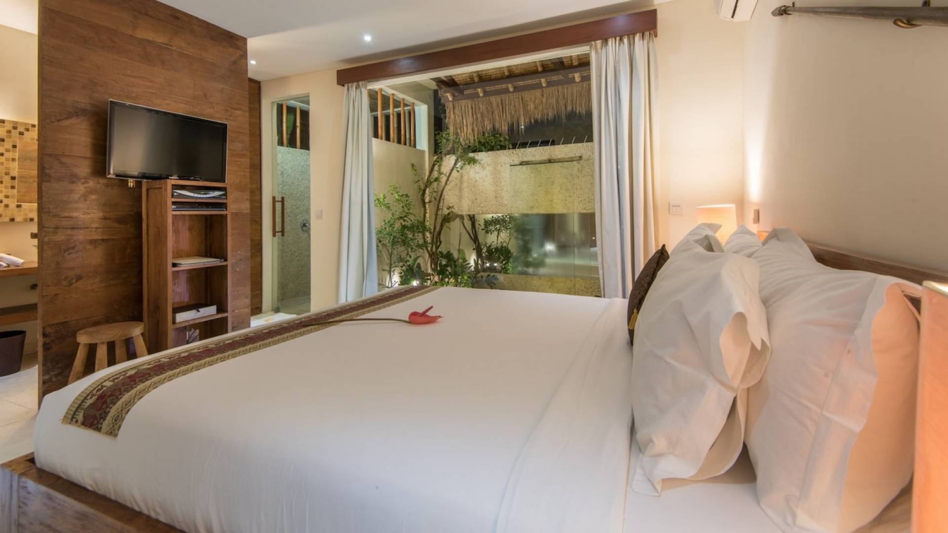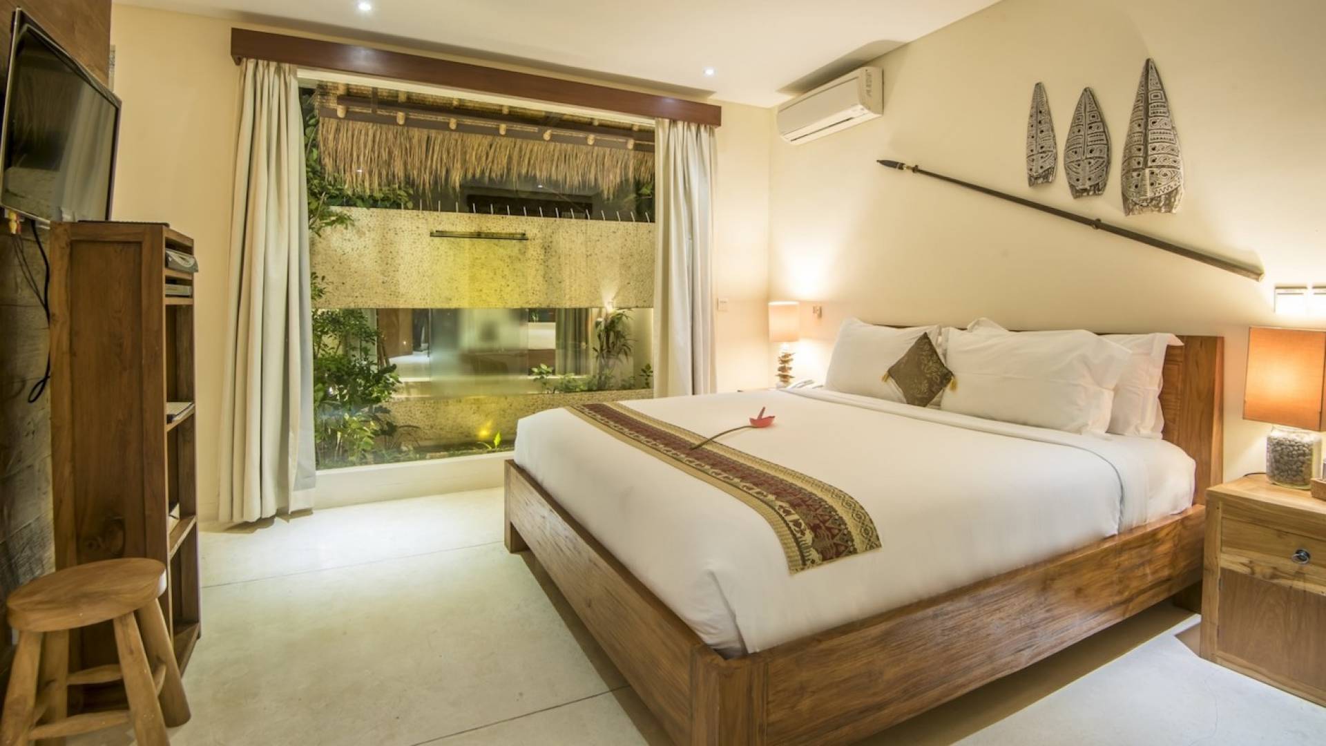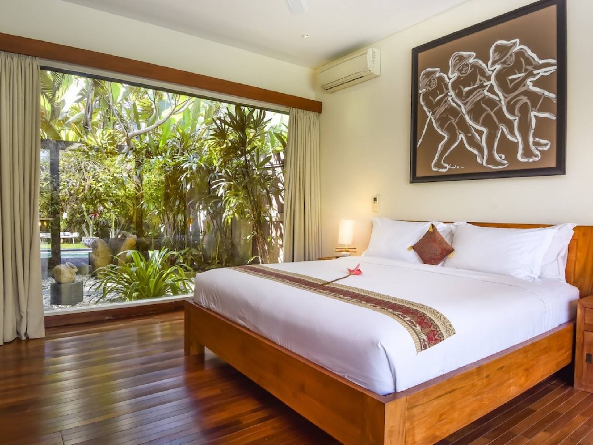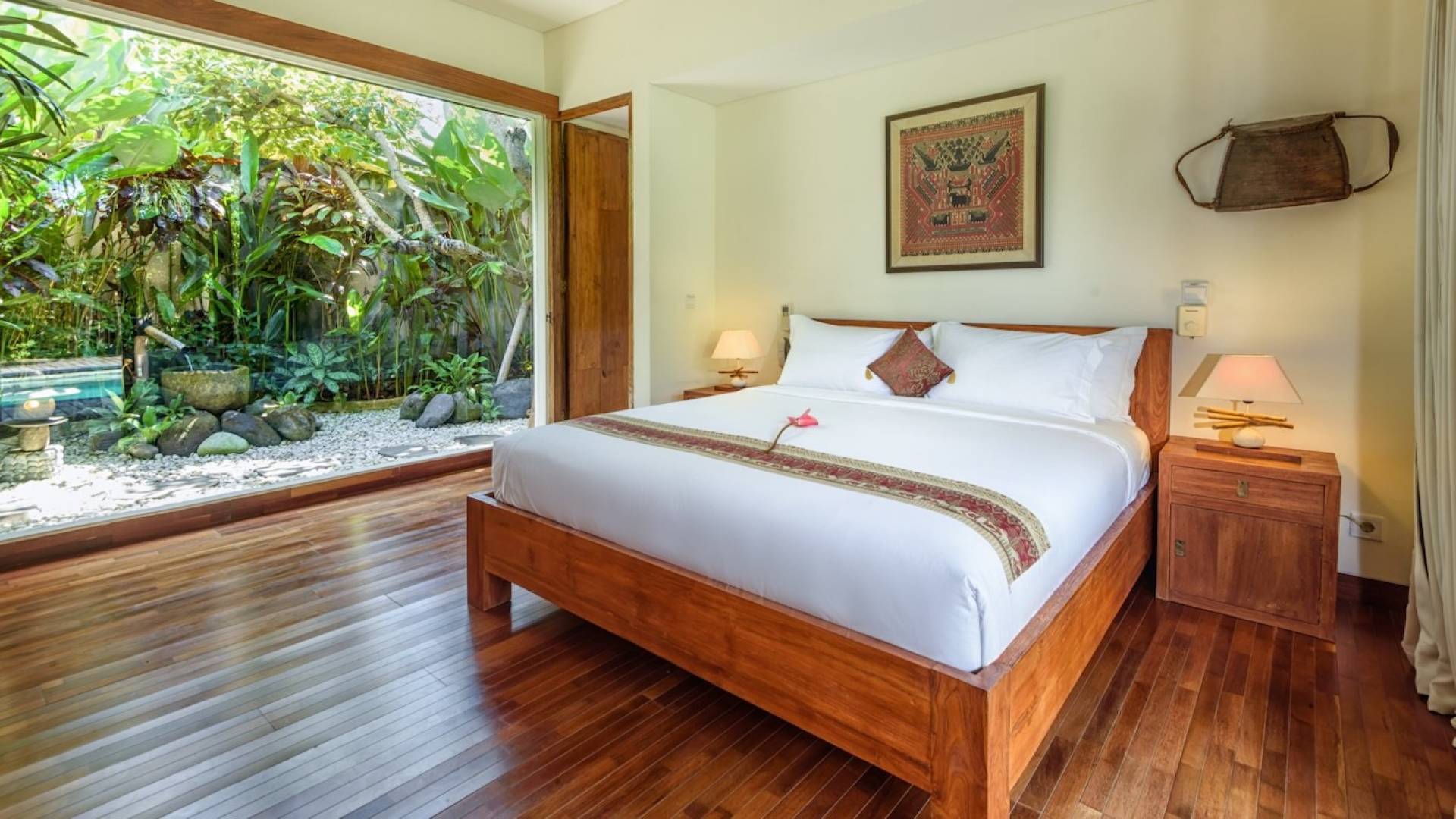 A traditional wooden carved door leads you over a bridge across a tranquil ornamental pond into the traditional Balinese open-plan living room, designed with a high soaring thatched rooftop and a natural interior design ruled by teak wood, rattan, and tribal artwork. The free-form dining table is crafted out of reclaimed teak wood, accompanied by teak wooden stools, and illuminated by a birdcage-style rattan lamp. The comfy L-shaped sofa enjoys wonderful views of the garden and pool and there is a very chic bar with stools to get your cocktails, spirits, and juices. It comes as a great and very welcome surprise to find out, that the bar is equipped with a huge 75-inch flat-screen Apple TV with satellite channels, so you don't have to miss out on watching your favorite game of sports or television show. You can watch it from the sofa or the bar stools.