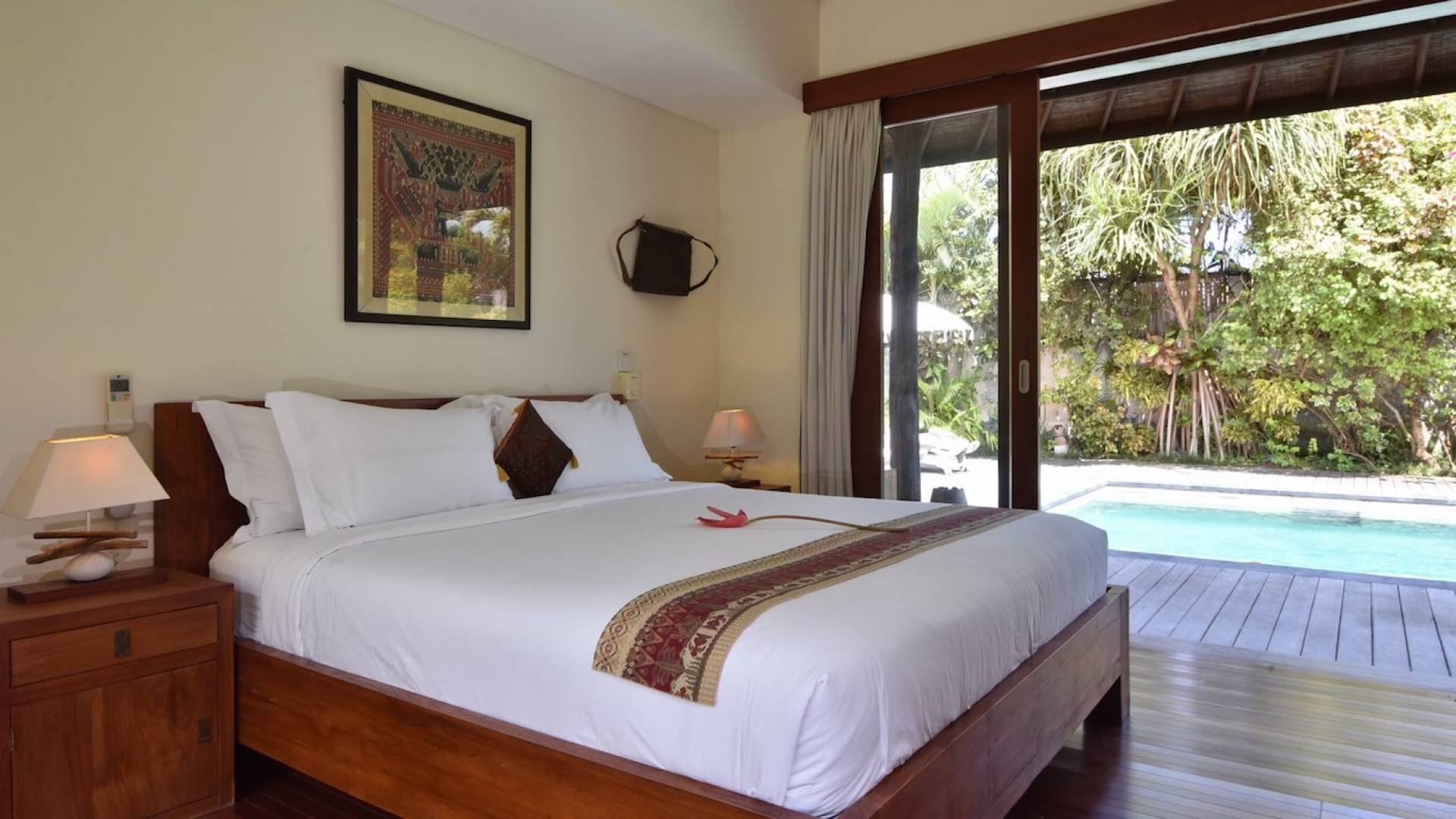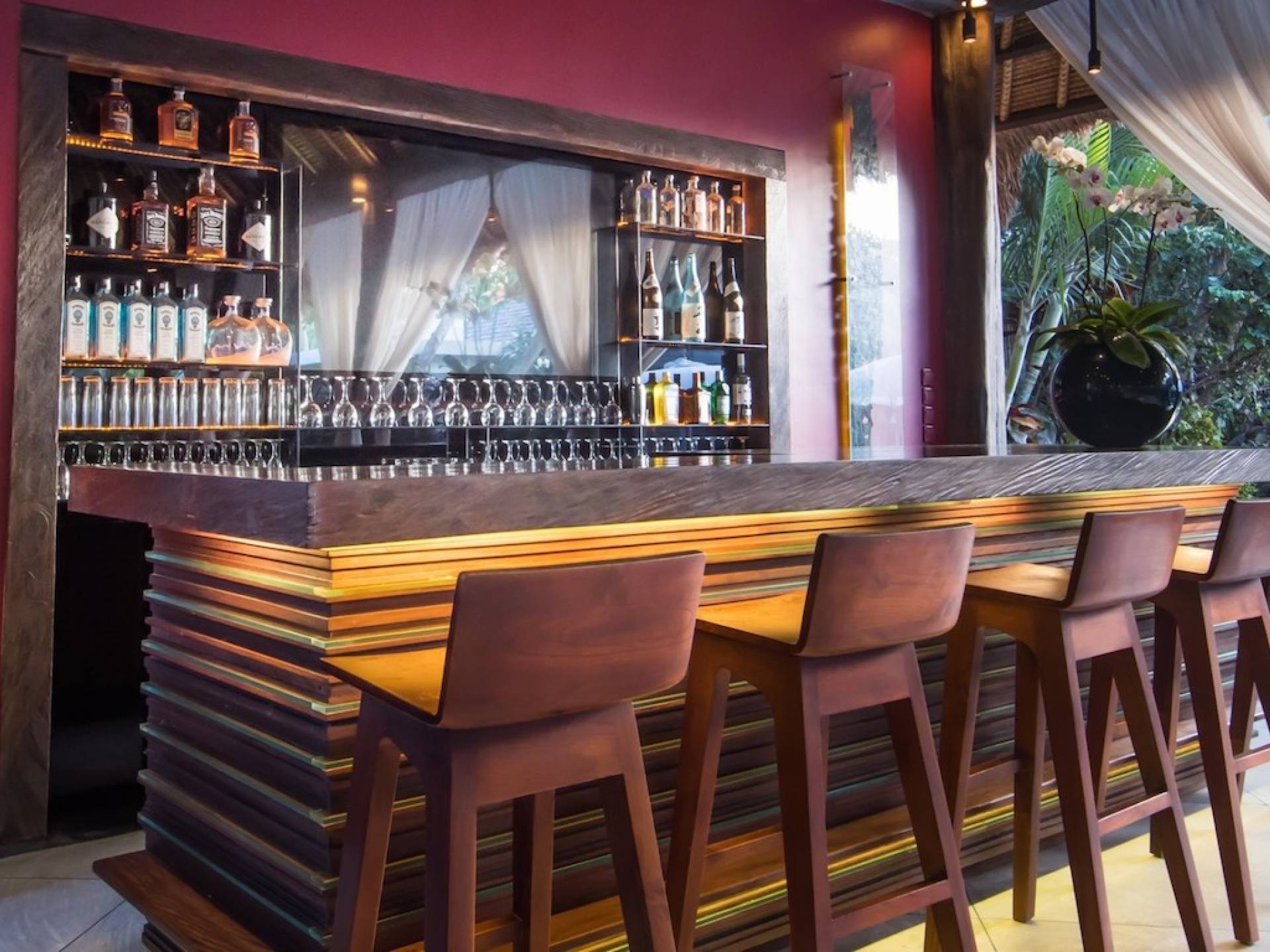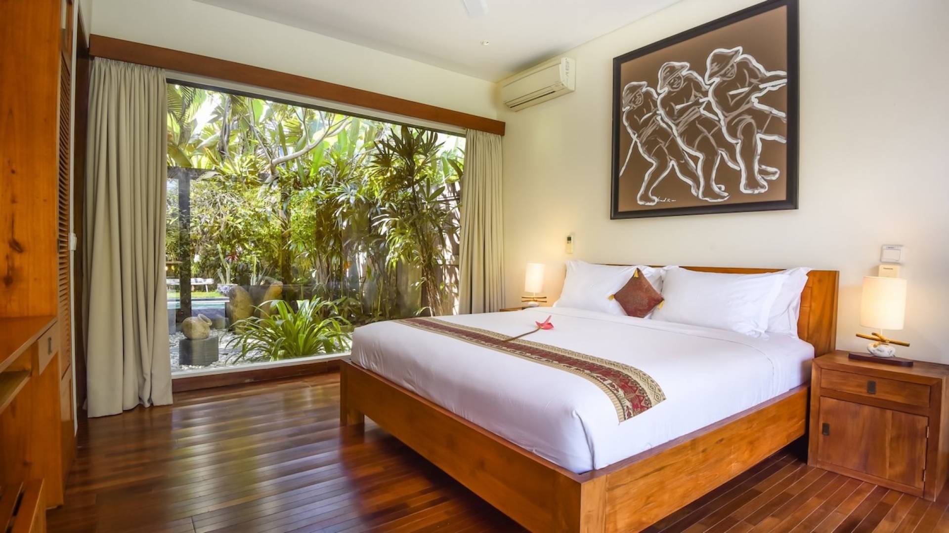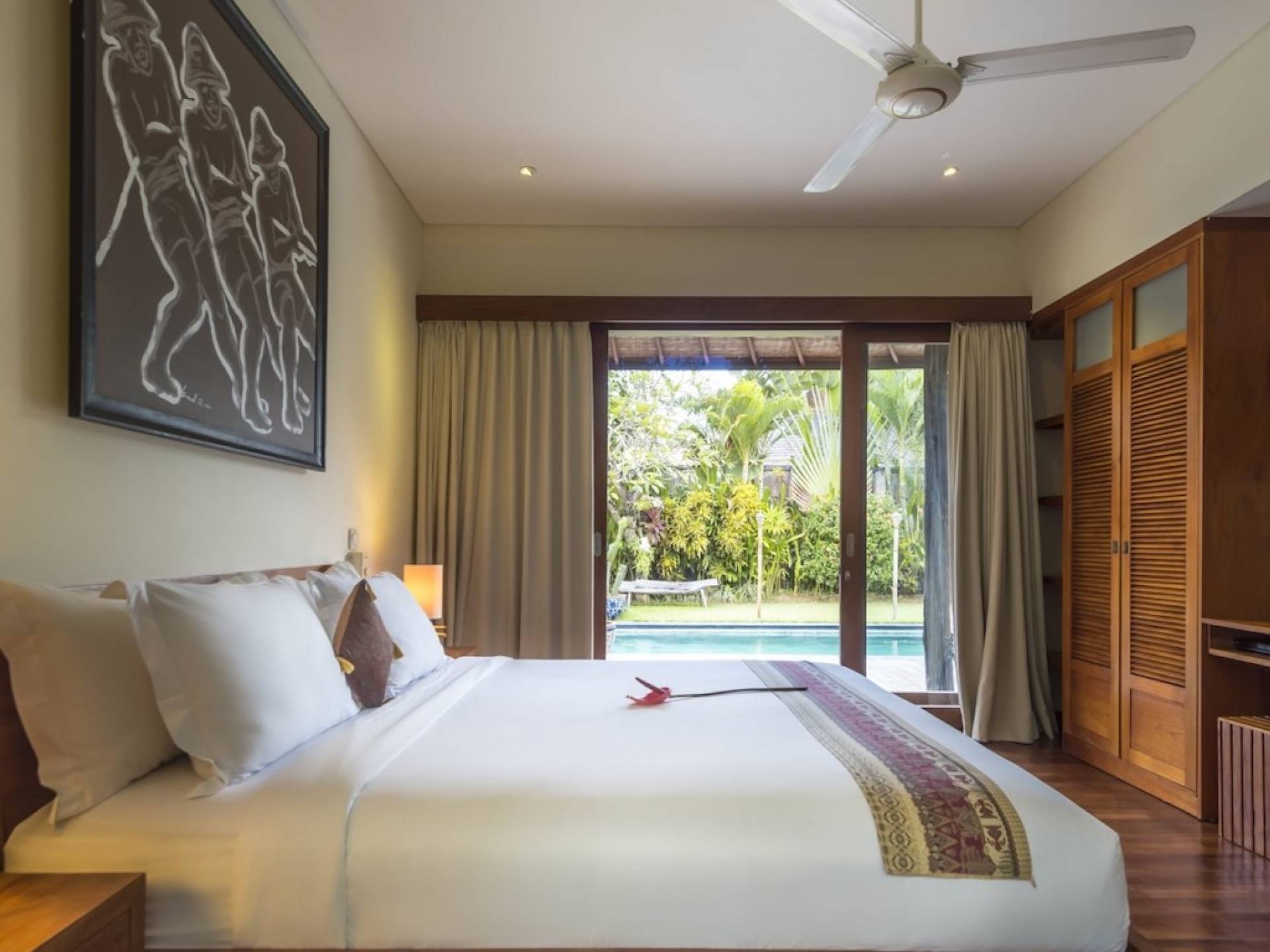 A traditional wooden carved door leads you over a bridge across a tranquil ornamental pond into the traditional Balinese open-plan living room, designed with a high soaring thatched rooftop and a natural interior design ruled by teak wood, rattan, and tribal artwork. The free-form dining table is crafted out of reclaimed teak wood, accompanied by teak wooden stools, and illuminated by a birdcage-style rattan lamp. The comfy L-shaped sofa enjoys wonderful views of the garden and pool and there is a very chic bar with stools to get your cocktails, spirits, and juices. It comes as a great and very welcome surprise to find out, that the bar is equipped with a huge 75-inch flat-screen Apple TV with satellite channels, so you don't have to miss out on watching your favorite game of sports or television show. You can watch it from the sofa or the bar stools.