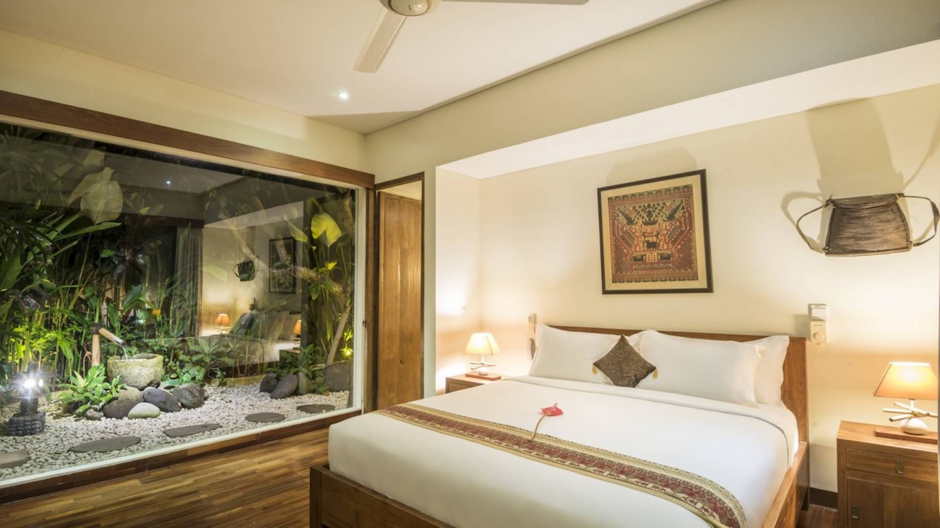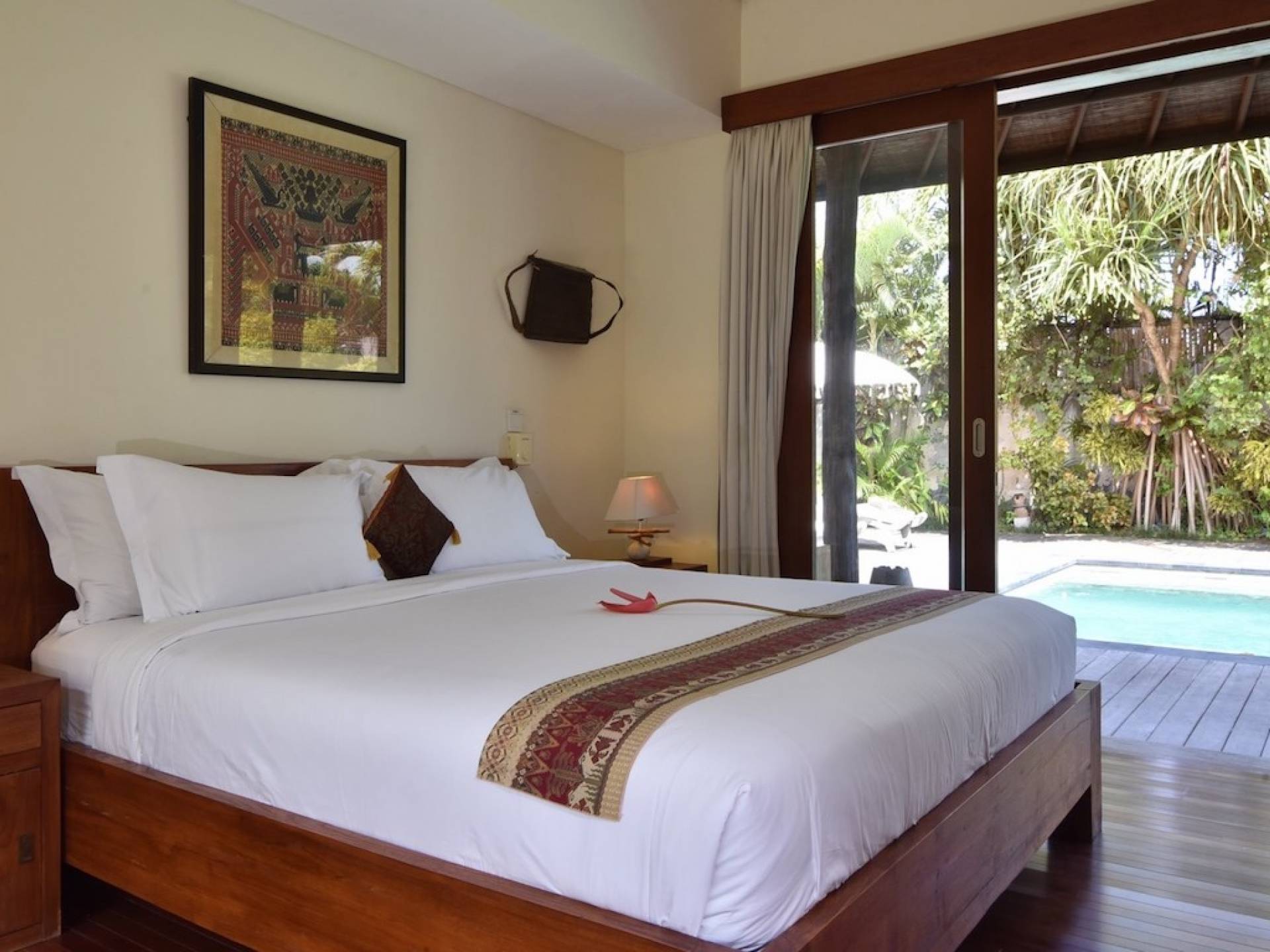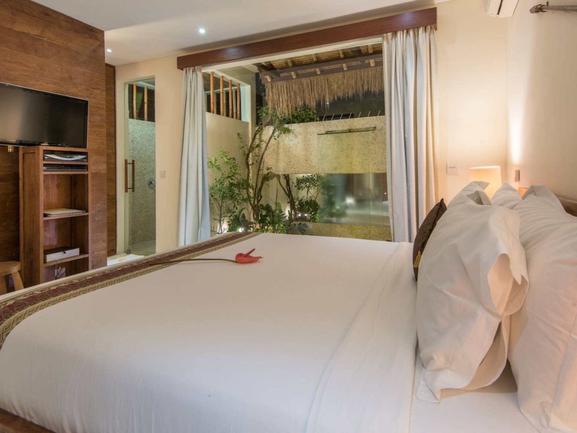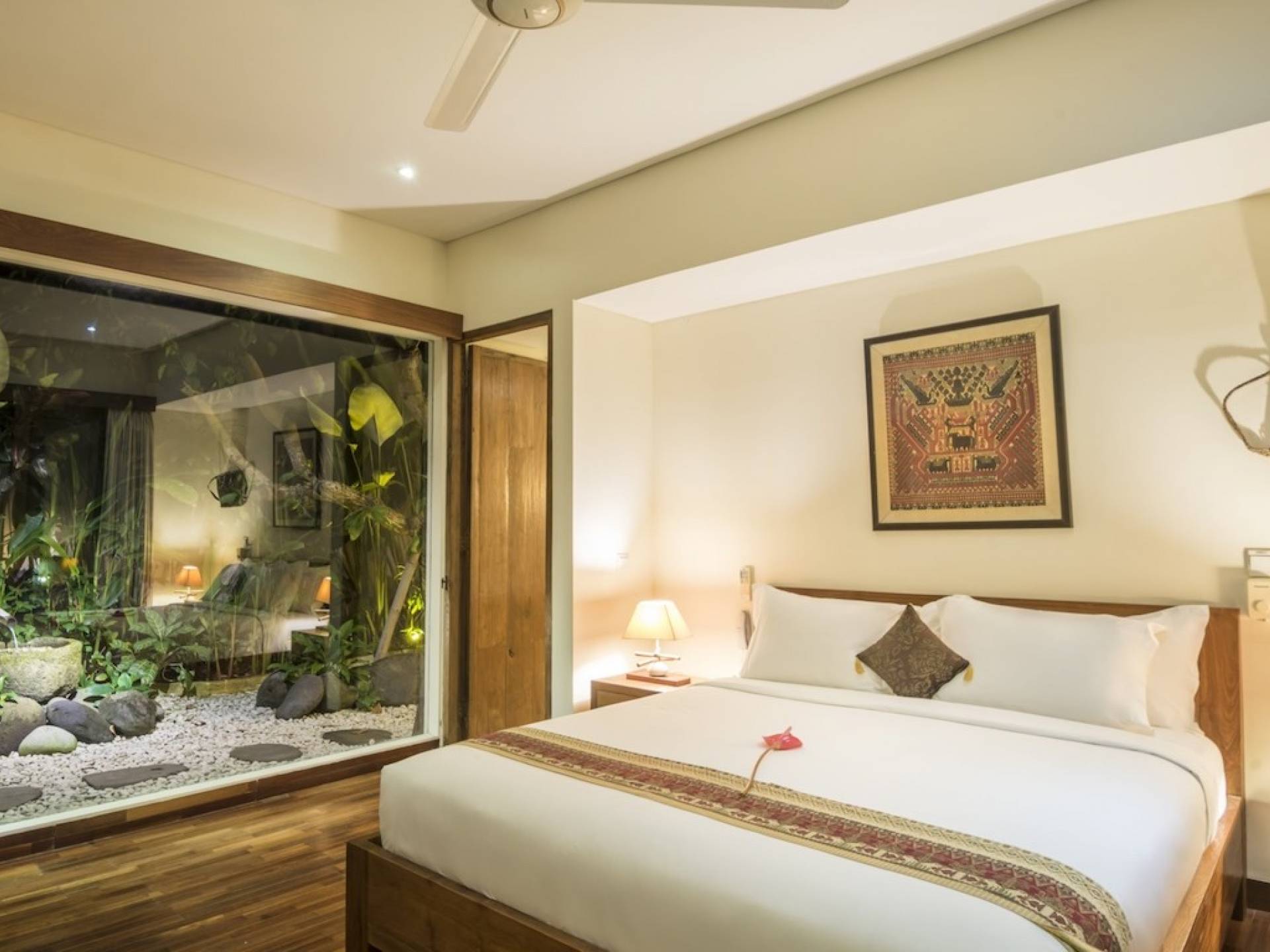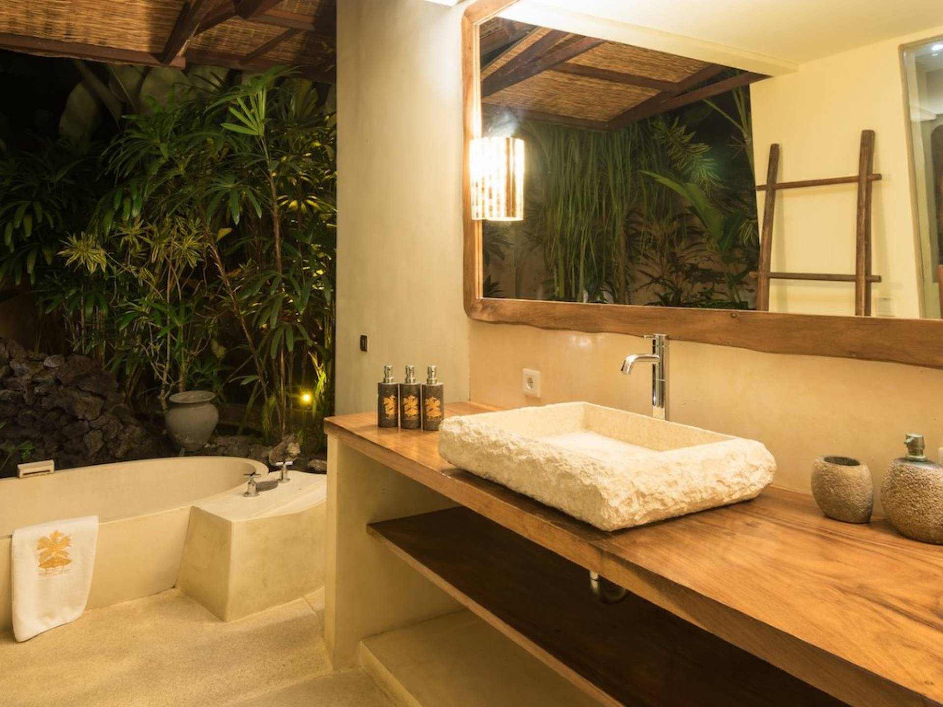 A traditional wooden carved door leads you over a bridge across a tranquil ornamental pond into the traditional Balinese open-plan living room, designed with a high soaring thatched rooftop and a natural interior design ruled by teak wood, rattan, and tribal artwork. The free-form dining table is crafted out of reclaimed teak wood, accompanied by teak wooden stools, and illuminated by a birdcage-style rattan lamp. The comfy L-shaped sofa enjoys wonderful views of the garden and pool and there is a very chic bar with stools to get your cocktails, spirits, and juices. It comes as a great and very welcome surprise to find out, that the bar is equipped with a huge 75-inch flat-screen Apple TV with satellite channels, so you don't have to miss out on watching your favorite game of sports or television show. You can watch it from the sofa or the bar stools.