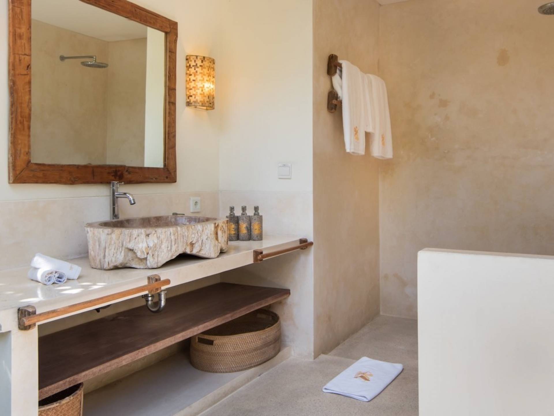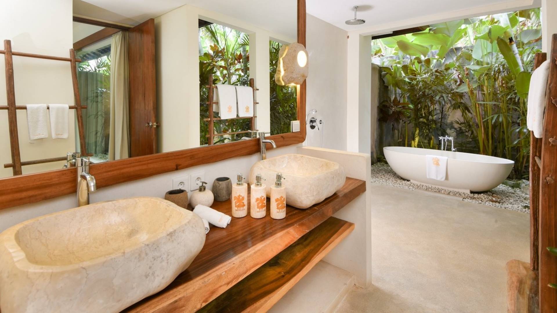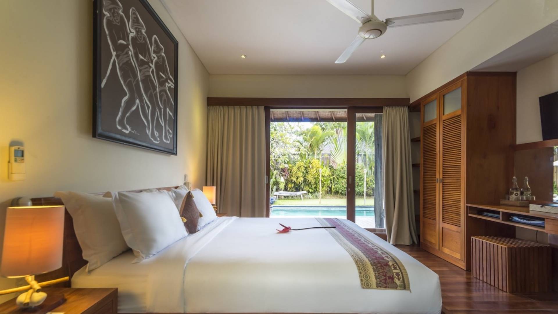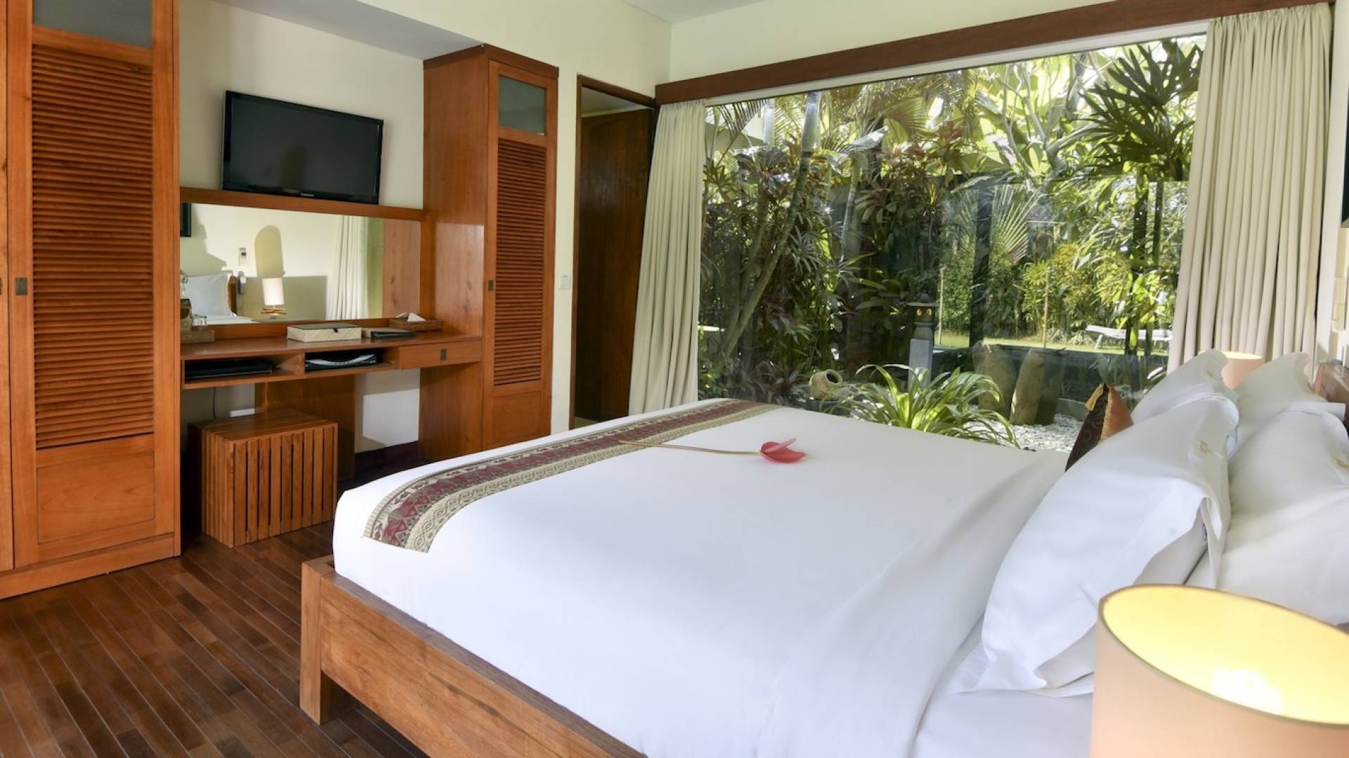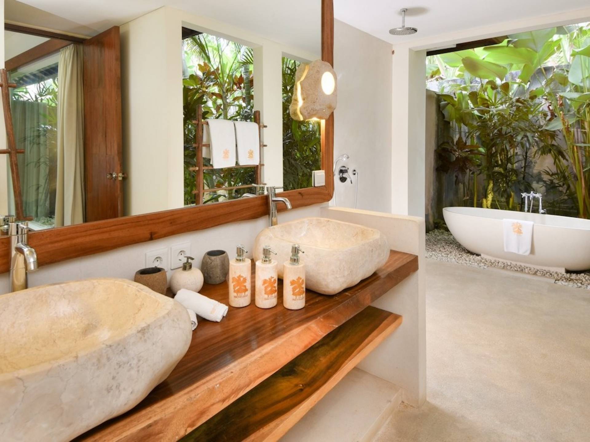A traditional wooden carved door leads you over a bridge across a tranquil ornamental pond into the traditional Balinese open-plan living room, designed with a high soaring thatched rooftop and a natural interior design ruled by teak wood, rattan, and tribal artwork. The free-form dining table is crafted out of reclaimed teak wood, accompanied by teak wooden stools, and illuminated by a birdcage-style rattan lamp. The comfy L-shaped sofa enjoys wonderful views of the garden and pool and there is a very chic bar with stools to get your cocktails, spirits, and juices. It comes as a great and very welcome surprise to find out, that the bar is equipped with a huge 75-inch flat-screen Apple TV with satellite channels, so you don't have to miss out on watching your favorite game of sports or television show. You can watch it from the sofa or the bar stools.