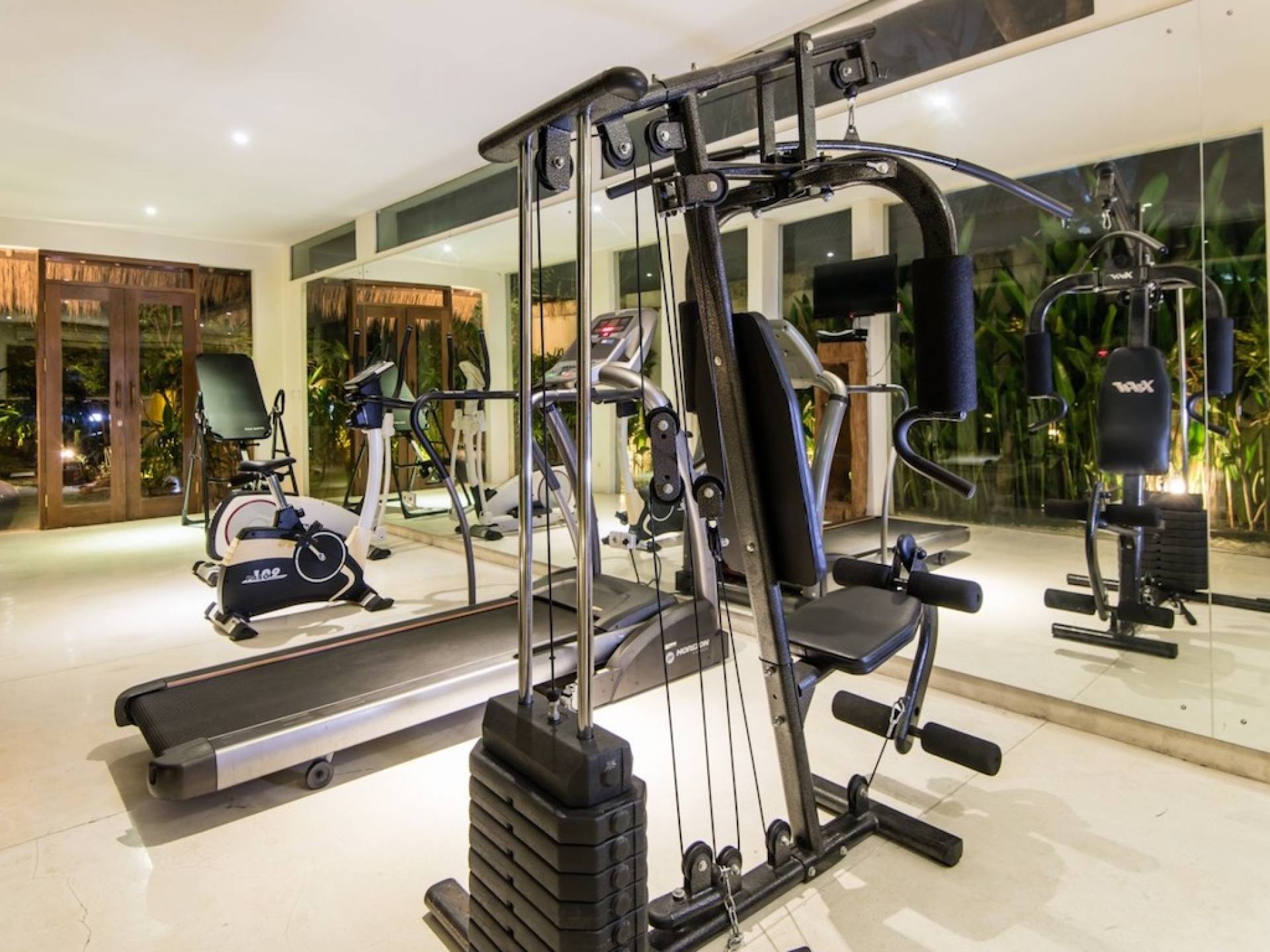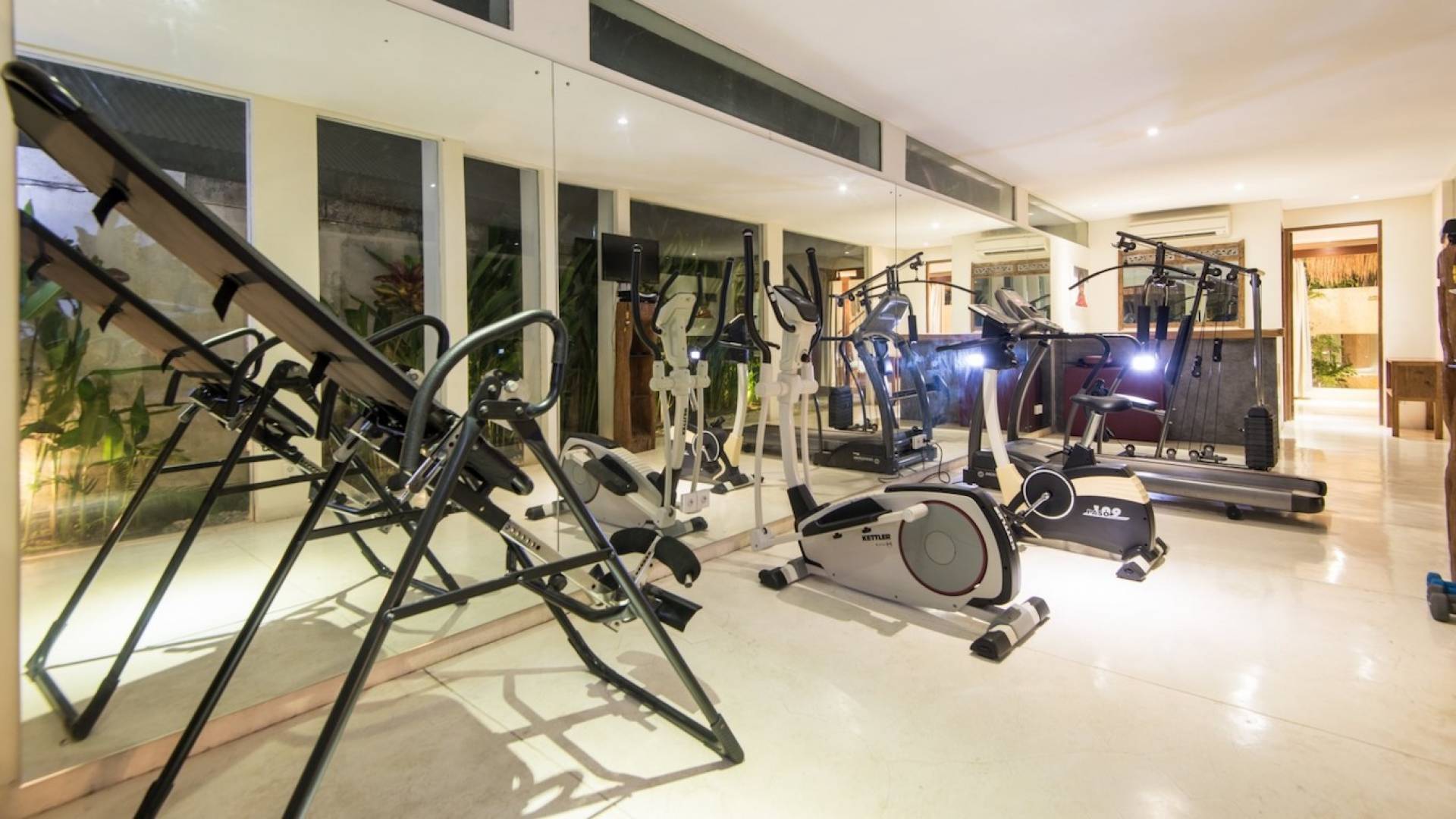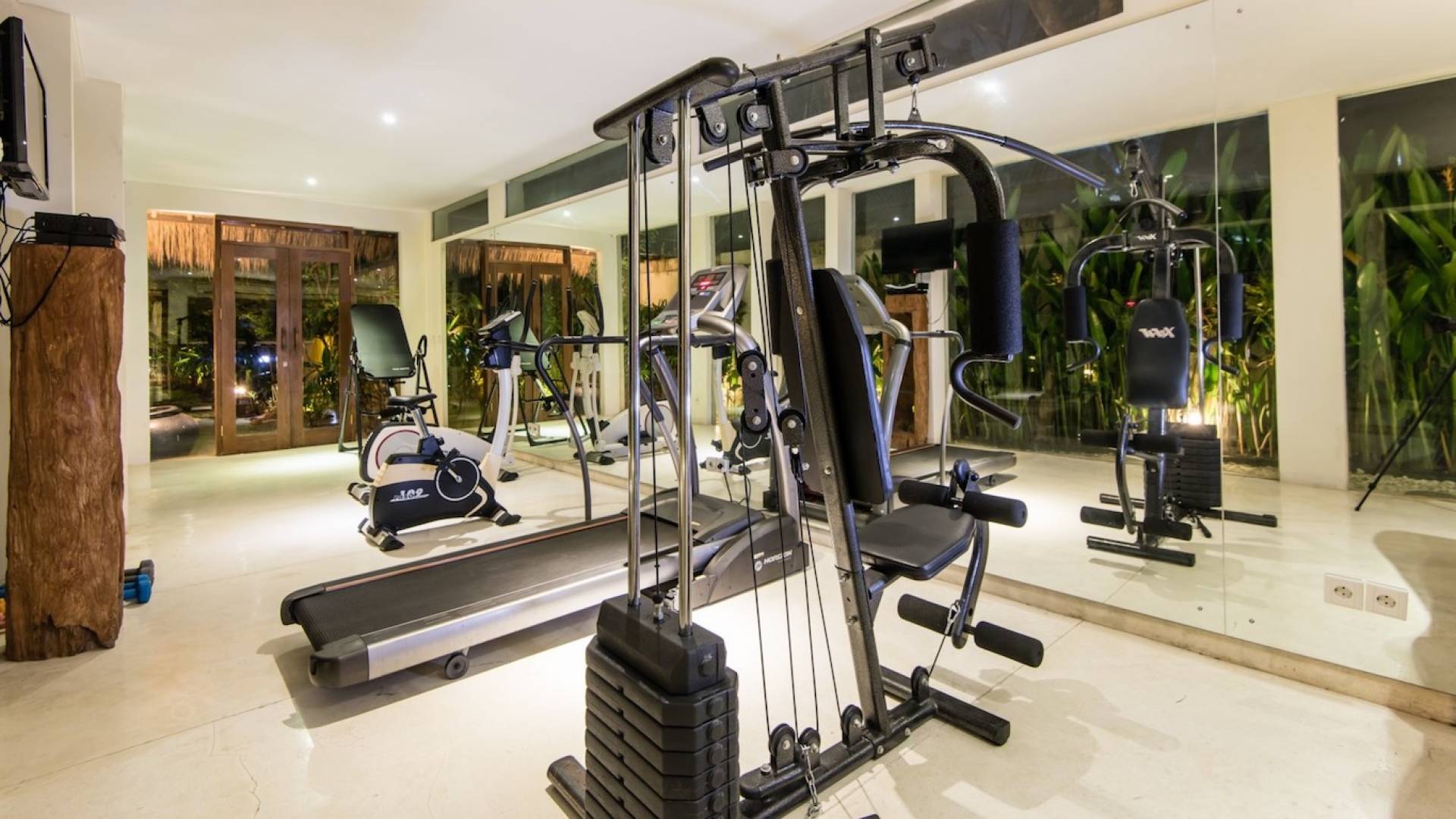 Enchanting colors of blue and green rule the large tropical garden of Villa Ku Besar, like a hidden oasis with scenting flowers and a cool swimming pool to dive into. The large glistening 22 x 3-meter swimming pool is encompassed by a timber suntanning deck and a manicured green grass lawn. Soak up the sun on the poolside loungers or open up the Balinese parasols to provide shade. At the other end of the pool, sits a traditional balé with a daybed and white curtains, topped by a thatched rooftop, perfect for a daytime snooze or enjoying a massage in the open air. For those in need of a holiday workout, Villa Ku Besar also boasts its own private gym.