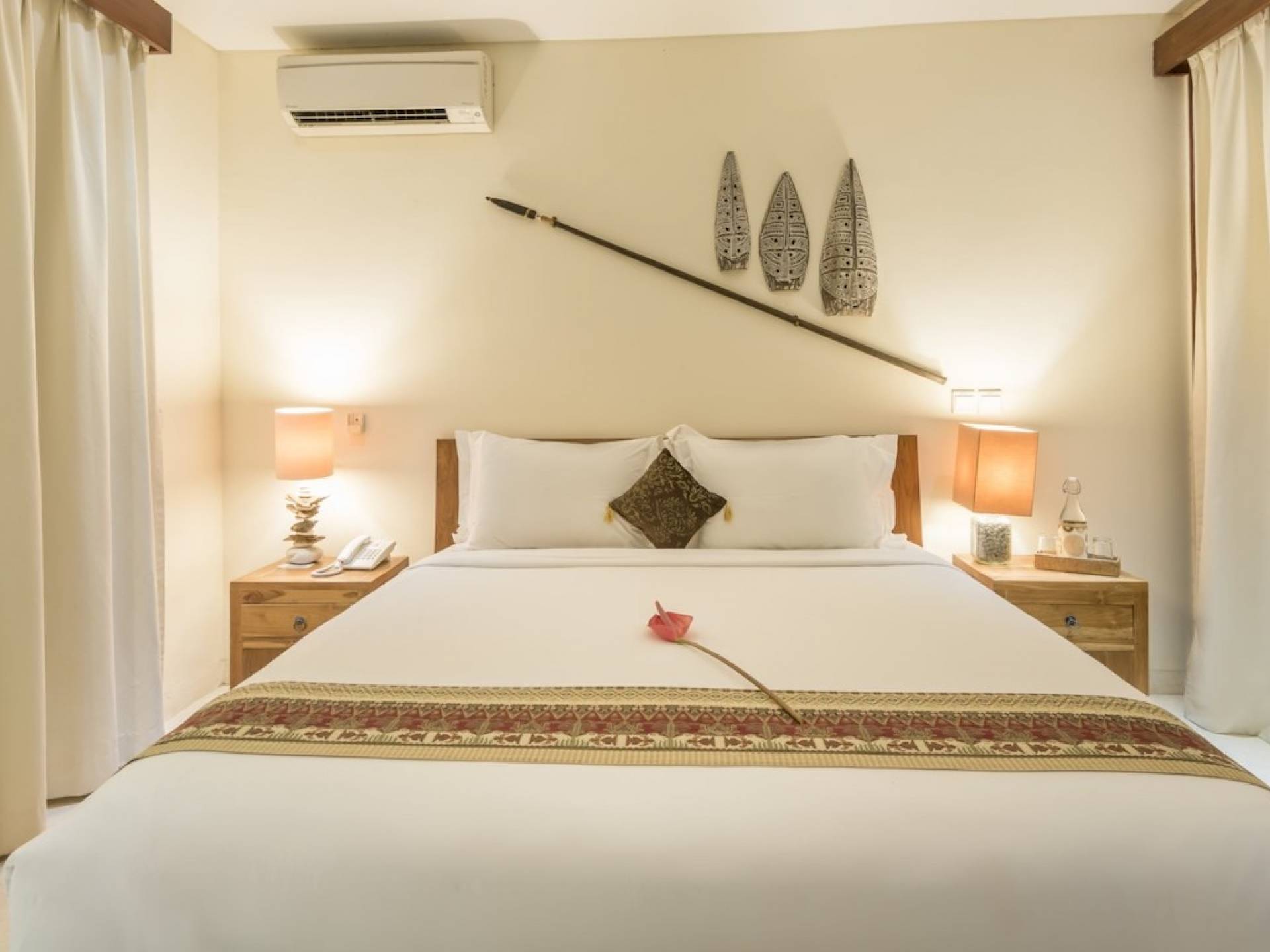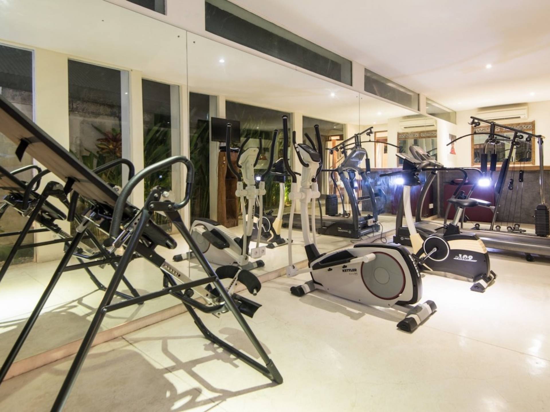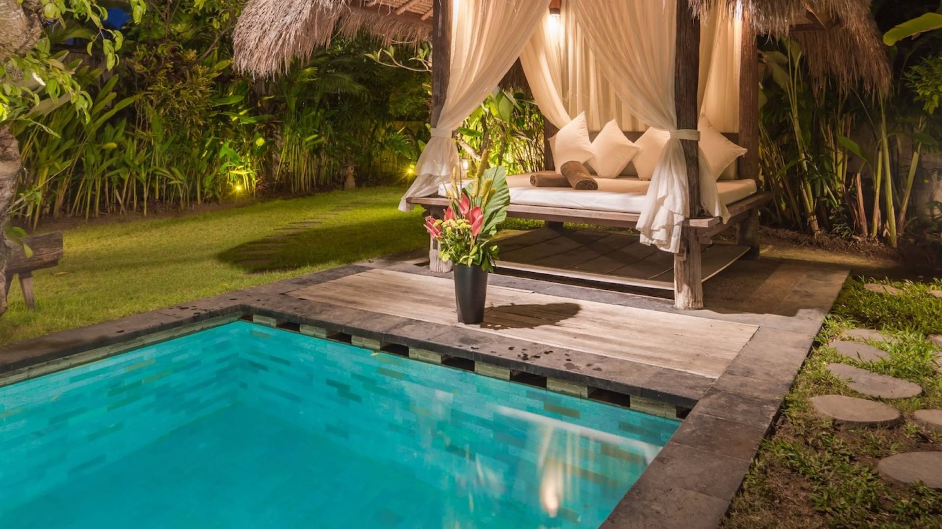 Enchanting colors of blue and green rule the large tropical garden of Villa Ku Besar, like a hidden oasis with scenting flowers and a cool swimming pool to dive into. The large glistening 22 x 3-meter swimming pool is encompassed by a timber suntanning deck and a manicured green grass lawn. Soak up the sun on the poolside loungers or open up the Balinese parasols to provide shade. At the other end of the pool, sits a traditional balé with a daybed and white curtains, topped by a thatched rooftop, perfect for a daytime snooze or enjoying a massage in the open air. For those in need of a holiday workout, Villa Ku Besar also boasts its own private gym.