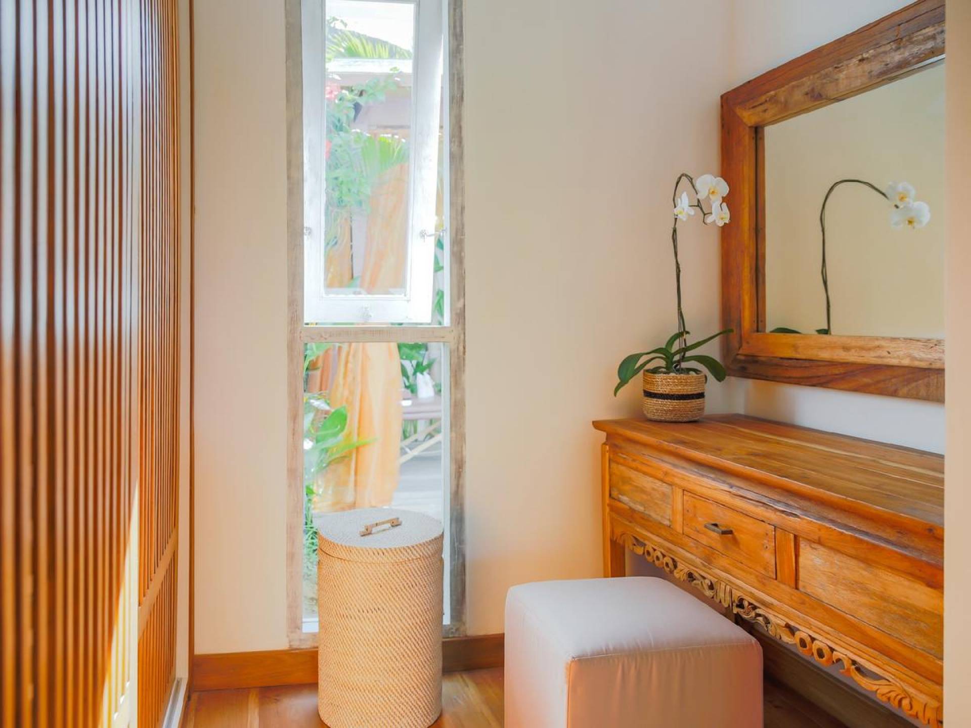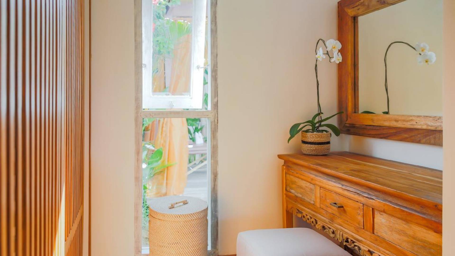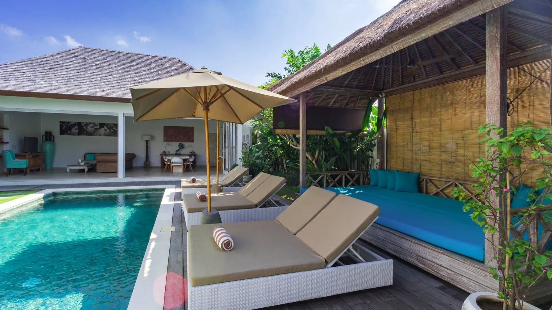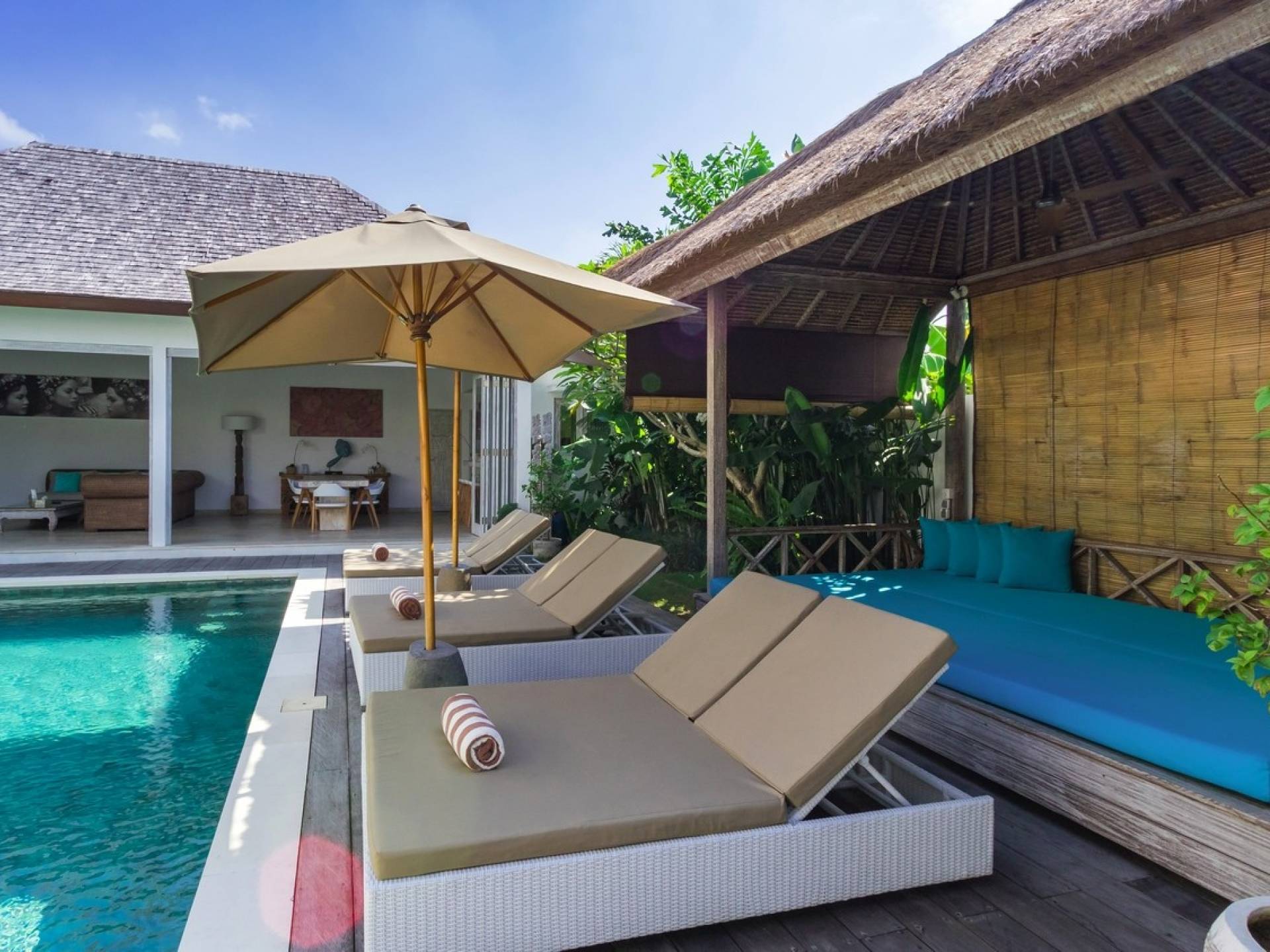 Tucked away in the chicest part of Seminyak, you can easily stroll down to Petitenget Beach, have cocktails at Potato Head, and go for drinks and food at celebrated restaurants such as Metis, Sarong, Bambu, or the beachfront La Lucciola. Inside the villa, the ambiance is perfectly tropical and peaceful, away from the buzzing crowds and the outside traffic. A stay at Villa Paraiba really gives you the best of both worlds! You are welcomed in the garden where you can jump straight into the crystal clear water of the pool if you feel like it and soak up the sun afterward, catching that beautiful tan. This way, you will be acclimatizing perfectly, getting into the holiday vibe with a cocktail or a whole cold coconut within reach of hand.