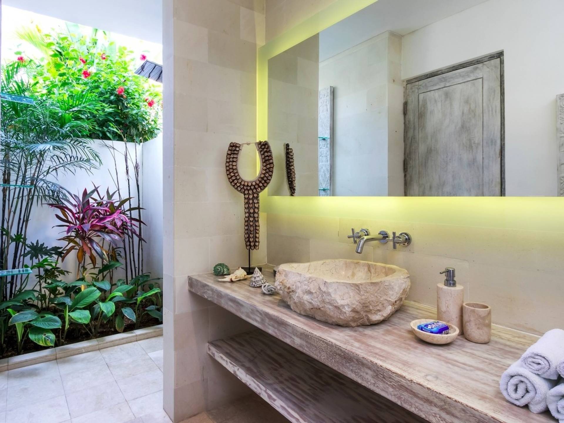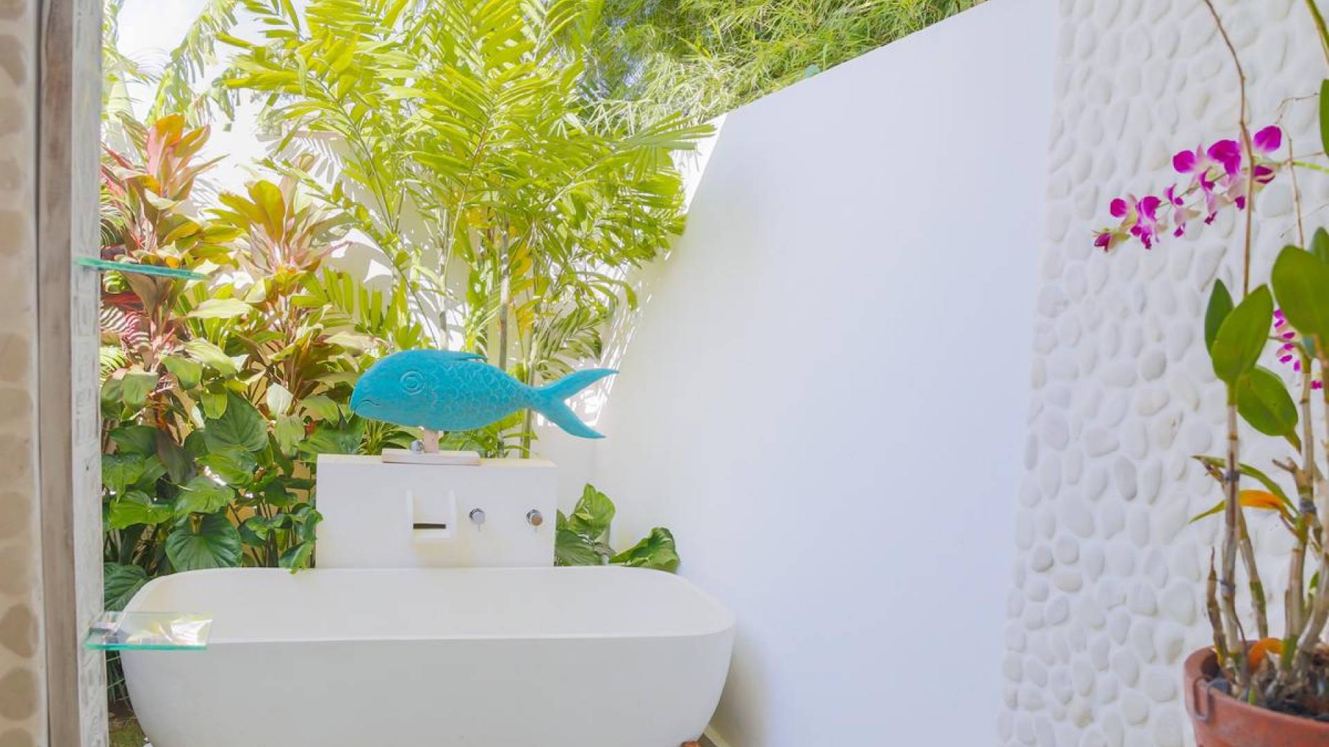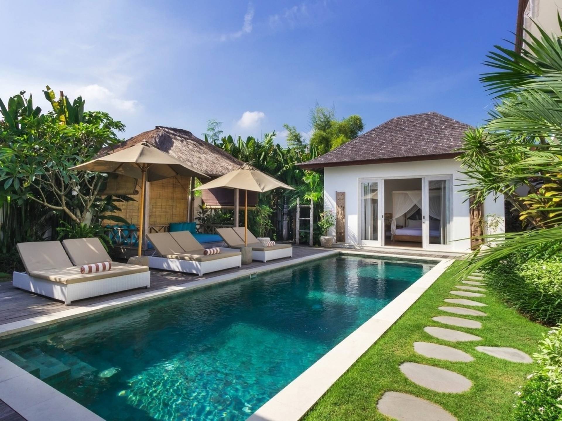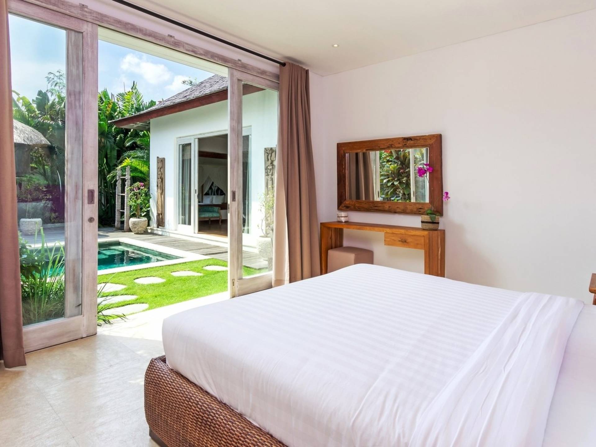 Tucked away in the chicest part of Seminyak, you can easily stroll down to Petitenget Beach, have cocktails at Potato Head, and go for drinks and food at celebrated restaurants such as Metis, Sarong, Bambu, or the beachfront La Lucciola. Inside the villa, the ambiance is perfectly tropical and peaceful, away from the buzzing crowds and the outside traffic. A stay at Villa Paraiba really gives you the best of both worlds! You are welcomed in the garden where you can jump straight into the crystal clear water of the pool if you feel like it and soak up the sun afterward, catching that beautiful tan. This way, you will be acclimatizing perfectly, getting into the holiday vibe with a cocktail or a whole cold coconut within reach of hand.