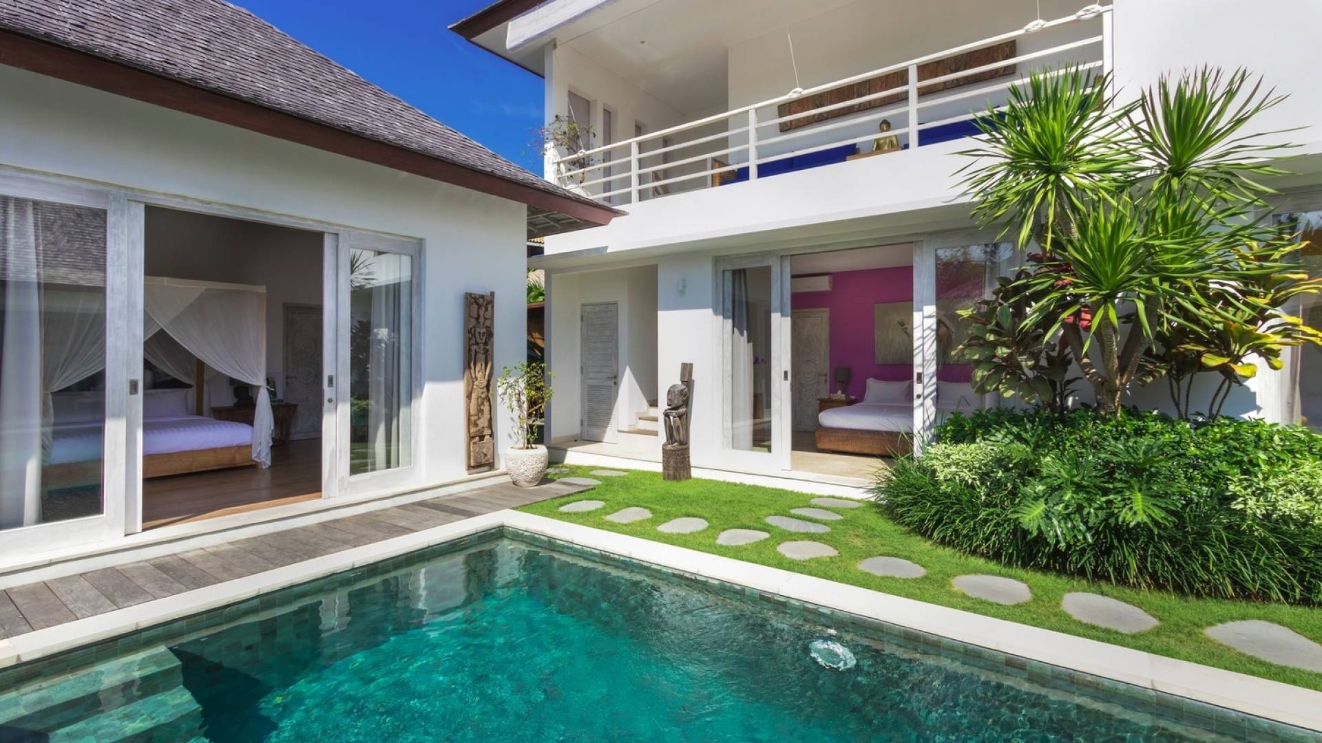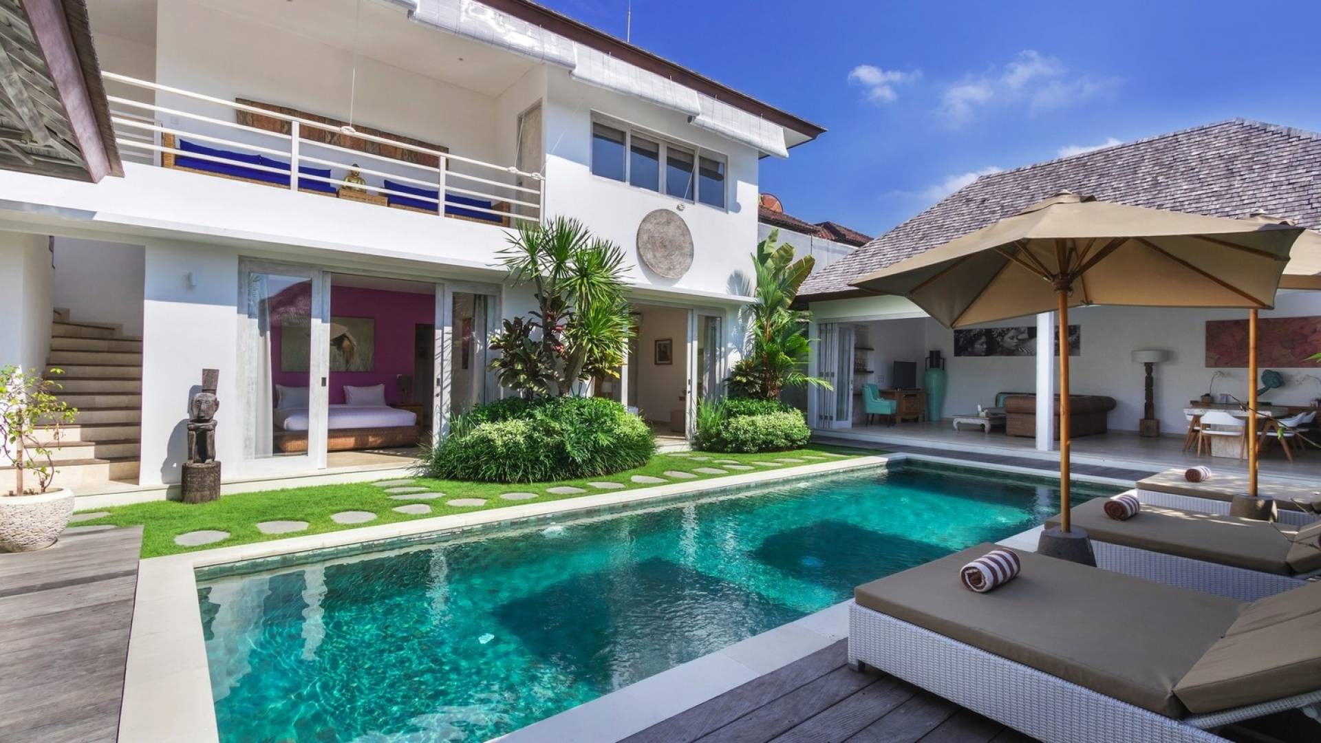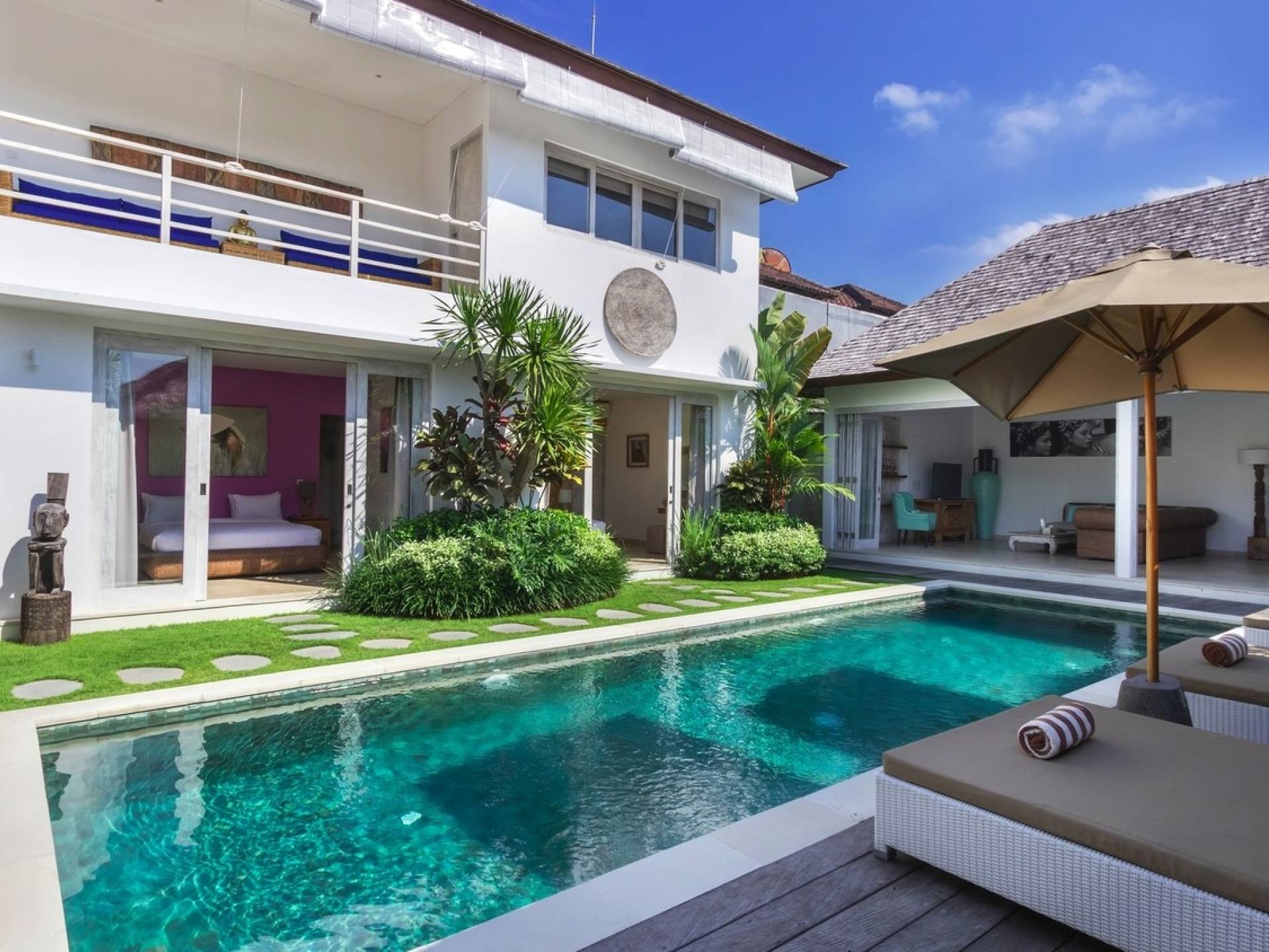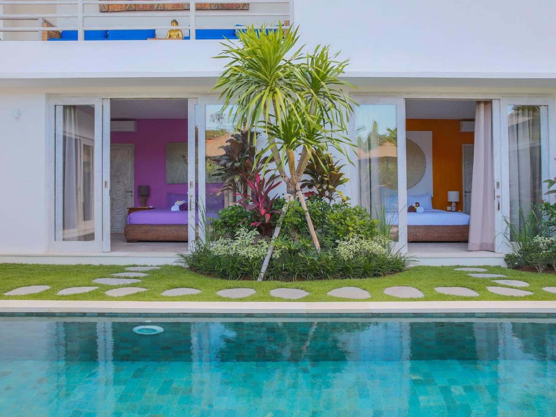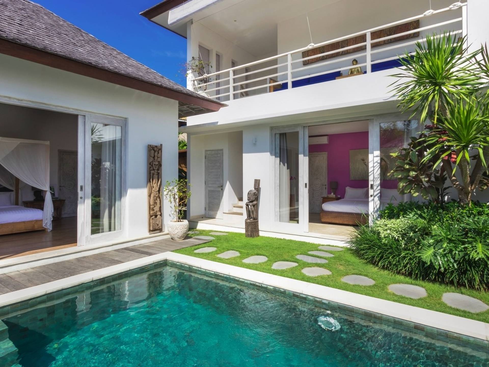 Villa Paraiba Seminyak is a tropical, Balinese-style, super colorful holiday home, hidden away from the hustle and bustle in the heart of Seminyak. You get to experience the tropical lifestyle while not giving in to modern comforts and holiday luxuries. Enough of swimming in the pool and relaxing in the garden or on the sofa? Go explore the fashionable town of Seminyak, famous for its shops, cafes, restaurants, and beach clubs. Make sure to catch that magnificent island sunset, too! Coming home to Villa Paraiba Seminyak will be just wonderful every day during your stay!