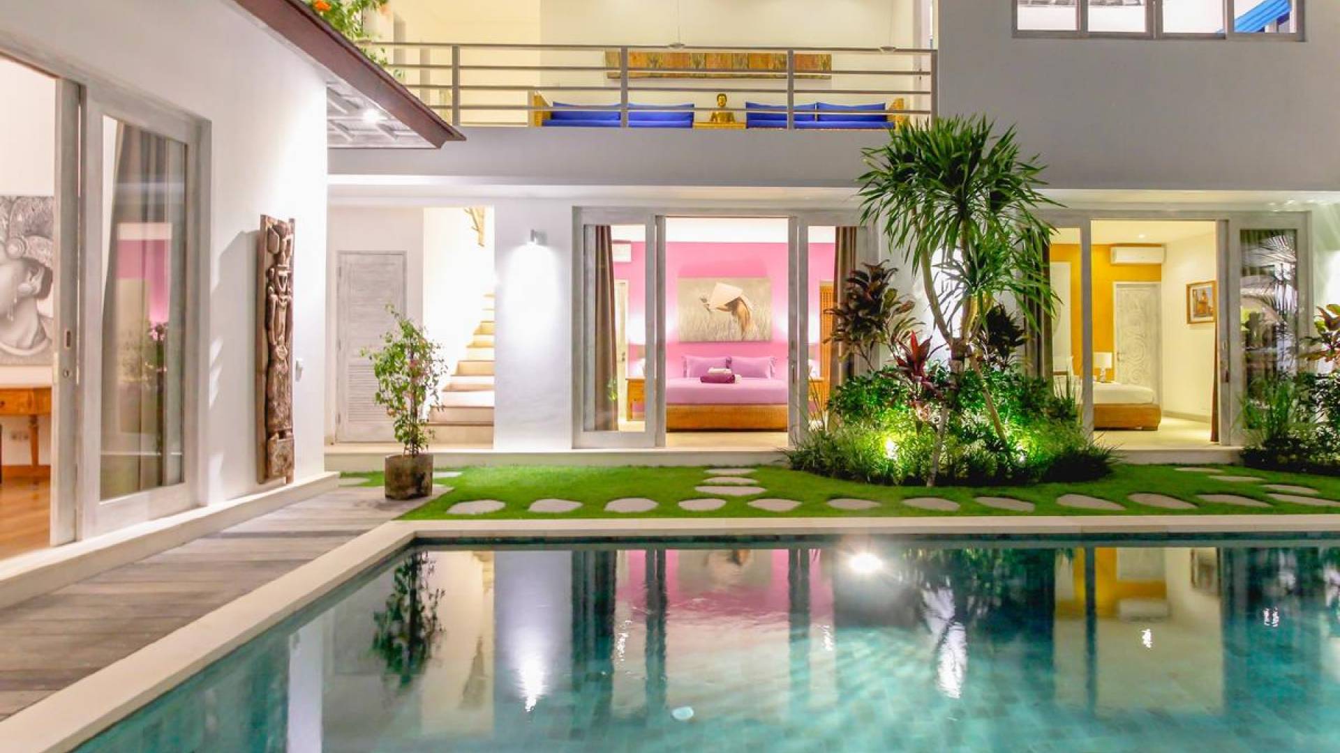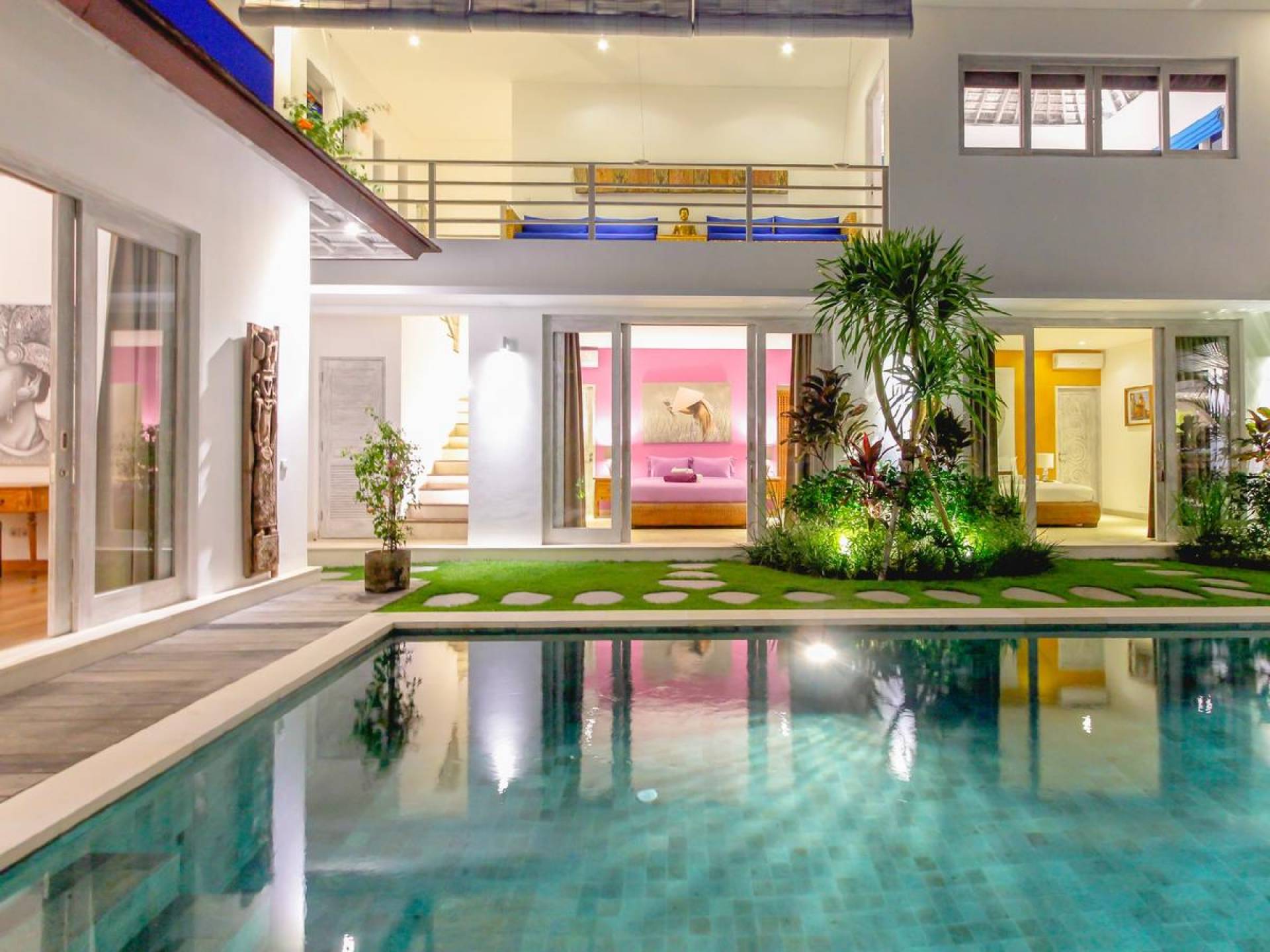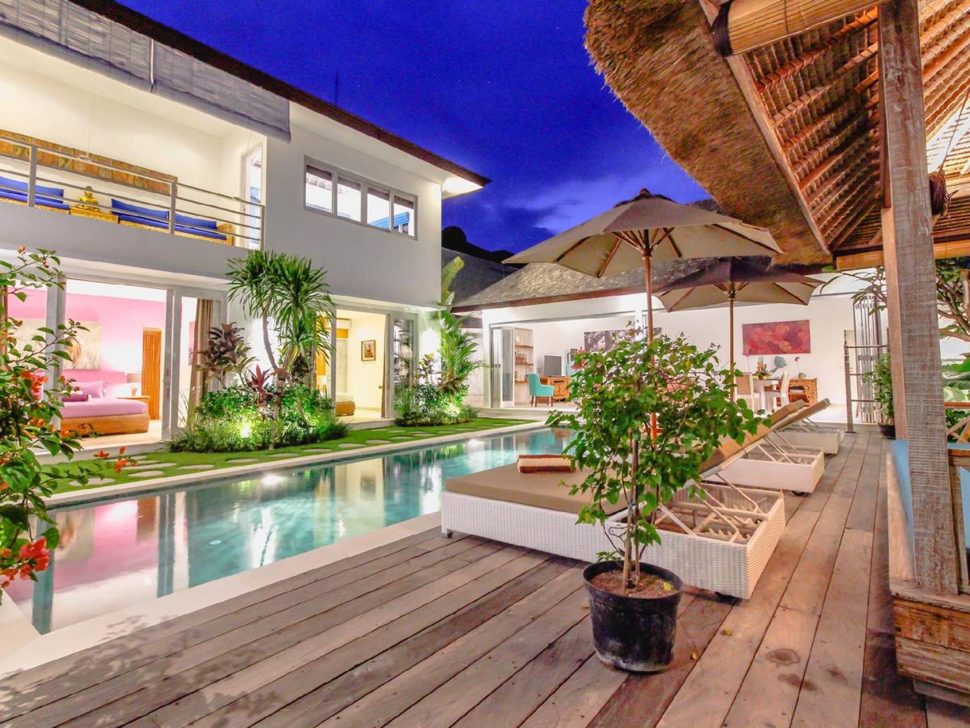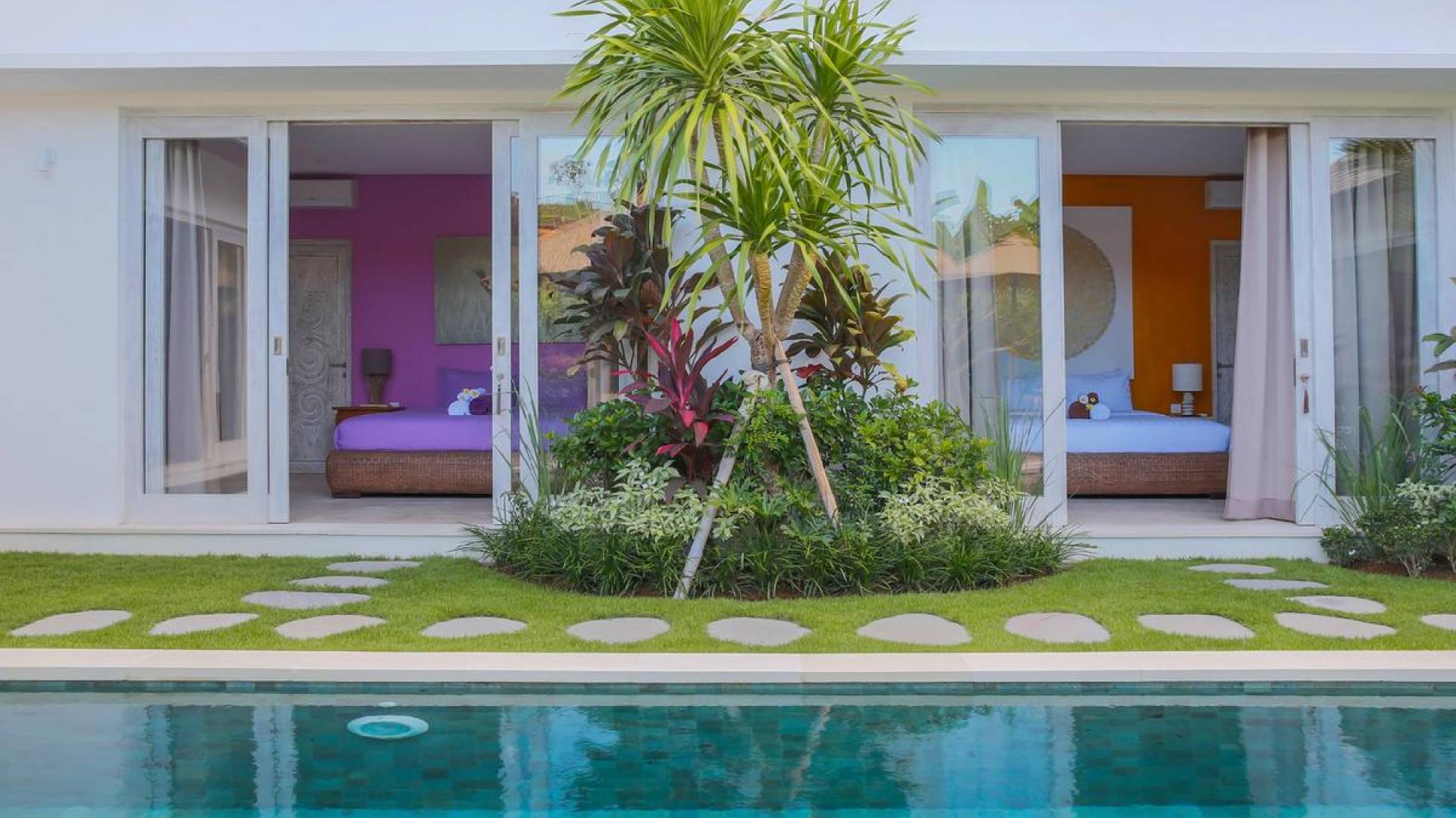 Villa Paraiba Seminyak is a tropical, Balinese-style, super colorful holiday home, hidden away from the hustle and bustle in the heart of Seminyak. You get to experience the tropical lifestyle while not giving in to modern comforts and holiday luxuries. Enough of swimming in the pool and relaxing in the garden or on the sofa? Go explore the fashionable town of Seminyak, famous for its shops, cafes, restaurants, and beach clubs. Make sure to catch that magnificent island sunset, too! Coming home to Villa Paraiba Seminyak will be just wonderful every day during your stay!