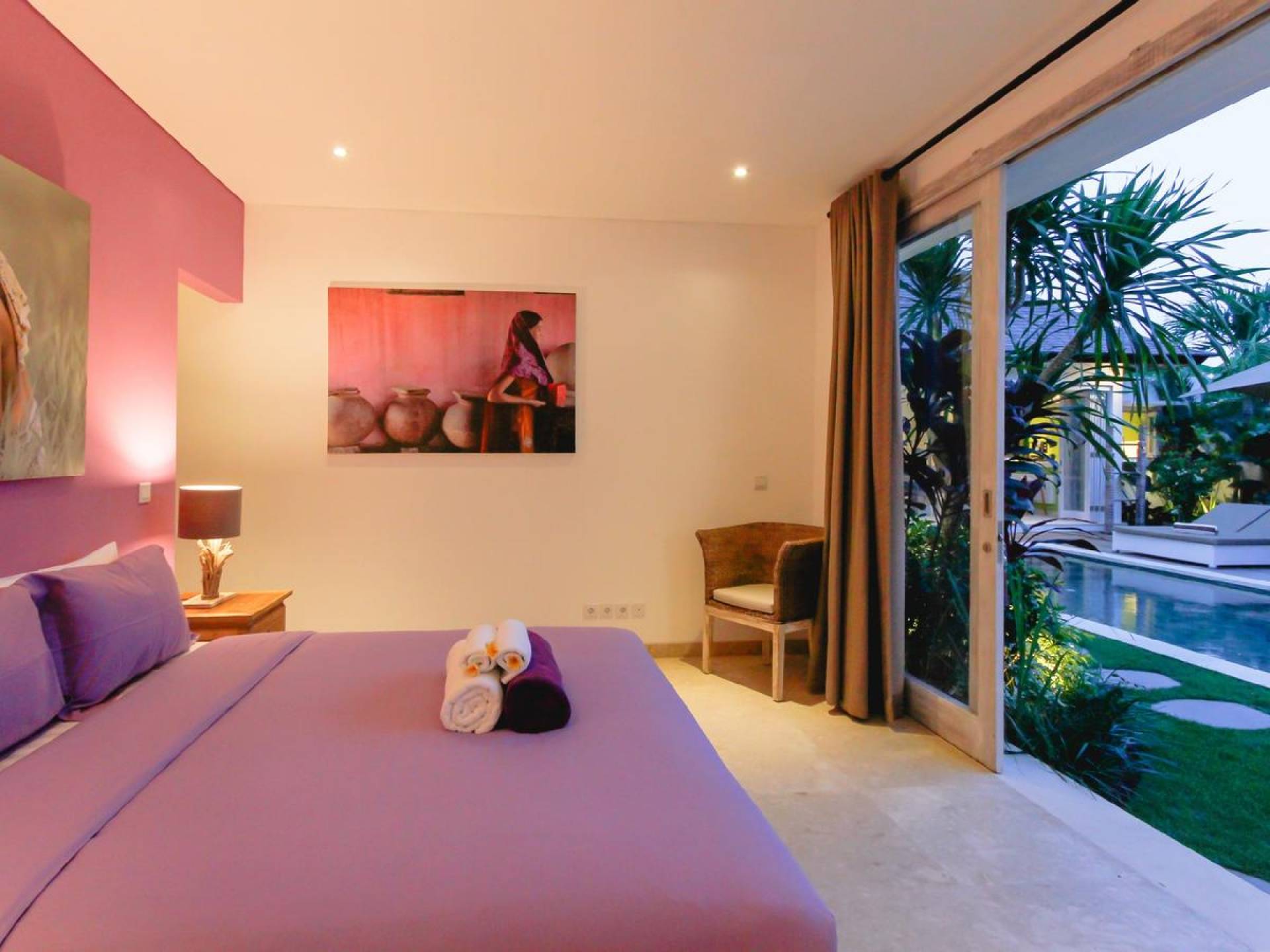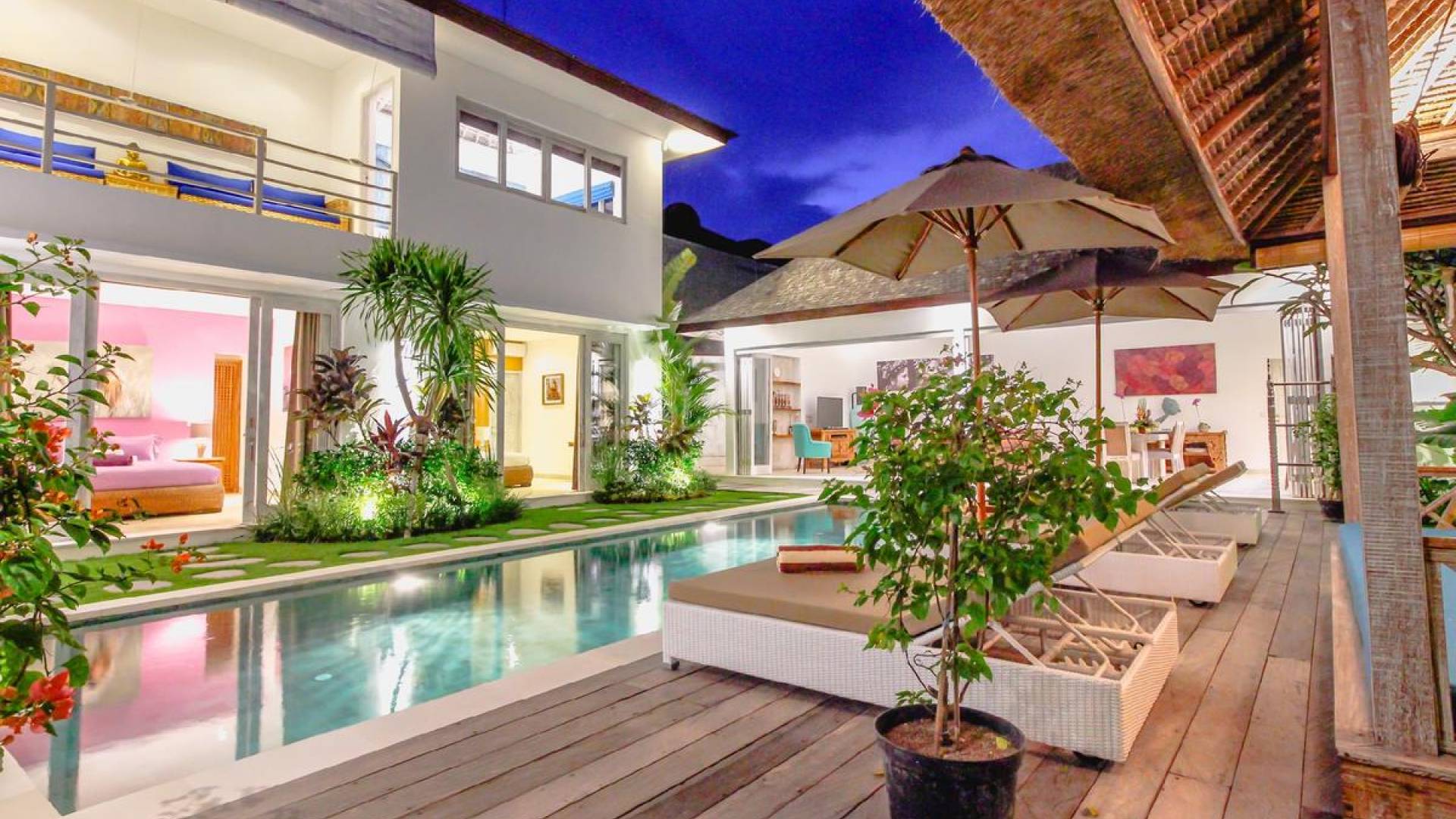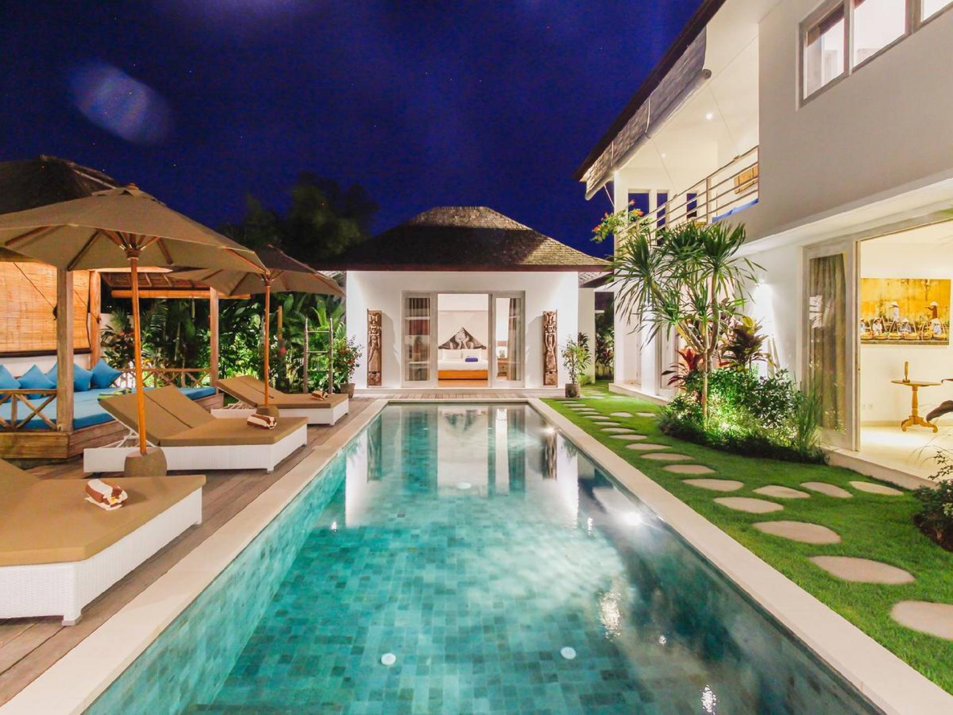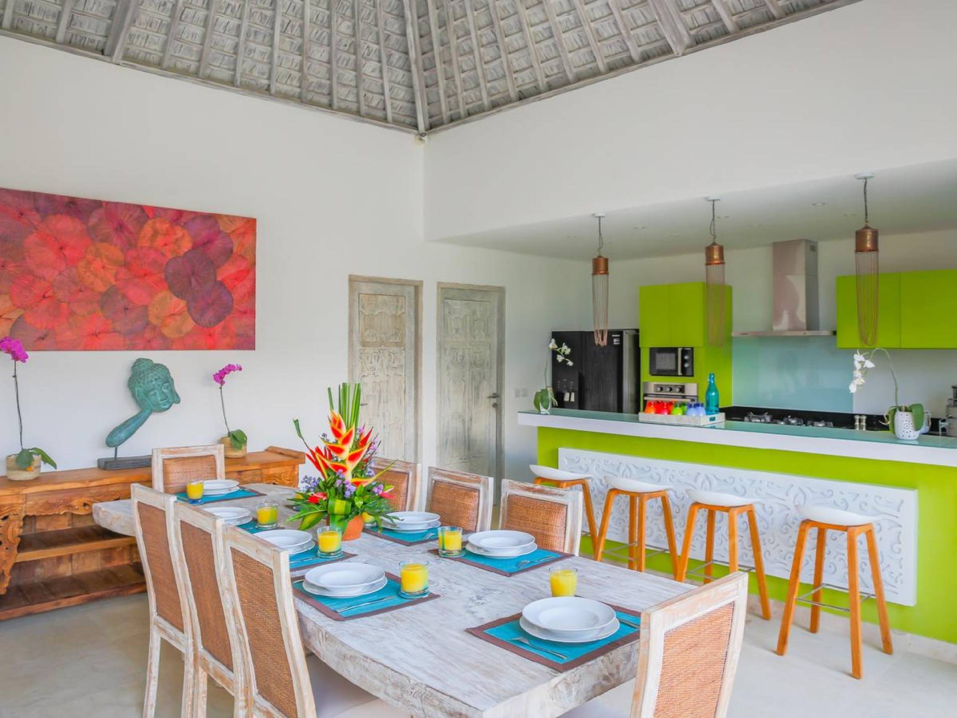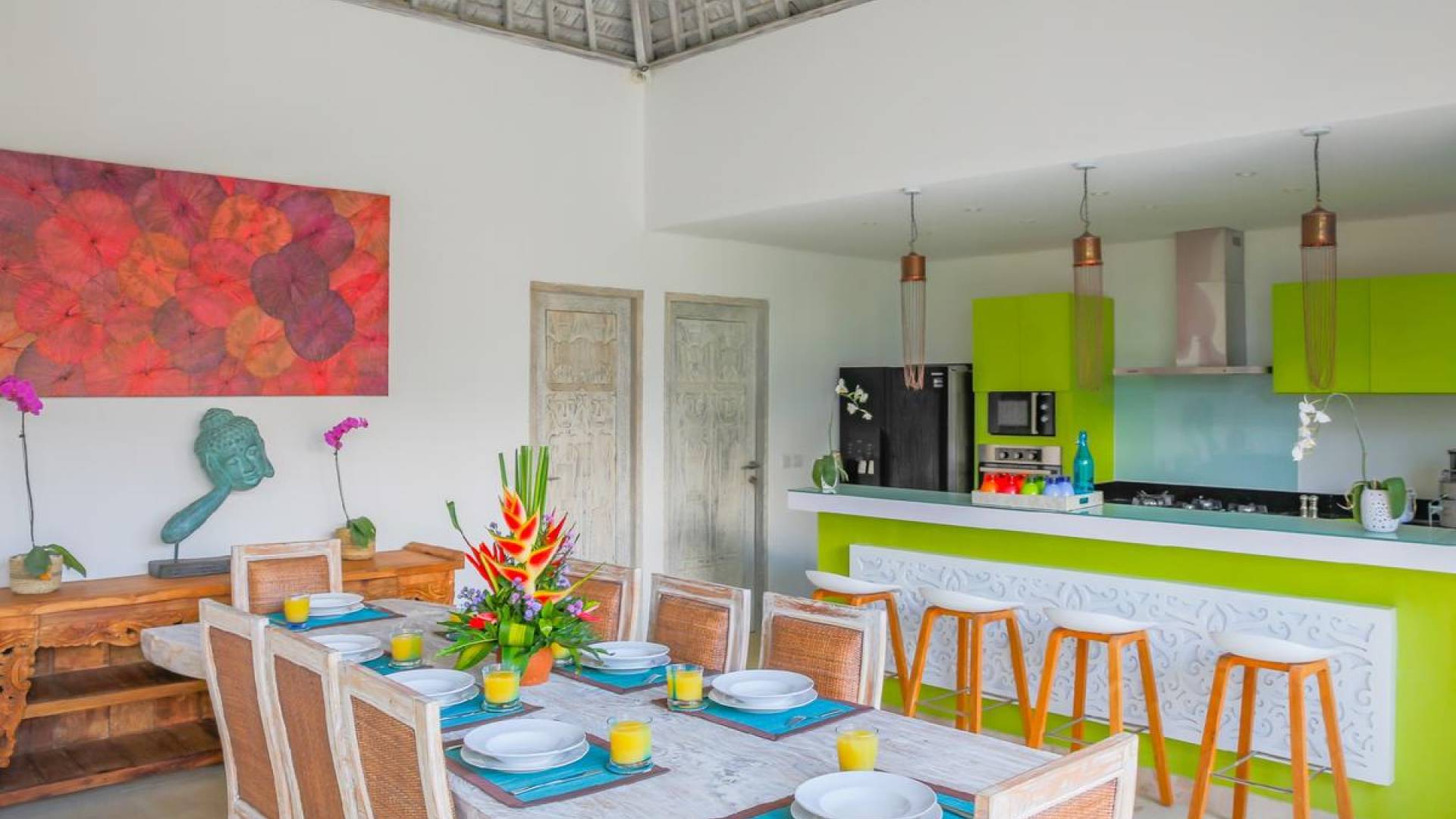 Villa Paraiba Seminyak is a tropical, Balinese-style, super colorful holiday home, hidden away from the hustle and bustle in the heart of Seminyak. You get to experience the tropical lifestyle while not giving in to modern comforts and holiday luxuries. Enough of swimming in the pool and relaxing in the garden or on the sofa? Go explore the fashionable town of Seminyak, famous for its shops, cafes, restaurants, and beach clubs. Make sure to catch that magnificent island sunset, too! Coming home to Villa Paraiba Seminyak will be just wonderful every day during your stay!