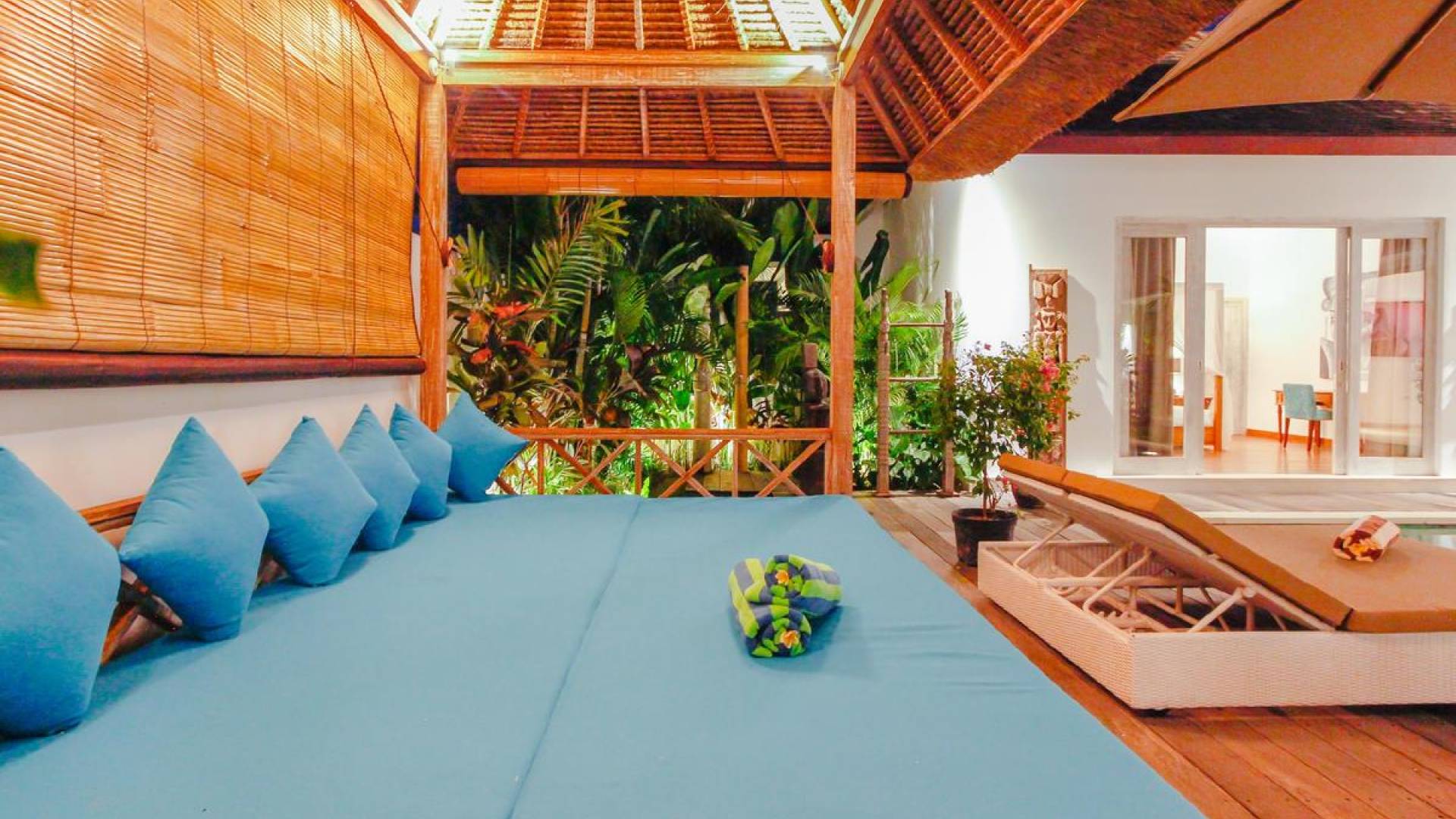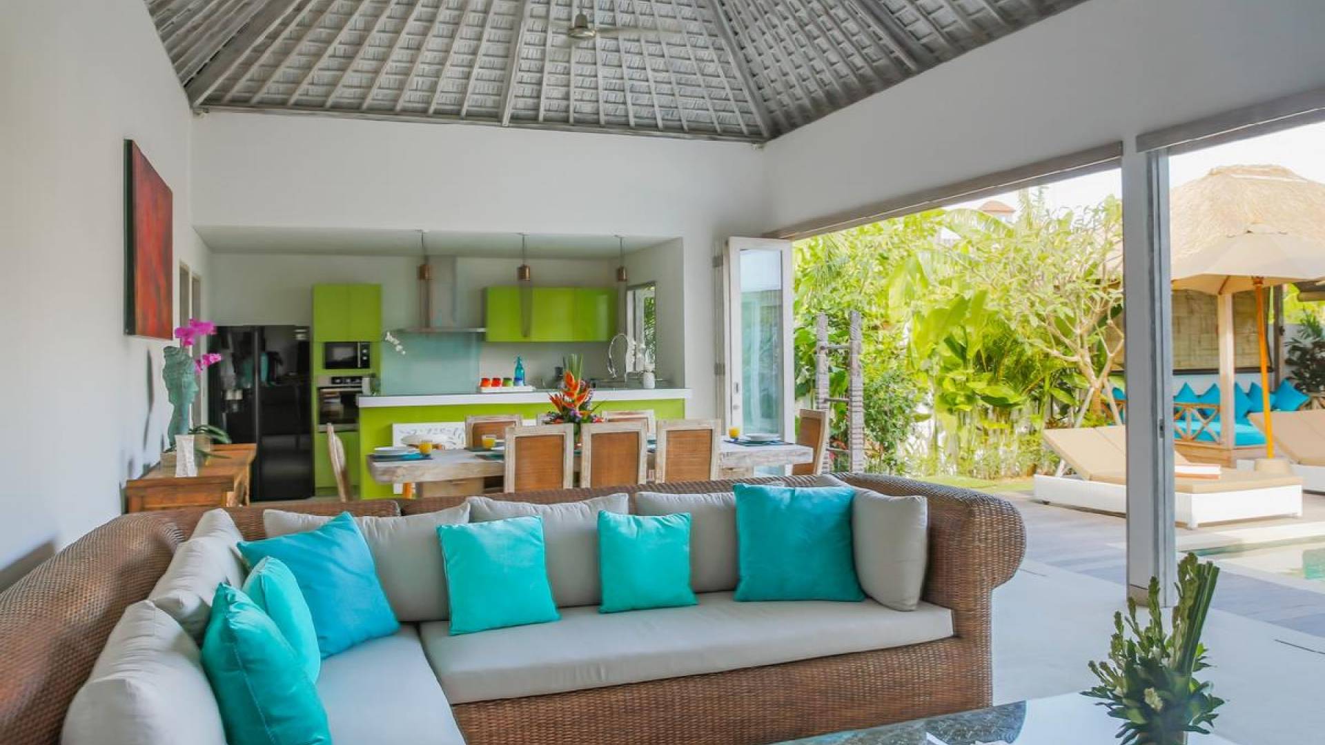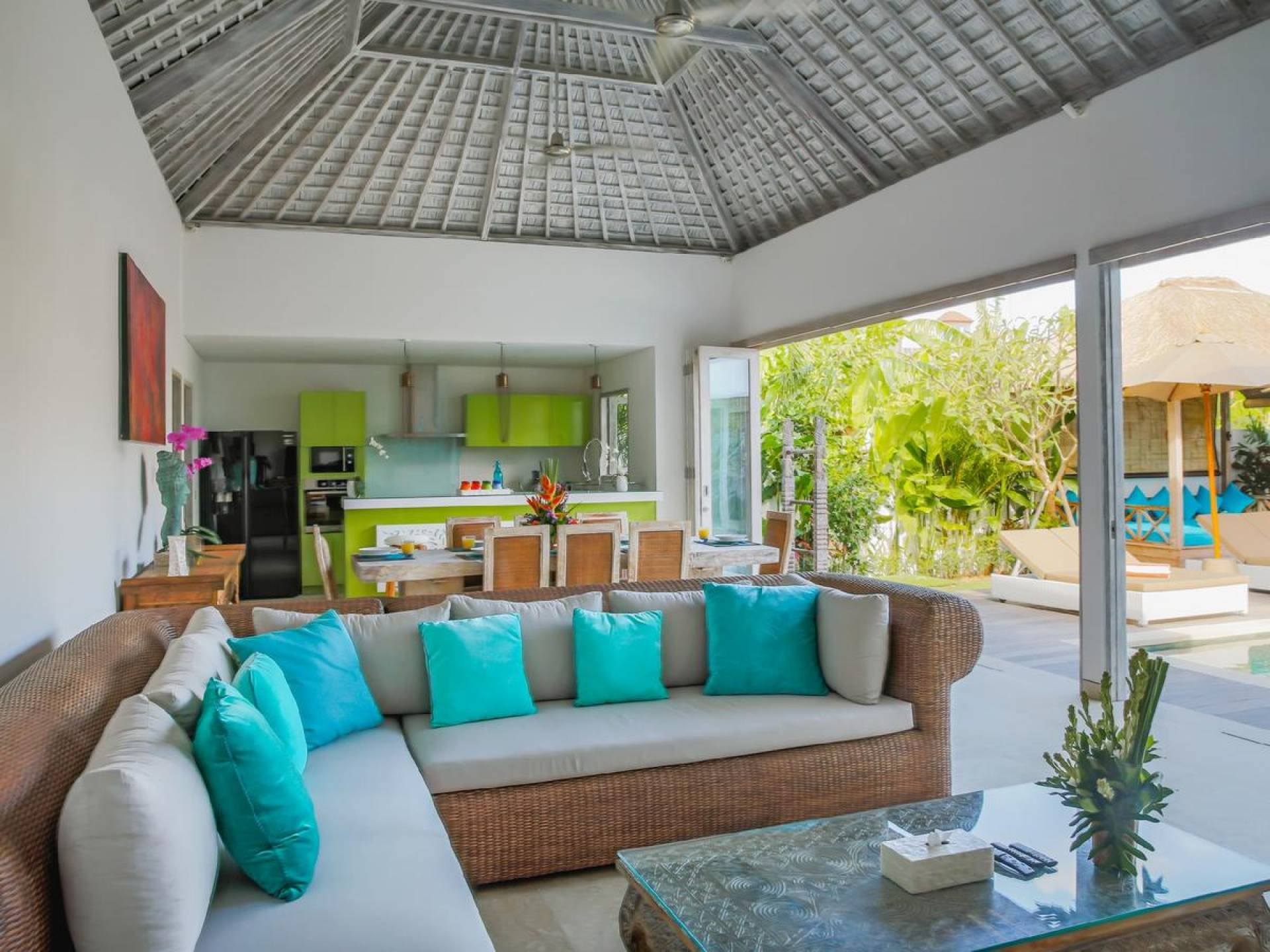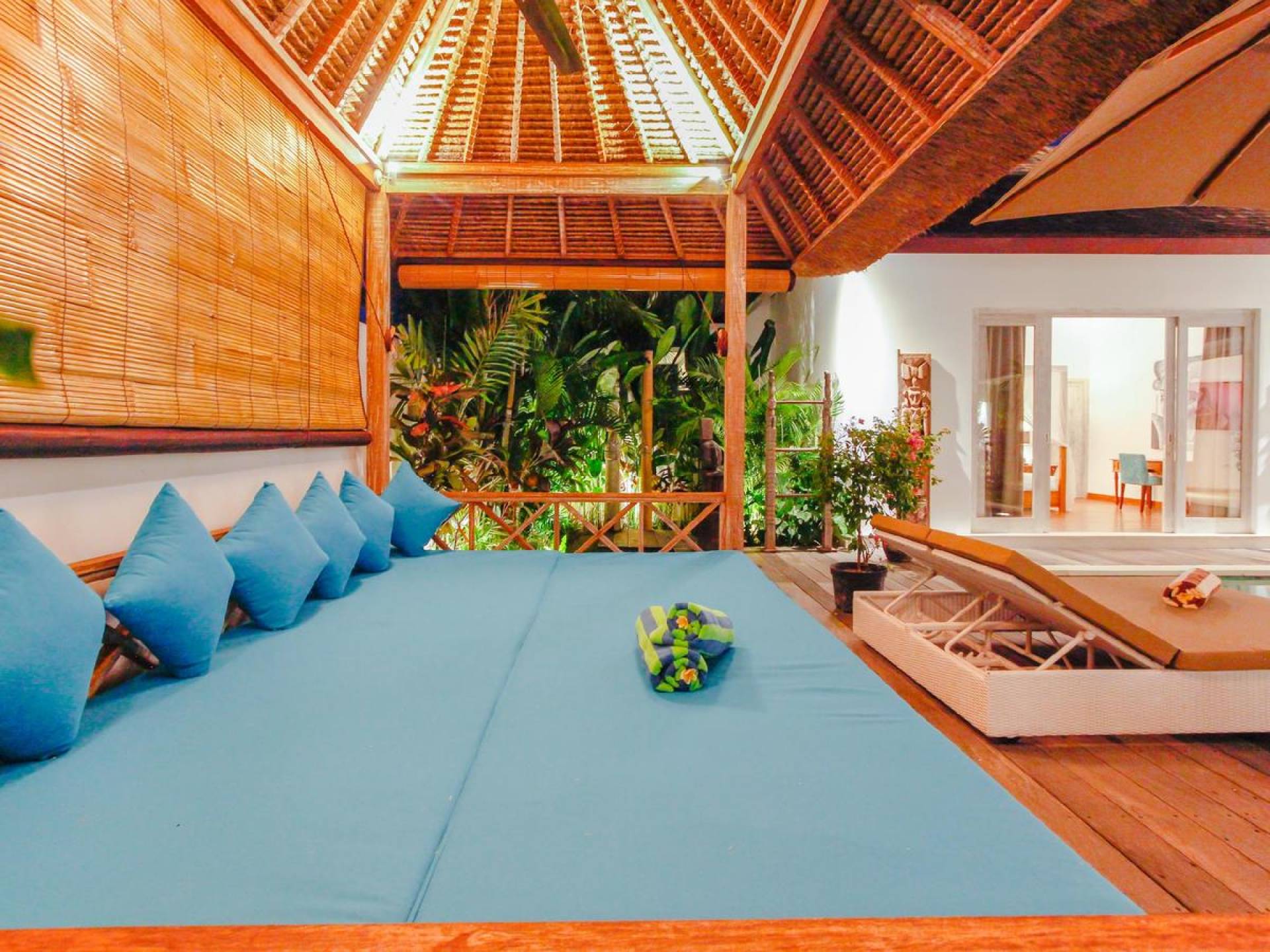 There are super comfy double daybeds placed by the poolside and there is a large alang alang-roofed gazebo for those seeking shade. The living pavilion features floor-to-ceiling glass sliding doors that open up to the garden. Guests can experience the tropical open-plan living in the daytime, while in the evening, the doors and curtains can be closed to make it nice and cozy for an in-villa movie evening. The living room features a traditional Balinese high soaring timber rooftop and it is decorated with colorful artifacts.