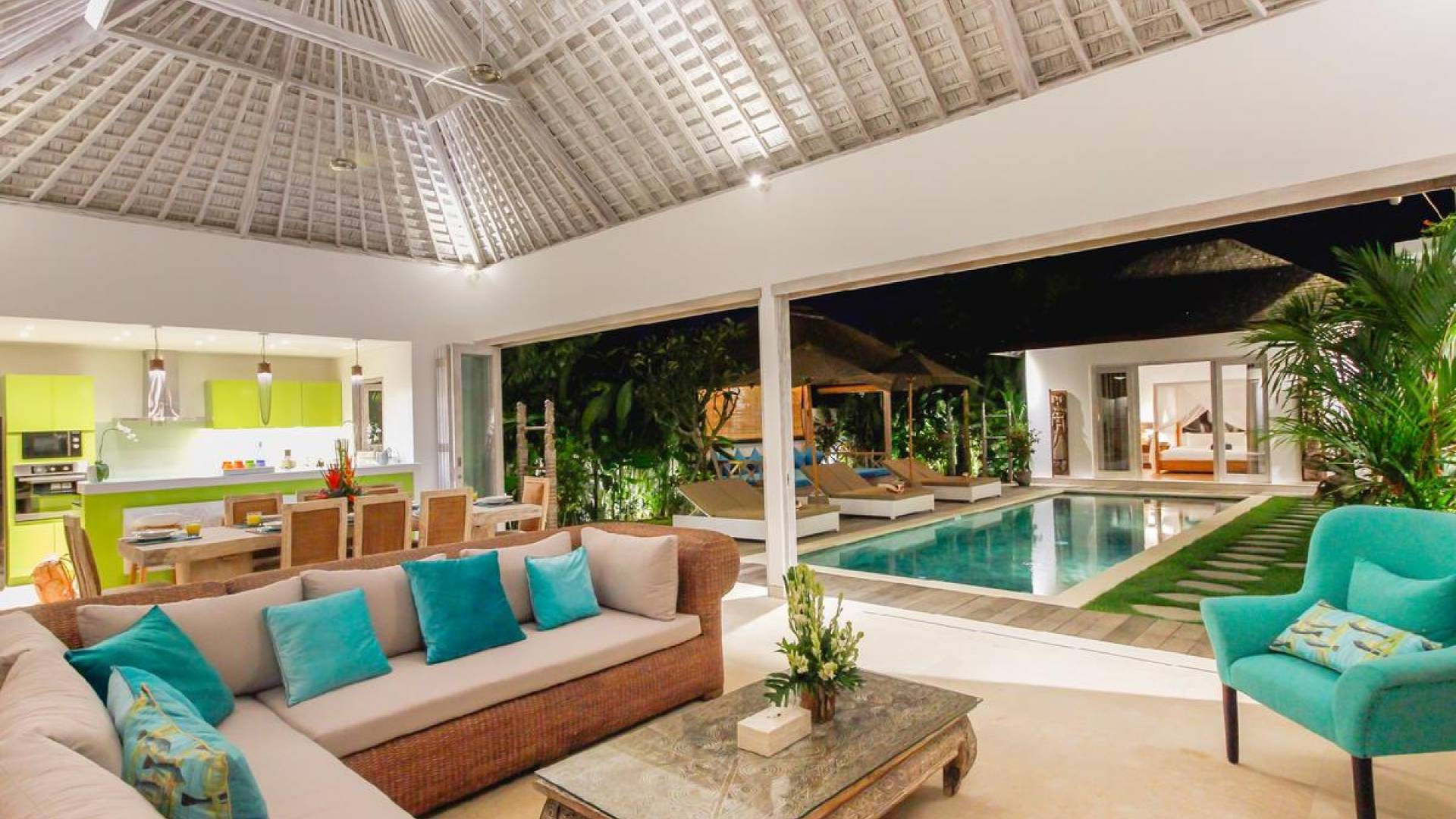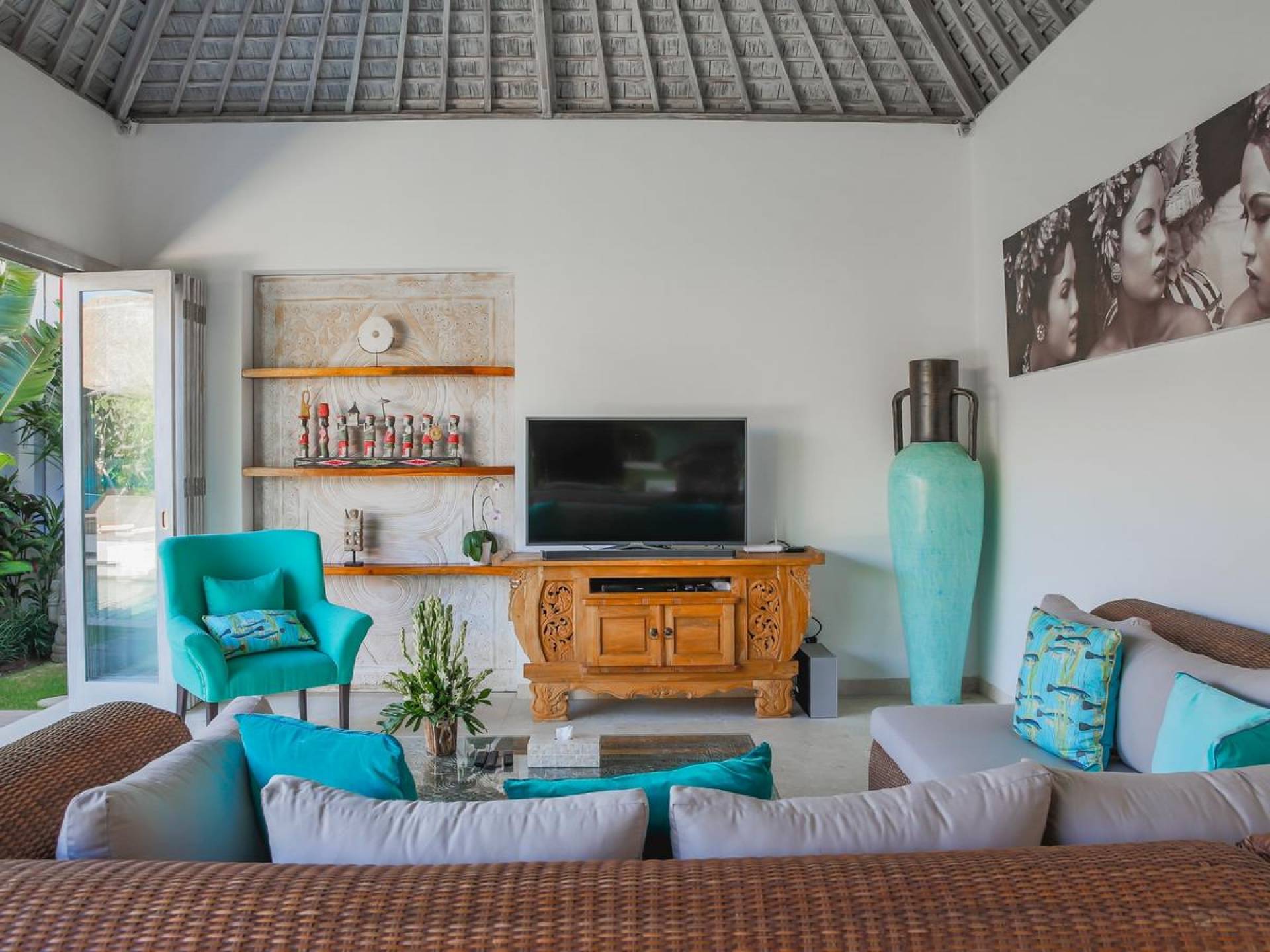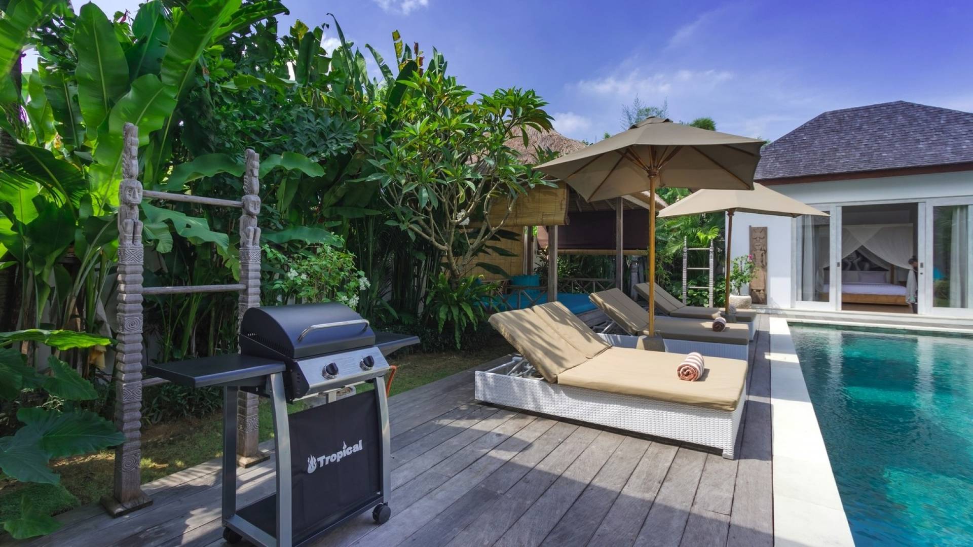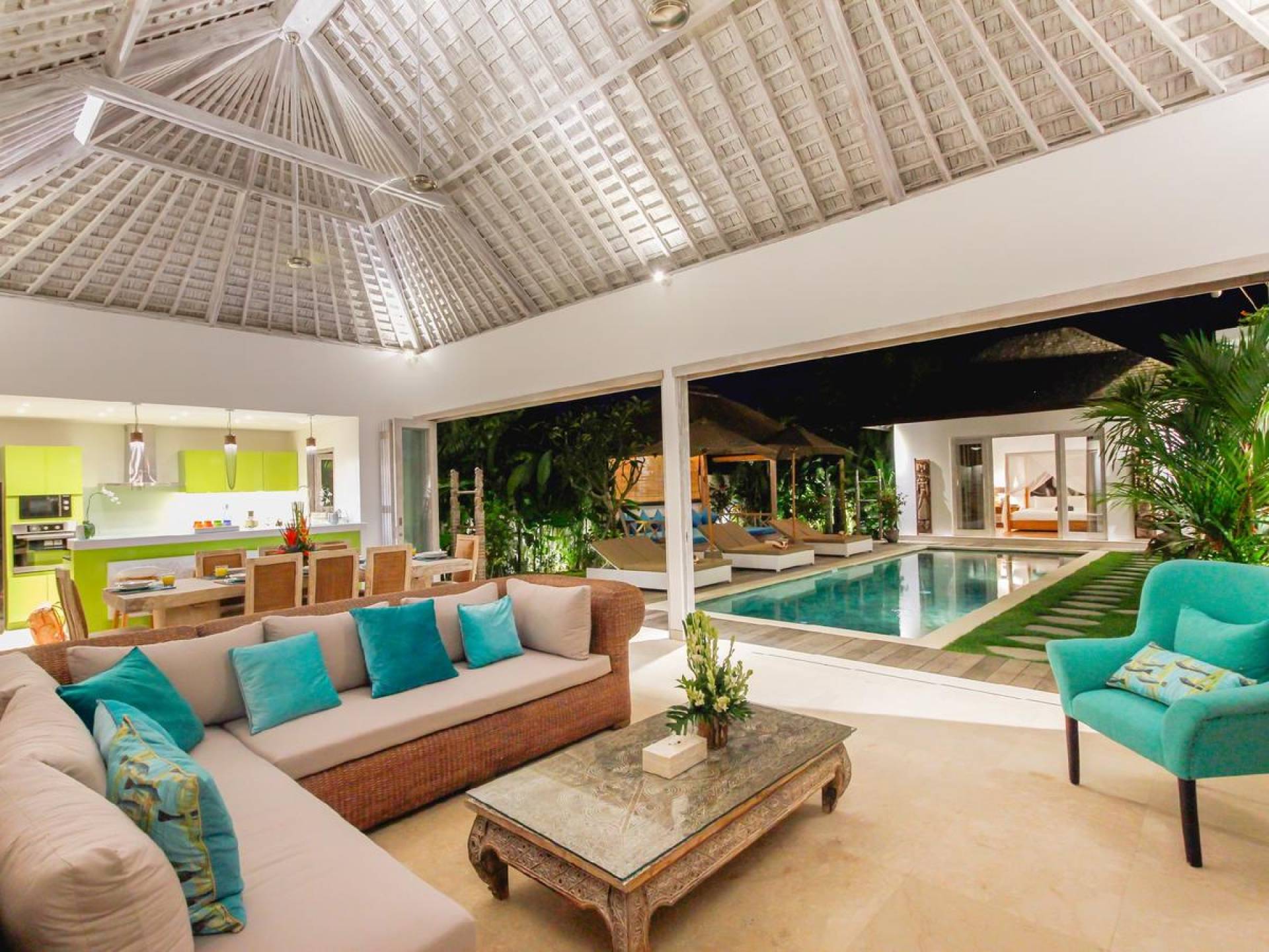 There are super comfy double daybeds placed by the poolside and there is a large alang alang-roofed gazebo for those seeking shade. The living pavilion features floor-to-ceiling glass sliding doors that open up to the garden. Guests can experience the tropical open-plan living in the daytime, while in the evening, the doors and curtains can be closed to make it nice and cozy for an in-villa movie evening. The living room features a traditional Balinese high soaring timber rooftop and it is decorated with colorful artifacts.