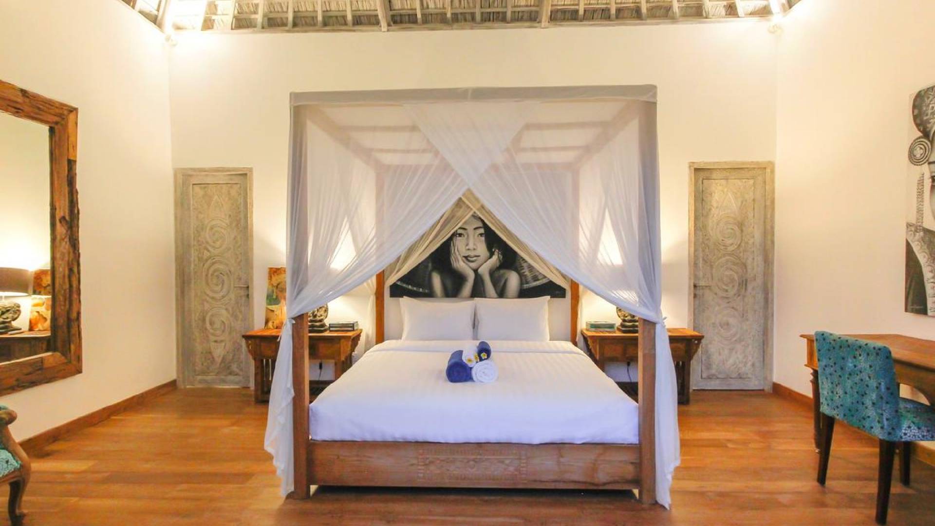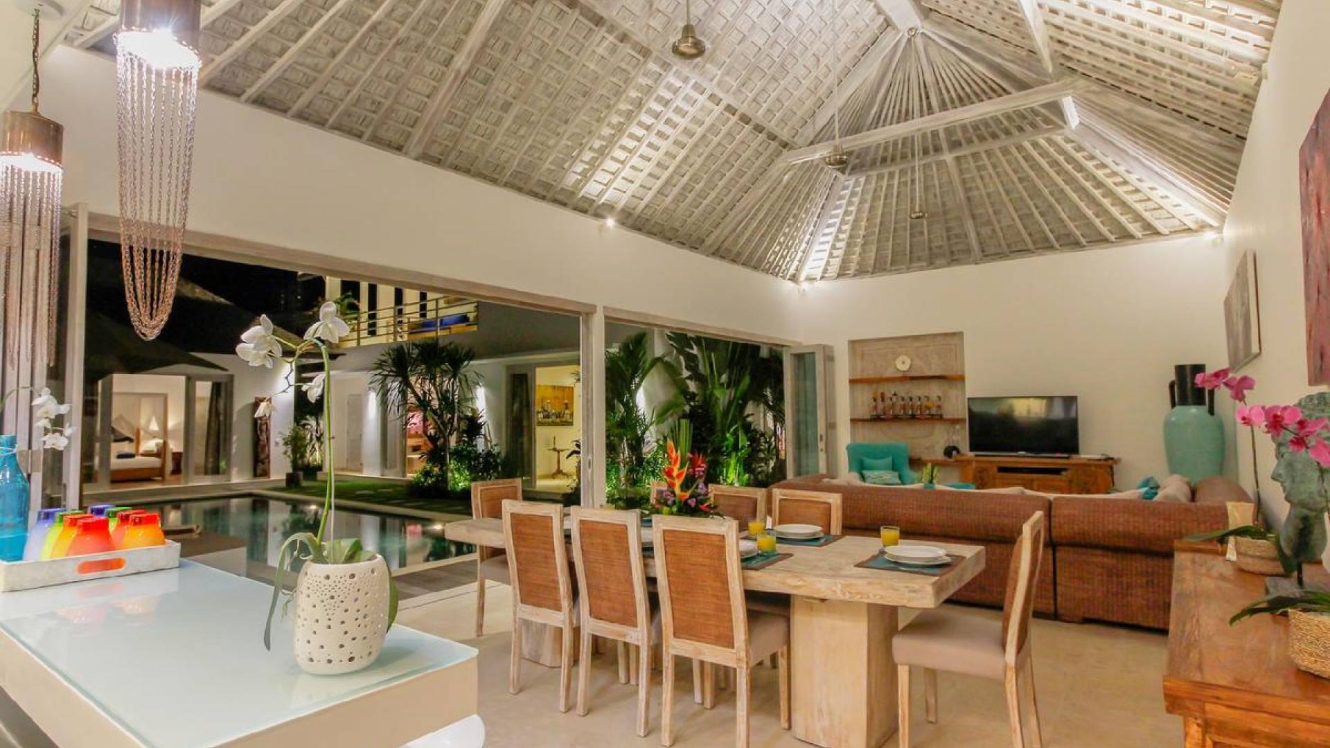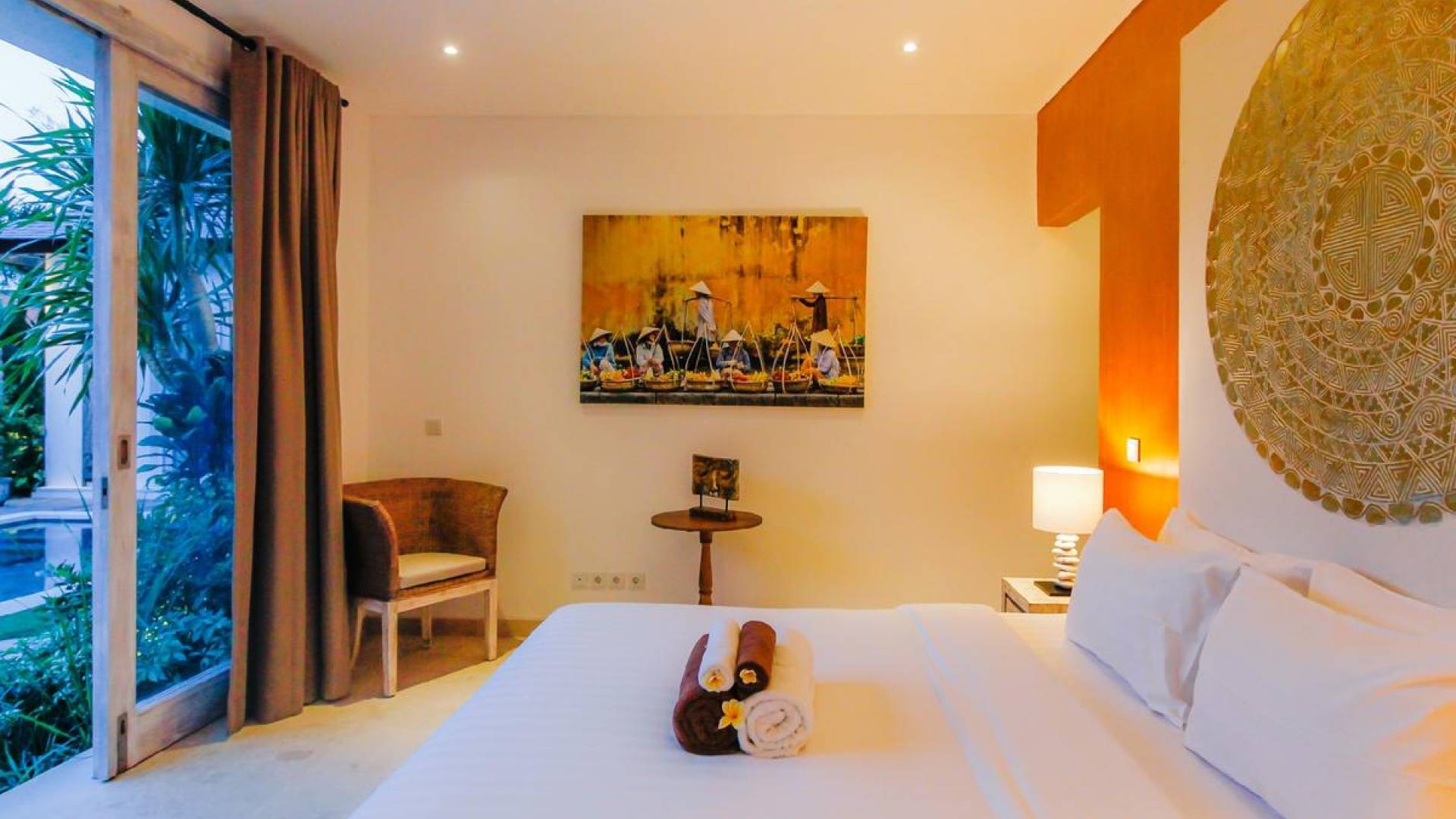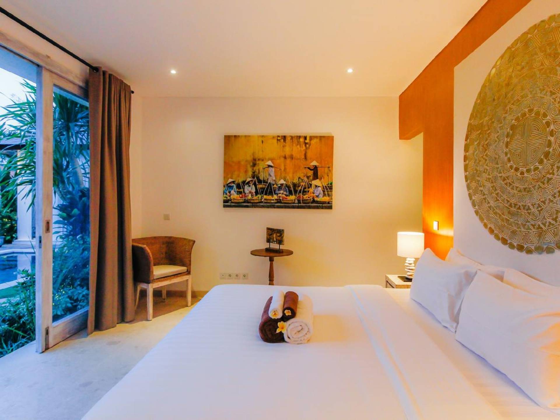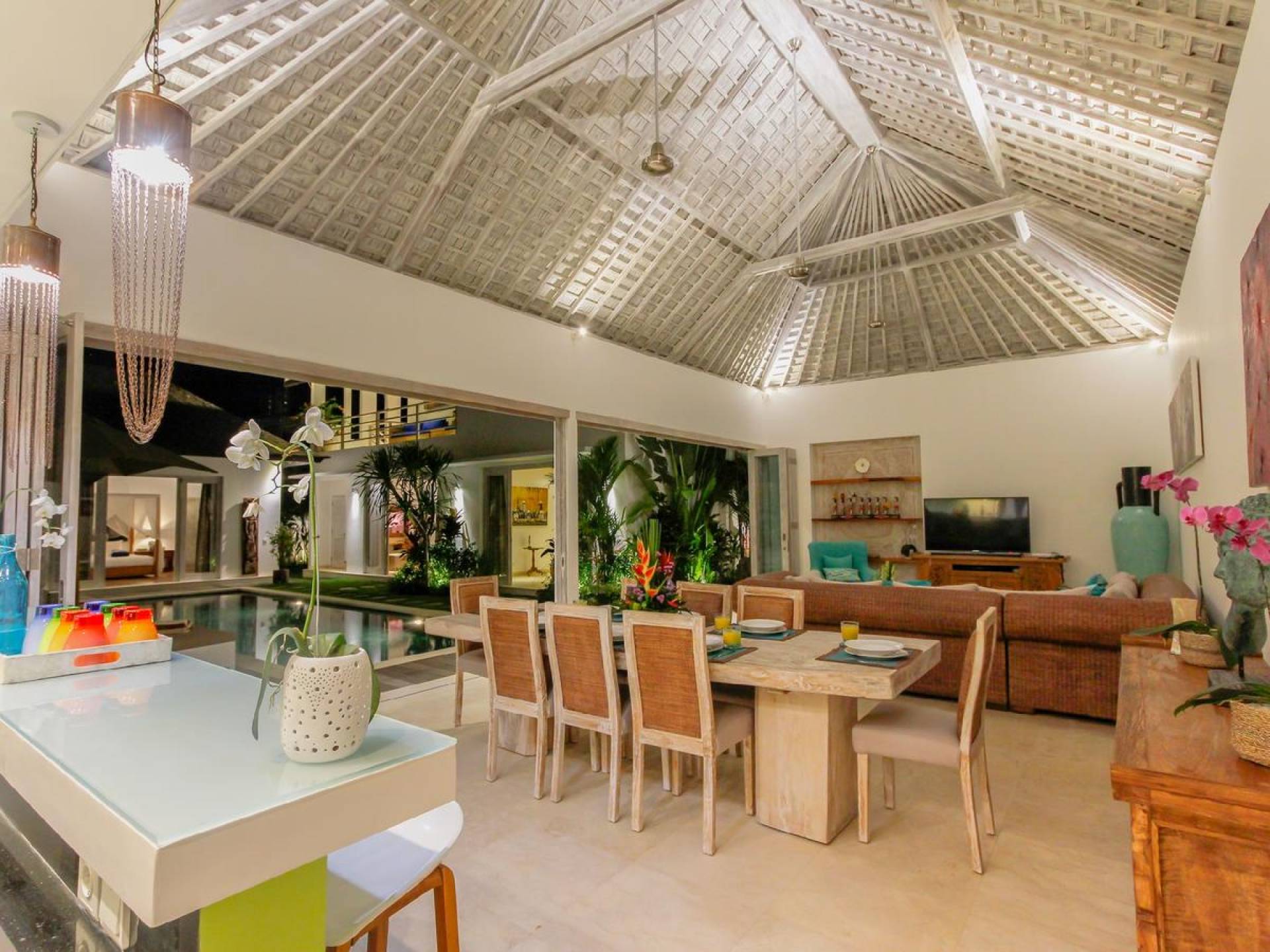There are super comfy double daybeds placed by the poolside and there is a large alang alang-roofed gazebo for those seeking shade. The living pavilion features floor-to-ceiling glass sliding doors that open up to the garden. Guests can experience the tropical open-plan living in the daytime, while in the evening, the doors and curtains can be closed to make it nice and cozy for an in-villa movie evening. The living room features a traditional Balinese high soaring timber rooftop and it is decorated with colorful artifacts.