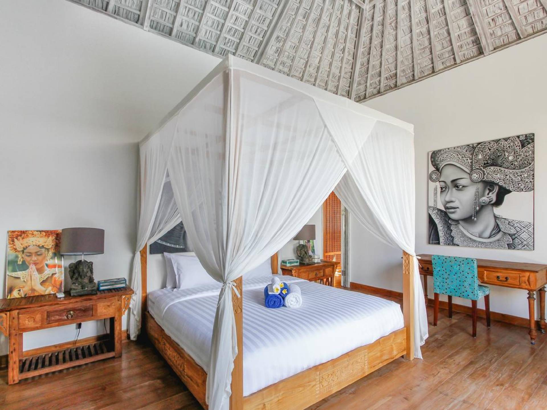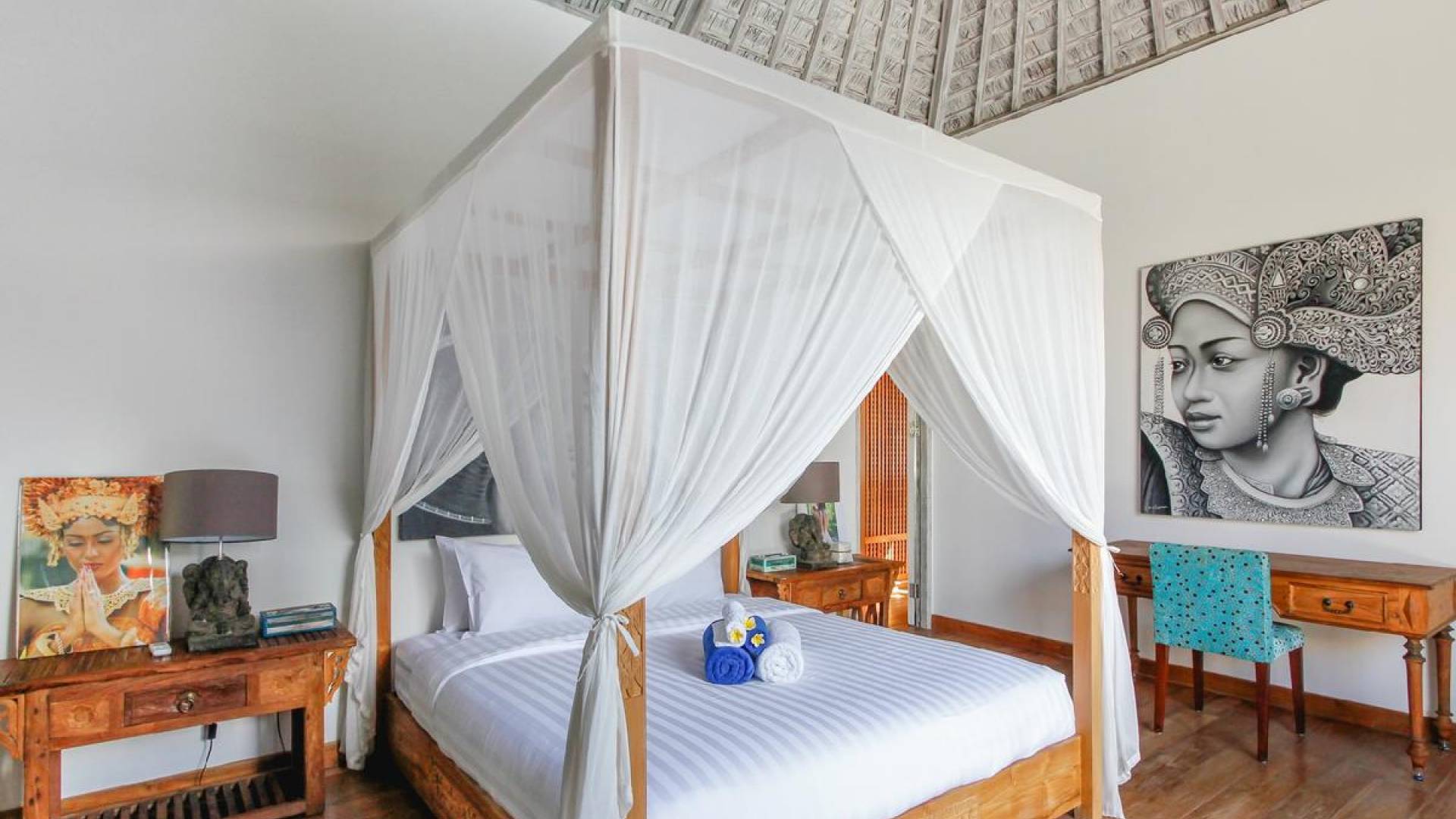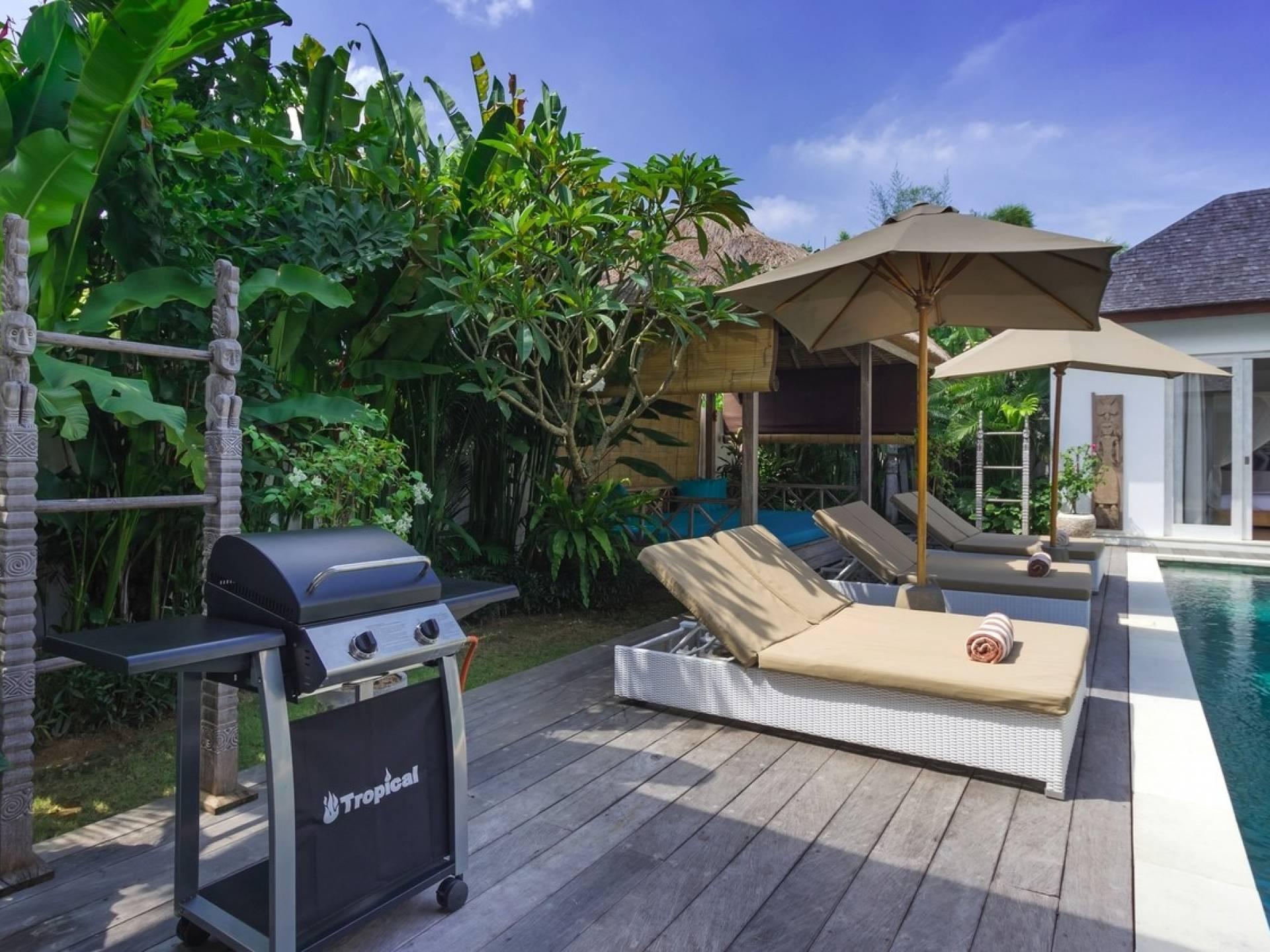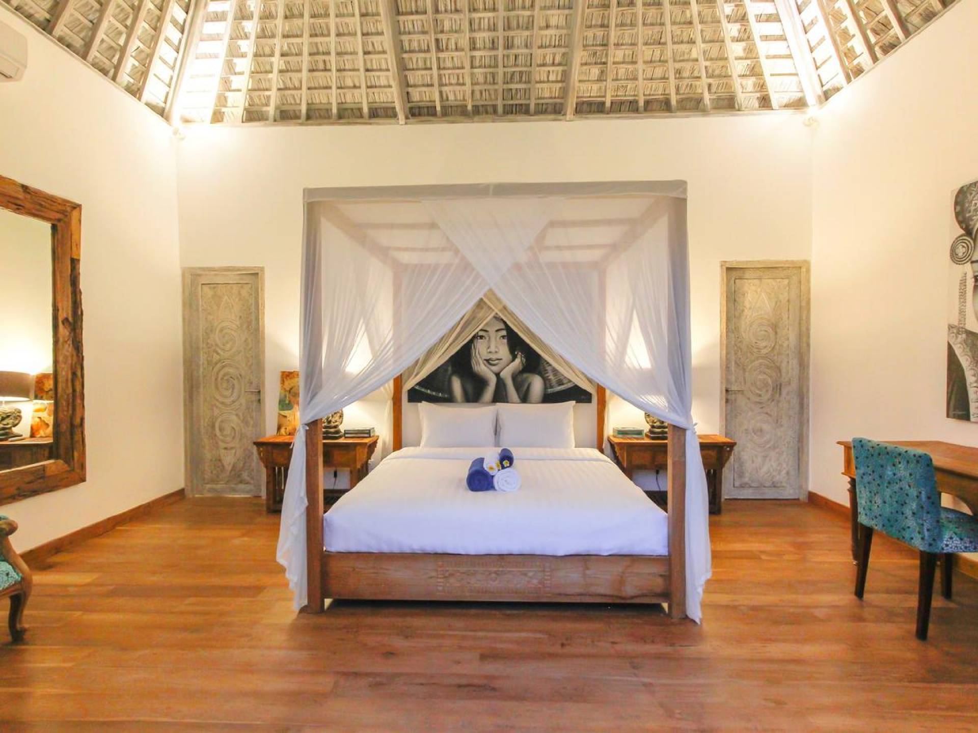 There are super comfy double daybeds placed by the poolside and there is a large alang alang-roofed gazebo for those seeking shade. The living pavilion features floor-to-ceiling glass sliding doors that open up to the garden. Guests can experience the tropical open-plan living in the daytime, while in the evening, the doors and curtains can be closed to make it nice and cozy for an in-villa movie evening. The living room features a traditional Balinese high soaring timber rooftop and it is decorated with colorful artifacts.