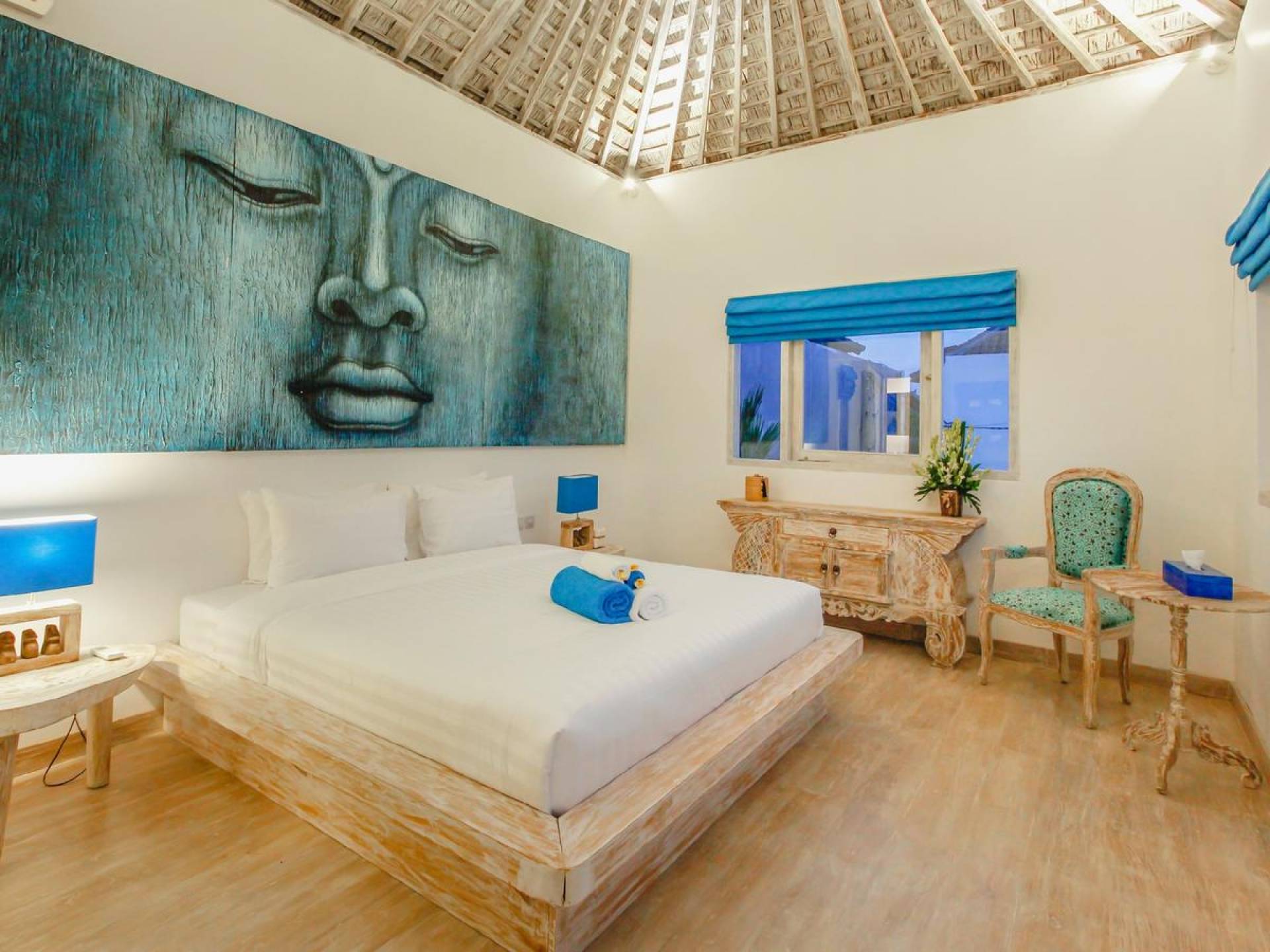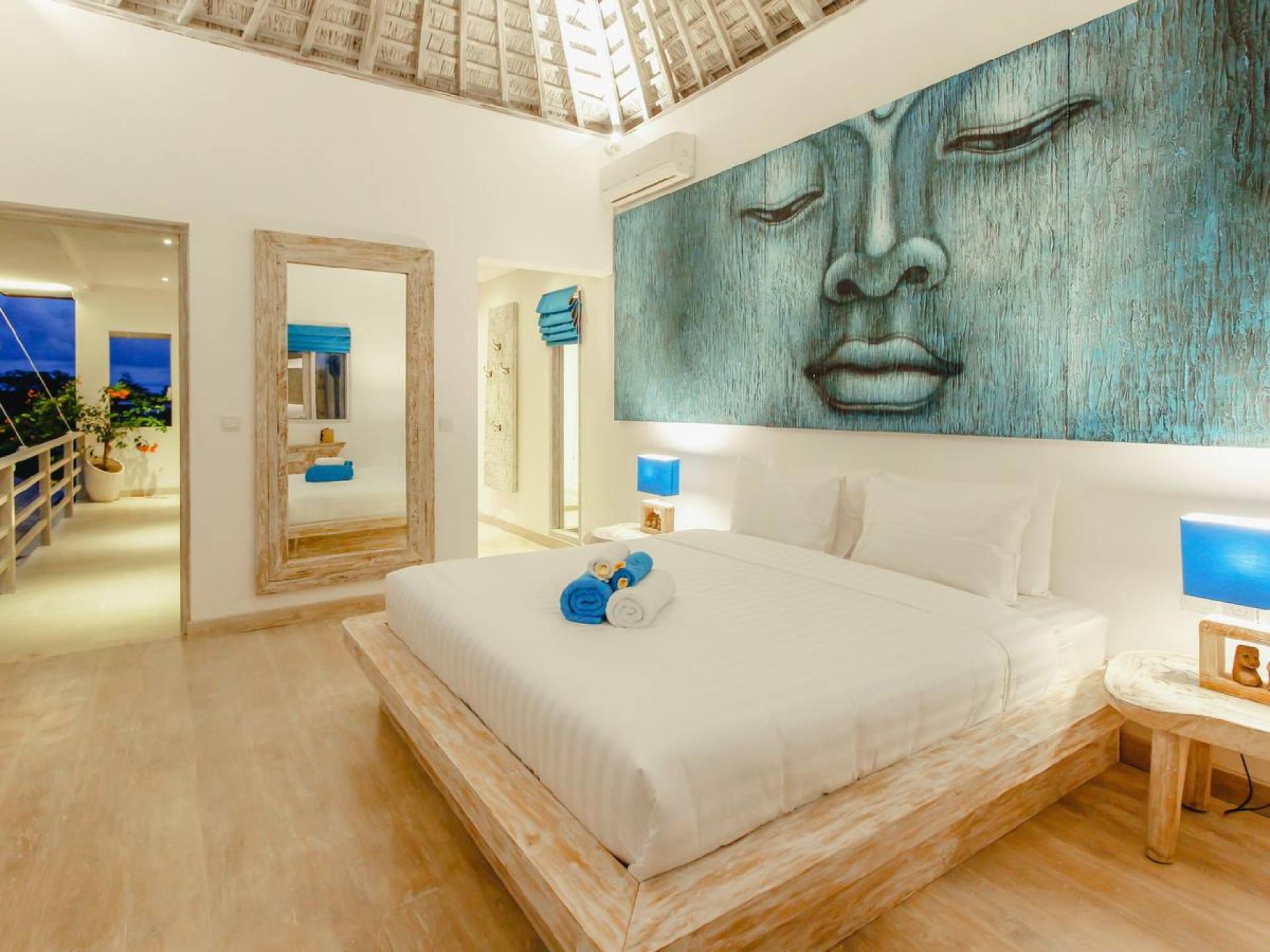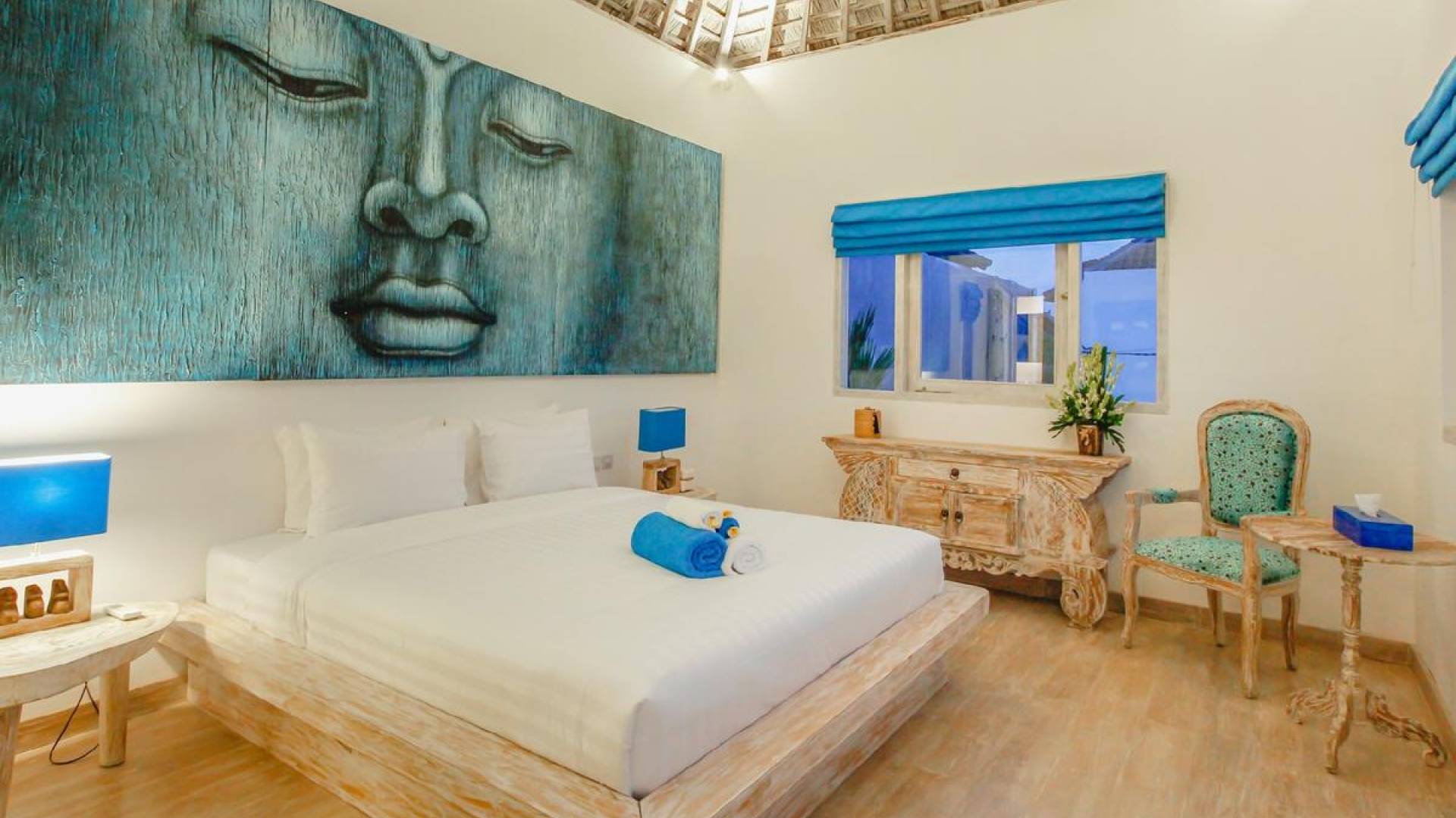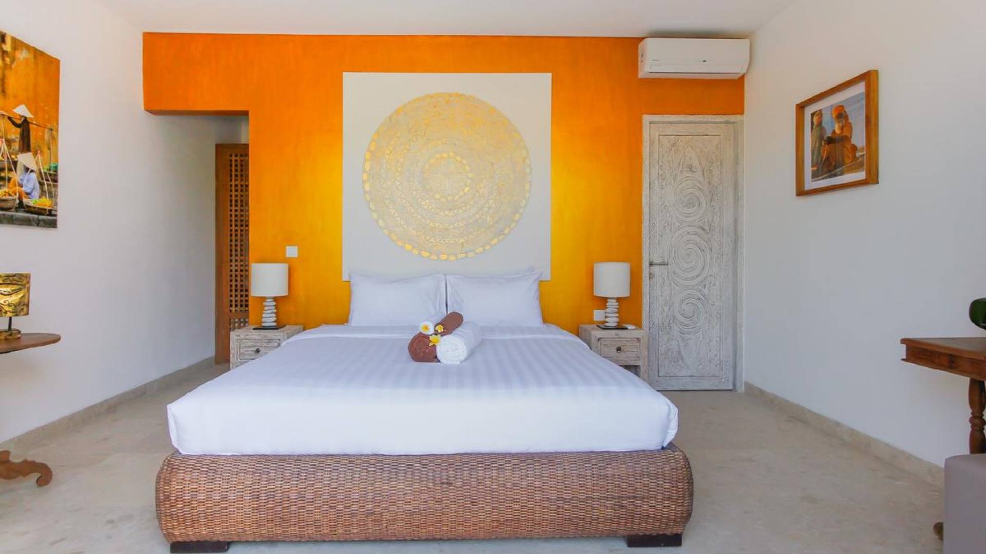 There are super comfy double daybeds placed by the poolside and there is a large alang alang-roofed gazebo for those seeking shade. The living pavilion features floor-to-ceiling glass sliding doors that open up to the garden. Guests can experience the tropical open-plan living in the daytime, while in the evening, the doors and curtains can be closed to make it nice and cozy for an in-villa movie evening. The living room features a traditional Balinese high soaring timber rooftop and it is decorated with colorful artifacts.