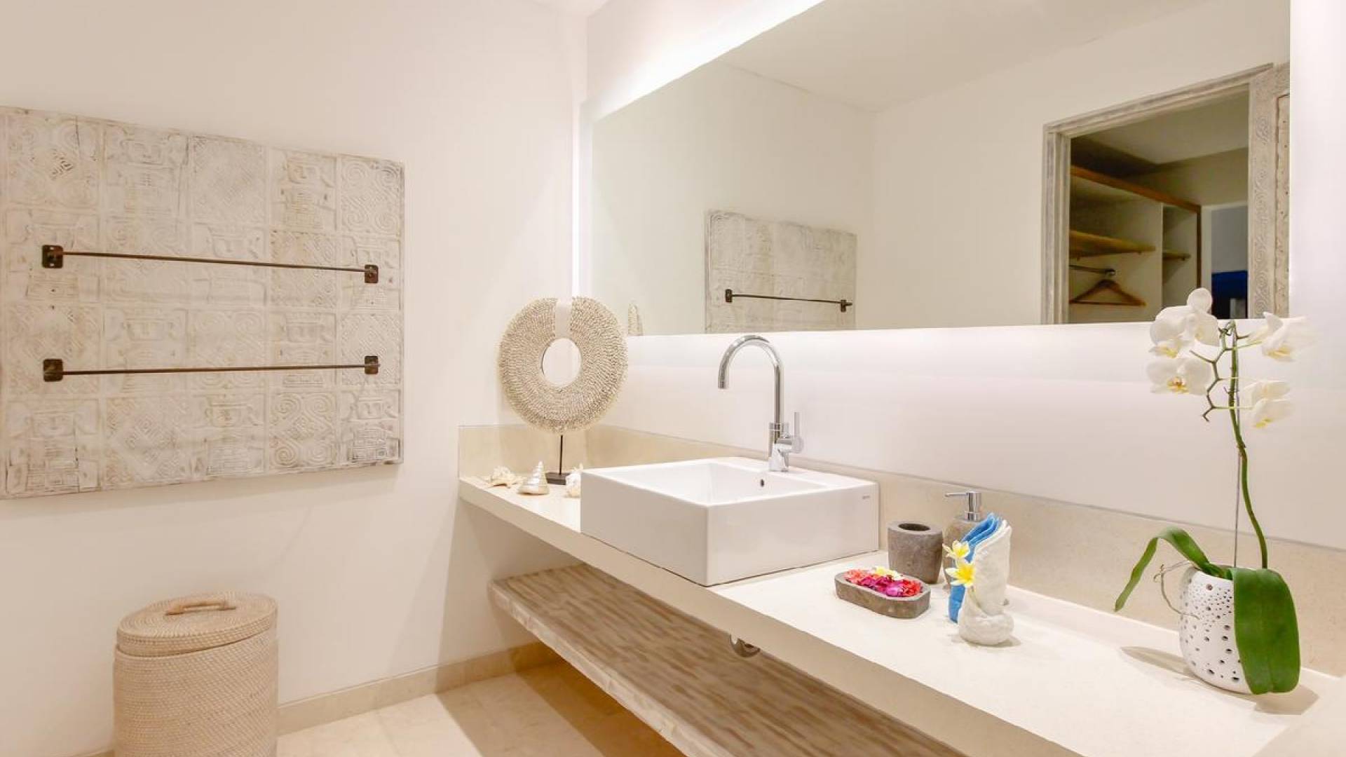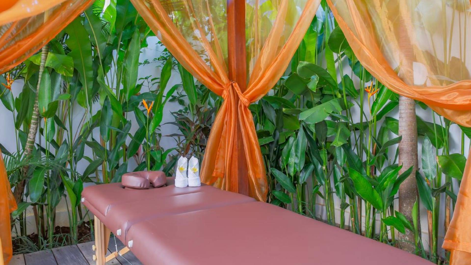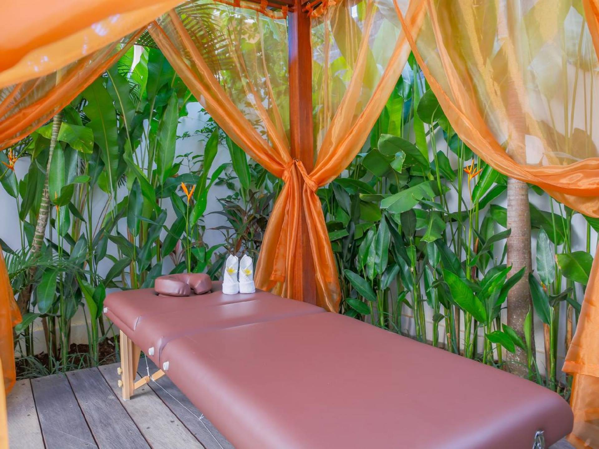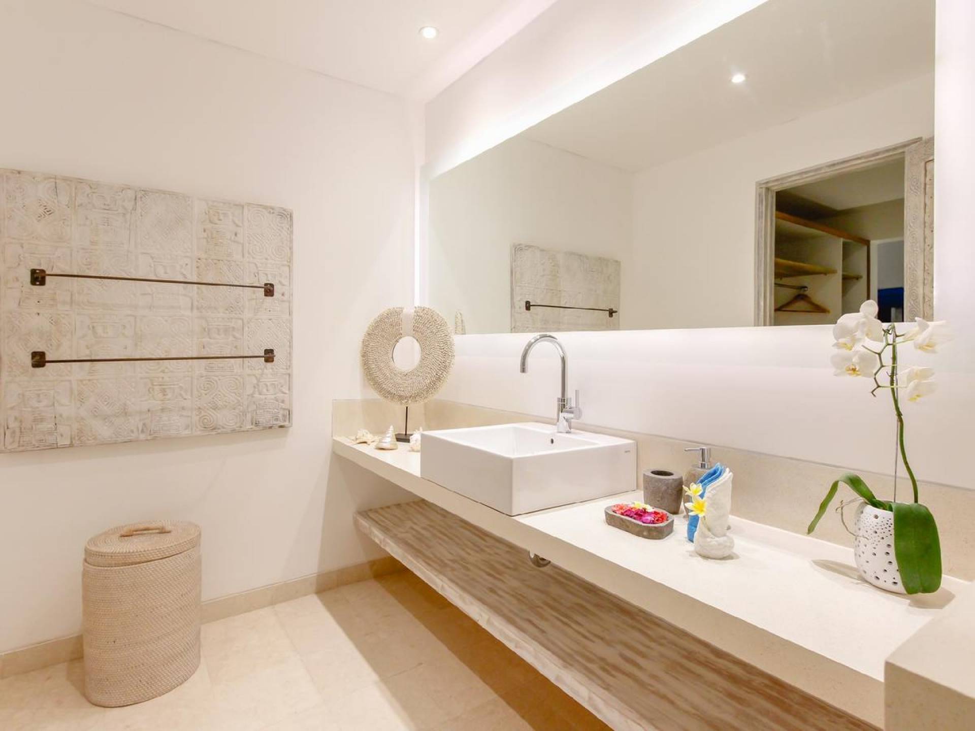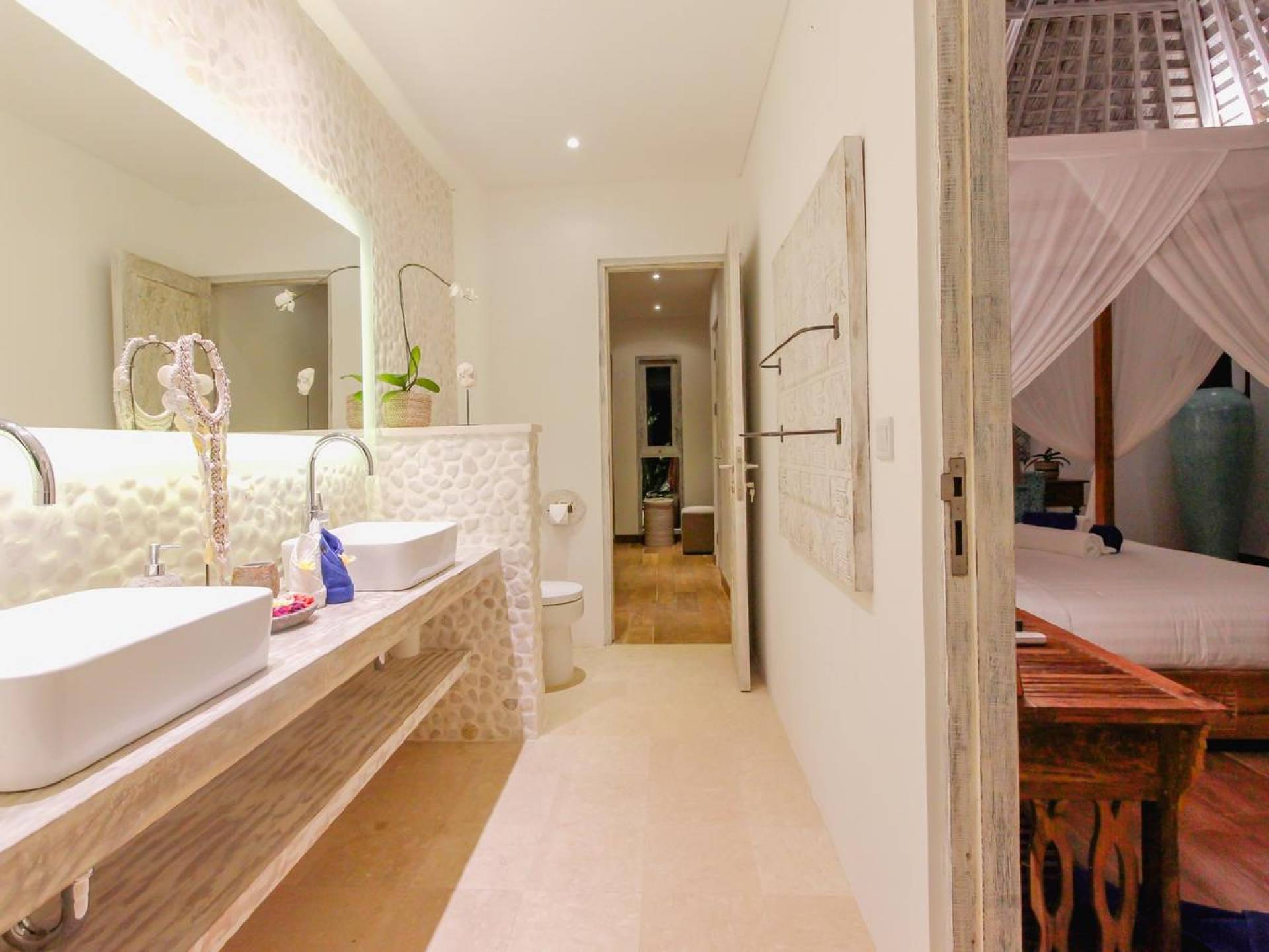 There is a fully equipped kitchen with a bar and stools, great for sipping cocktails in the day and evening while in the morning, the bar makes a nice place to sit and slowly wake up with a cup of Nespresso coffee. In the middle of the living room stands a whitewashed timber dining table for 8 and on the other side, you can lounge on the L-shaped rattan sofa, facing a large flat-screen satellite-TV on a wooden-carved cabinet. The perfect spot to relax in between the pillows, reading a book, or watching movies after sunset. Villa Paraiba Seminyak also features a private massage area with a professional massage bed for some wonderful in-villa pampering.