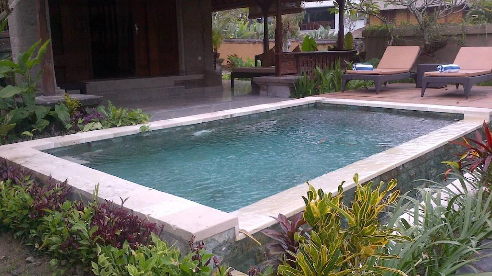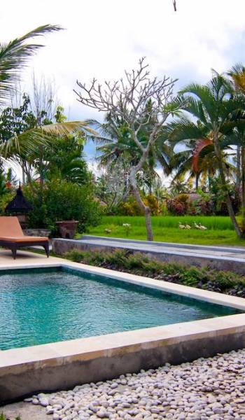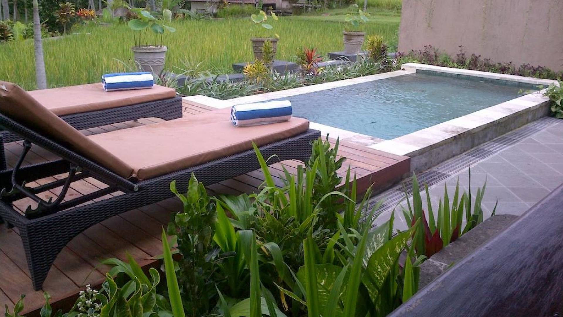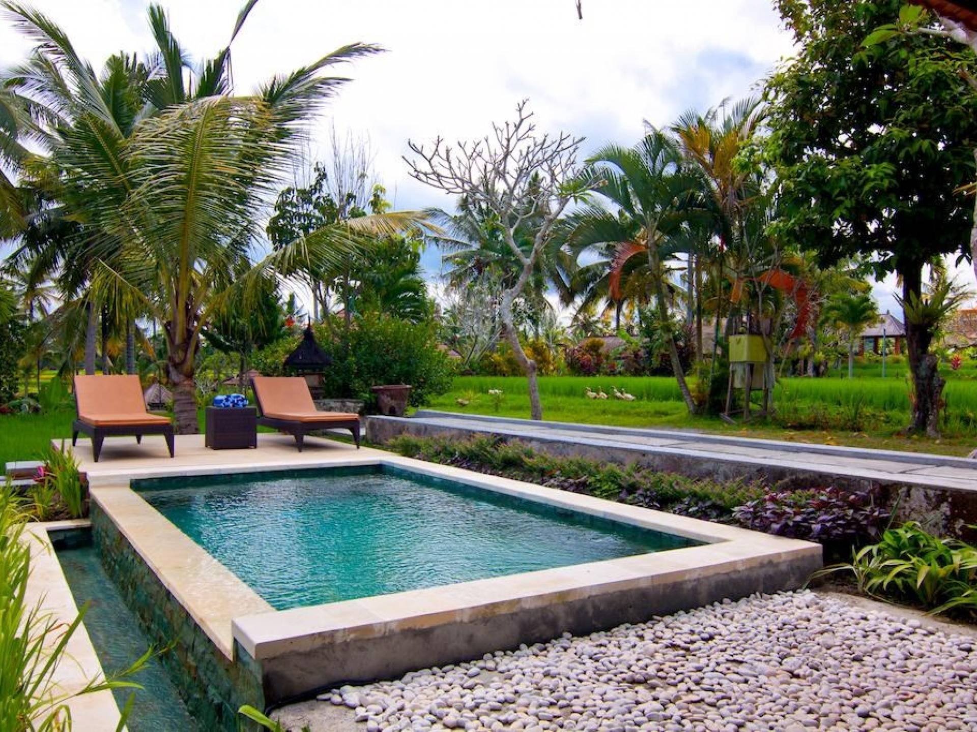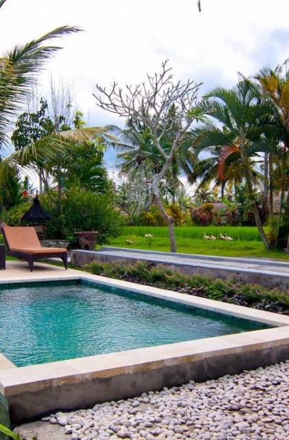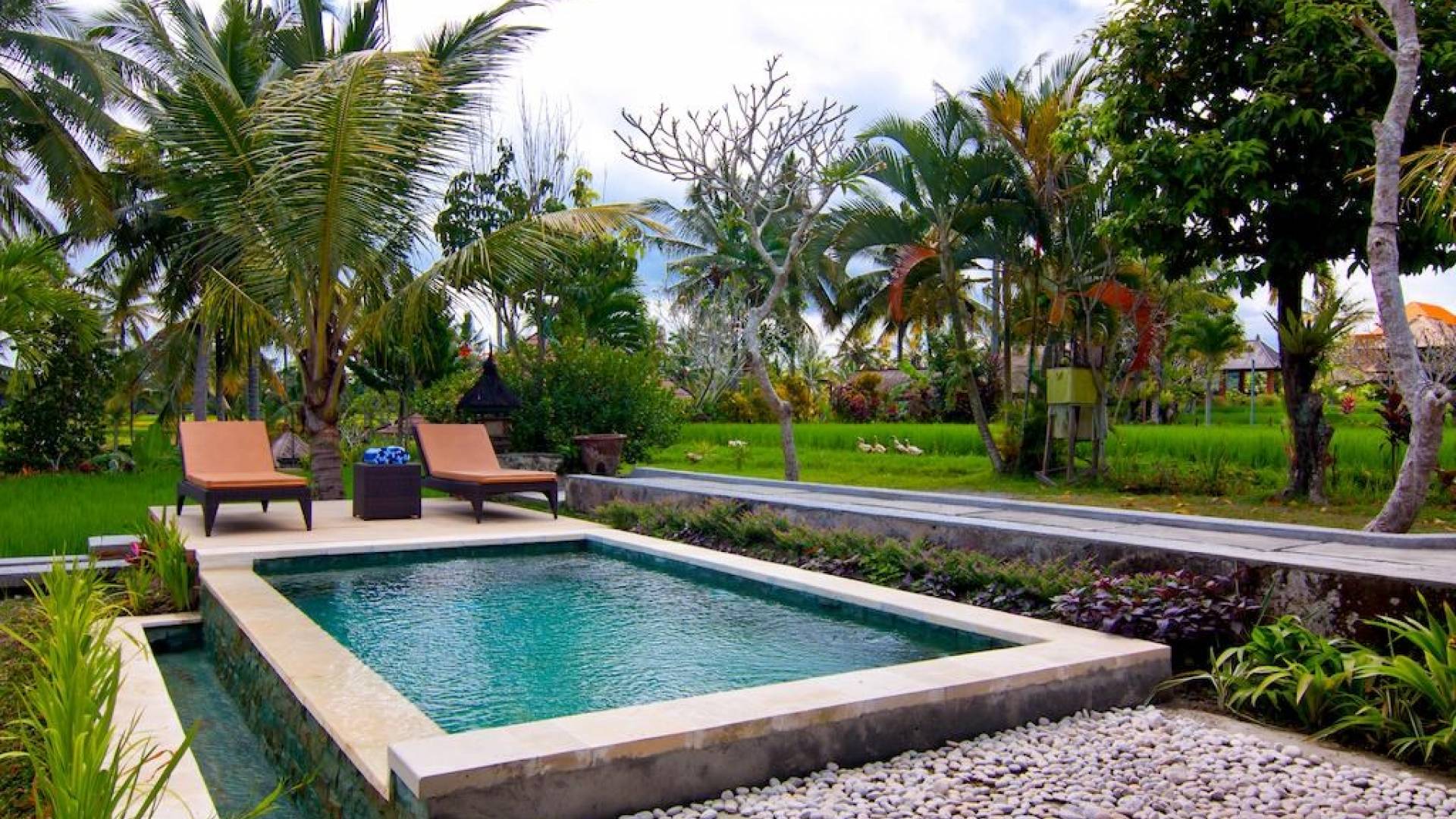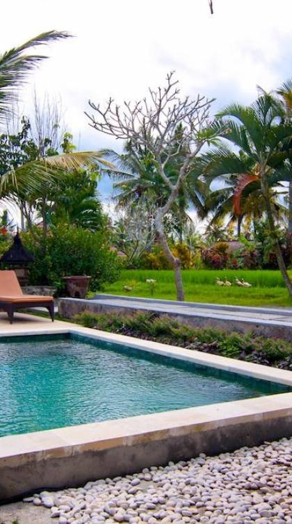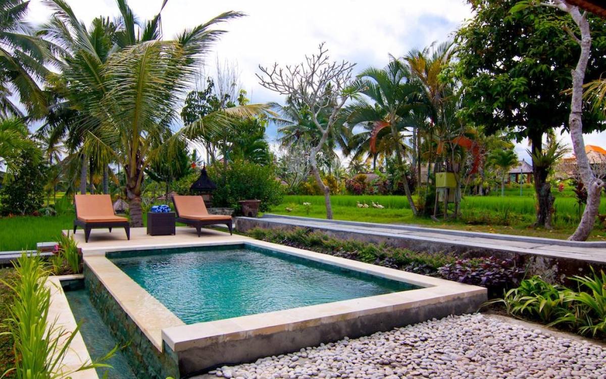 This pool villa has a private swimming pool, 2 bedrooms, 2 double beds, 1 shower with bathtub, balcony, terrace, and kitchen. The villa is surrounded by vibrant tropical gardens, flowering trees, and some of them are surrounded by a nice rice field.