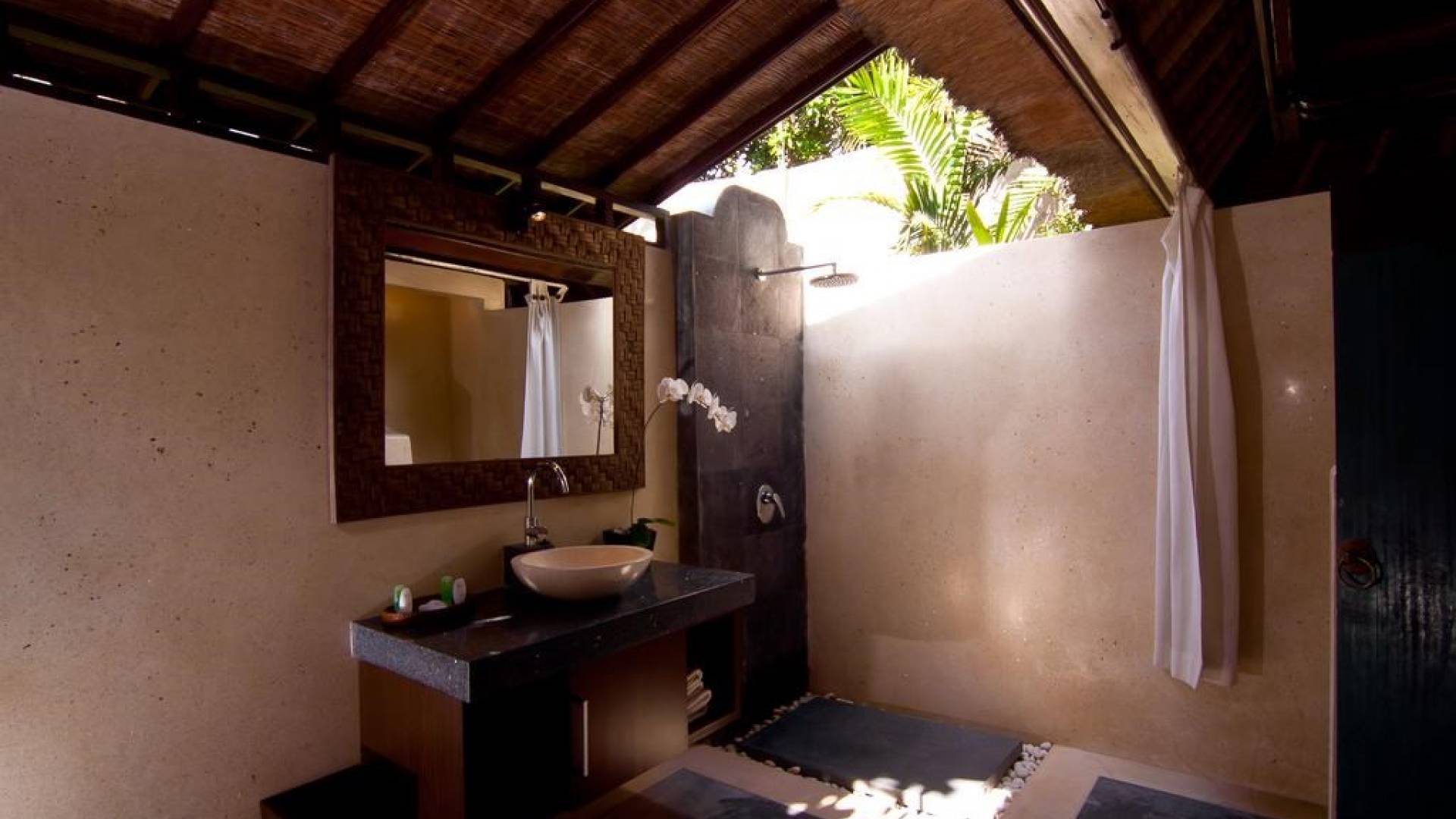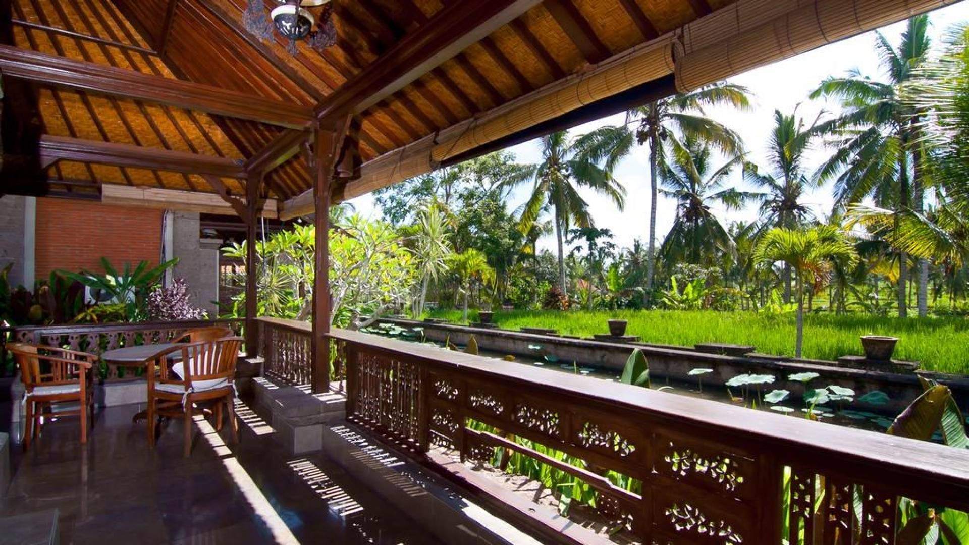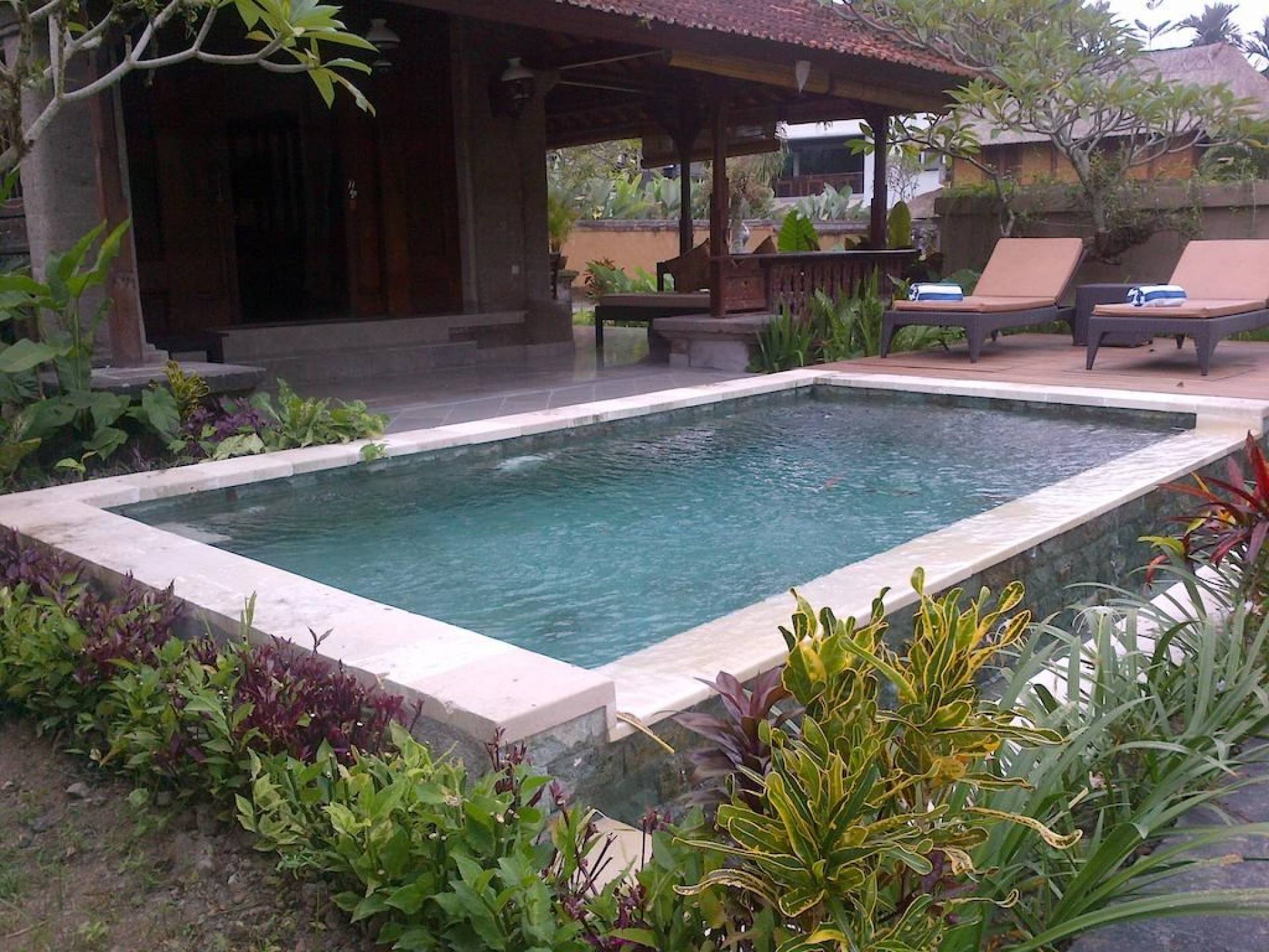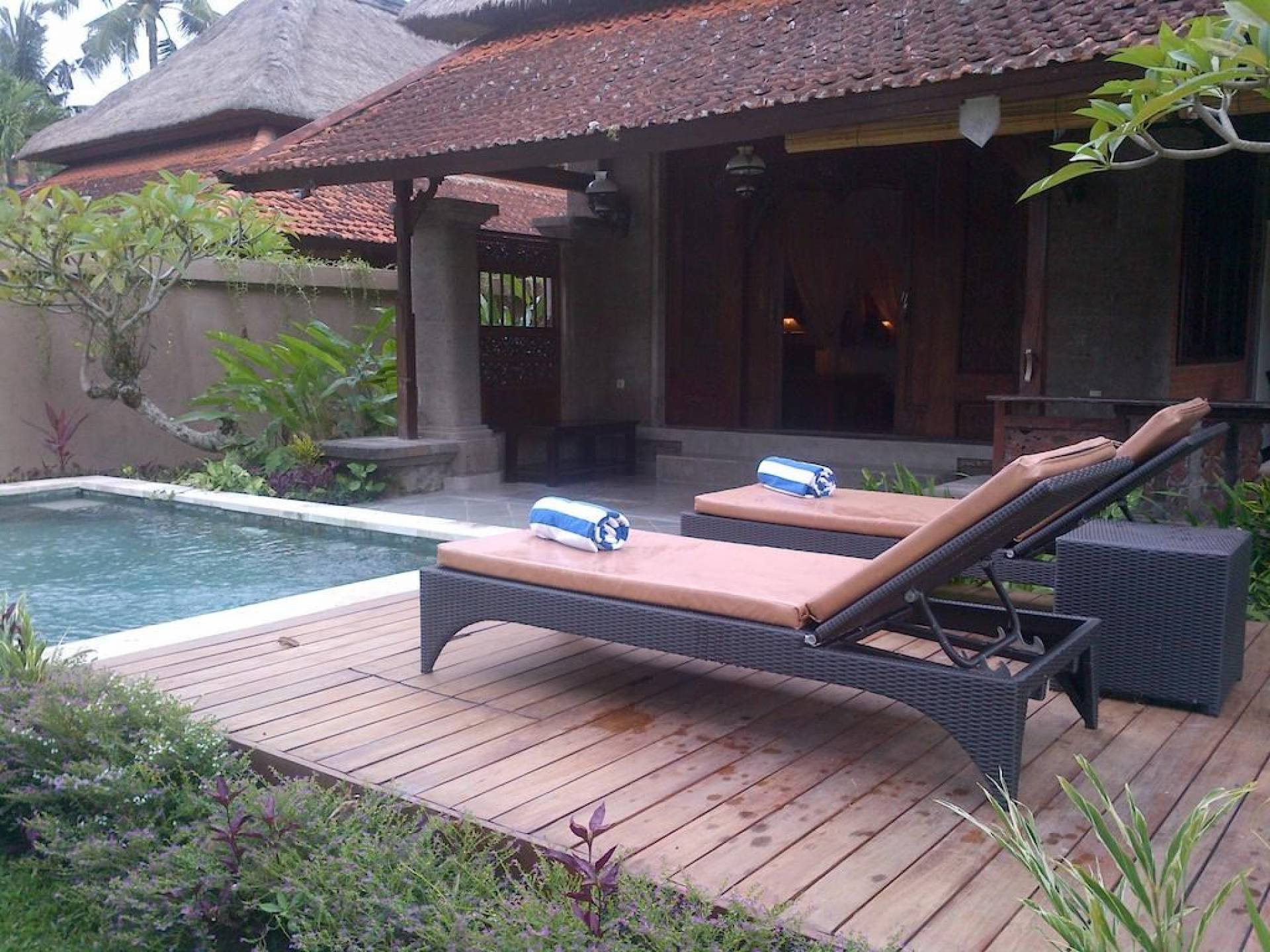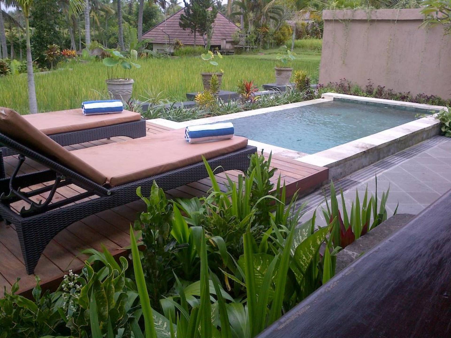 This pool villa has a private swimming pool, 2 bedrooms, 2 double beds, 1 shower with bathtub, balcony, terrace, and kitchen. The villa is surrounded by vibrant tropical gardens, flowering trees, and some of them are surrounded by a nice rice field.