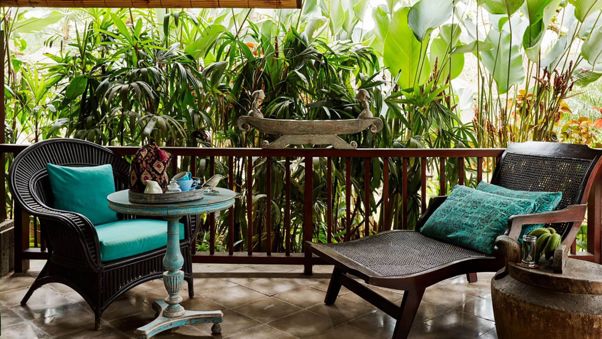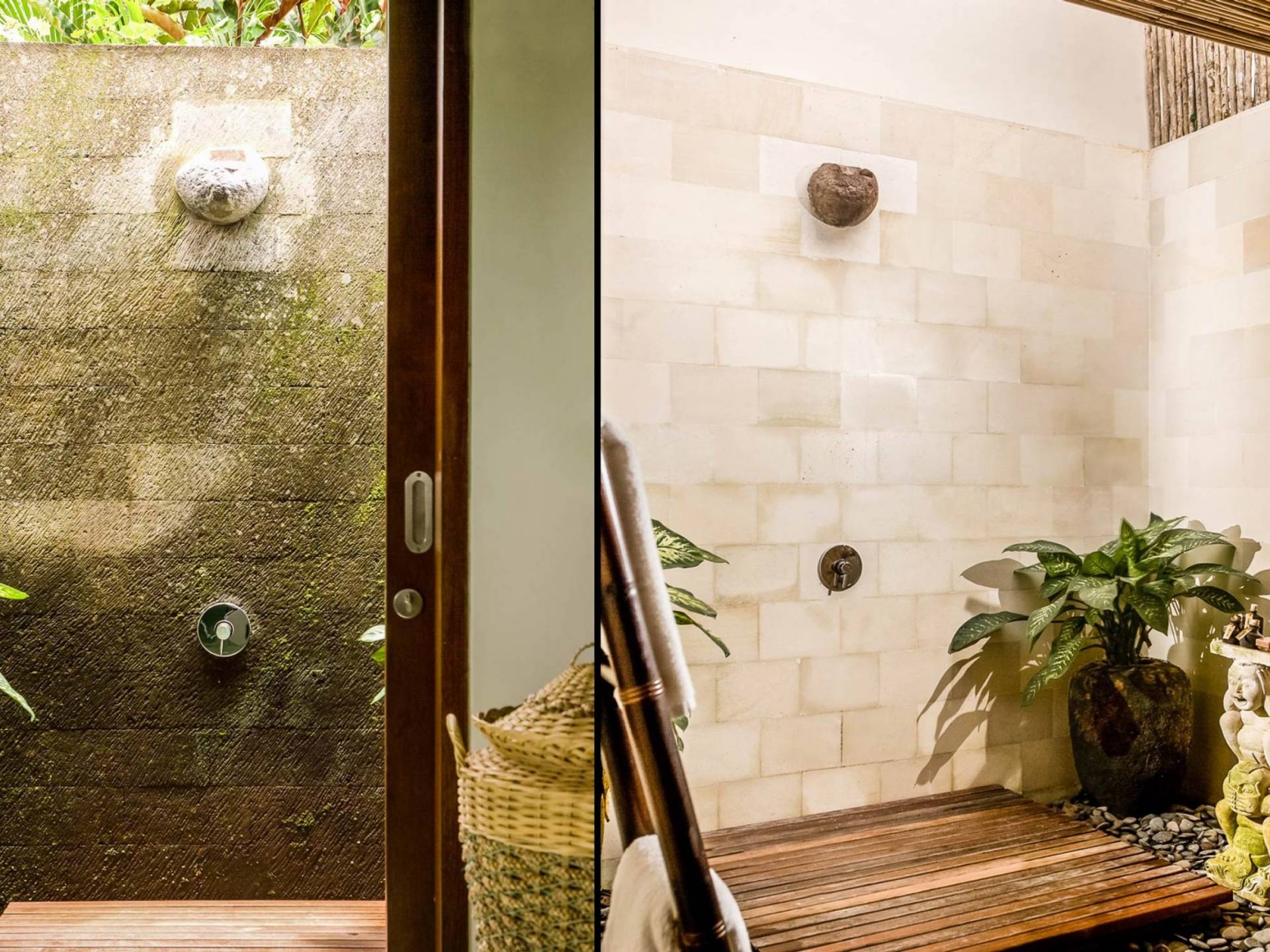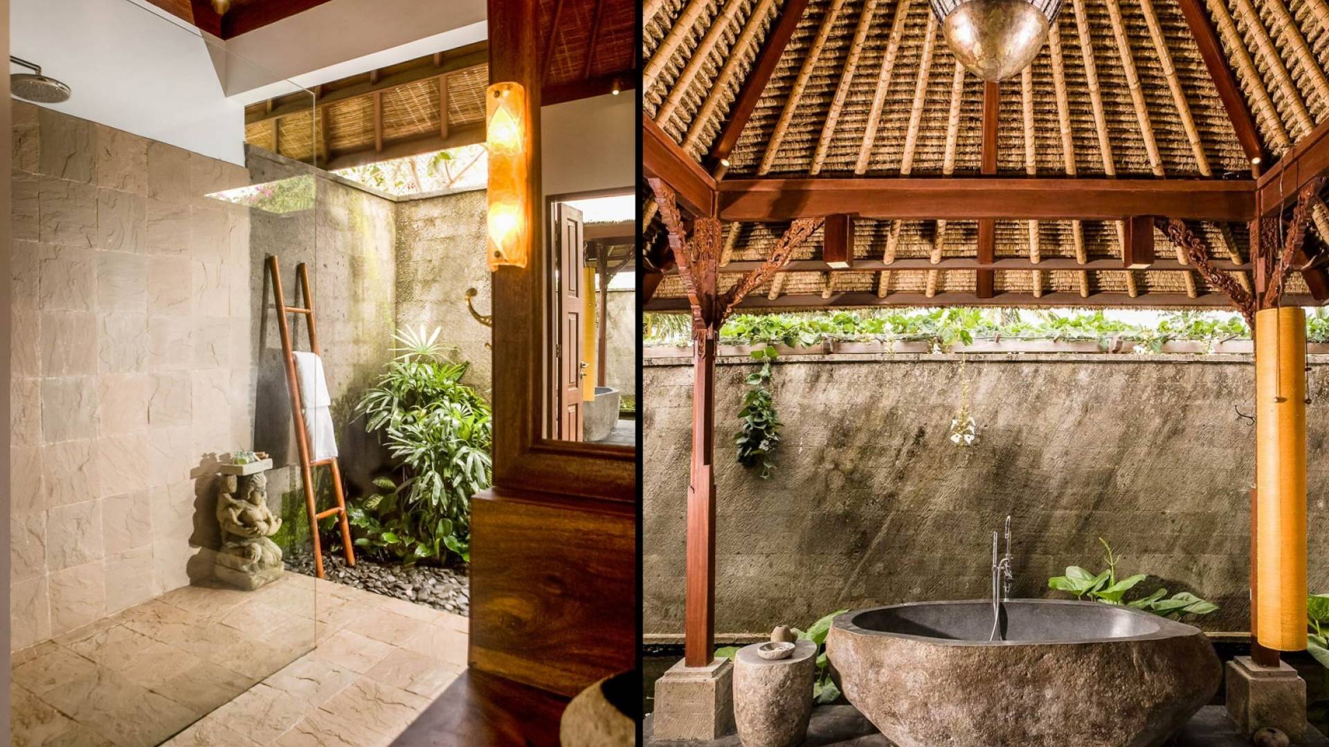 The 4 spacious air-conditioned bedrooms are all separate houses, two of which are sharing a private open kitchen- and dining-bale as well as a private spring water-fed plunge-pool and a pool deck. More, each house offers a furnished veranda and bathroom with complete sanitary, shower-cabin, and a small walled garden with an outdoor shower.
