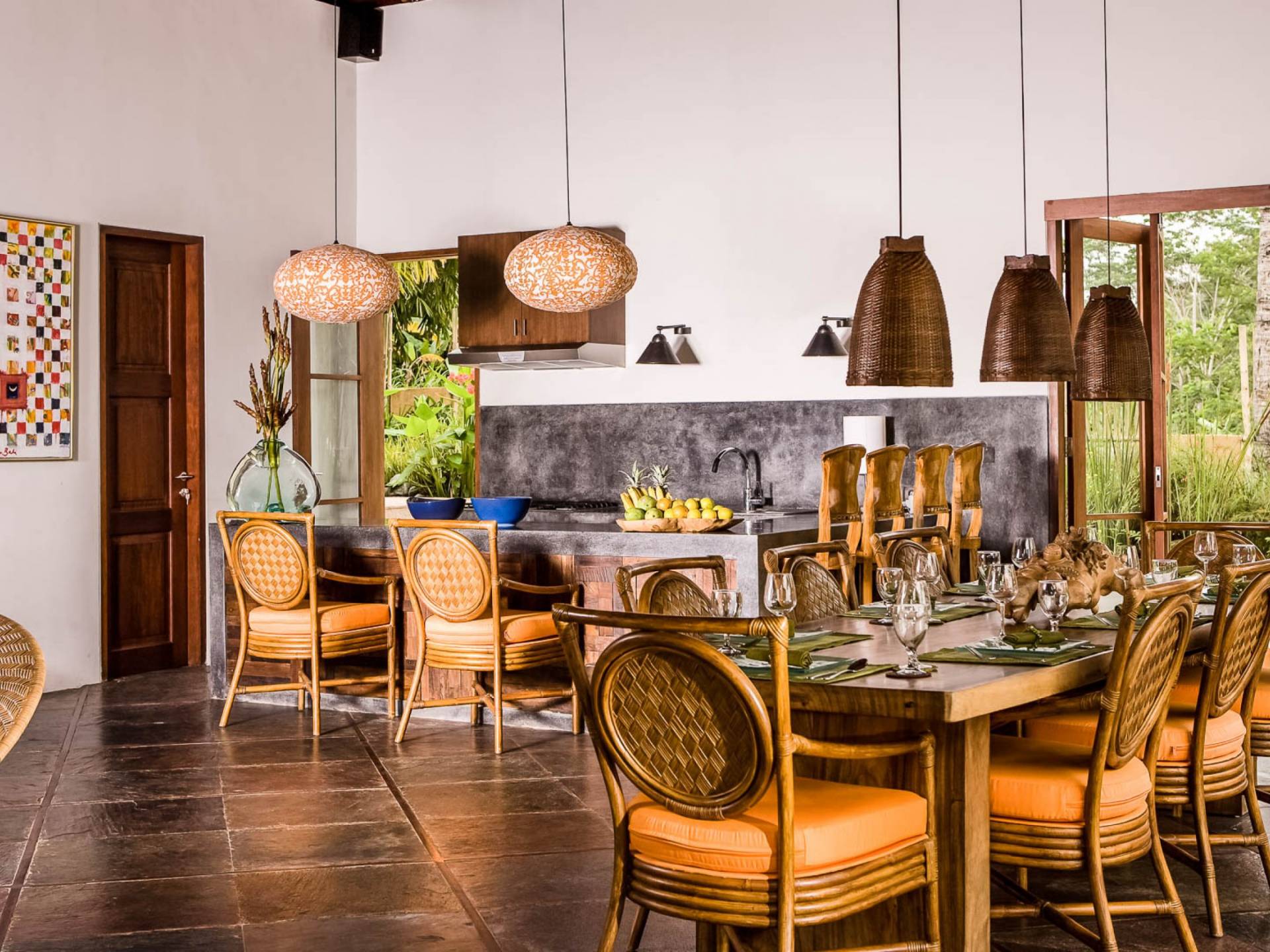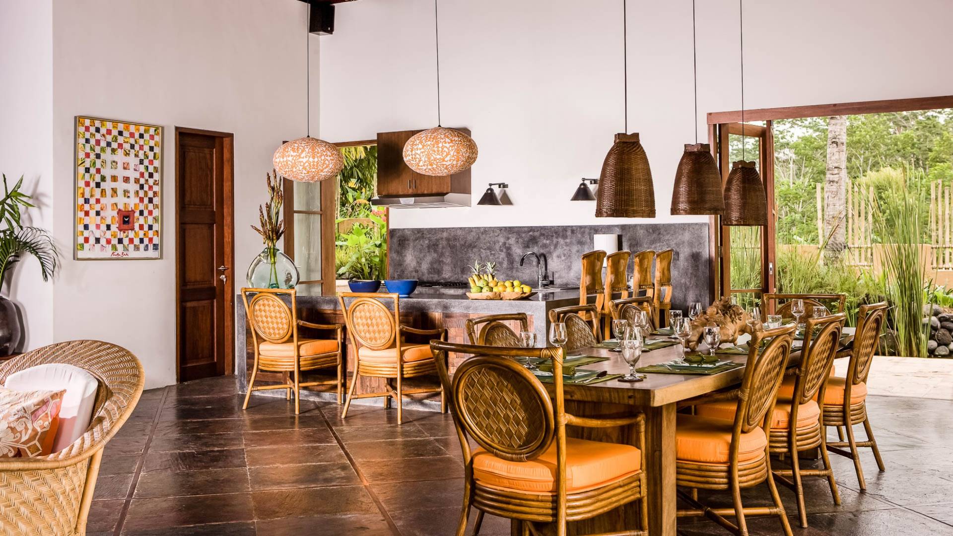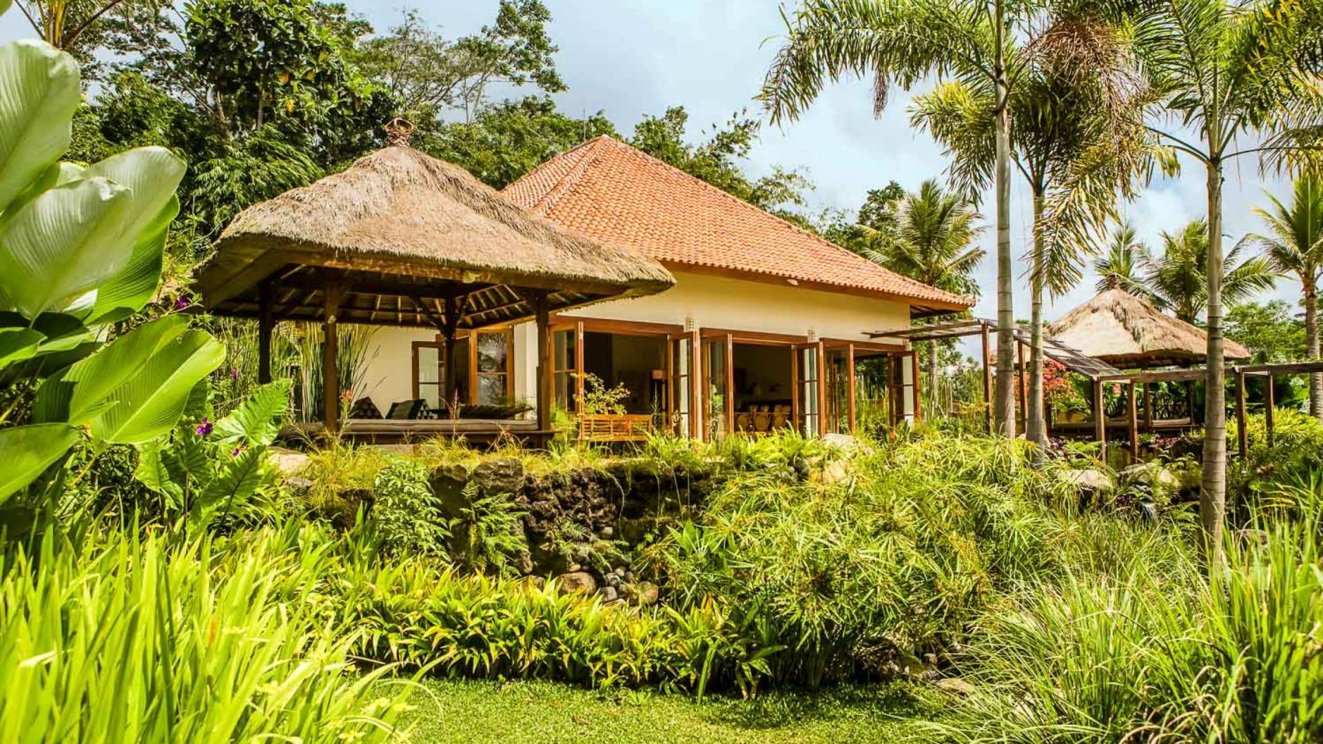 The spacious living and dining area opens to a large veranda, surrounded by flower-covered, multi-level fishponds and flanked by two comfortable bales, where you can relax, listening to the sprinkling water, and enjoying the beautiful view. An open, fully equipped kitchen is ready for the staff to prepare your meals on your request – or feel free to use the kitchen by yourself if you prefer to cook your own meals. Just a couple steps upstairs in the main house you will find an air-conditioned media room with a mini library and hi-quality audio- and video experience