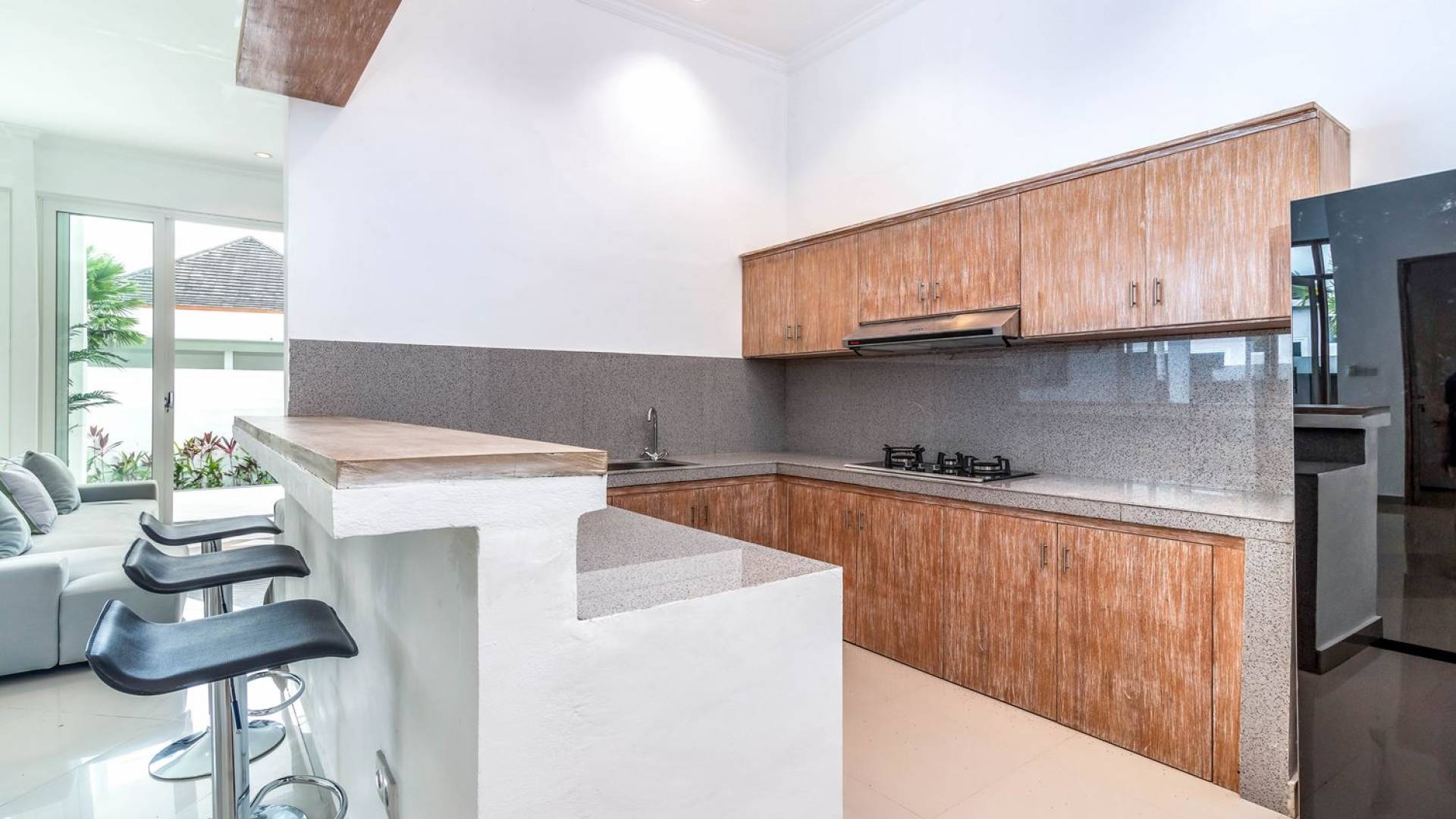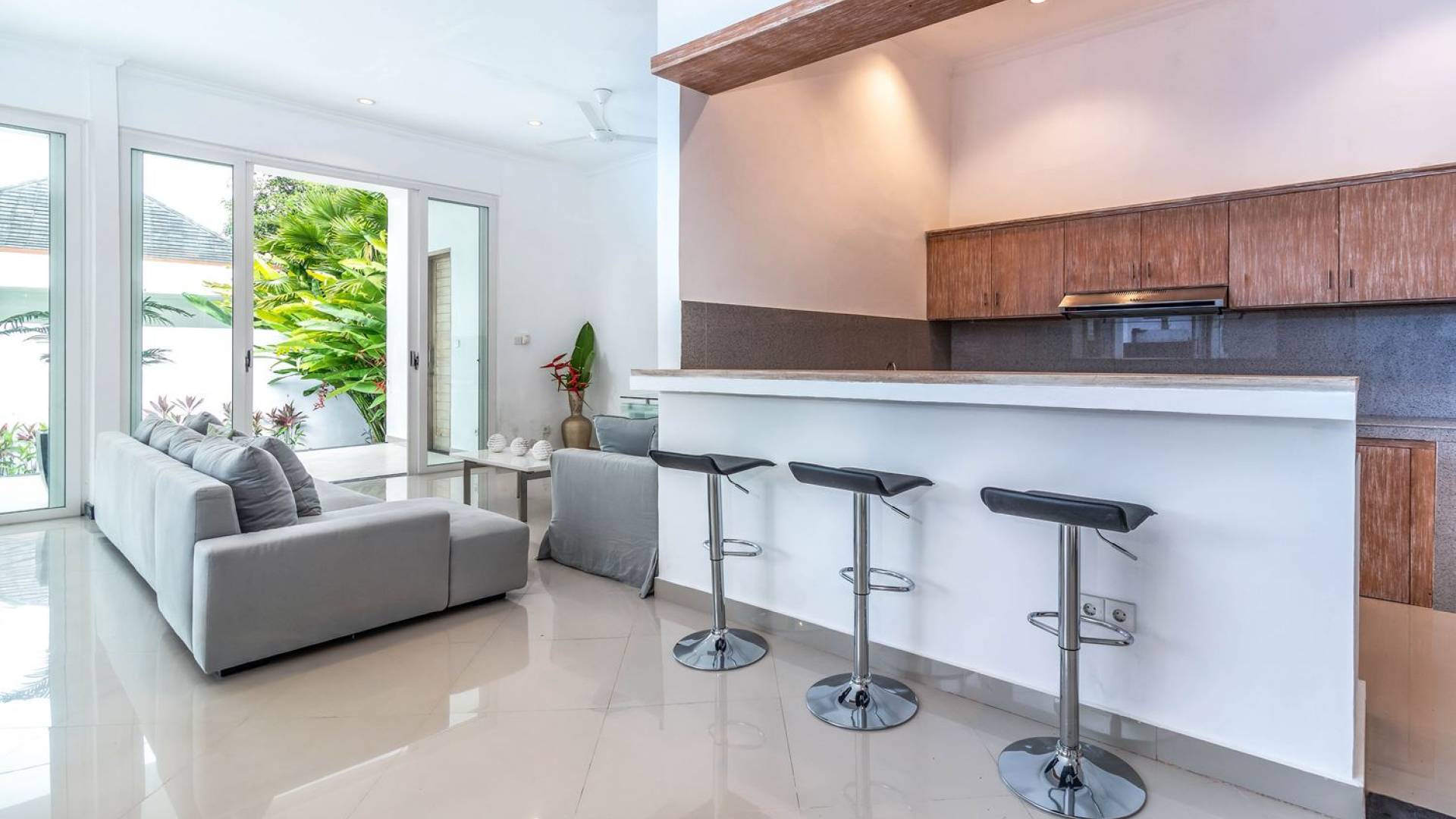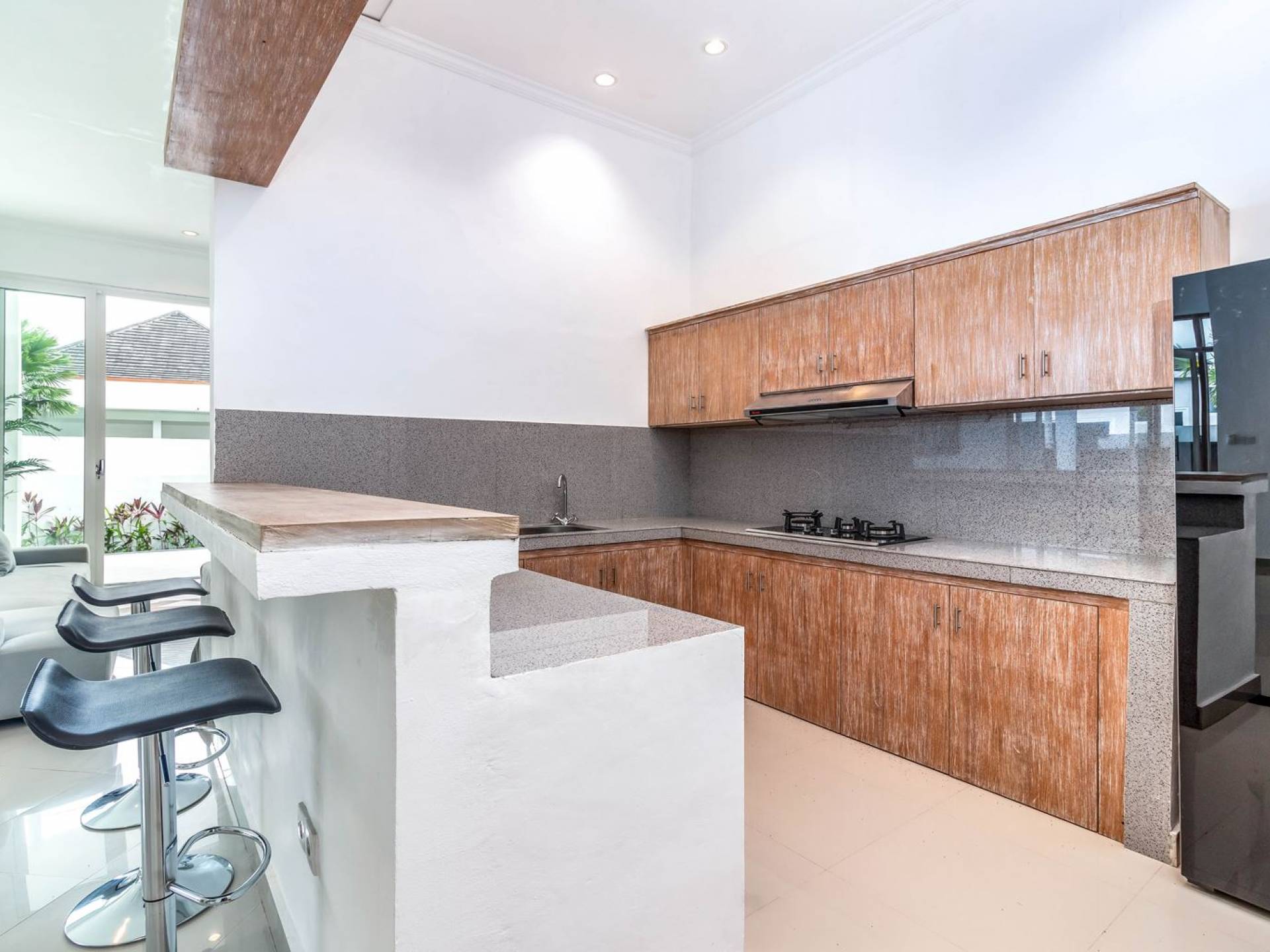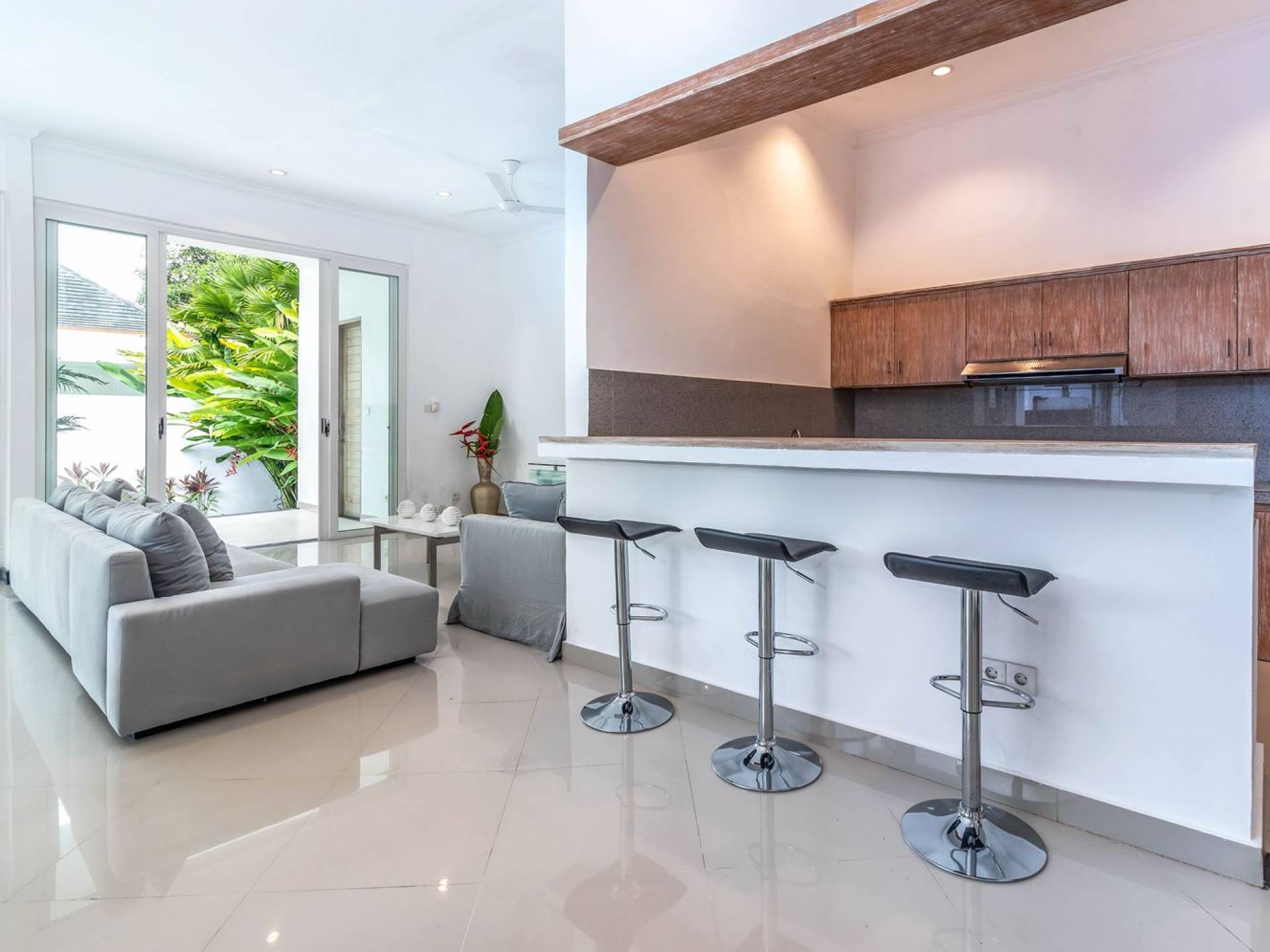 There is a large private parking space for a car and motorbike in the front and from there, you can enter the living room or hop down to the pool area for a quick swim and a sunbathing session. The living room is designed with glass doors that open up to the garden and pool area. This allows natural sunlight to shine in all day long and you never have to miss out on those garden views (plus you can keep an eye on the kids playing in the pool). At the same time, you get to enjoy air-conditioning, making it a great escape from the tropical heat outside. Go lounge at the sofa corner and watch movies, sit down for a family meal or hang out at the bar with some cold drinks and good music, you’ll be feeling right at home in no time.