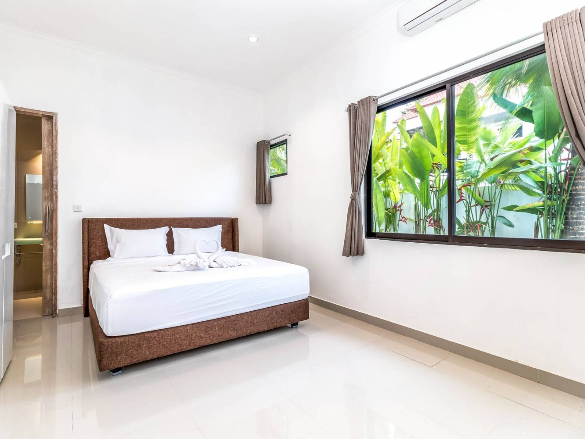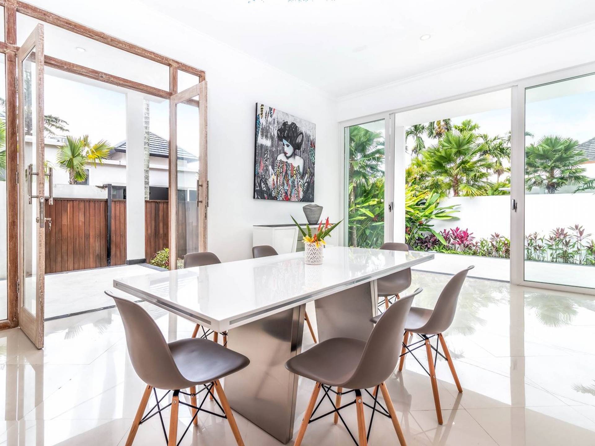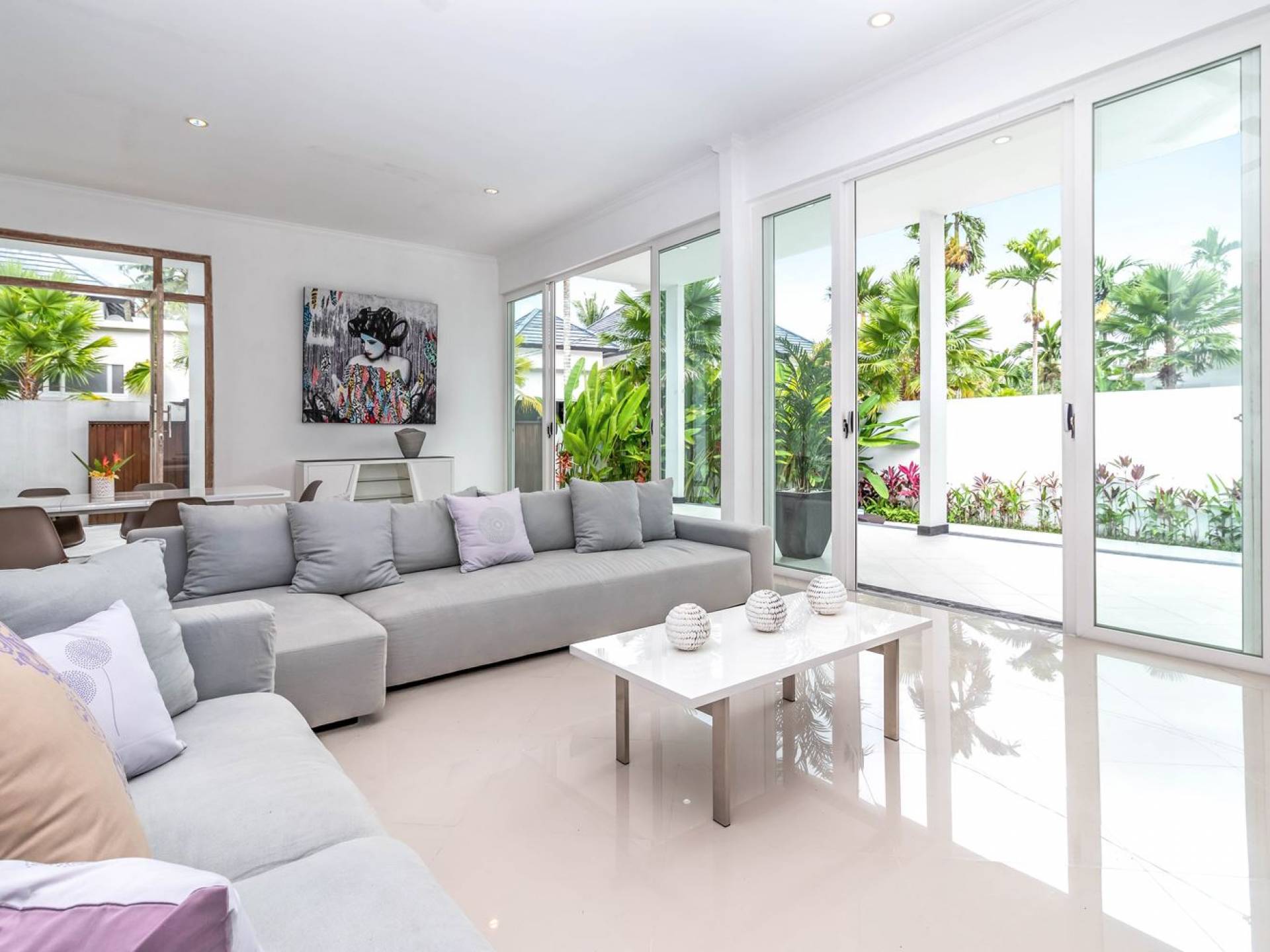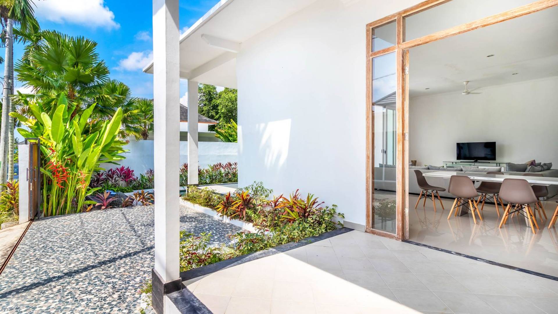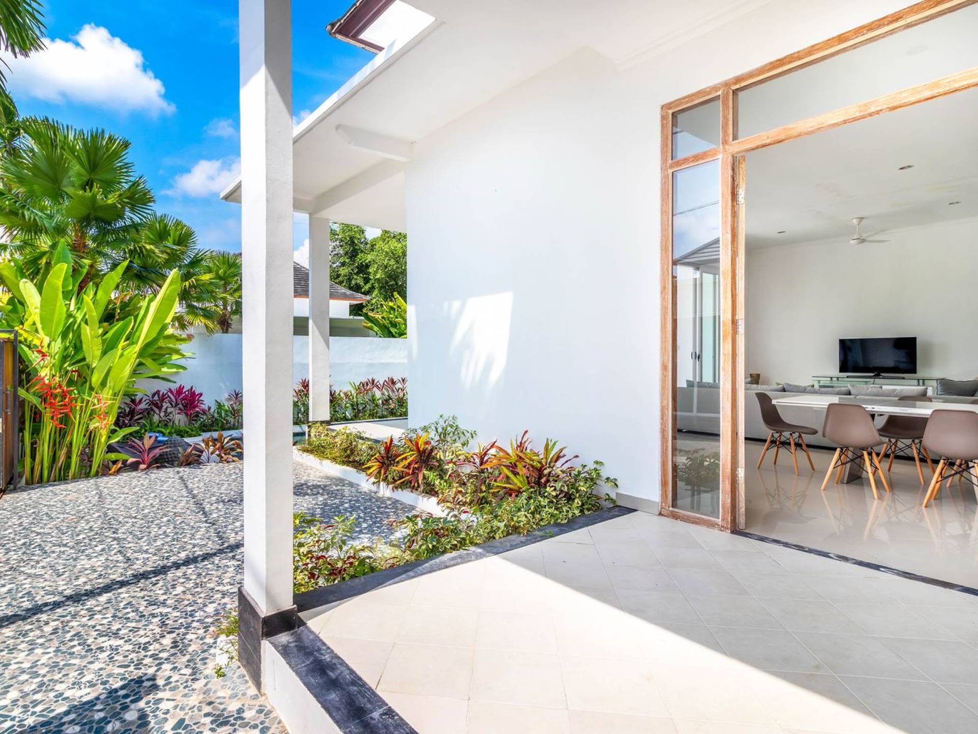 There is a large private parking space for a car and motorbike in the front and from there, you can enter the living room or hop down to the pool area for a quick swim and a sunbathing session. The living room is designed with glass doors that open up to the garden and pool area. This allows natural sunlight to shine in all day long and you never have to miss out on those garden views (plus you can keep an eye on the kids playing in the pool). At the same time, you get to enjoy air-conditioning, making it a great escape from the tropical heat outside. Go lounge at the sofa corner and watch movies, sit down for a family meal or hang out at the bar with some cold drinks and good music, you’ll be feeling right at home in no time.