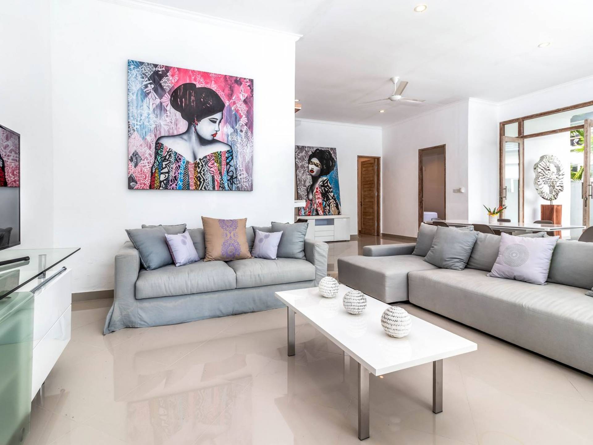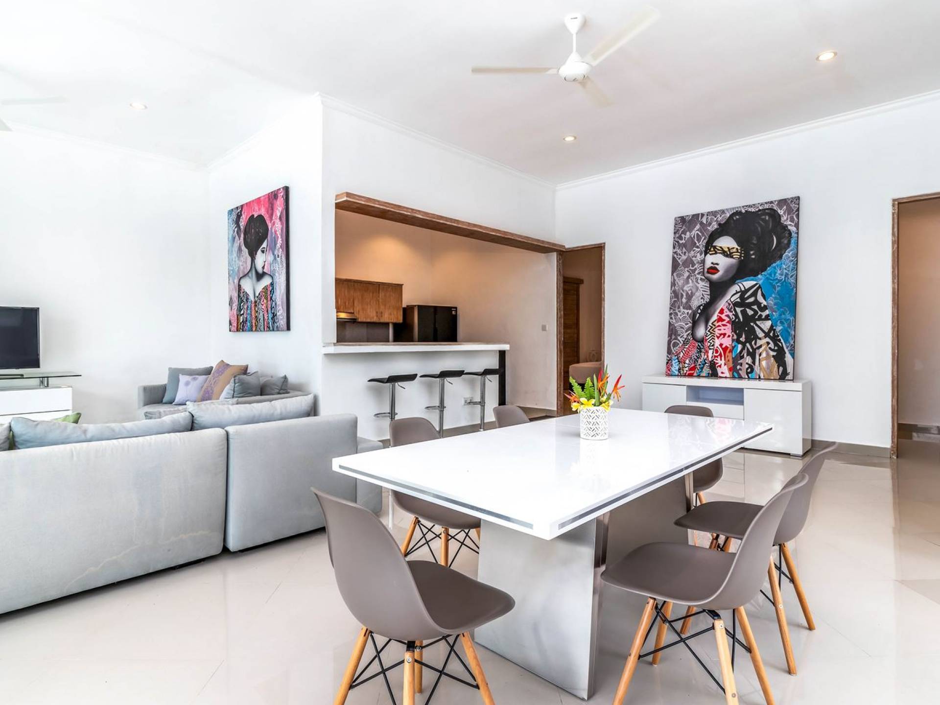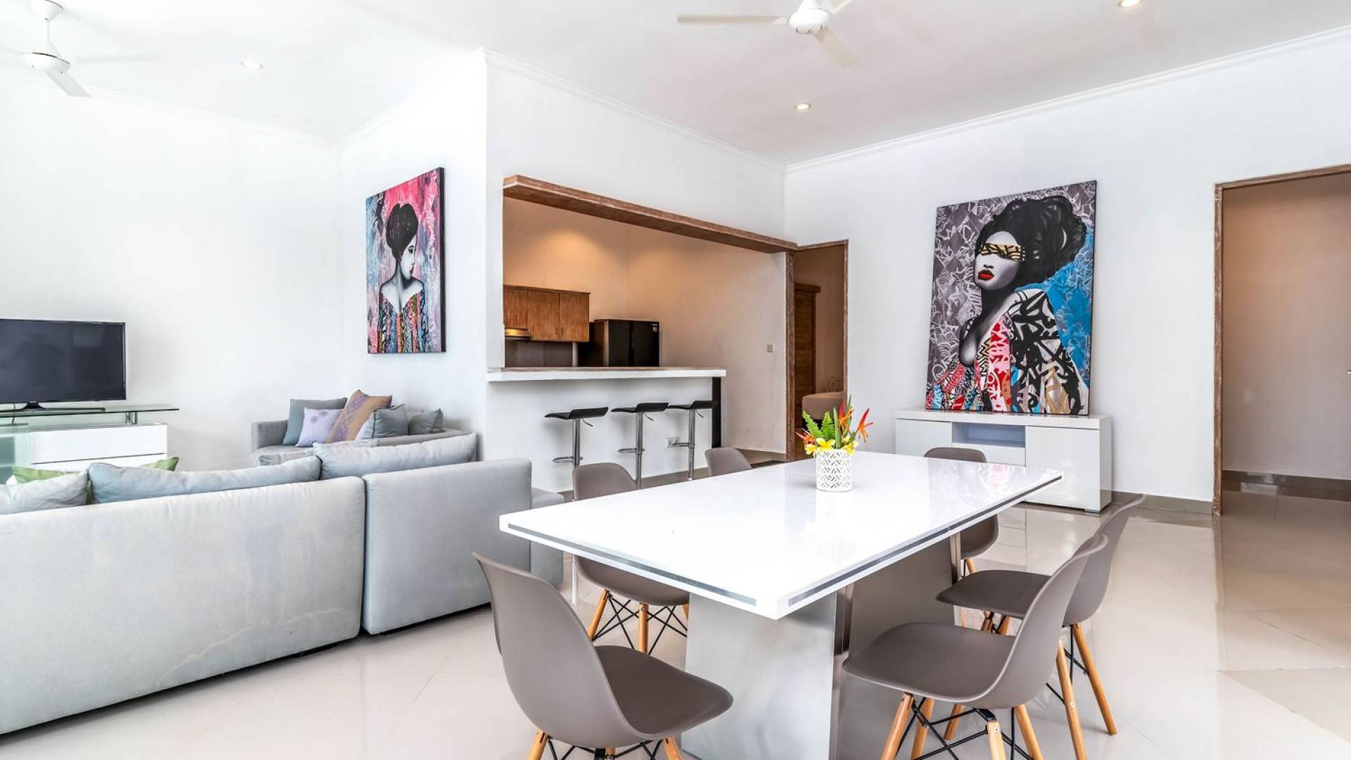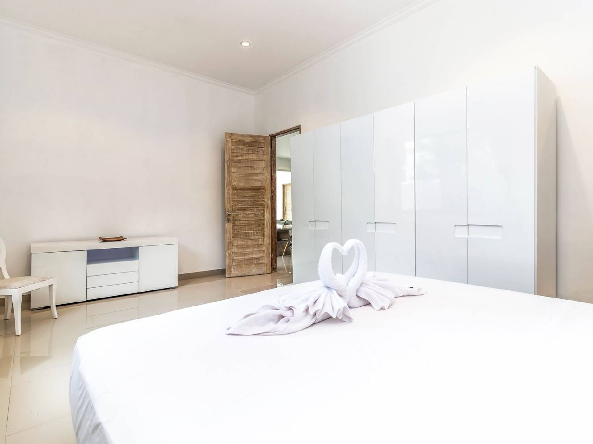 From the living room, you can gain access to all 3 bedrooms. The master room is slightly bigger than the other two but all of them feature the same facilities and amenities. Each room has got a large king-size bed with quality white bedsheets and soft pillows, large white closets equipped with safety boxes, one colourful painting mounted to the wall and every room has got individually controlled air-conditioning. Each bedroom is adjoined by a private en-suite bathroom equipped with a shower, washbasin and WC. Toiletries are provided as complimentary to your stay.