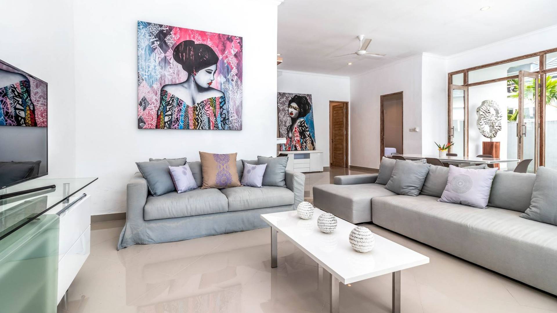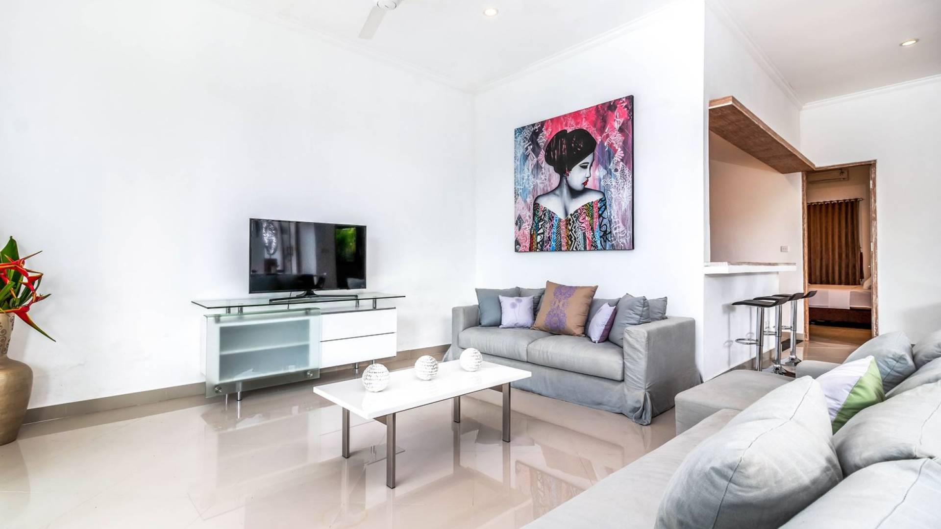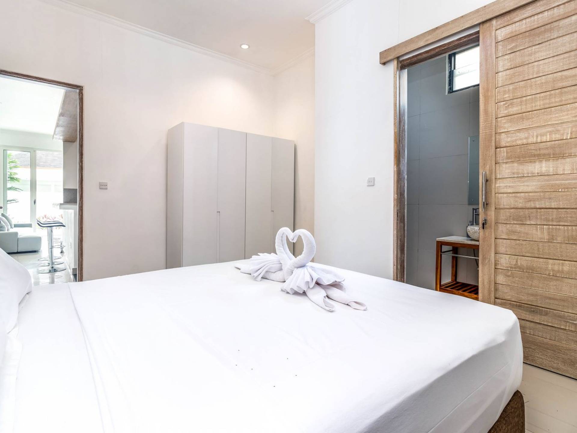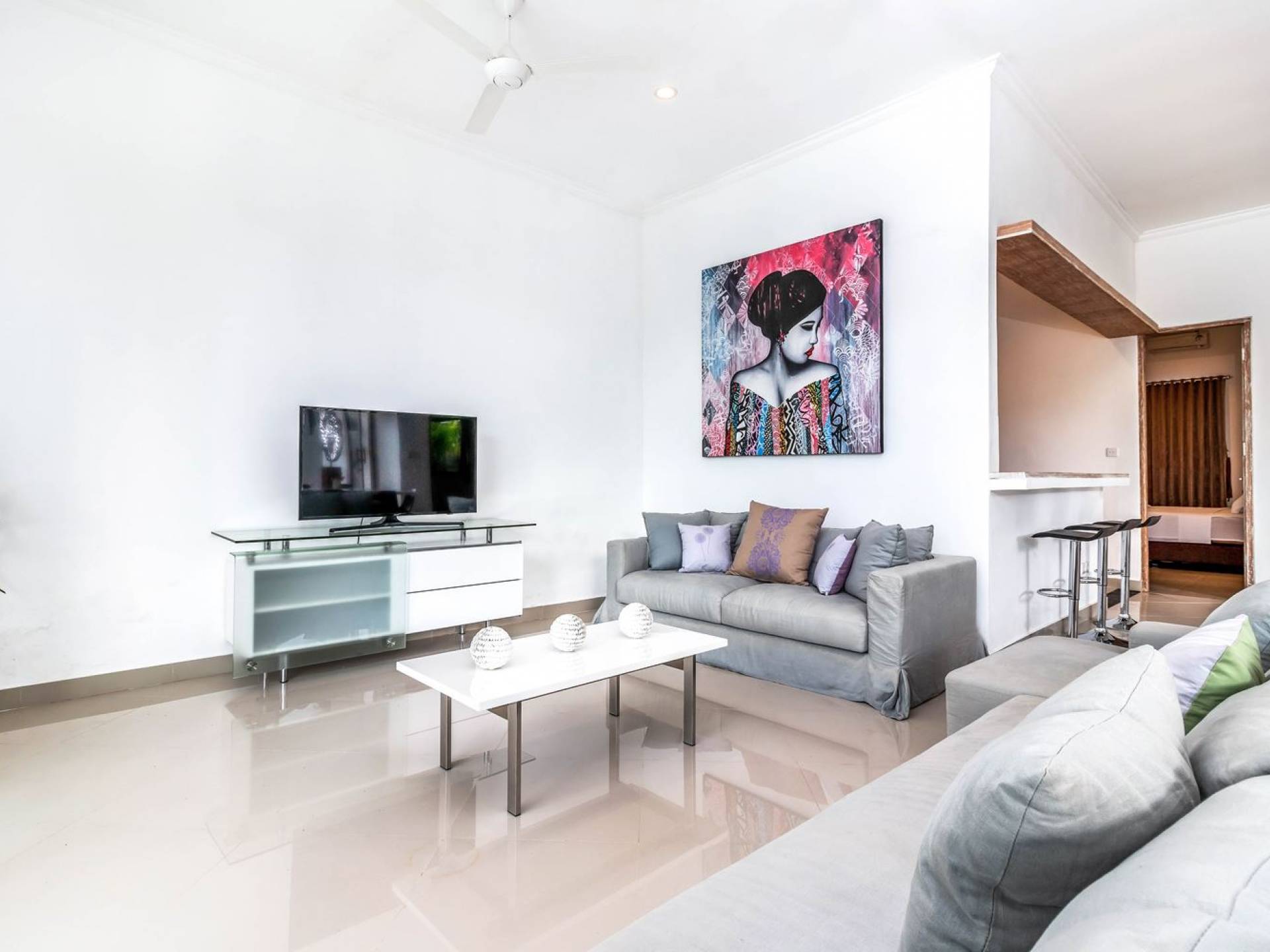 From the living room, you can gain access to all 3 bedrooms. The master room is slightly bigger than the other two but all of them feature the same facilities and amenities. Each room has got a large king-size bed with quality white bedsheets and soft pillows, large white closets equipped with safety boxes, one colourful painting mounted to the wall and every room has got individually controlled air-conditioning. Each bedroom is adjoined by a private en-suite bathroom equipped with a shower, washbasin and WC. Toiletries are provided as complimentary to your stay.
