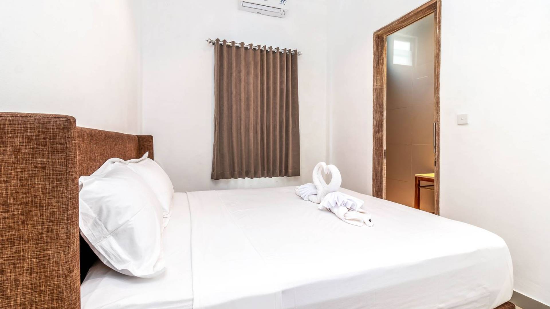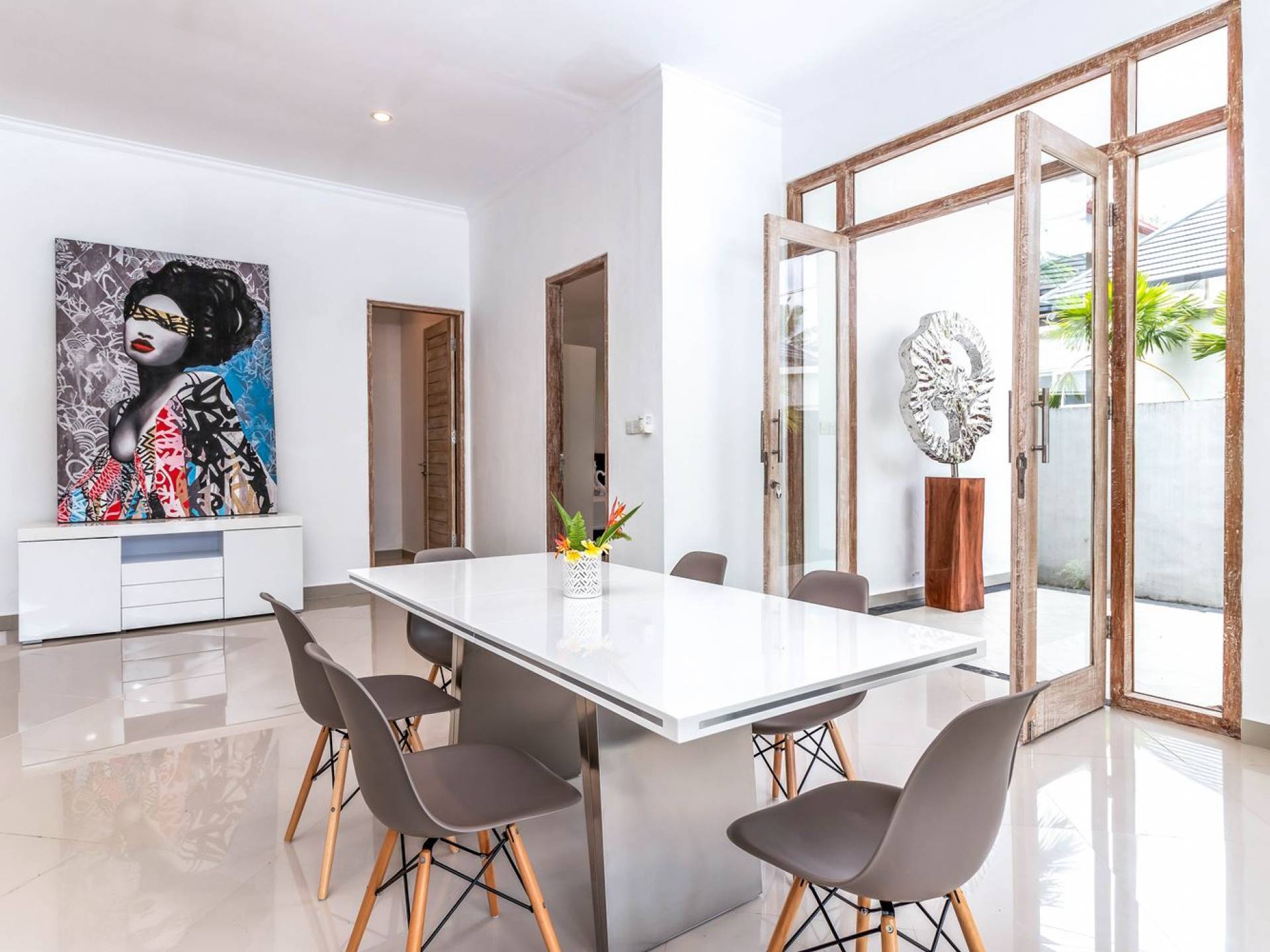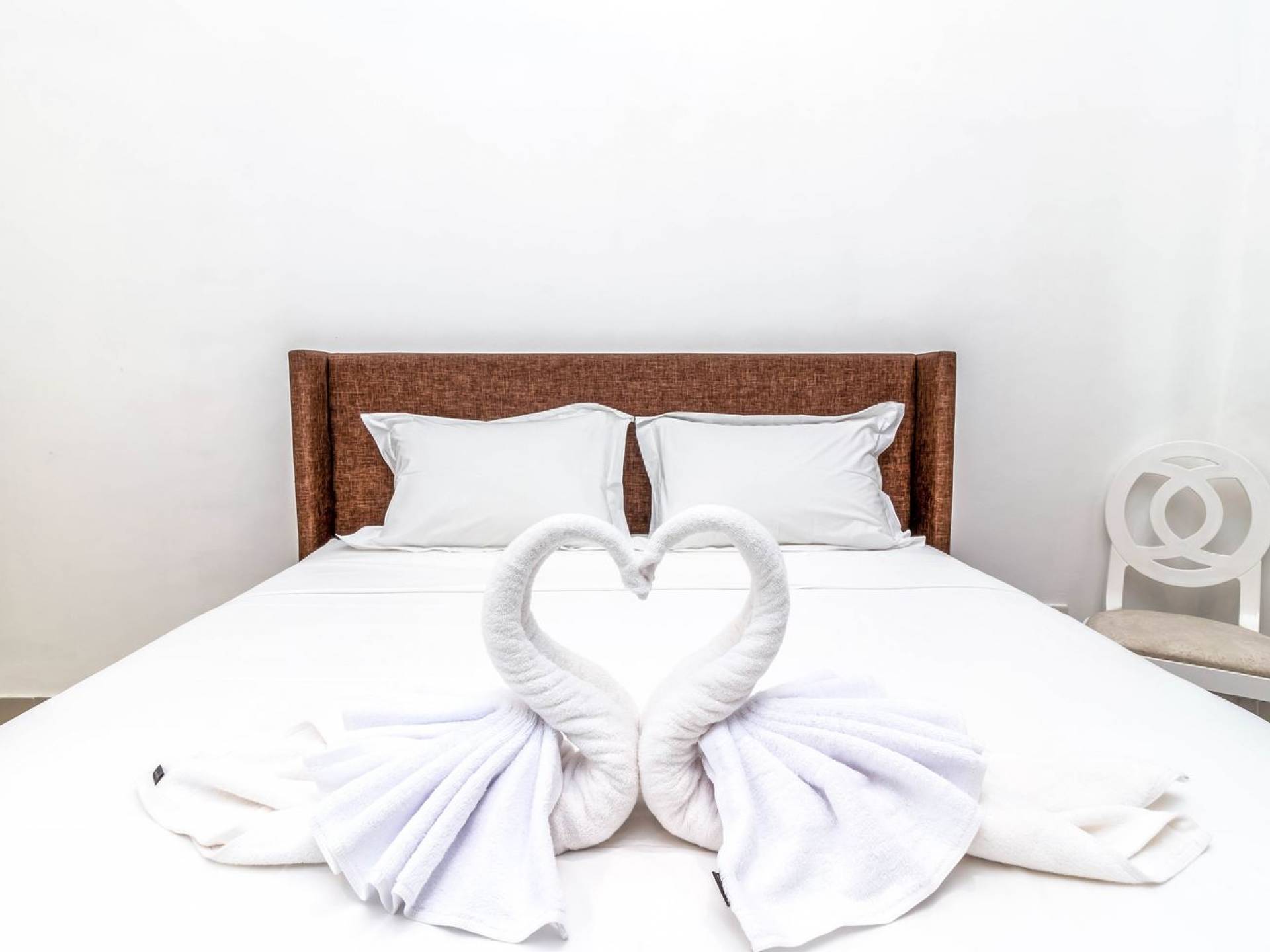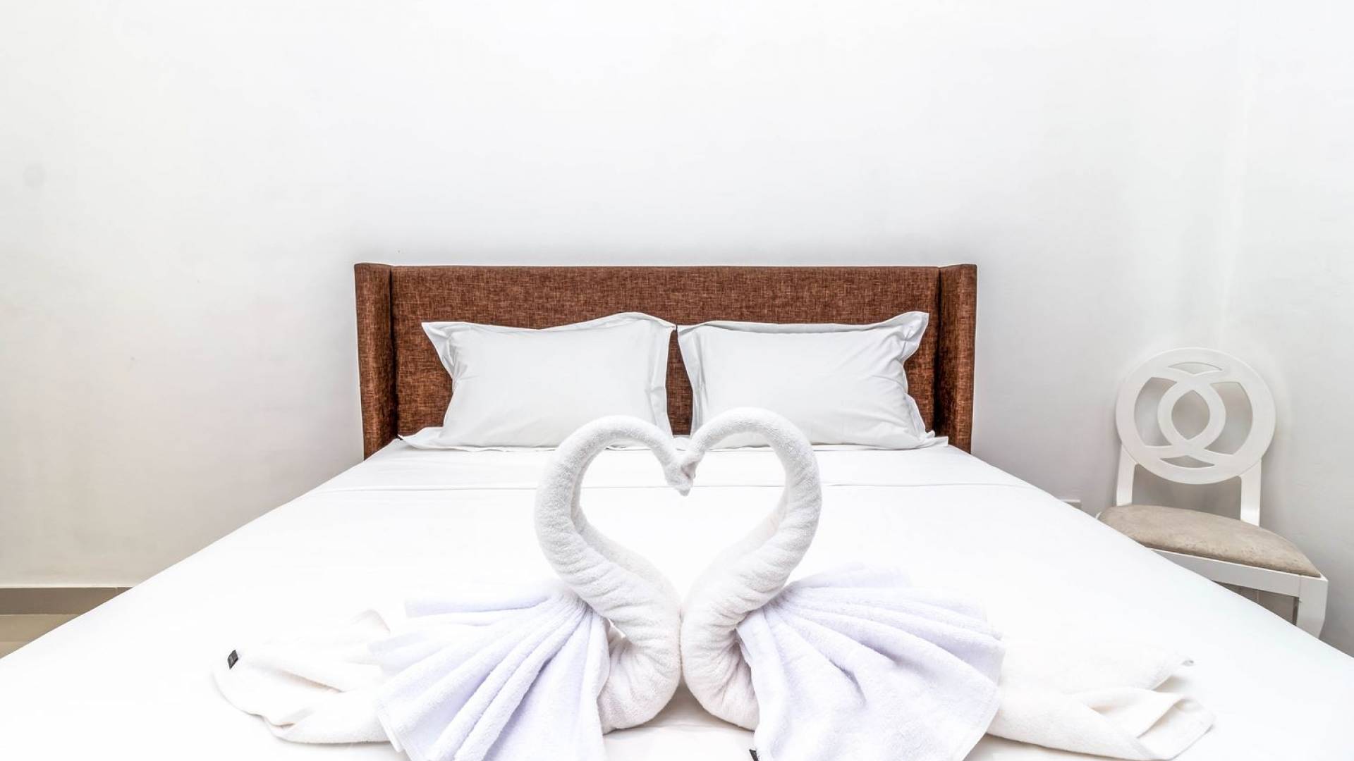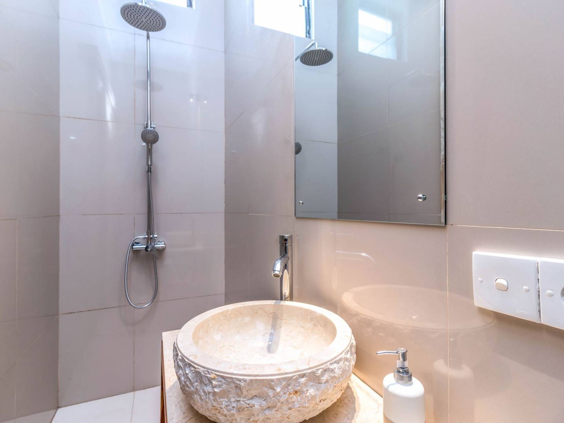 From the living room, you can gain access to all 3 bedrooms. The master room is slightly bigger than the other two but all of them feature the same facilities and amenities. Each room has got a large king-size bed with quality white bedsheets and soft pillows, large white closets equipped with safety boxes, one colourful painting mounted to the wall and every room has got individually controlled air-conditioning. Each bedroom is adjoined by a private en-suite bathroom equipped with a shower, washbasin and WC. Toiletries are provided as complimentary to your stay.
