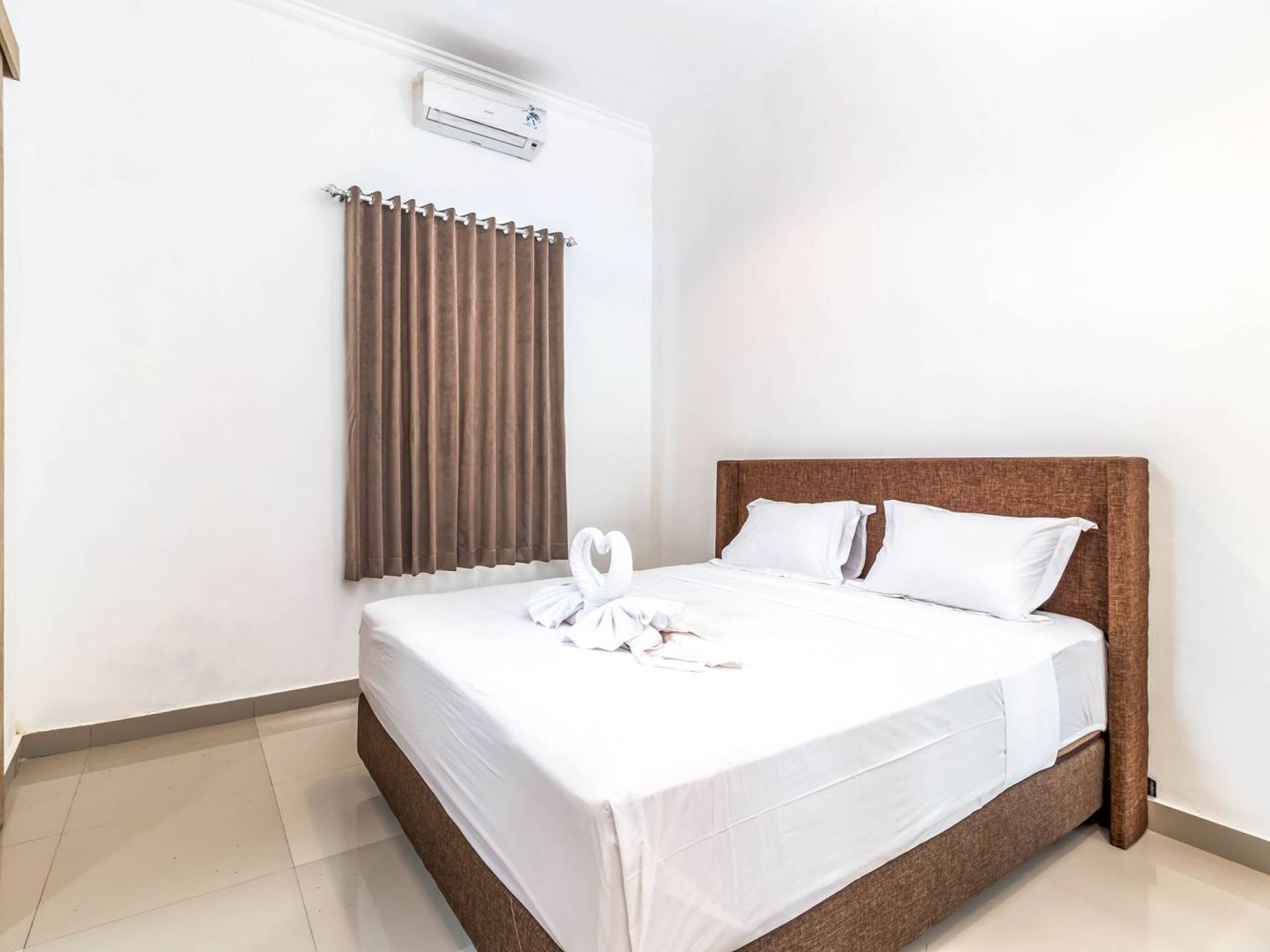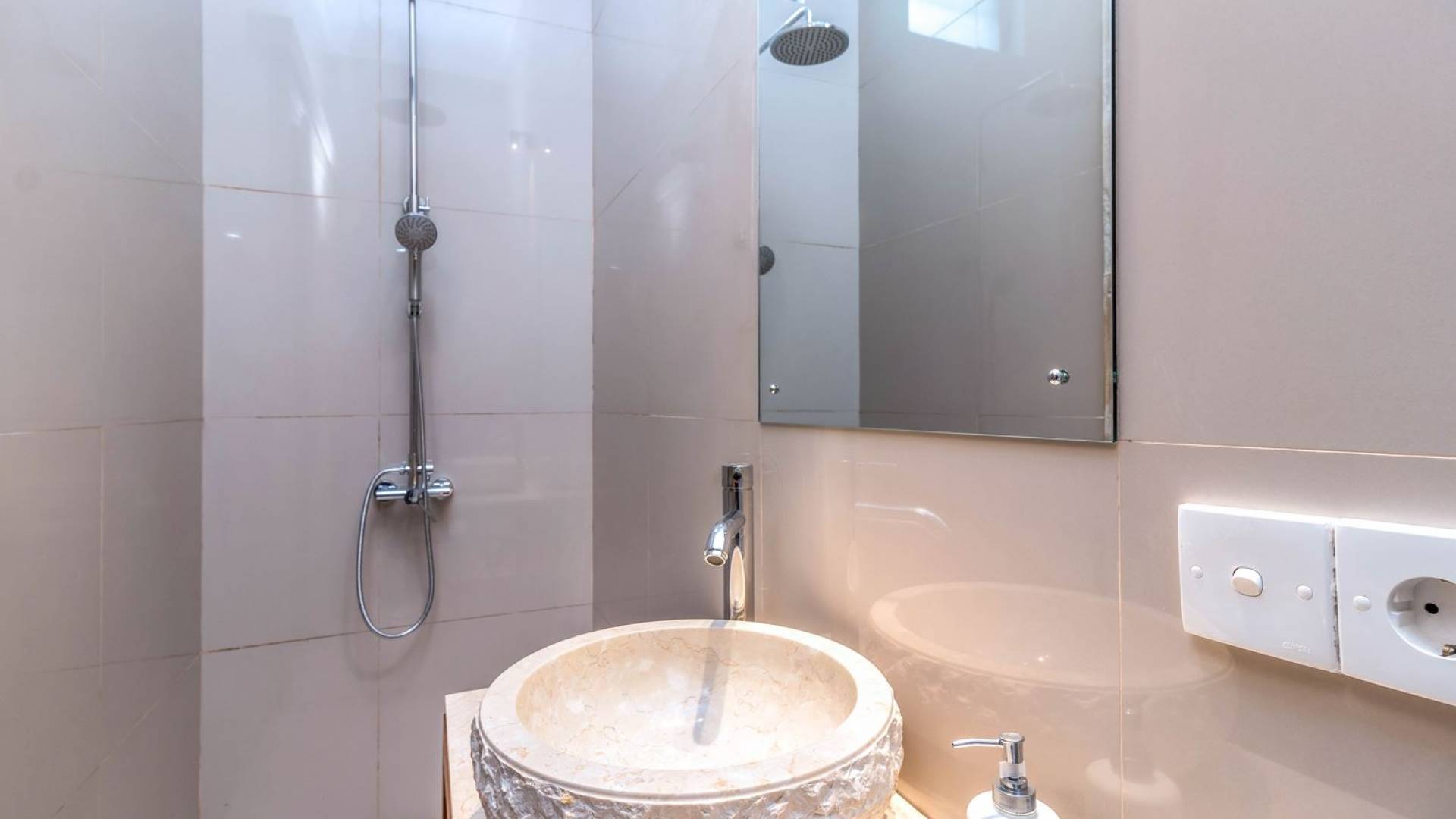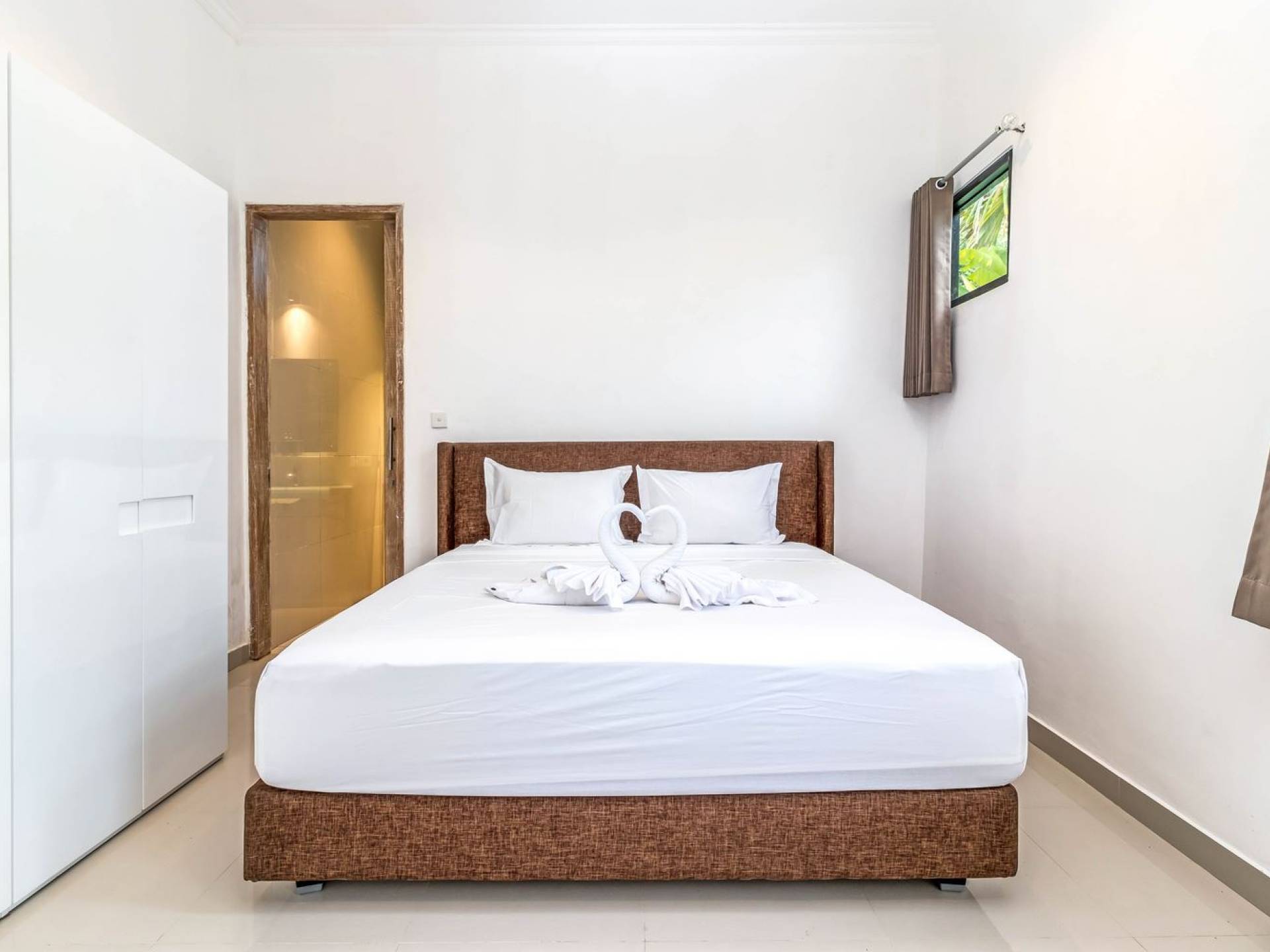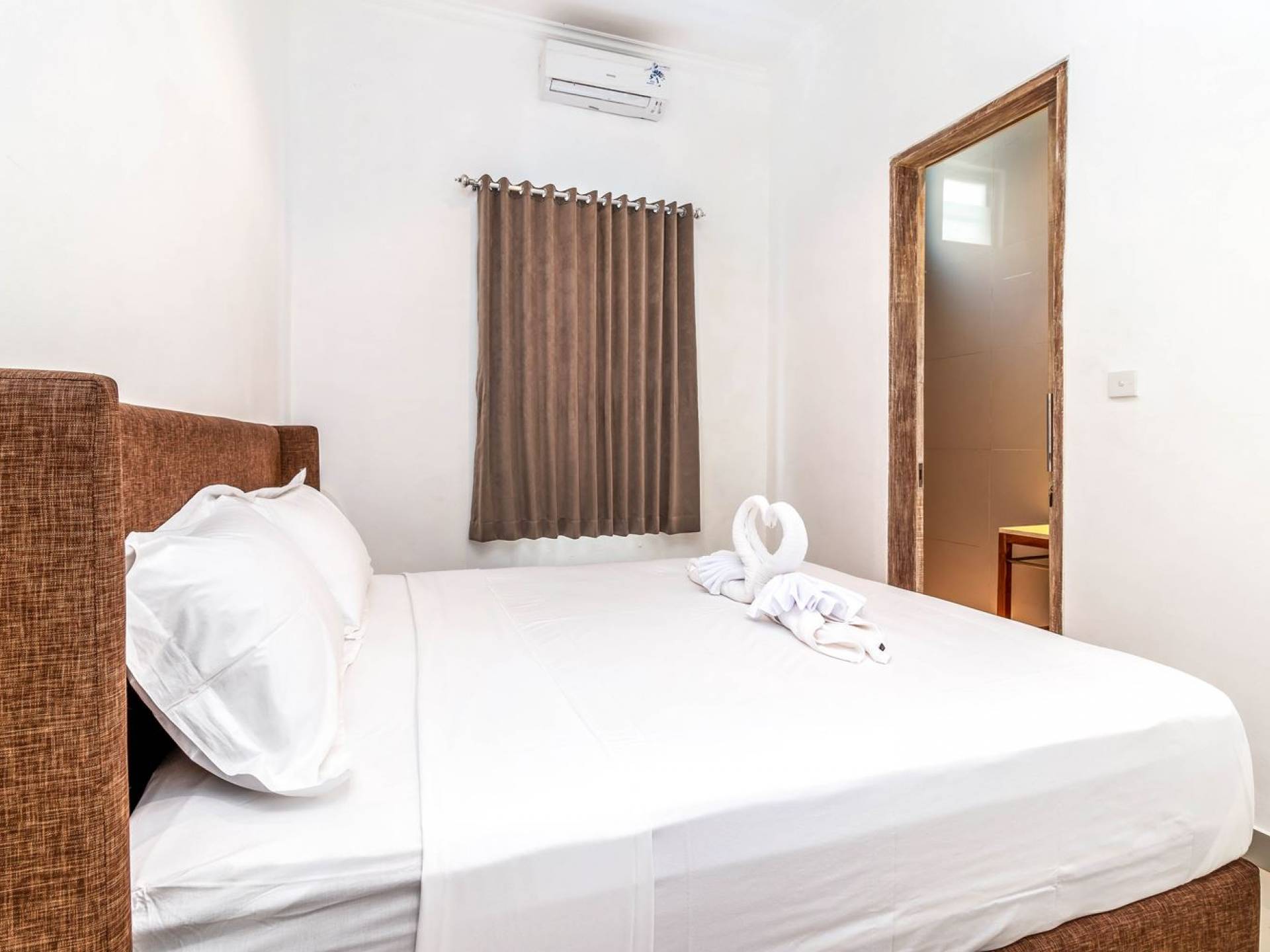 From the living room, you can gain access to all 3 bedrooms. The master room is slightly bigger than the other two but all of them feature the same facilities and amenities. Each room has got a large king-size bed with quality white bedsheets and soft pillows, large white closets equipped with safety boxes, one colourful painting mounted to the wall and every room has got individually controlled air-conditioning. Each bedroom is adjoined by a private en-suite bathroom equipped with a shower, washbasin and WC. Toiletries are provided as complimentary to your stay.
