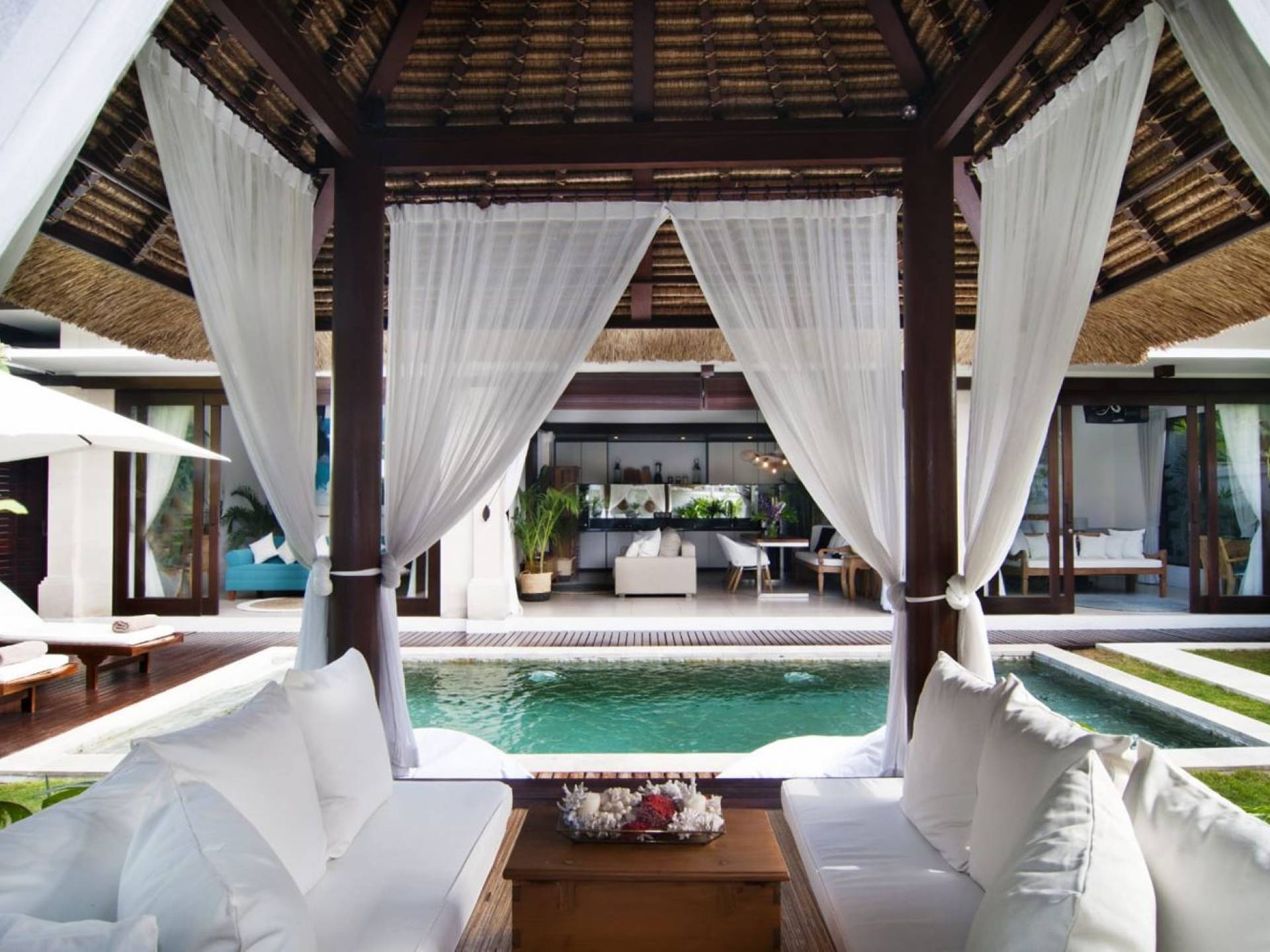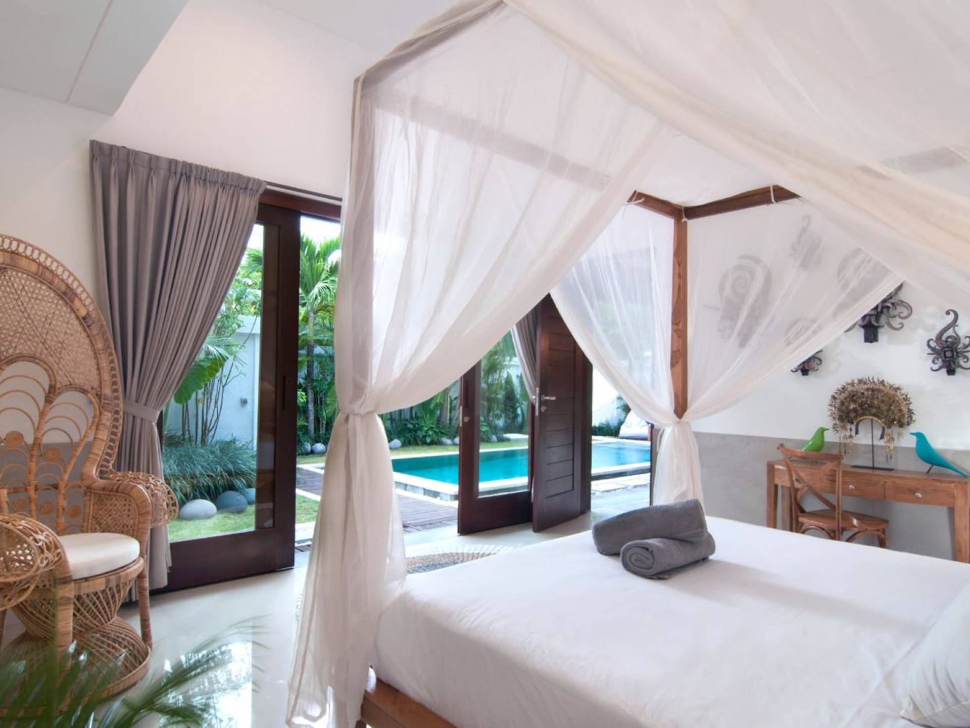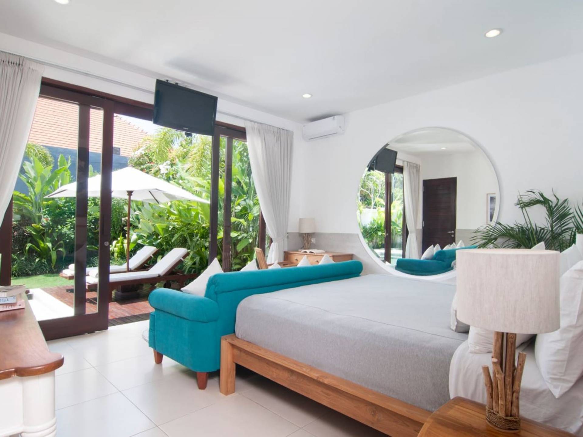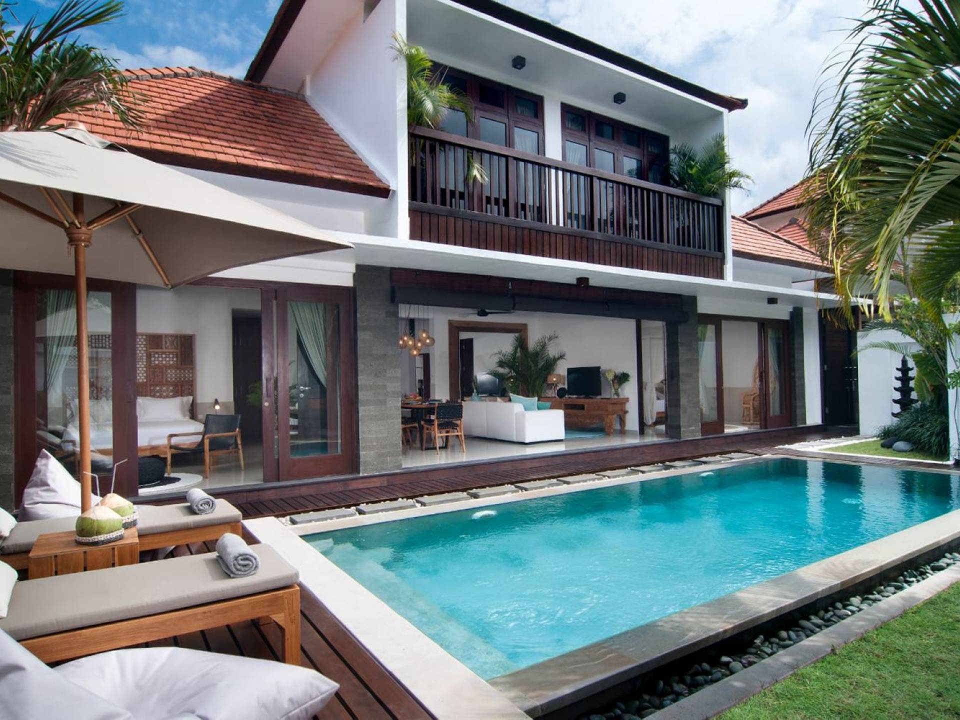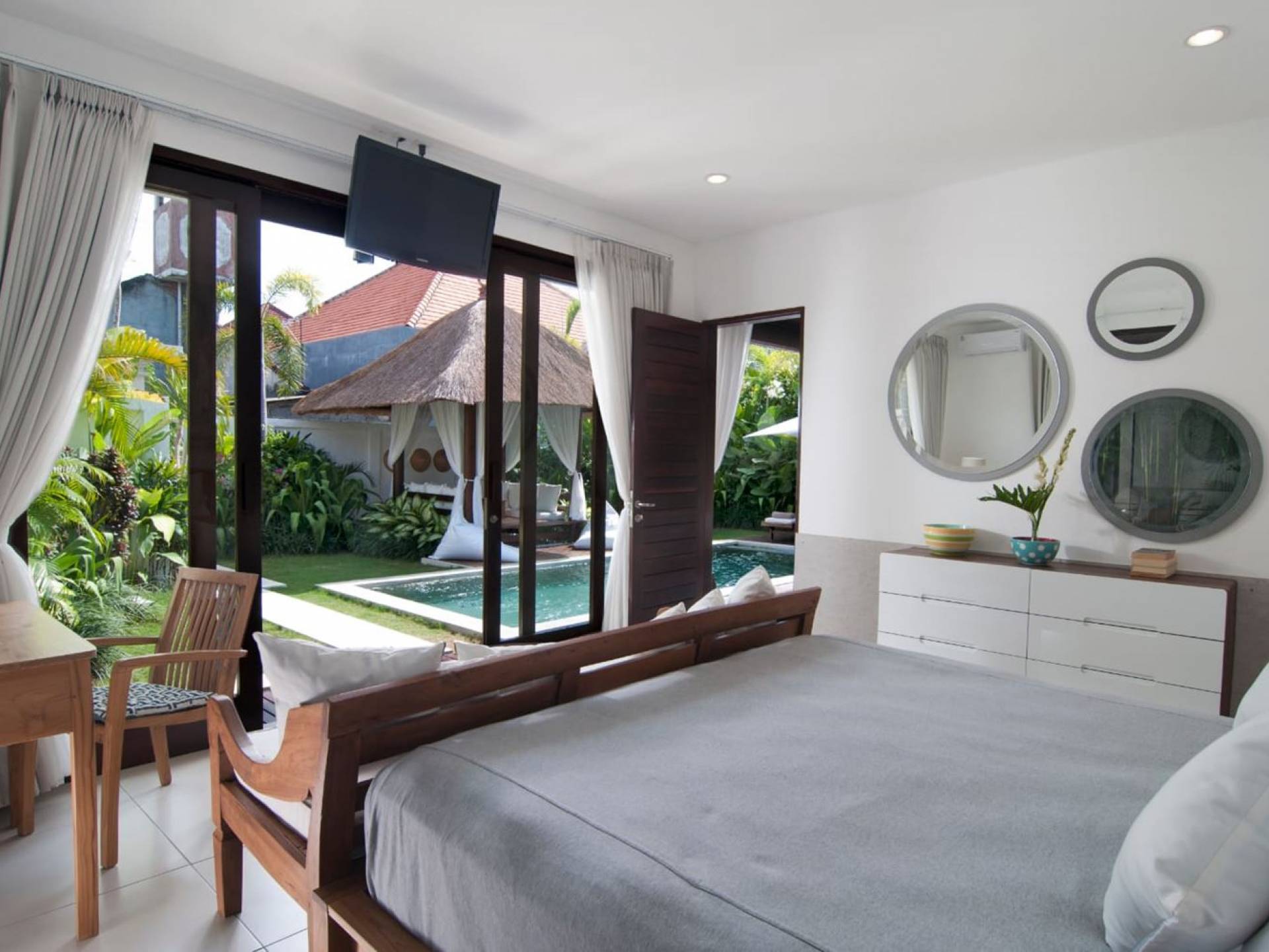 Villa Mason houses a total of 8 air-conditioned bedroom suites. Each master bedroom takes up the entire first floor and the two guest bedrooms are flanking the sides of the living room. Each of these bedrooms has its own private en-suite bathroom fitted with a hot/cold rain shower, a natural stone wash basin, and a toilet. The master suite features a traditional high-pitched timber rooftop and it is furnished with a king-size bed romantically draped in white curtains, a spacious wooden wardrobe closet, and a rattan sofa facing satellite TV. The bedroom opens up to a private balcony with a lovely view of the garden and pool down below. The two guest bedrooms are also furnished with king-size beds for a perfect night's sleep. In the morning, you can slide open the full-length glass doors to the garden and jump straight into the swimming pool if you wish. The guest bedrooms are also furnished with reading chairs and large wardrobe closets with dressing tables.