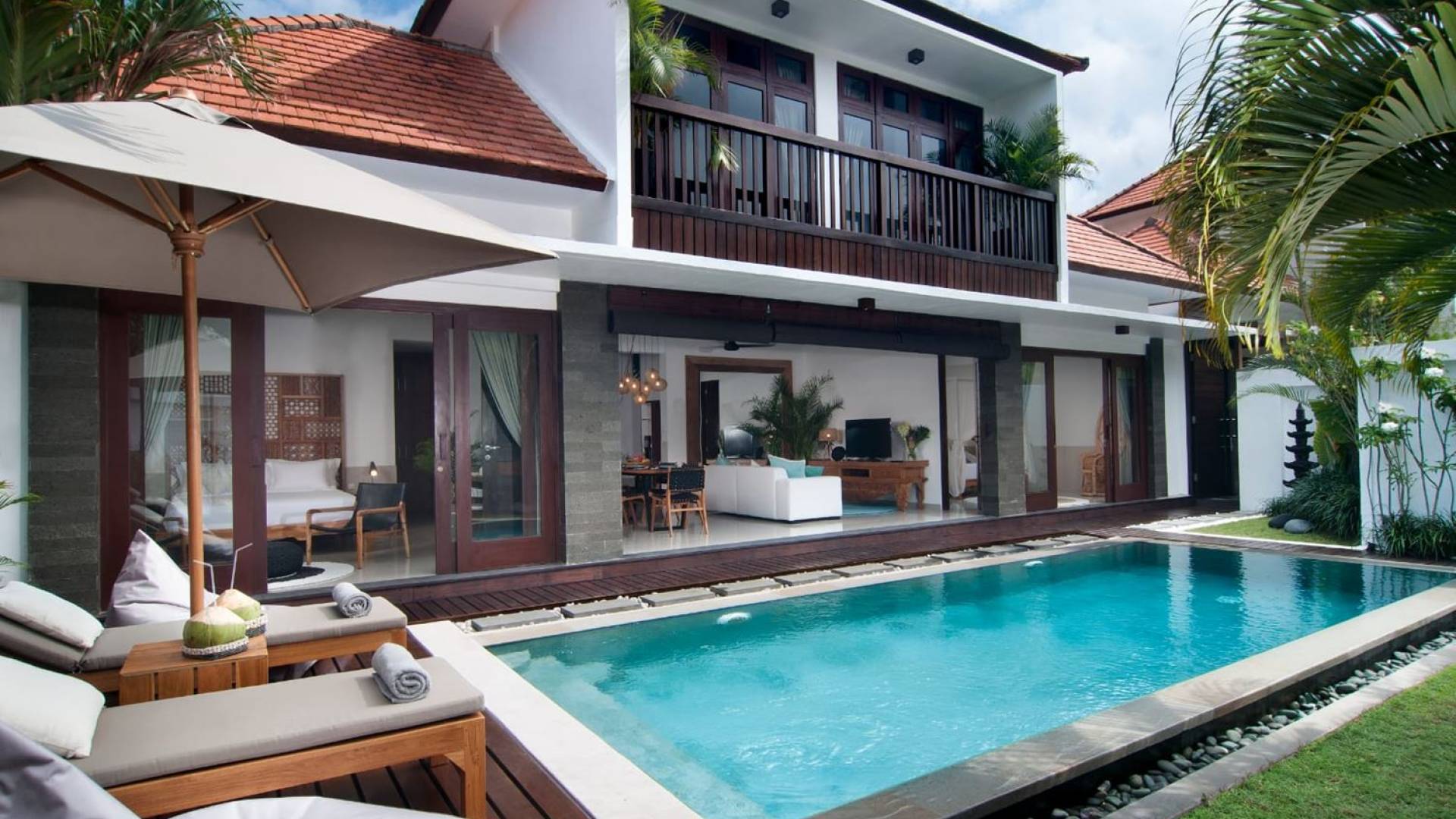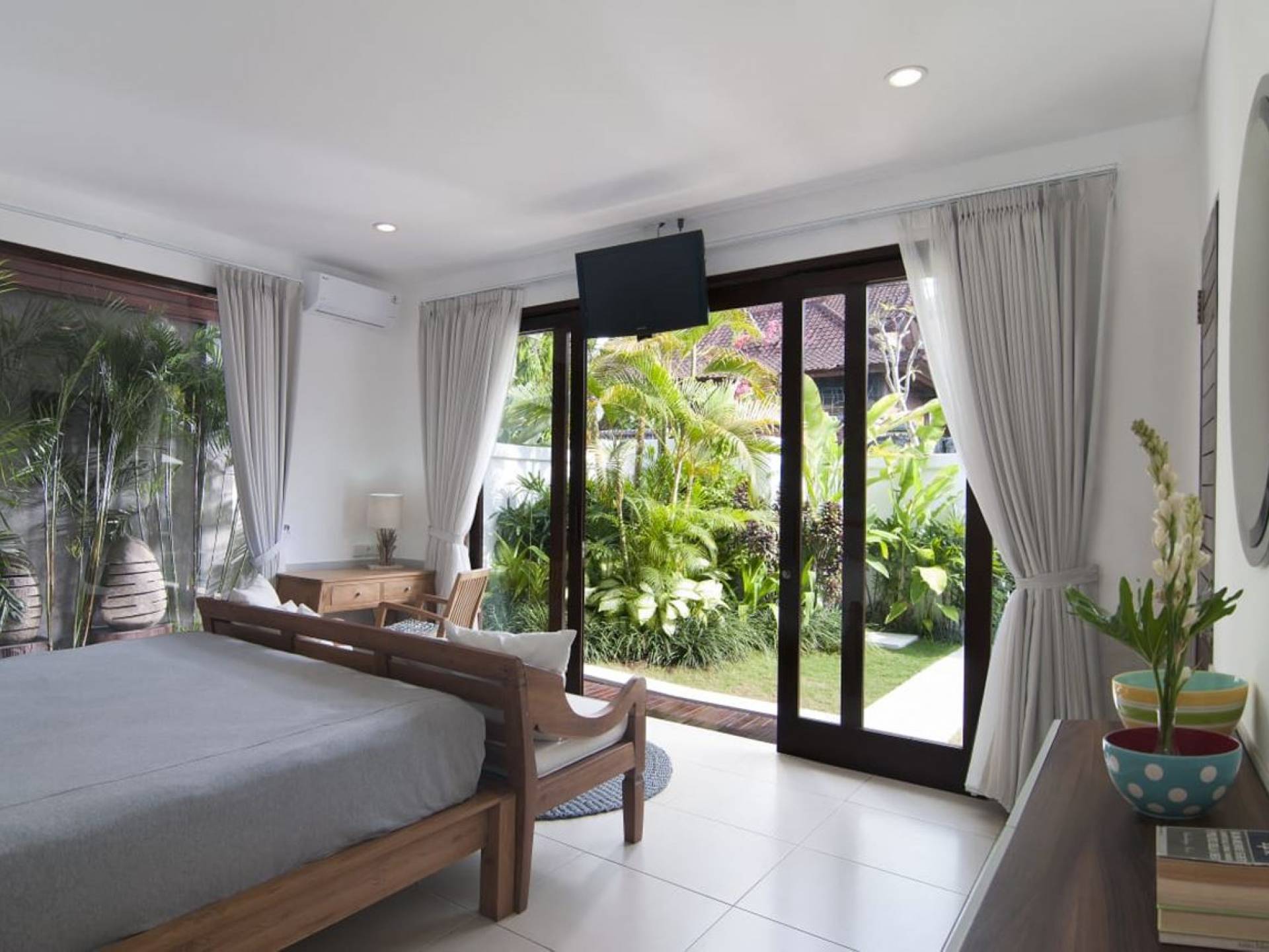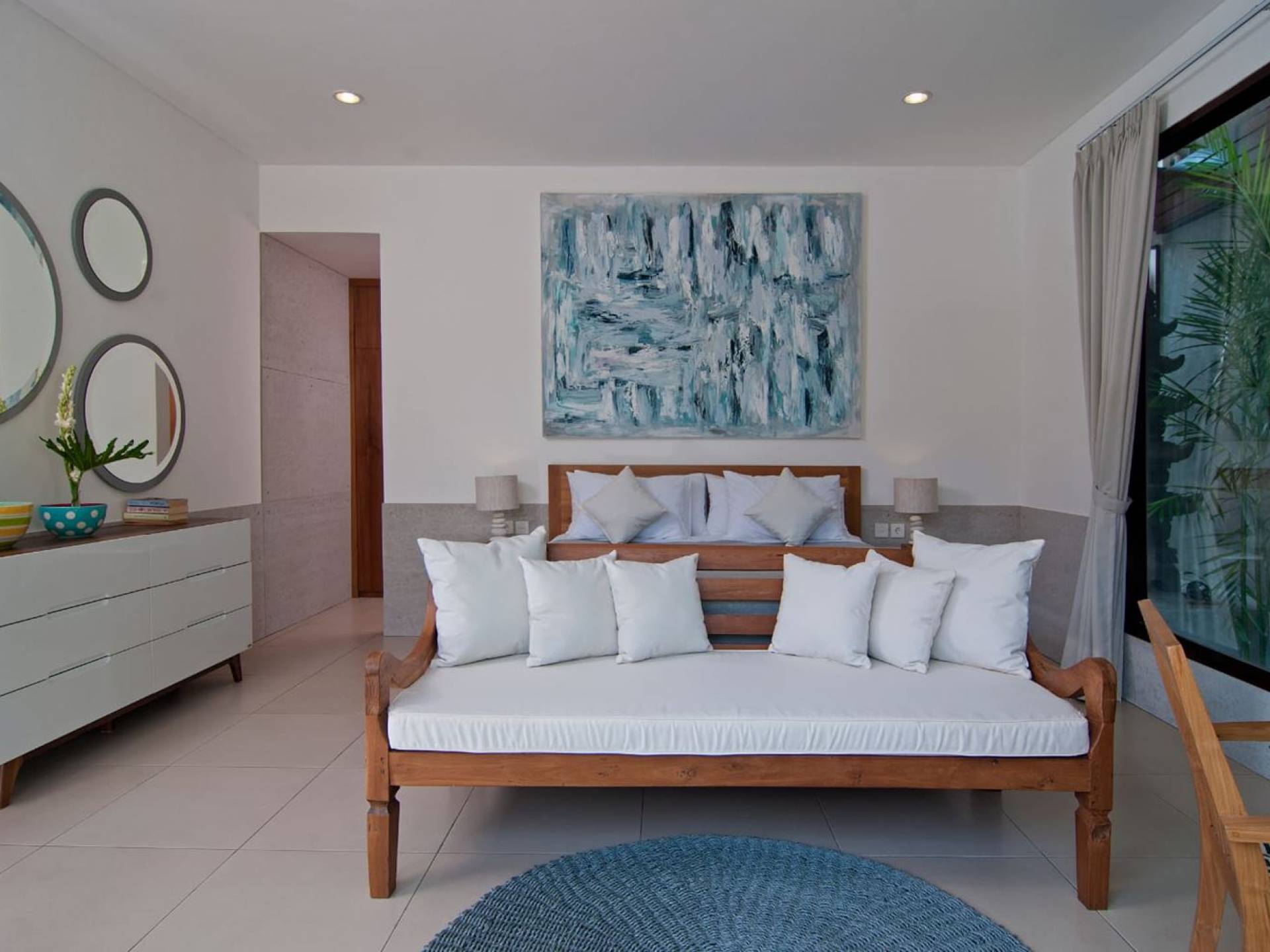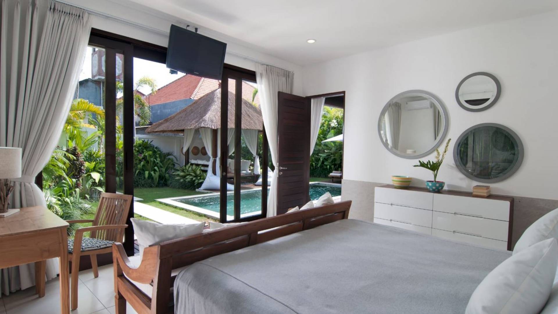 Villa Mason houses a total of 8 air-conditioned bedroom suites. Each master bedroom takes up the entire first floor and the two guest bedrooms are flanking the sides of the living room. Each of these bedrooms has its own private en-suite bathroom fitted with a hot/cold rain shower, a natural stone wash basin, and a toilet. The master suite features a traditional high-pitched timber rooftop and it is furnished with a king-size bed romantically draped in white curtains, a spacious wooden wardrobe closet, and a rattan sofa facing satellite TV. The bedroom opens up to a private balcony with a lovely view of the garden and pool down below. The two guest bedrooms are also furnished with king-size beds for a perfect night's sleep. In the morning, you can slide open the full-length glass doors to the garden and jump straight into the swimming pool if you wish. The guest bedrooms are also furnished with reading chairs and large wardrobe closets with dressing tables.