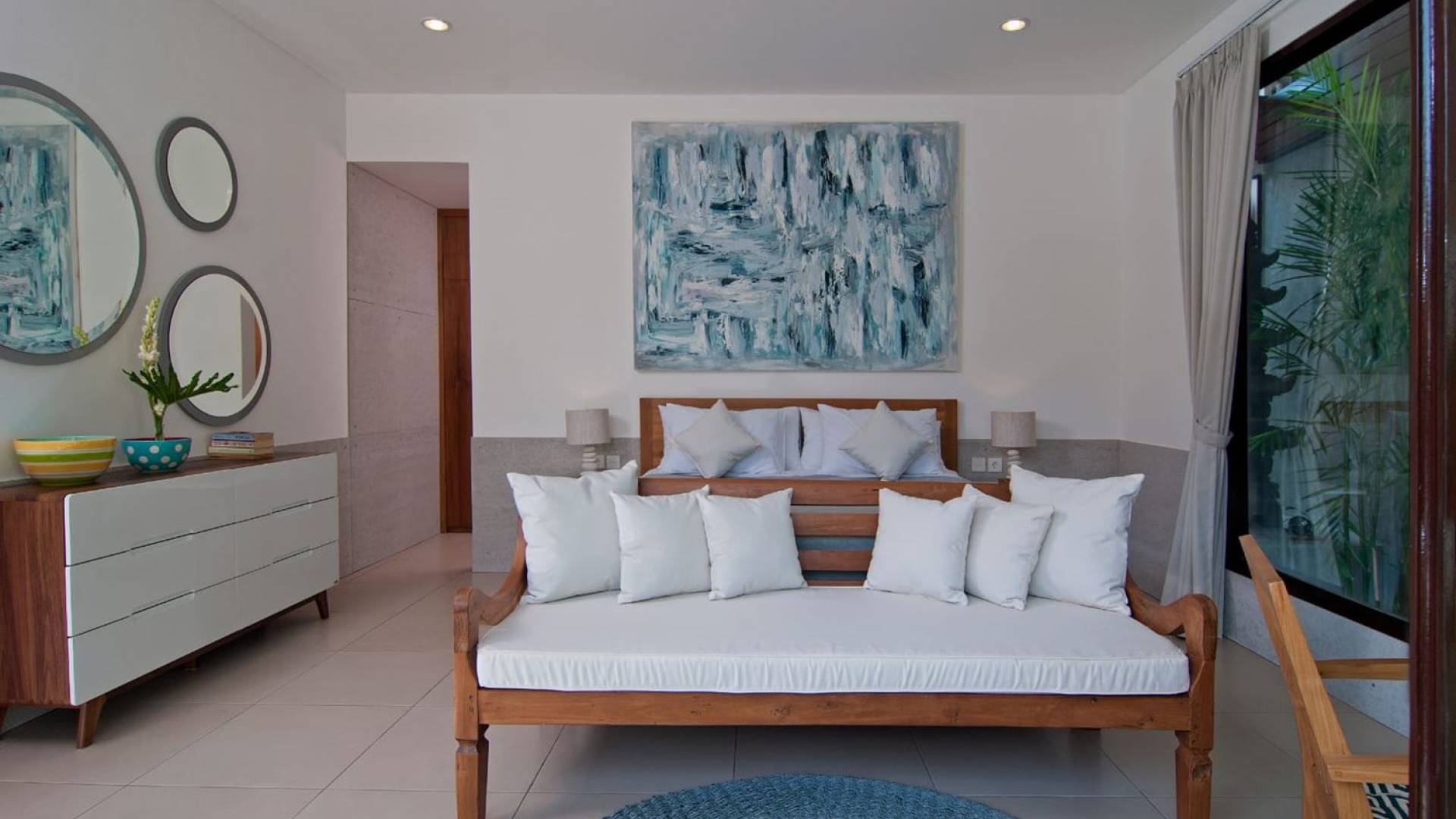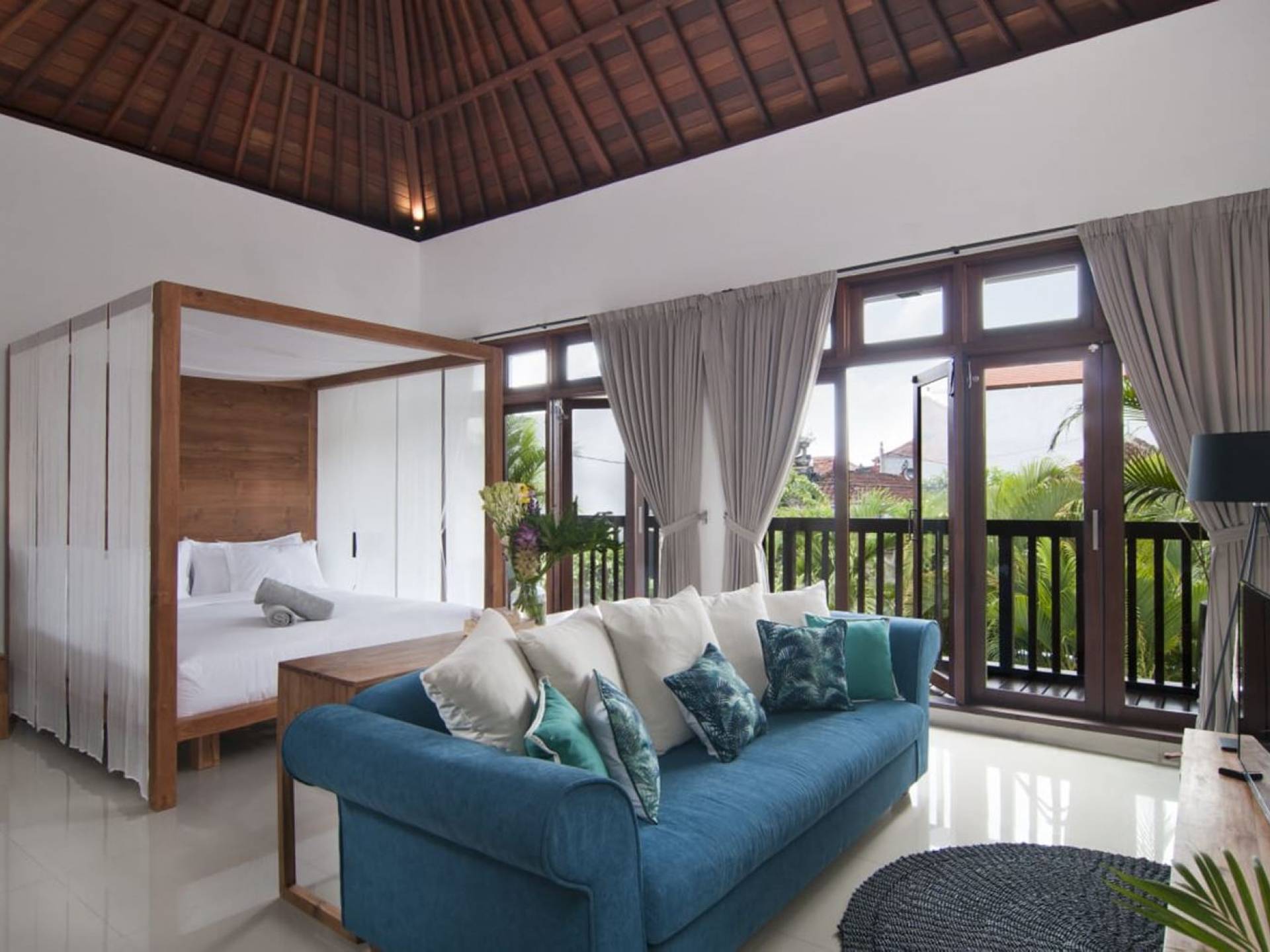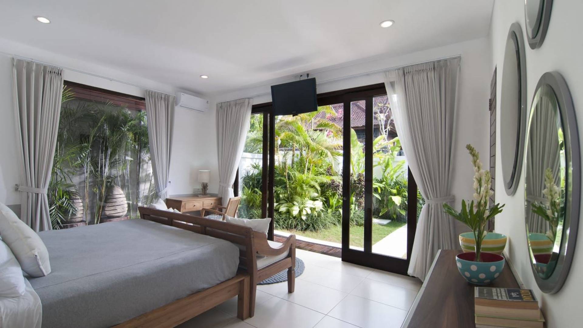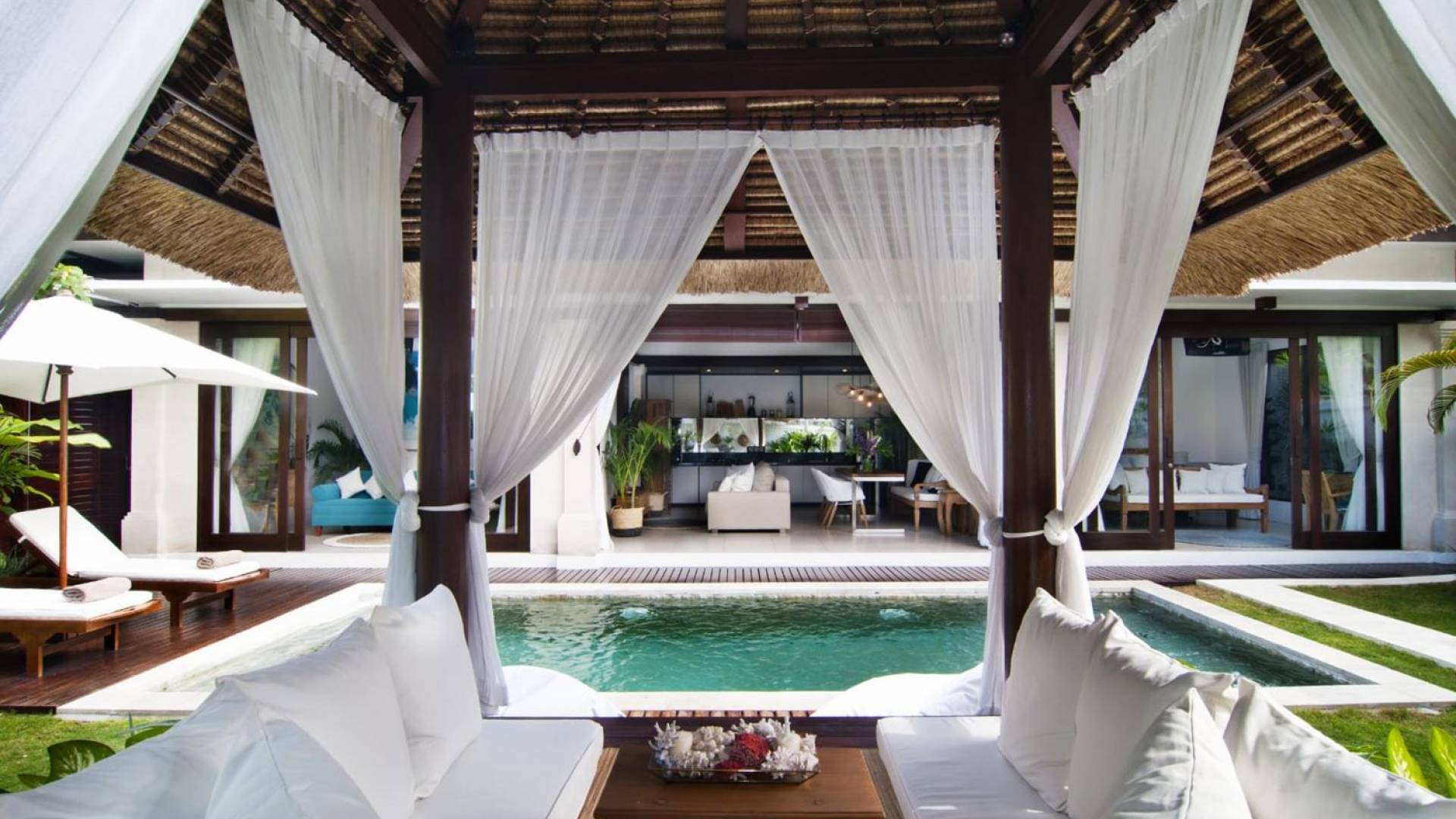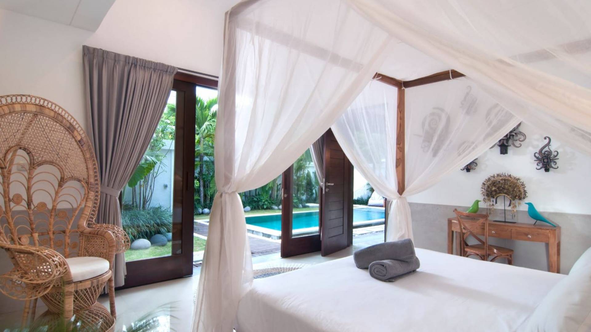 Villa Mason houses a total of 8 air-conditioned bedroom suites. Each master bedroom takes up the entire first floor and the two guest bedrooms are flanking the sides of the living room. Each of these bedrooms has its own private en-suite bathroom fitted with a hot/cold rain shower, a natural stone wash basin, and a toilet. The master suite features a traditional high-pitched timber rooftop and it is furnished with a king-size bed romantically draped in white curtains, a spacious wooden wardrobe closet, and a rattan sofa facing satellite TV. The bedroom opens up to a private balcony with a lovely view of the garden and pool down below. The two guest bedrooms are also furnished with king-size beds for a perfect night's sleep. In the morning, you can slide open the full-length glass doors to the garden and jump straight into the swimming pool if you wish. The guest bedrooms are also furnished with reading chairs and large wardrobe closets with dressing tables.