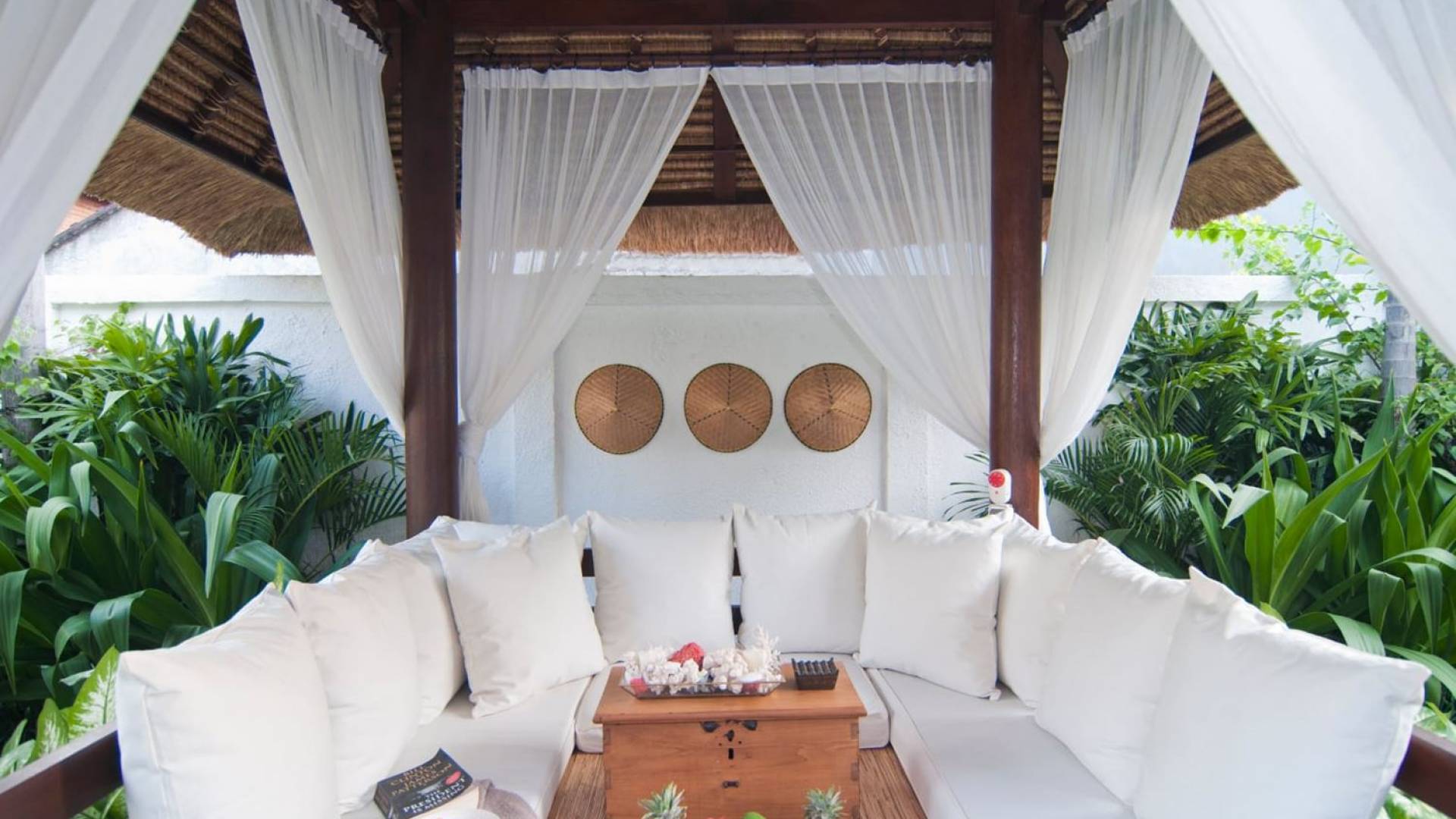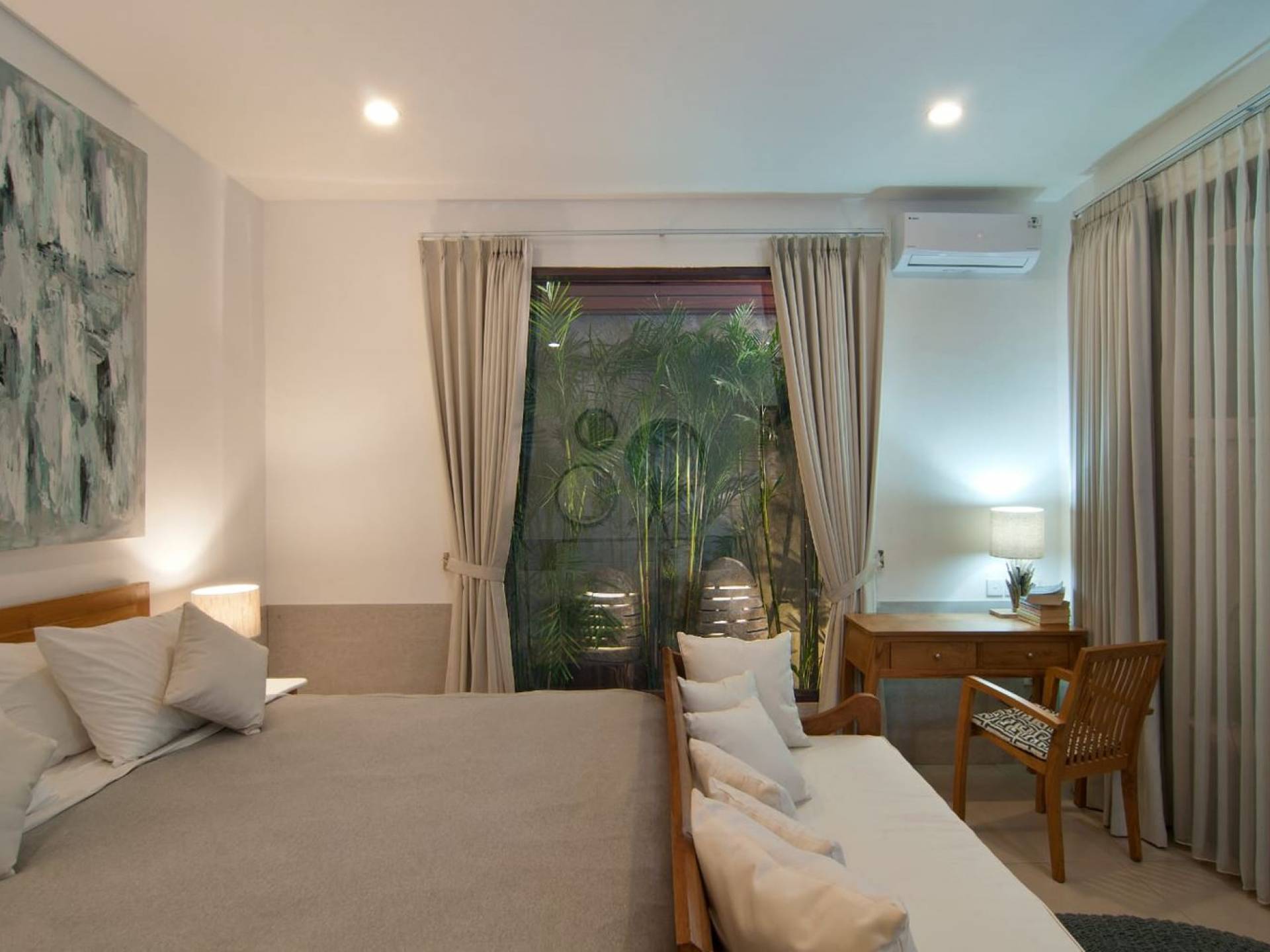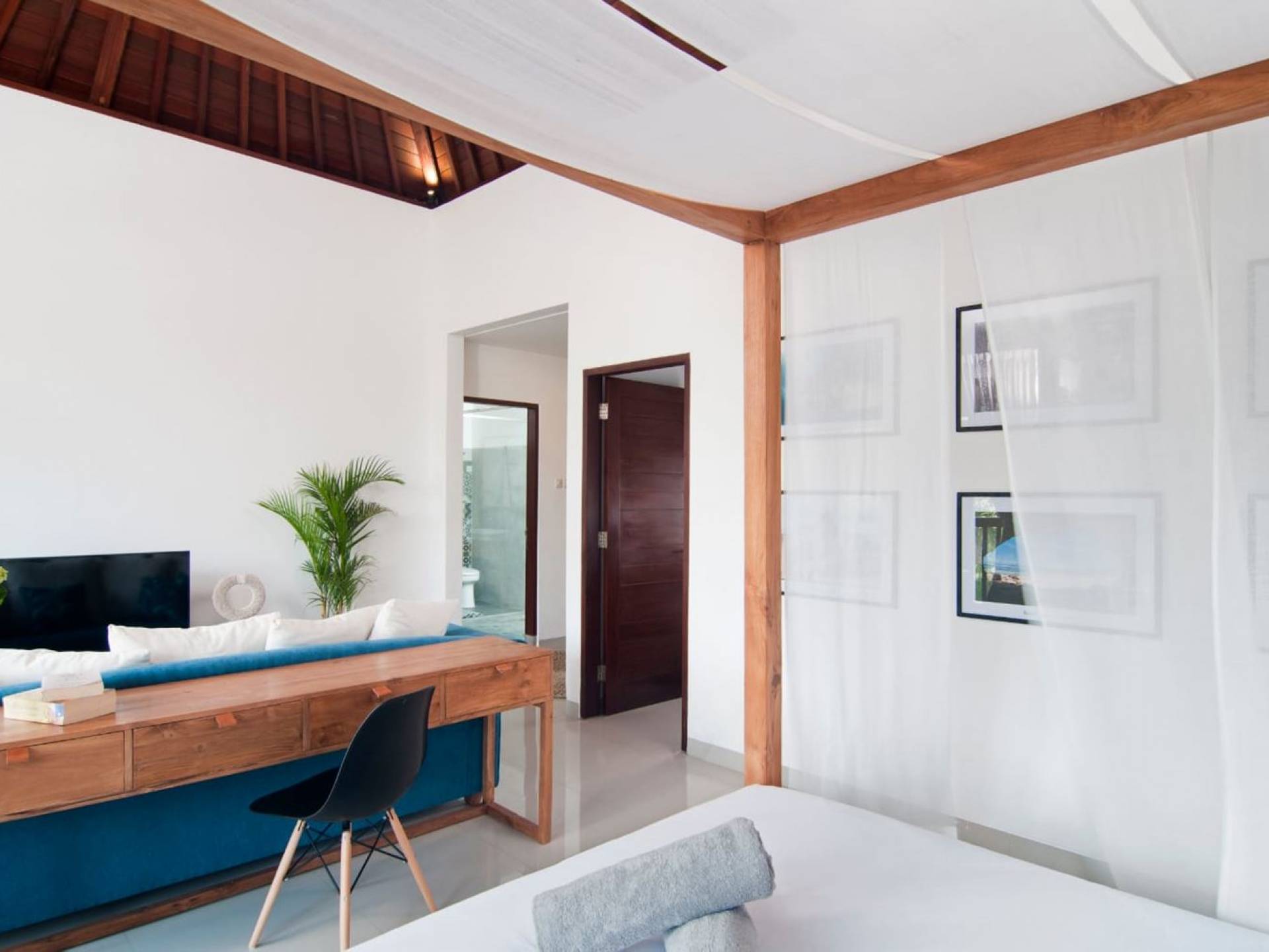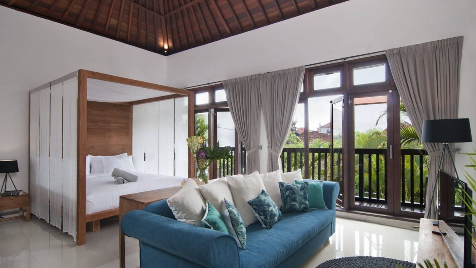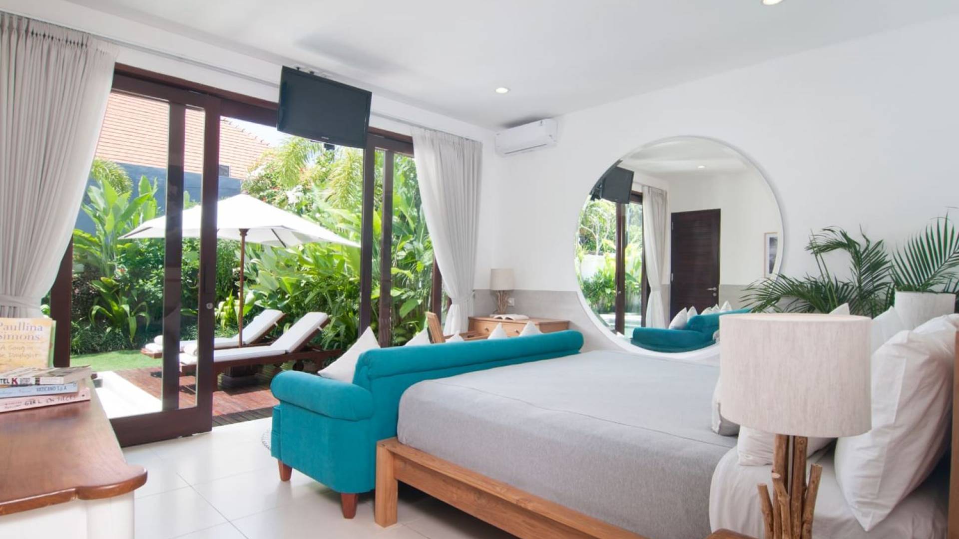 Villa Mason houses a total of 8 air-conditioned bedroom suites. Each master bedroom takes up the entire first floor and the two guest bedrooms are flanking the sides of the living room. Each of these bedrooms has its own private en-suite bathroom fitted with a hot/cold rain shower, a natural stone wash basin, and a toilet. The master suite features a traditional high-pitched timber rooftop and it is furnished with a king-size bed romantically draped in white curtains, a spacious wooden wardrobe closet, and a rattan sofa facing satellite TV. The bedroom opens up to a private balcony with a lovely view of the garden and pool down below. The two guest bedrooms are also furnished with king-size beds for a perfect night's sleep. In the morning, you can slide open the full-length glass doors to the garden and jump straight into the swimming pool if you wish. The guest bedrooms are also furnished with reading chairs and large wardrobe closets with dressing tables.