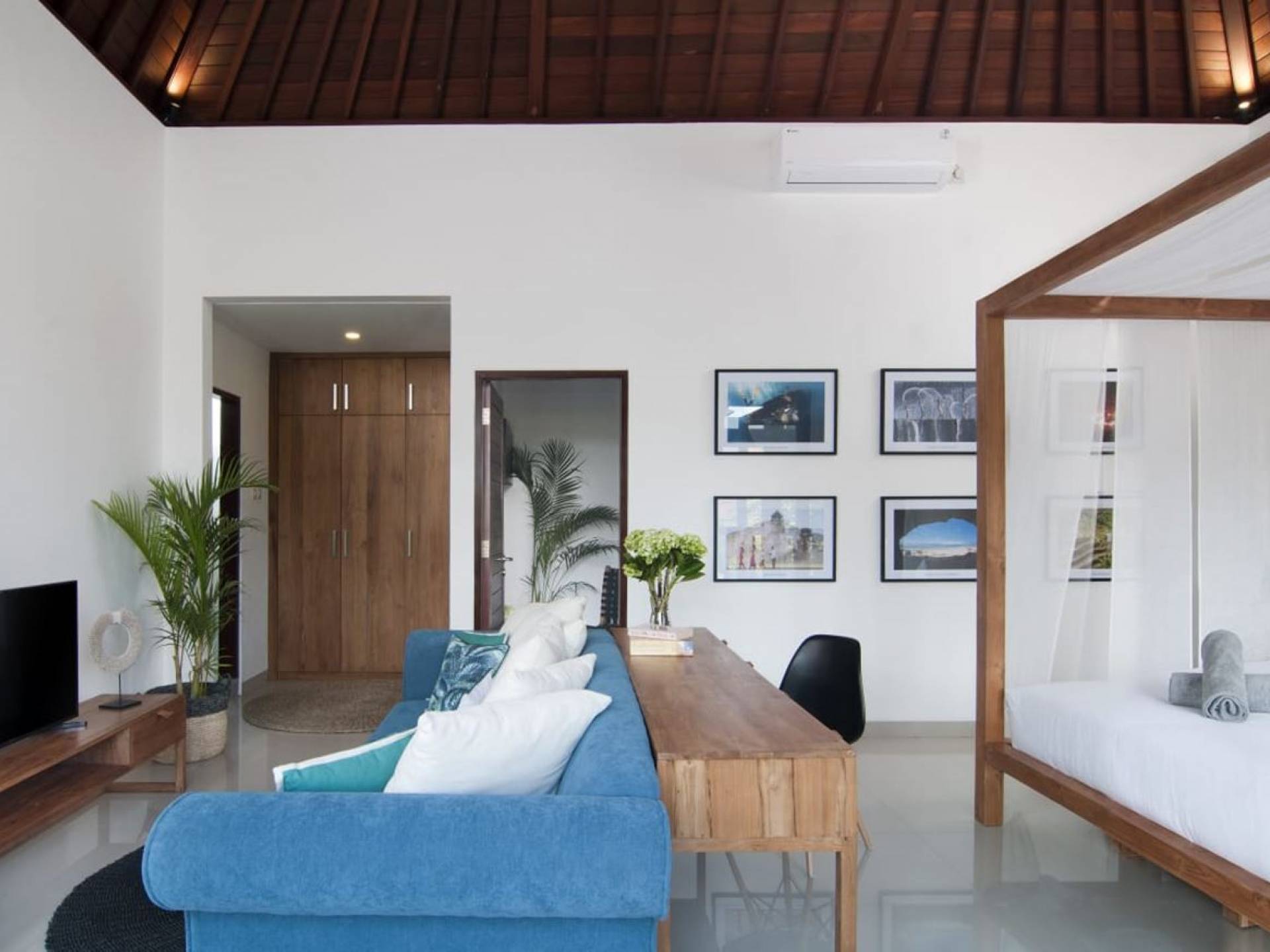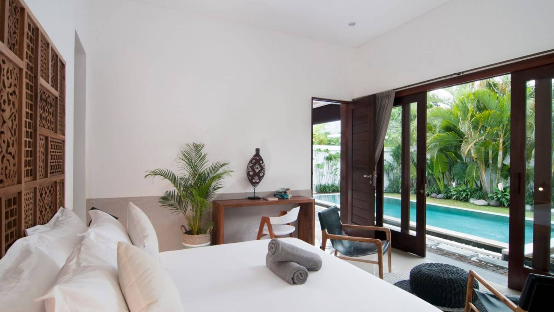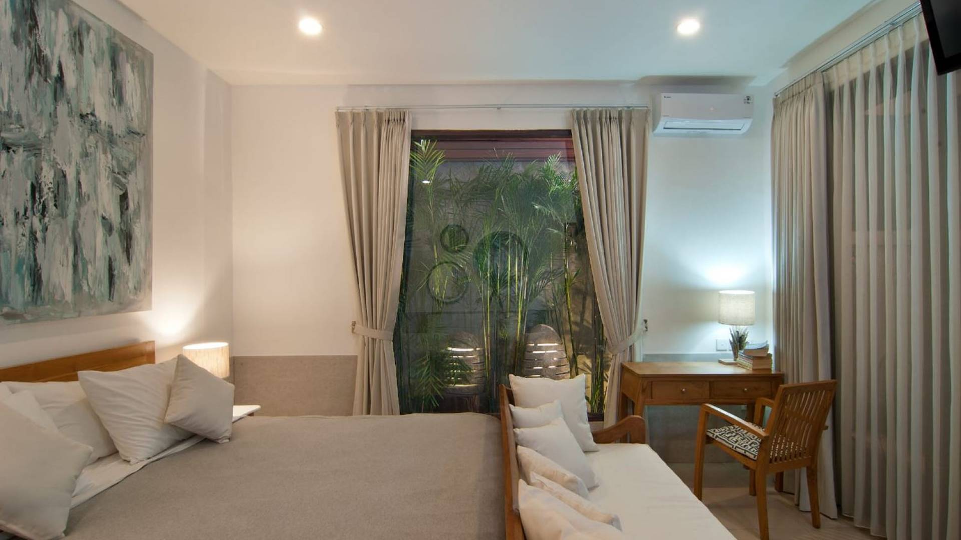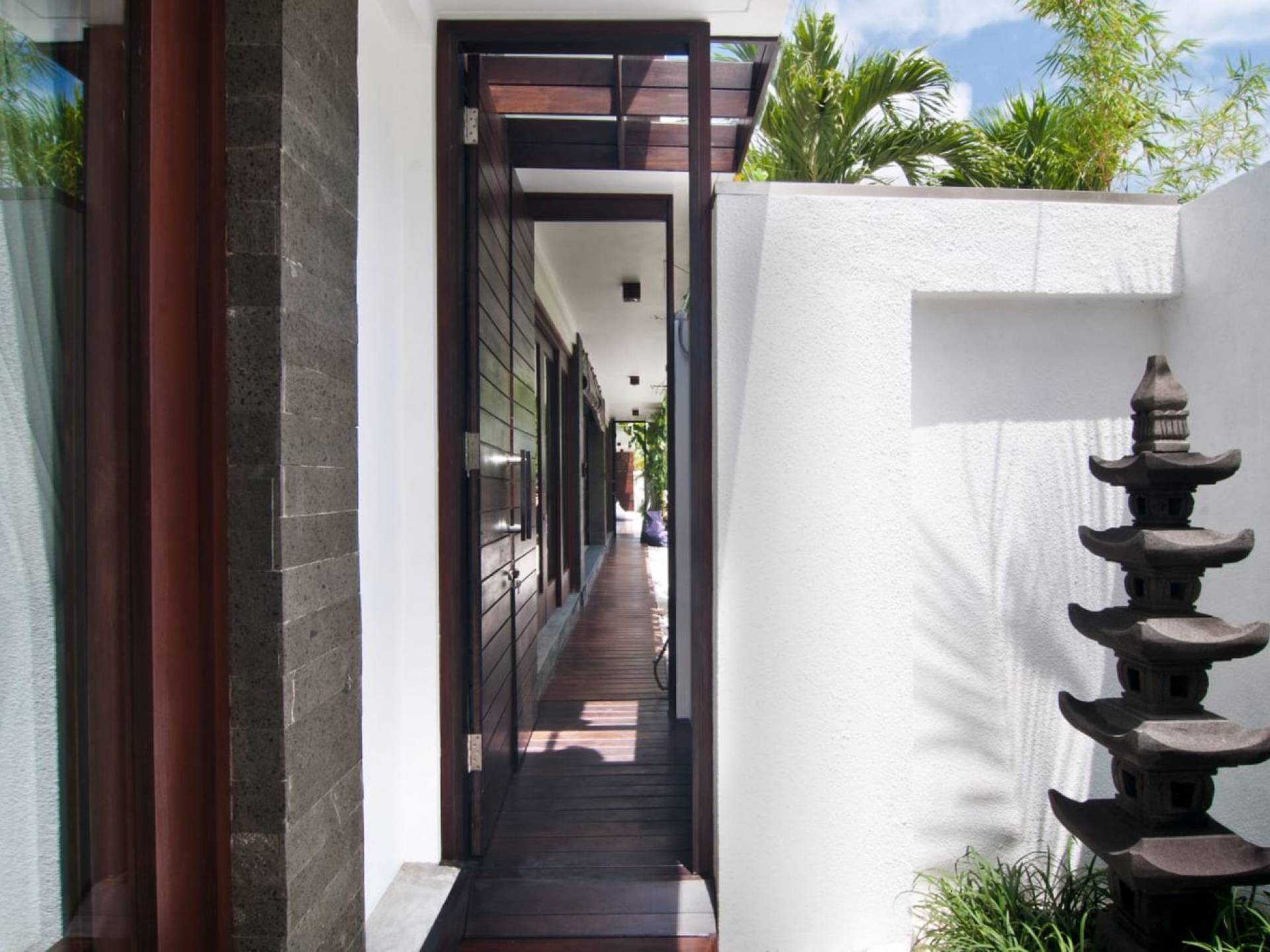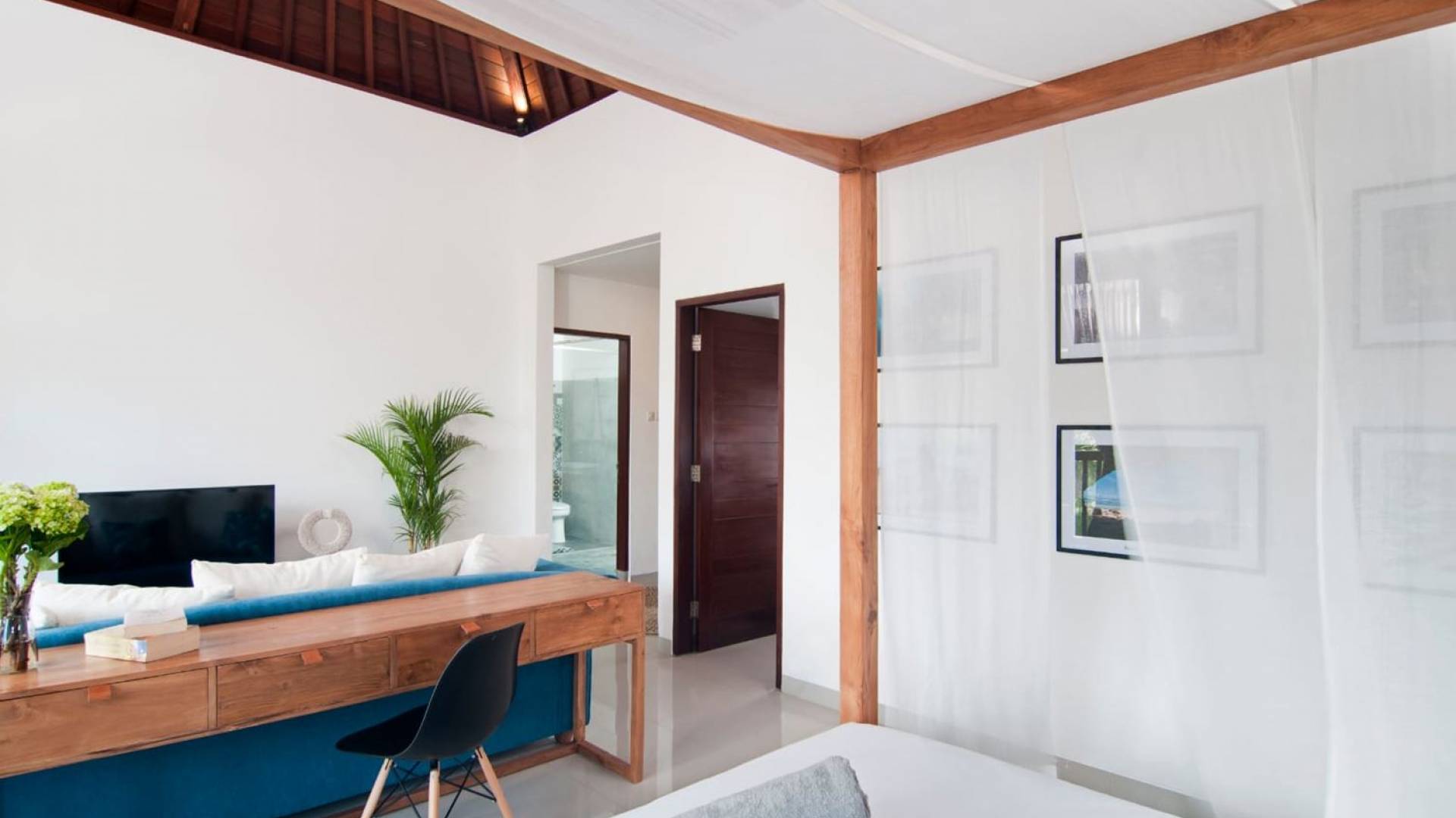 Villa Mason houses a total of 8 air-conditioned bedroom suites. Each master bedroom takes up the entire first floor and the two guest bedrooms are flanking the sides of the living room. Each of these bedrooms has its own private en-suite bathroom fitted with a hot/cold rain shower, a natural stone wash basin, and a toilet. The master suite features a traditional high-pitched timber rooftop and it is furnished with a king-size bed romantically draped in white curtains, a spacious wooden wardrobe closet, and a rattan sofa facing satellite TV. The bedroom opens up to a private balcony with a lovely view of the garden and pool down below. The two guest bedrooms are also furnished with king-size beds for a perfect night's sleep. In the morning, you can slide open the full-length glass doors to the garden and jump straight into the swimming pool if you wish. The guest bedrooms are also furnished with reading chairs and large wardrobe closets with dressing tables.