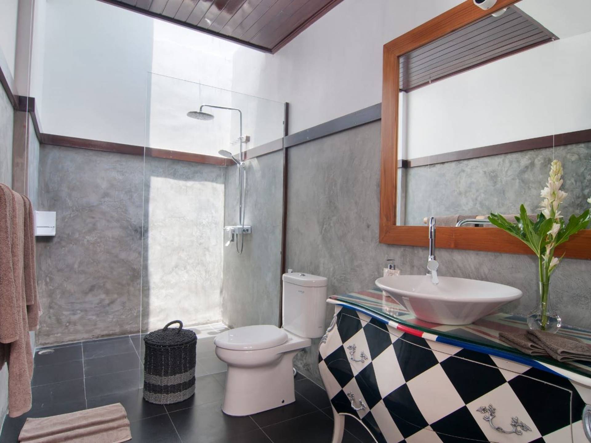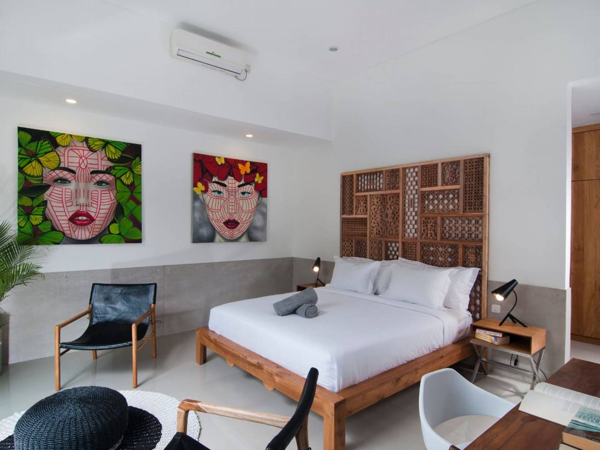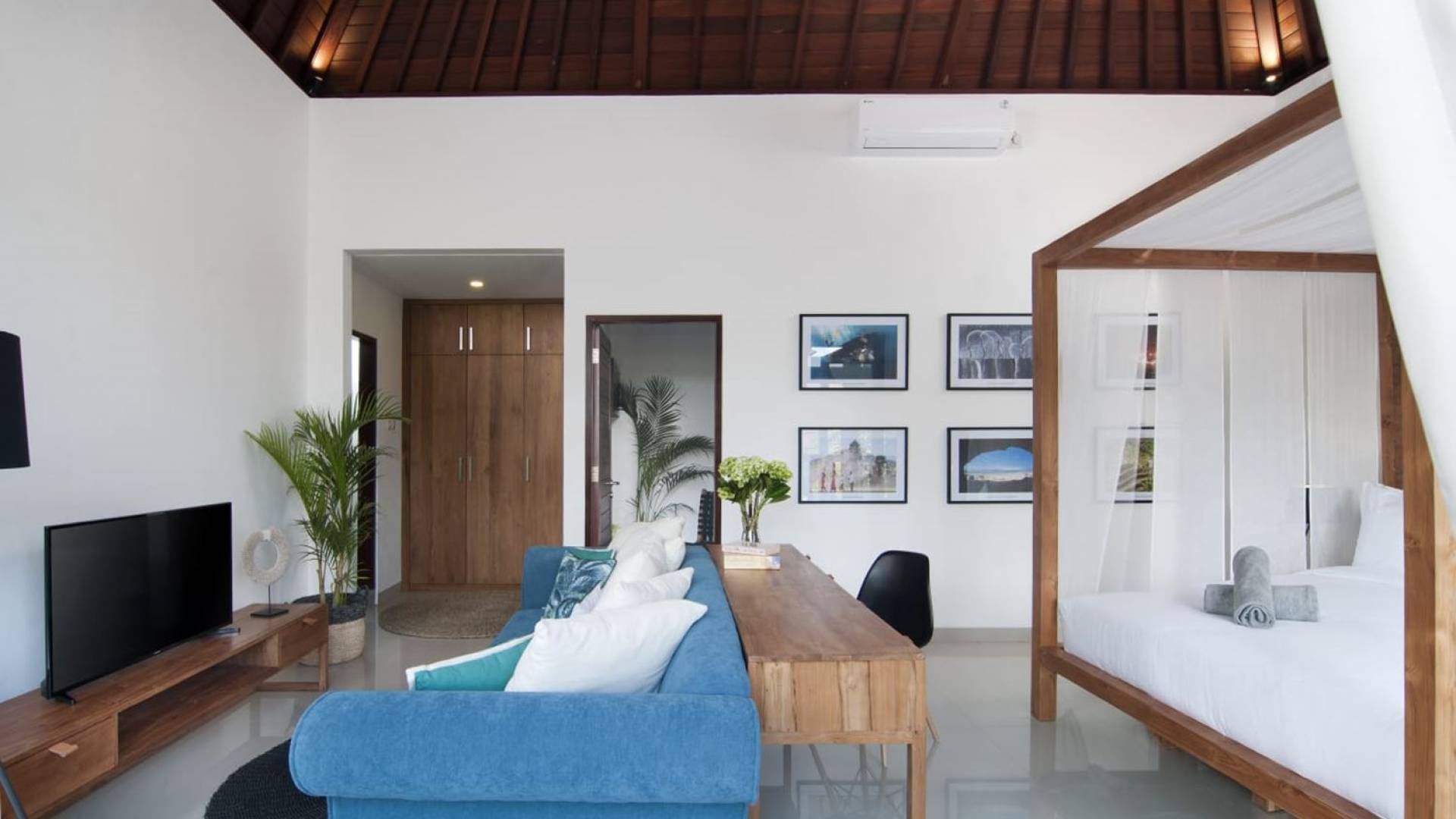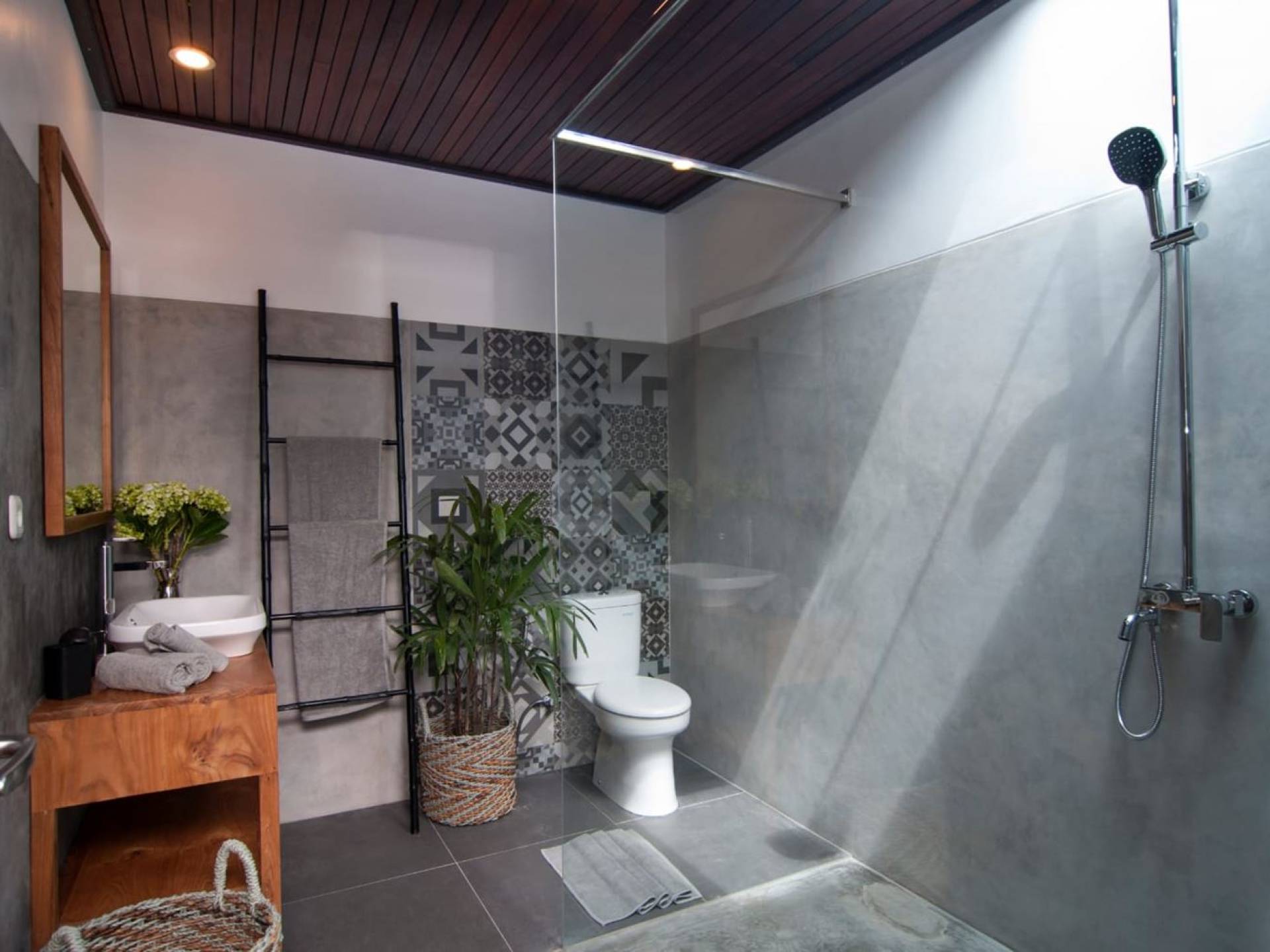 Villa Mason houses a total of 8 air-conditioned bedroom suites. Each master bedroom takes up the entire first floor and the two guest bedrooms are flanking the sides of the living room. Each of these bedrooms has its own private en-suite bathroom fitted with a hot/cold rain shower, a natural stone wash basin, and a toilet. The master suite features a traditional high-pitched timber rooftop and it is furnished with a king-size bed romantically draped in white curtains, a spacious wooden wardrobe closet, and a rattan sofa facing satellite TV. The bedroom opens up to a private balcony with a lovely view of the garden and pool down below. The two guest bedrooms are also furnished with king-size beds for a perfect night's sleep. In the morning, you can slide open the full-length glass doors to the garden and jump straight into the swimming pool if you wish. The guest bedrooms are also furnished with reading chairs and large wardrobe closets with dressing tables.