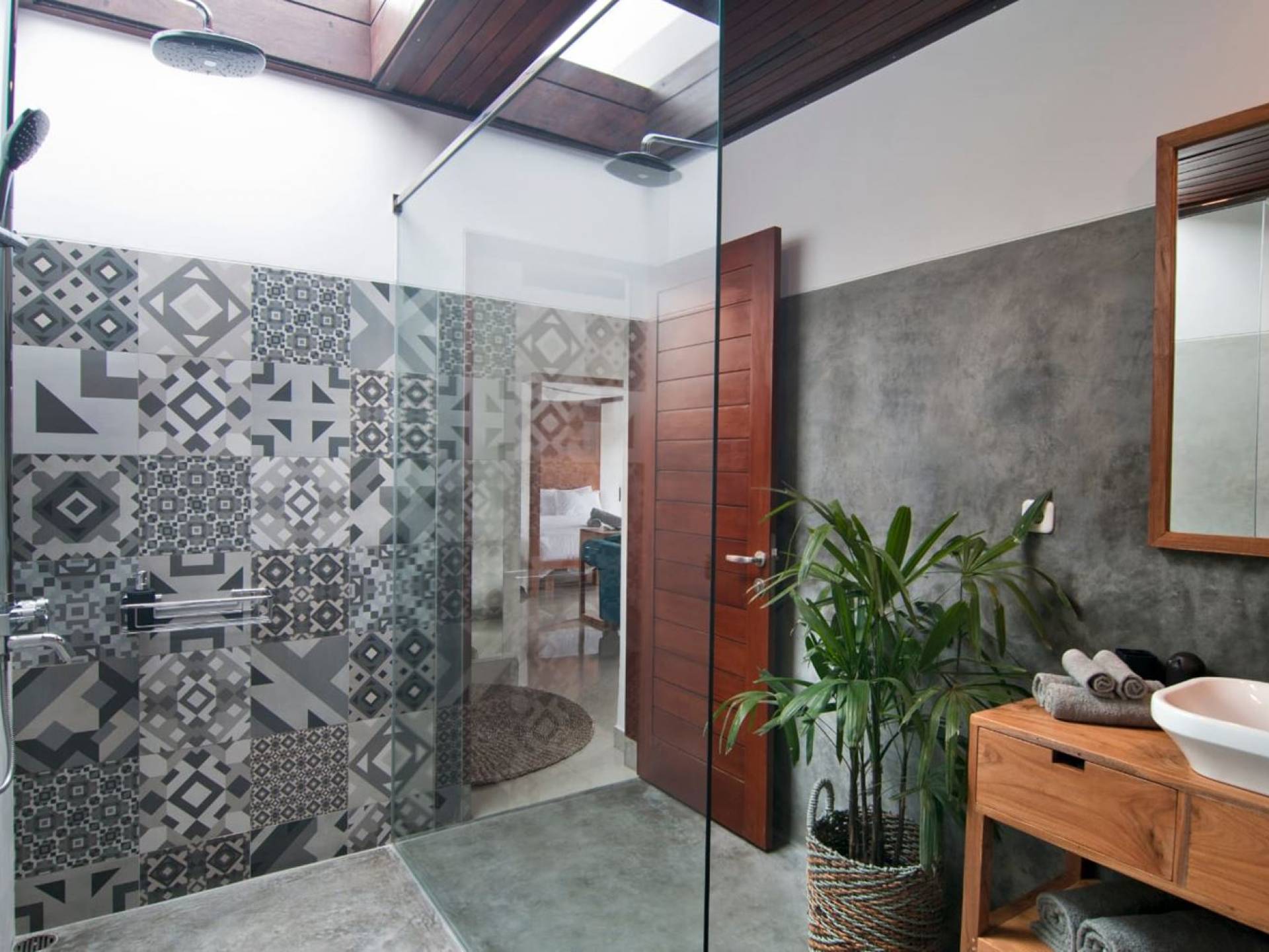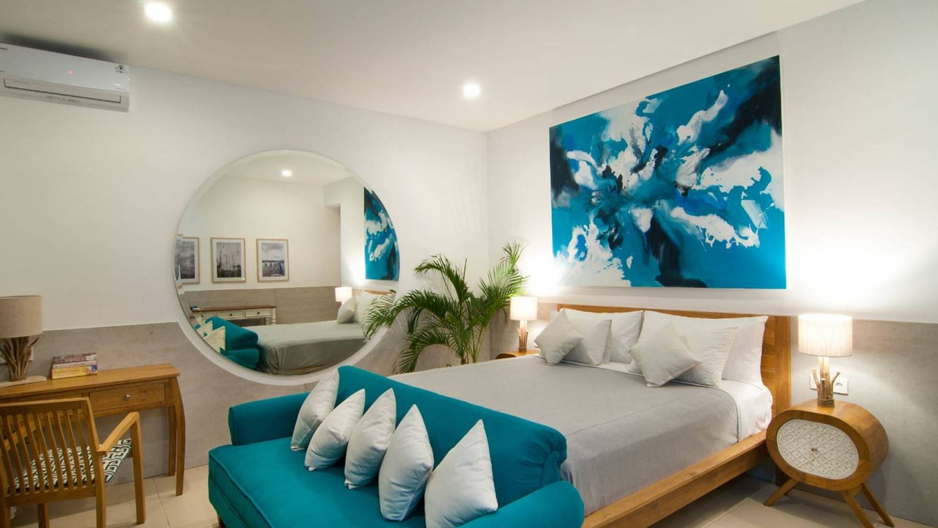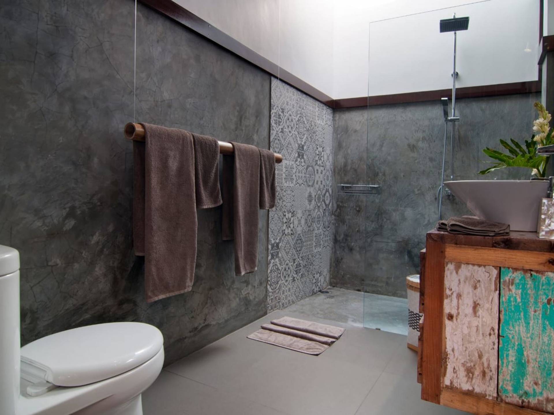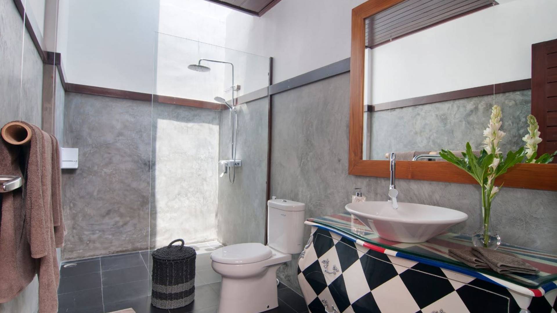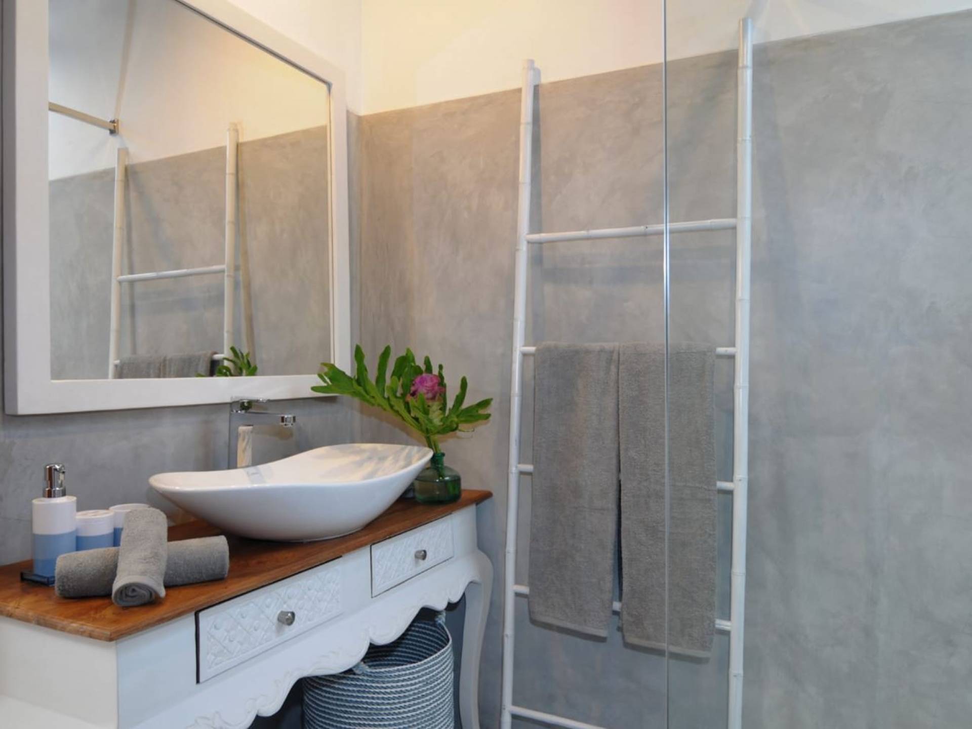 Villa Mason houses a total of 8 air-conditioned bedroom suites. Each master bedroom takes up the entire first floor and the two guest bedrooms are flanking the sides of the living room. Each of these bedrooms has its own private en-suite bathroom fitted with a hot/cold rain shower, a natural stone wash basin, and a toilet. The master suite features a traditional high-pitched timber rooftop and it is furnished with a king-size bed romantically draped in white curtains, a spacious wooden wardrobe closet, and a rattan sofa facing satellite TV. The bedroom opens up to a private balcony with a lovely view of the garden and pool down below. The two guest bedrooms are also furnished with king-size beds for a perfect night's sleep. In the morning, you can slide open the full-length glass doors to the garden and jump straight into the swimming pool if you wish. The guest bedrooms are also furnished with reading chairs and large wardrobe closets with dressing tables.
