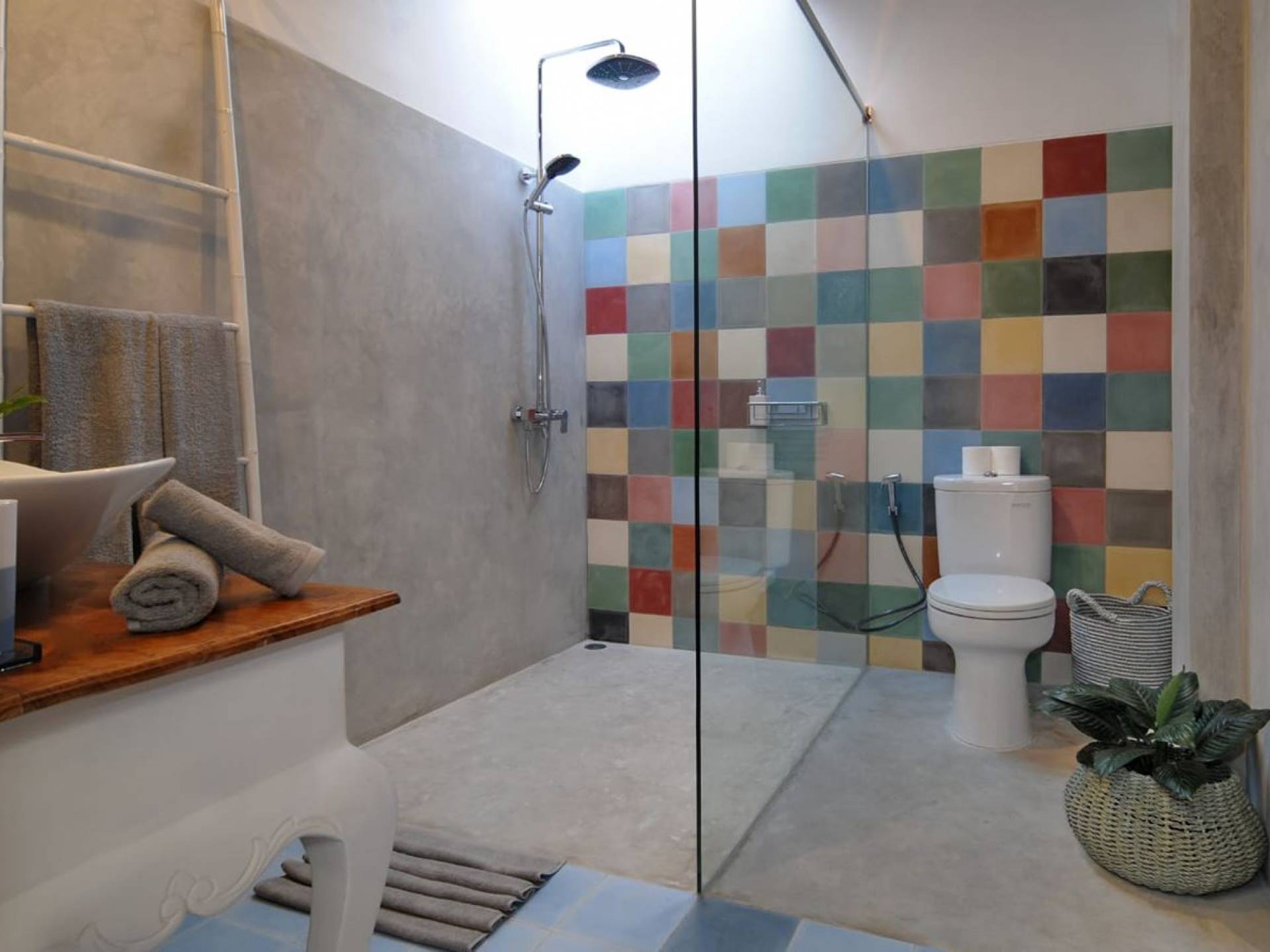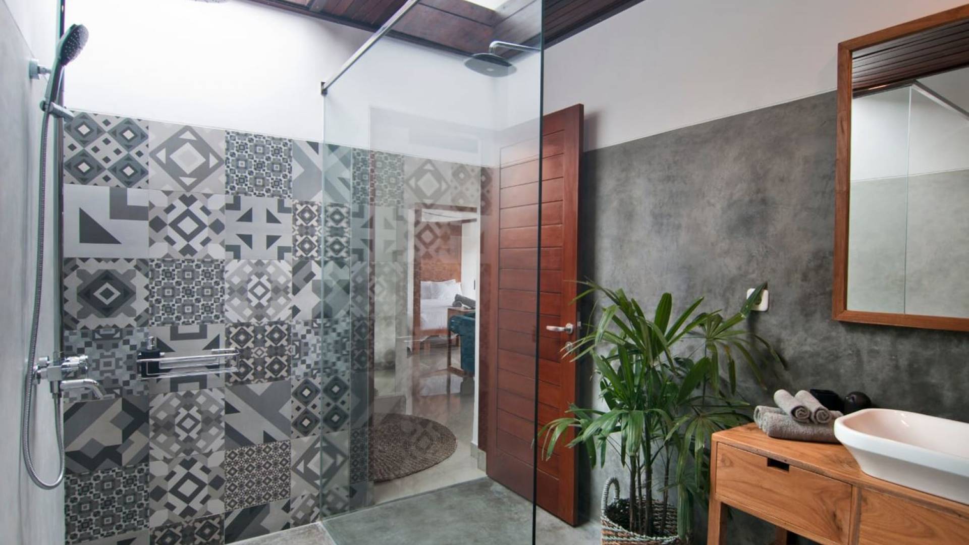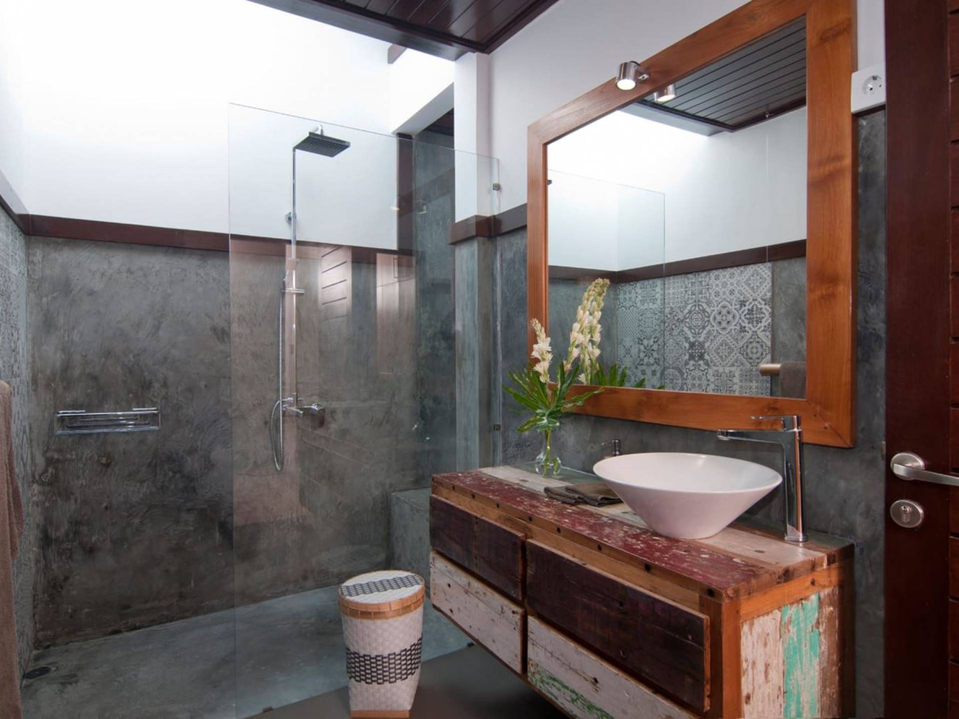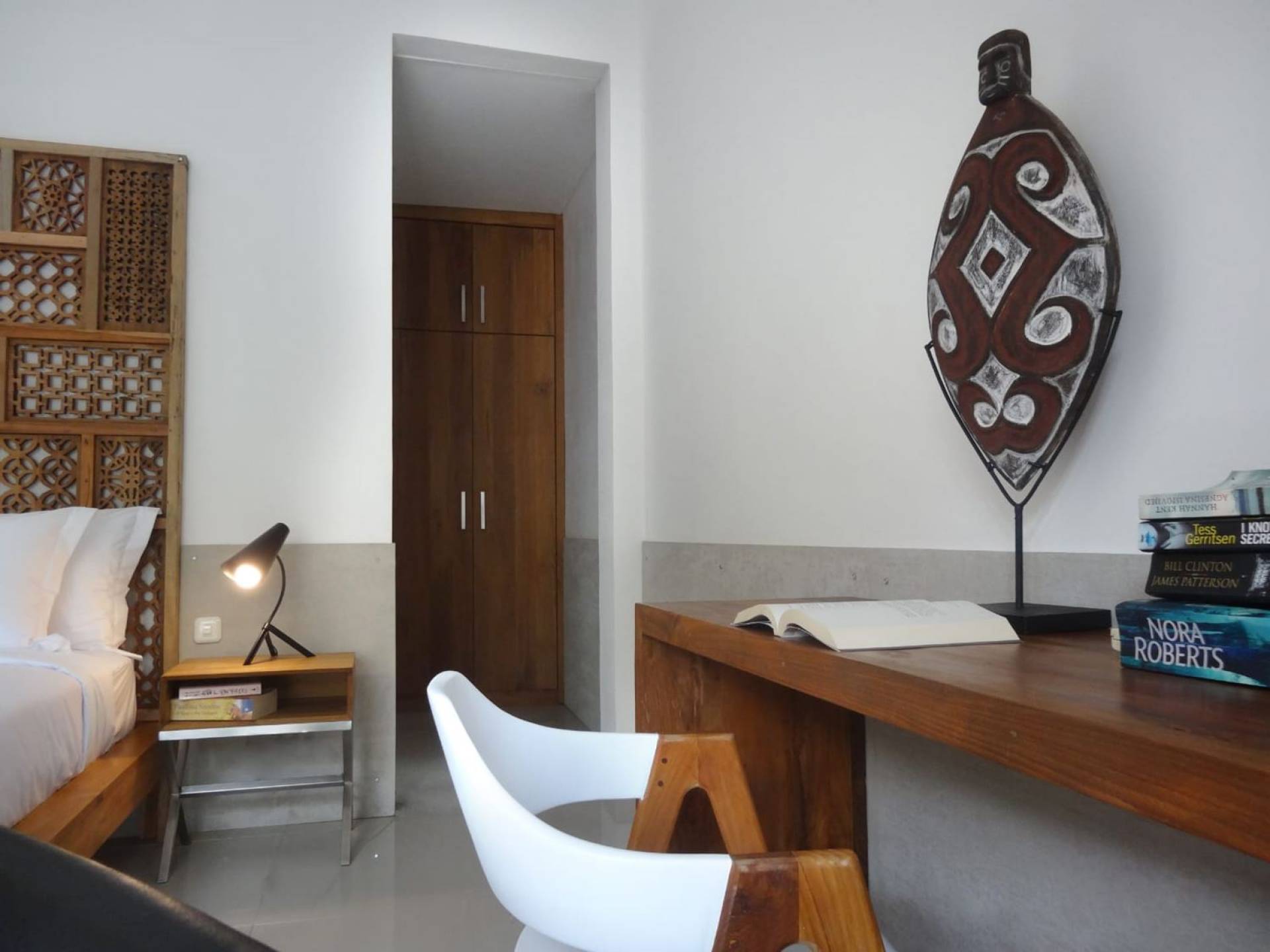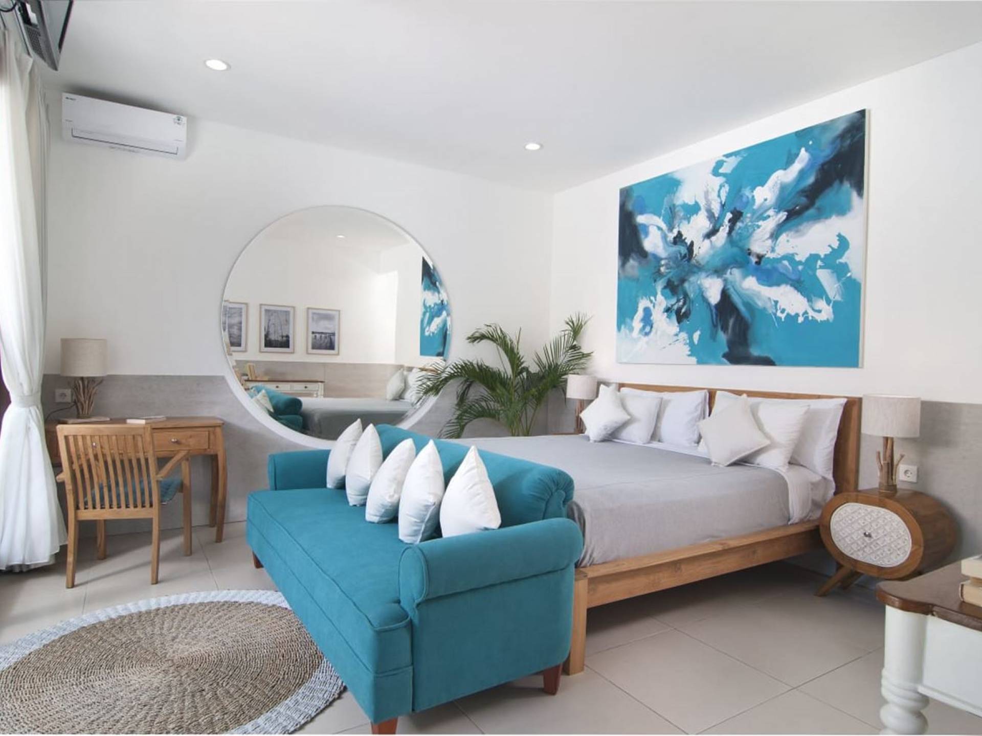 Villa Mason houses a total of 8 air-conditioned bedroom suites. Each master bedroom takes up the entire first floor and the two guest bedrooms are flanking the sides of the living room. Each of these bedrooms has its own private en-suite bathroom fitted with a hot/cold rain shower, a natural stone wash basin, and a toilet. The master suite features a traditional high-pitched timber rooftop and it is furnished with a king-size bed romantically draped in white curtains, a spacious wooden wardrobe closet, and a rattan sofa facing satellite TV. The bedroom opens up to a private balcony with a lovely view of the garden and pool down below. The two guest bedrooms are also furnished with king-size beds for a perfect night's sleep. In the morning, you can slide open the full-length glass doors to the garden and jump straight into the swimming pool if you wish. The guest bedrooms are also furnished with reading chairs and large wardrobe closets with dressing tables.
