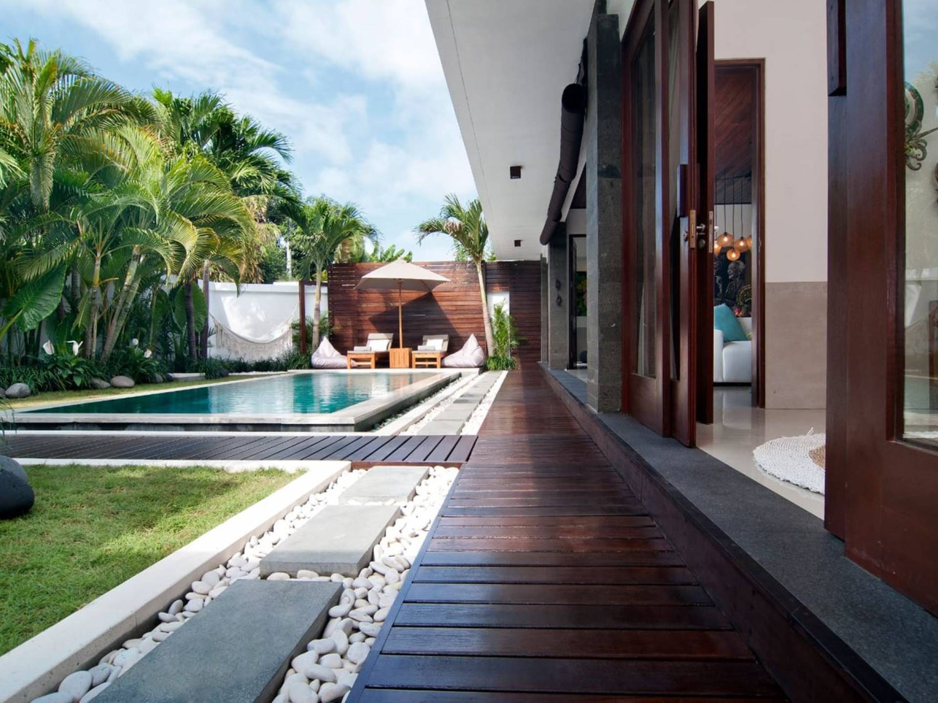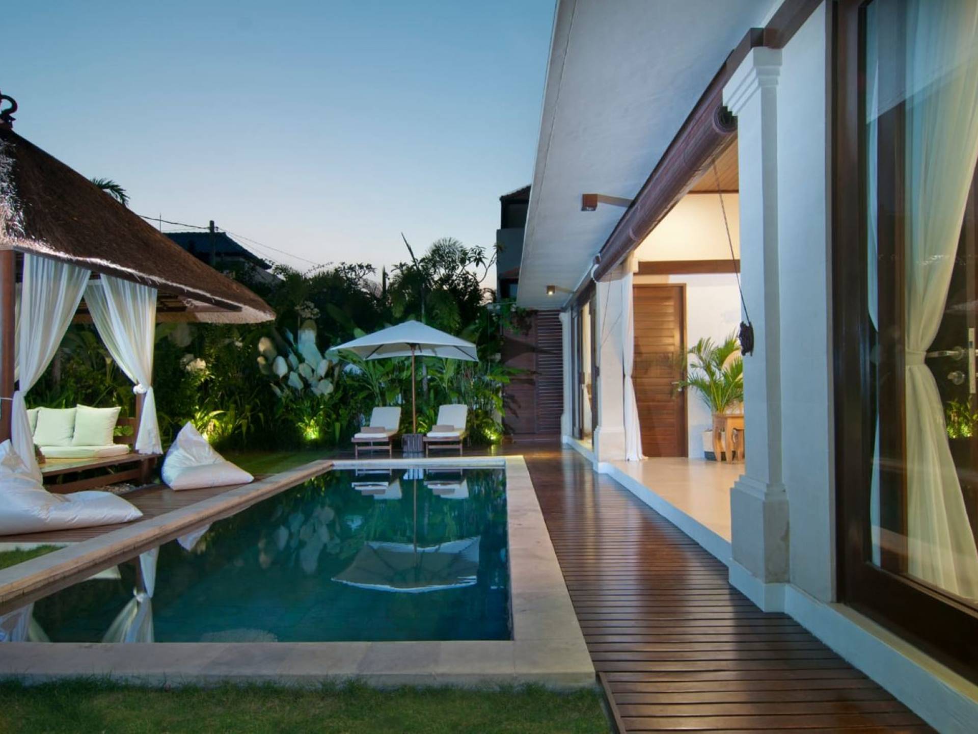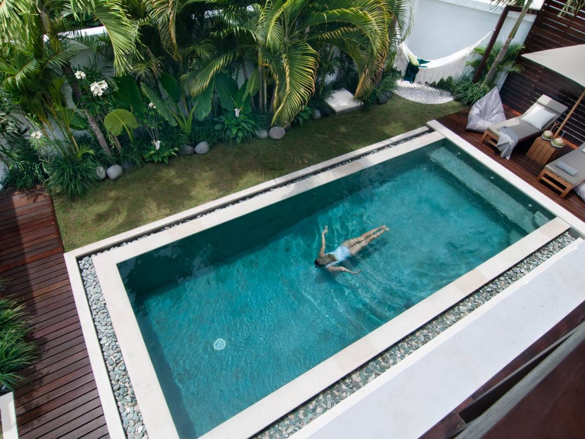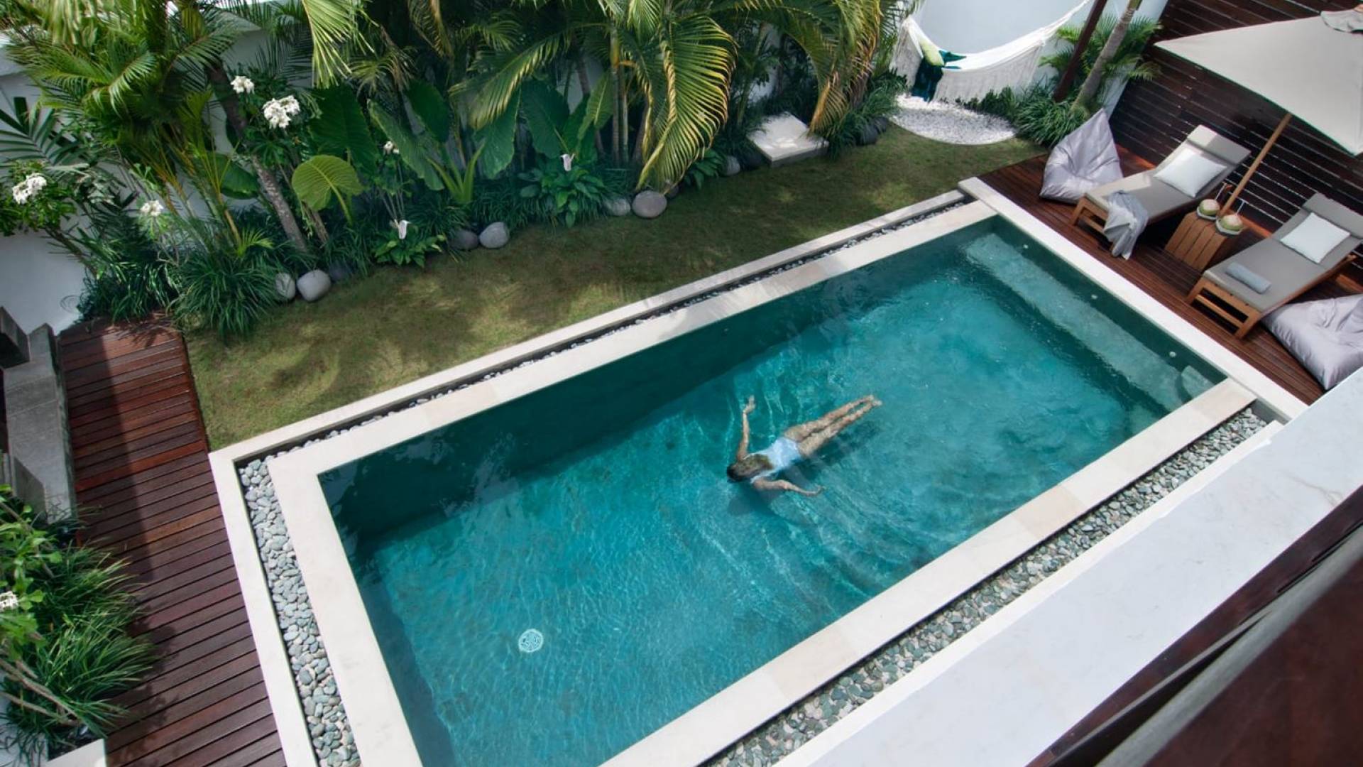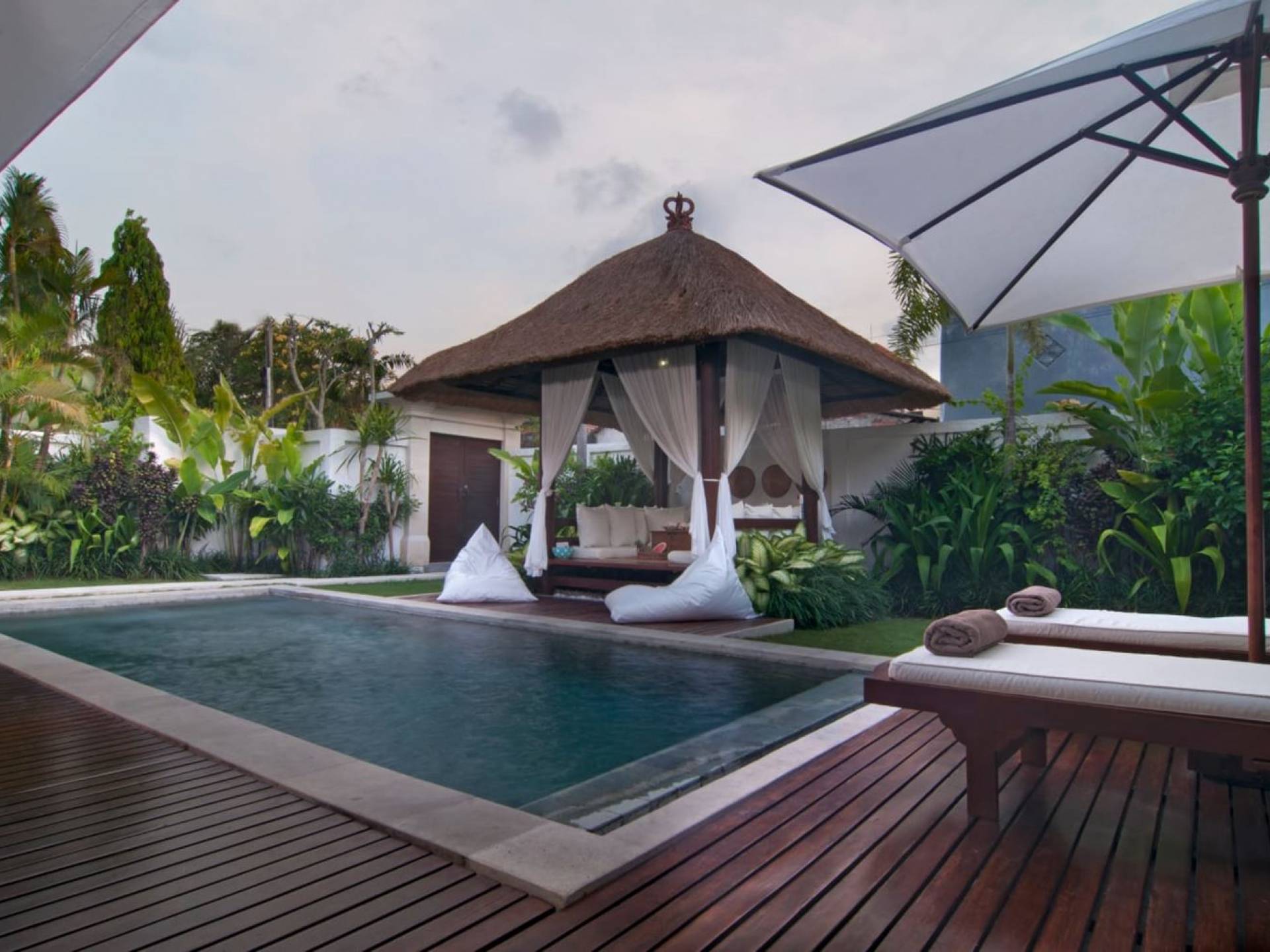 The living space features a timber rooftop equipped with a ceiling fan to provide that extra breeze. The interior design is ruled by gorgeous teak furniture, tropical plants, and tribal artwork. On one side stands a Balinese daybed-style sofa, facing a flat-screen TV with satellite channels and a DVD player. Behind it stands a timber dining table accompanied by 6 stylish designers chairs. The open kitchen is equipped with more than needed, including an oven, fridge, pots & pans, a microwave, water heater, a blender, and a toaster. The kitchen also features a bar and 3 stools to sit and have coffee in the morning or at any time of the day. The garden has all the features of a tropical oasis with plants and trees growing lushly around the inviting natural tiled swimming pool. At one end, guests can sunbathe on the two reclining chairs and if the heat gets too much for you, simply open the parasol to create a nice shady spot to read a book or take a little daytime nap.