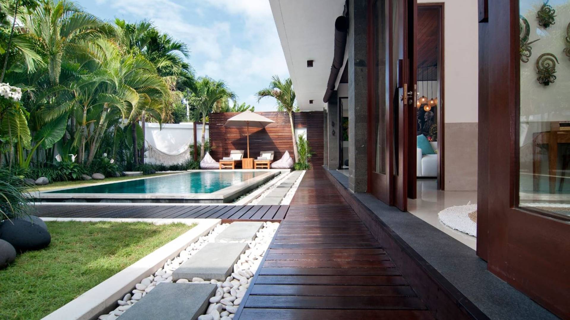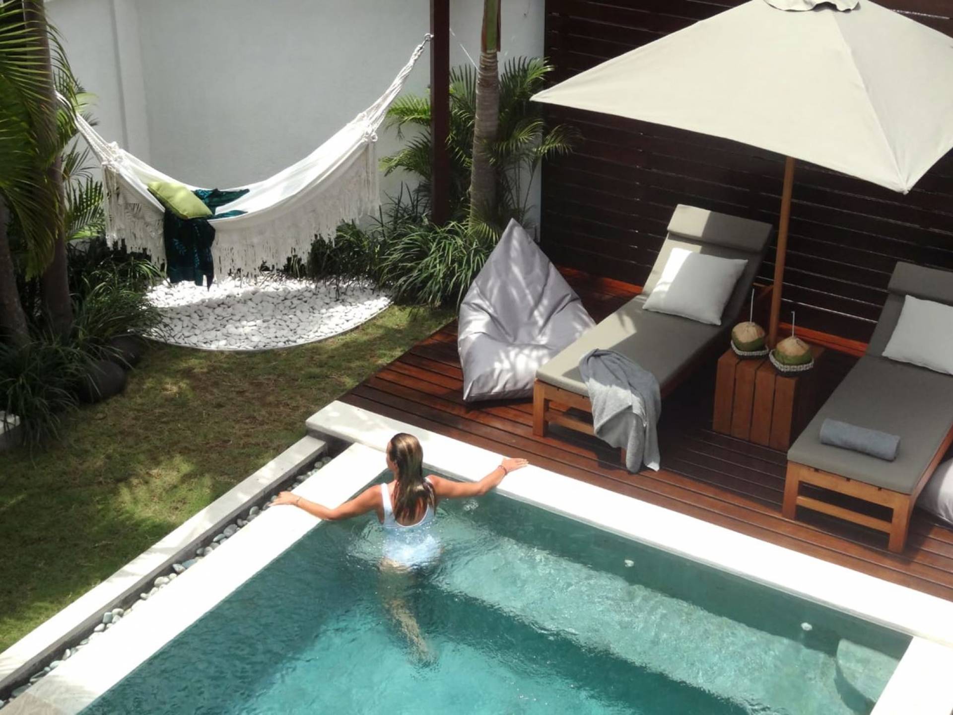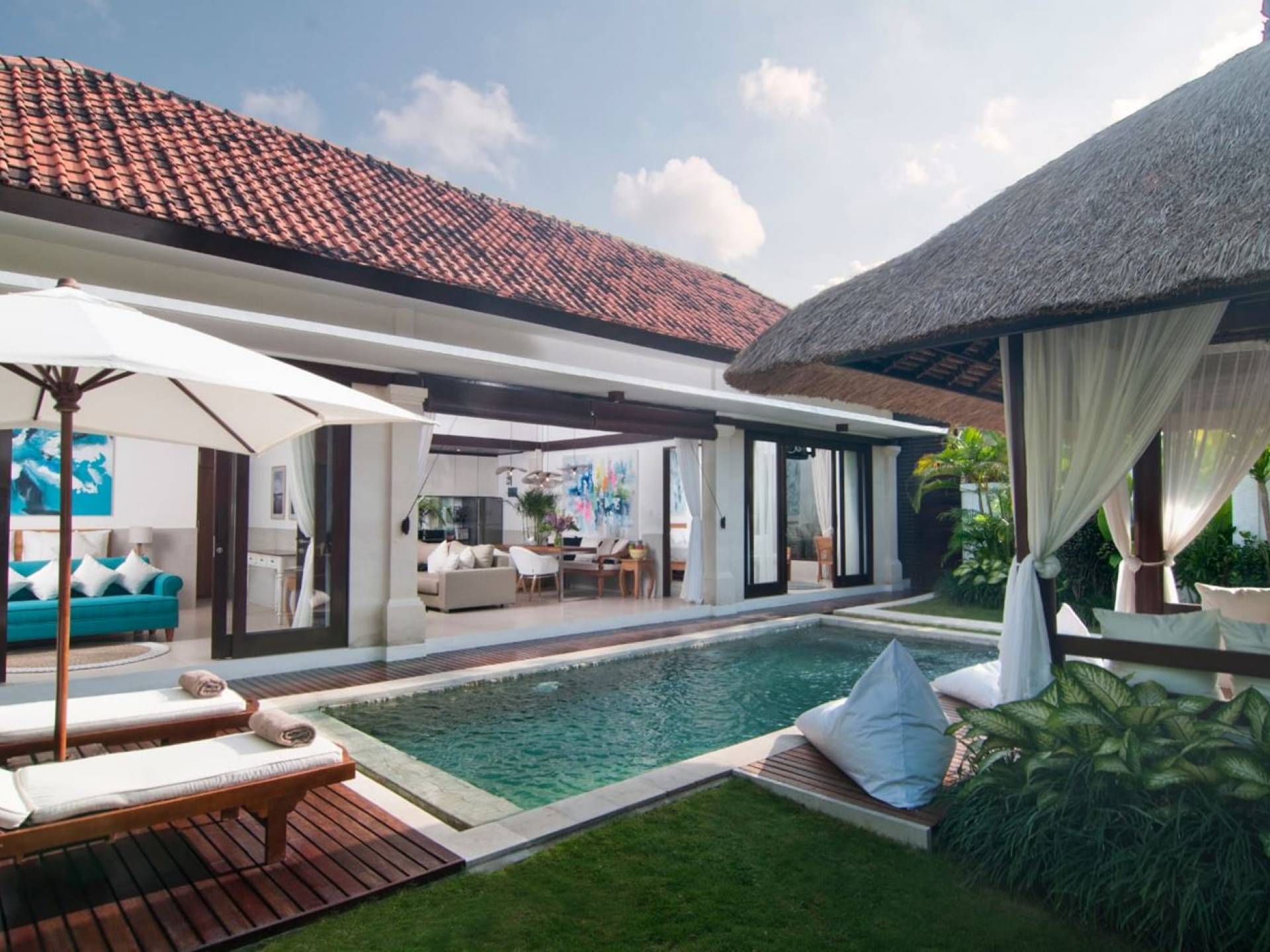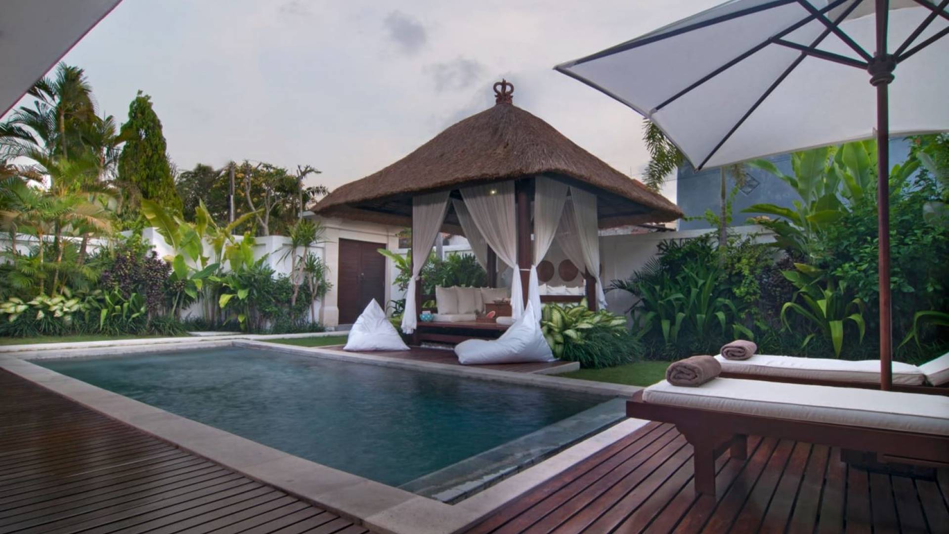 The living space features a timber rooftop equipped with a ceiling fan to provide that extra breeze. The interior design is ruled by gorgeous teak furniture, tropical plants, and tribal artwork. On one side stands a Balinese daybed-style sofa, facing a flat-screen TV with satellite channels and a DVD player. Behind it stands a timber dining table accompanied by 6 stylish designers chairs. The open kitchen is equipped with more than needed, including an oven, fridge, pots & pans, a microwave, water heater, a blender, and a toaster. The kitchen also features a bar and 3 stools to sit and have coffee in the morning or at any time of the day. The garden has all the features of a tropical oasis with plants and trees growing lushly around the inviting natural tiled swimming pool. At one end, guests can sunbathe on the two reclining chairs and if the heat gets too much for you, simply open the parasol to create a nice shady spot to read a book or take a little daytime nap.
