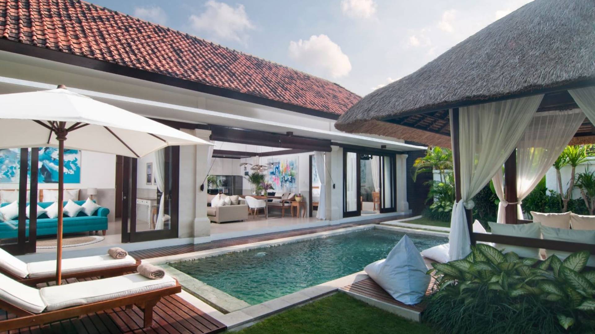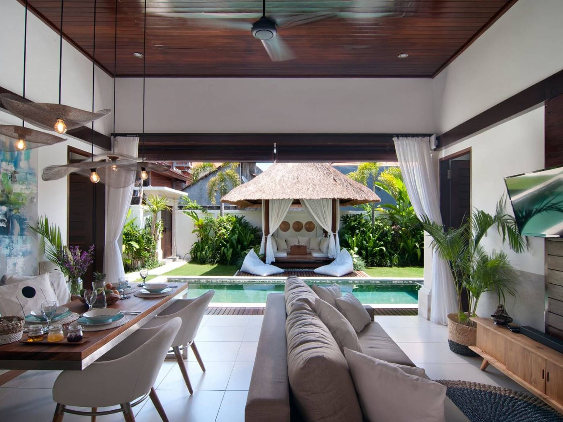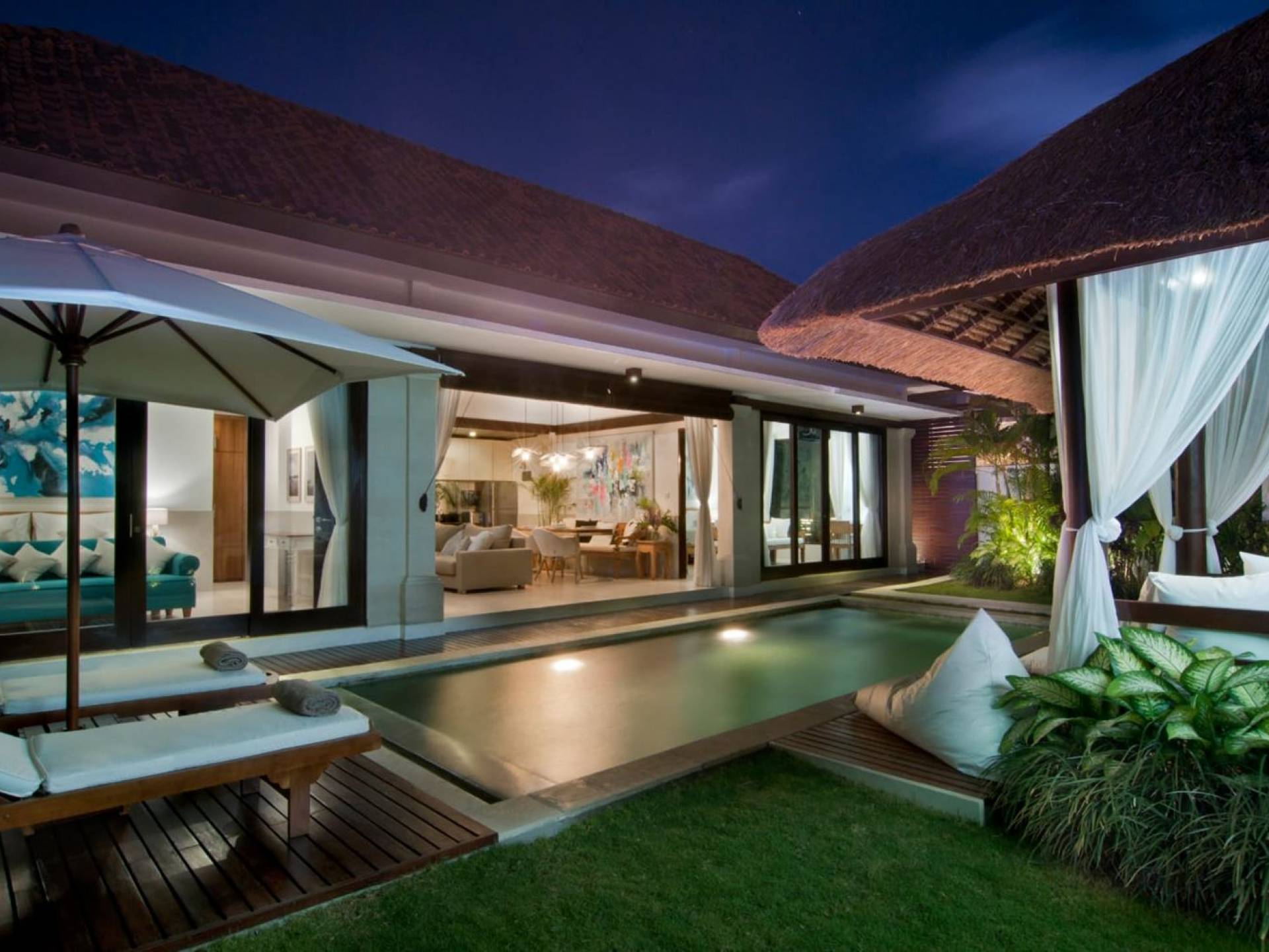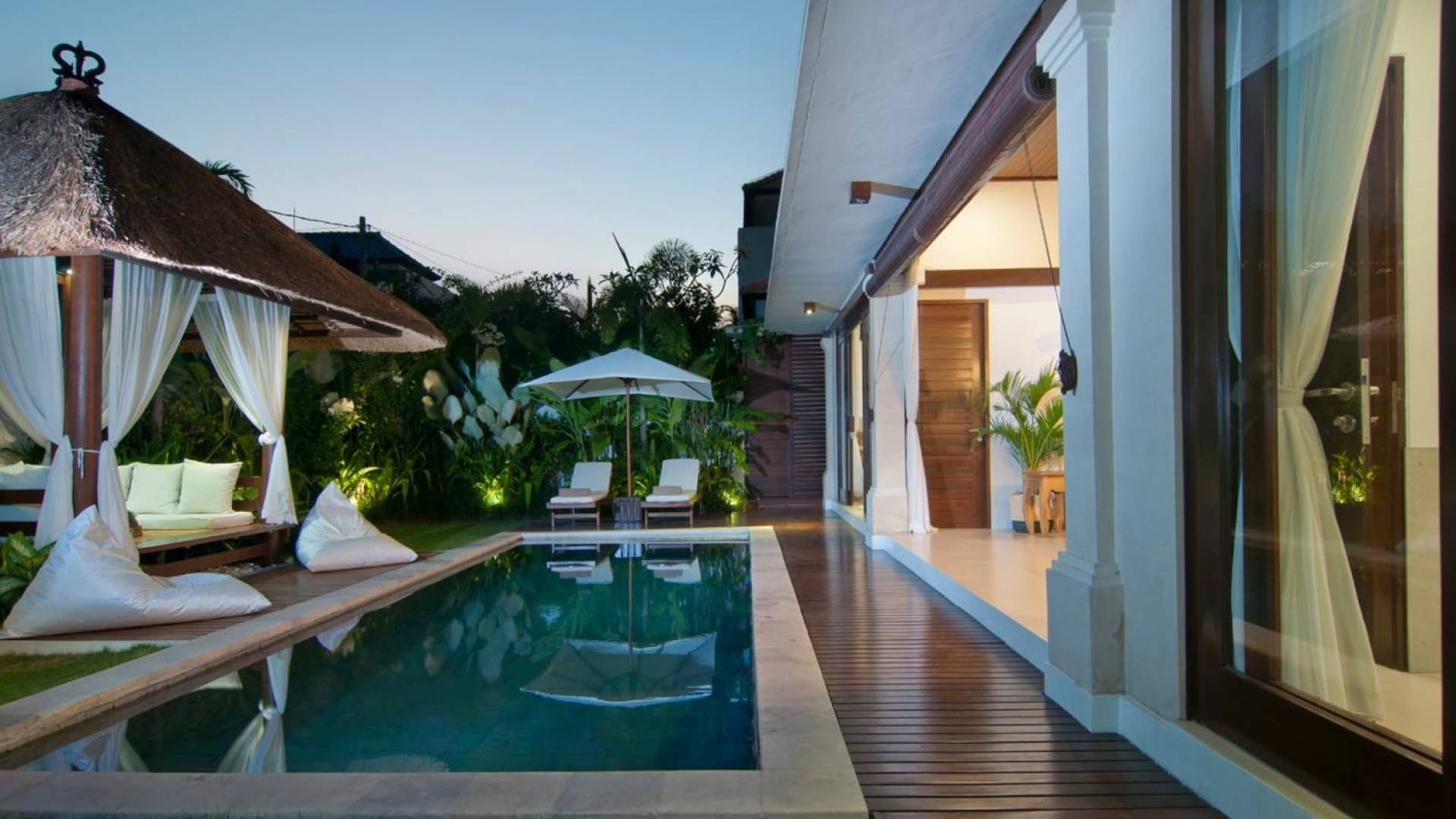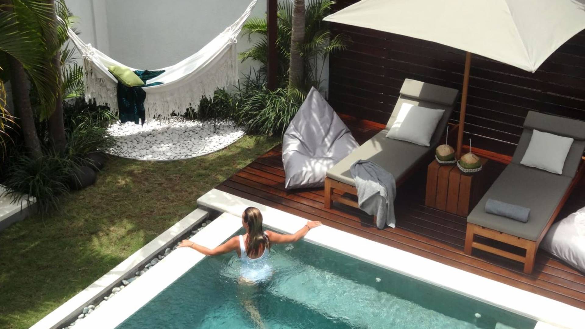 The living space features a timber rooftop equipped with a ceiling fan to provide that extra breeze. The interior design is ruled by gorgeous teak furniture, tropical plants, and tribal artwork. On one side stands a Balinese daybed-style sofa, facing a flat-screen TV with satellite channels and a DVD player. Behind it stands a timber dining table accompanied by 6 stylish designers chairs. The open kitchen is equipped with more than needed, including an oven, fridge, pots & pans, a microwave, water heater, a blender, and a toaster. The kitchen also features a bar and 3 stools to sit and have coffee in the morning or at any time of the day. The garden has all the features of a tropical oasis with plants and trees growing lushly around the inviting natural tiled swimming pool. At one end, guests can sunbathe on the two reclining chairs and if the heat gets too much for you, simply open the parasol to create a nice shady spot to read a book or take a little daytime nap.