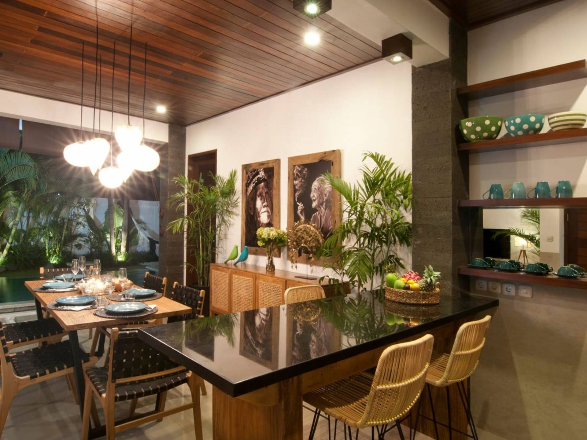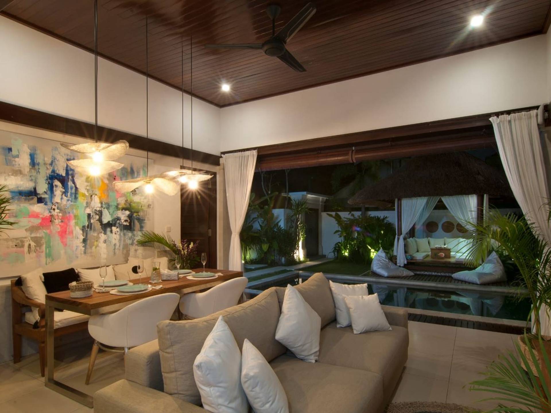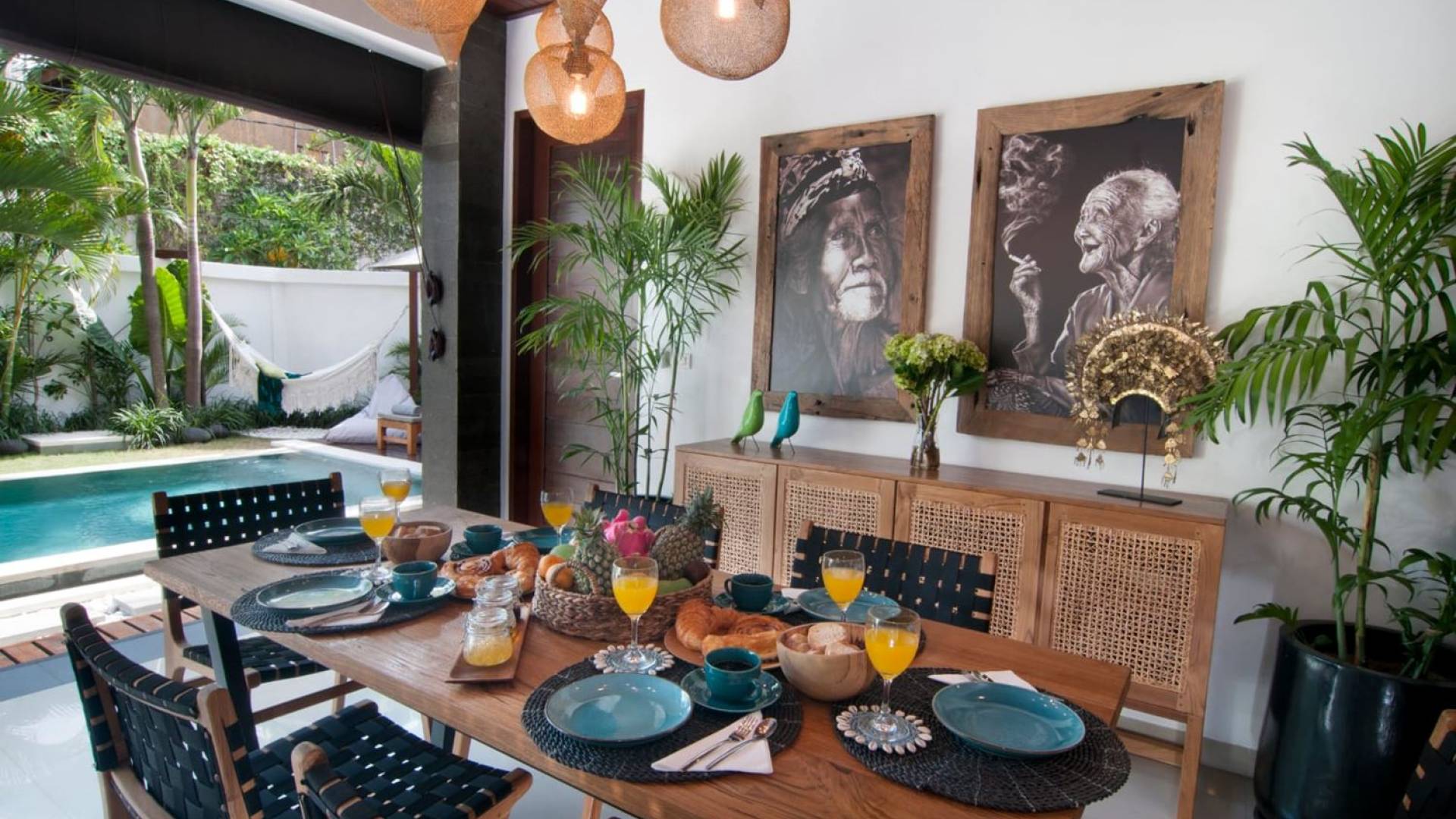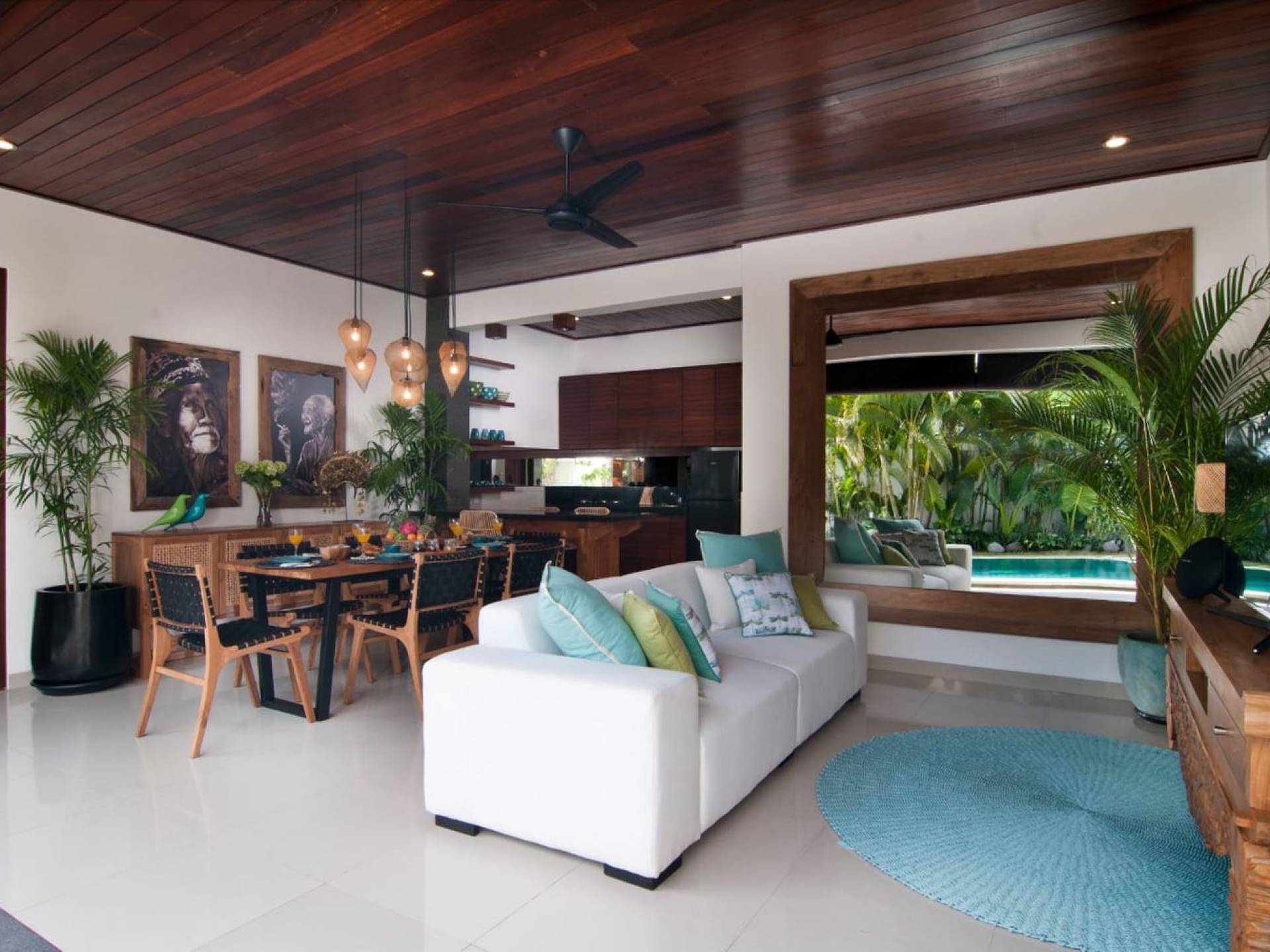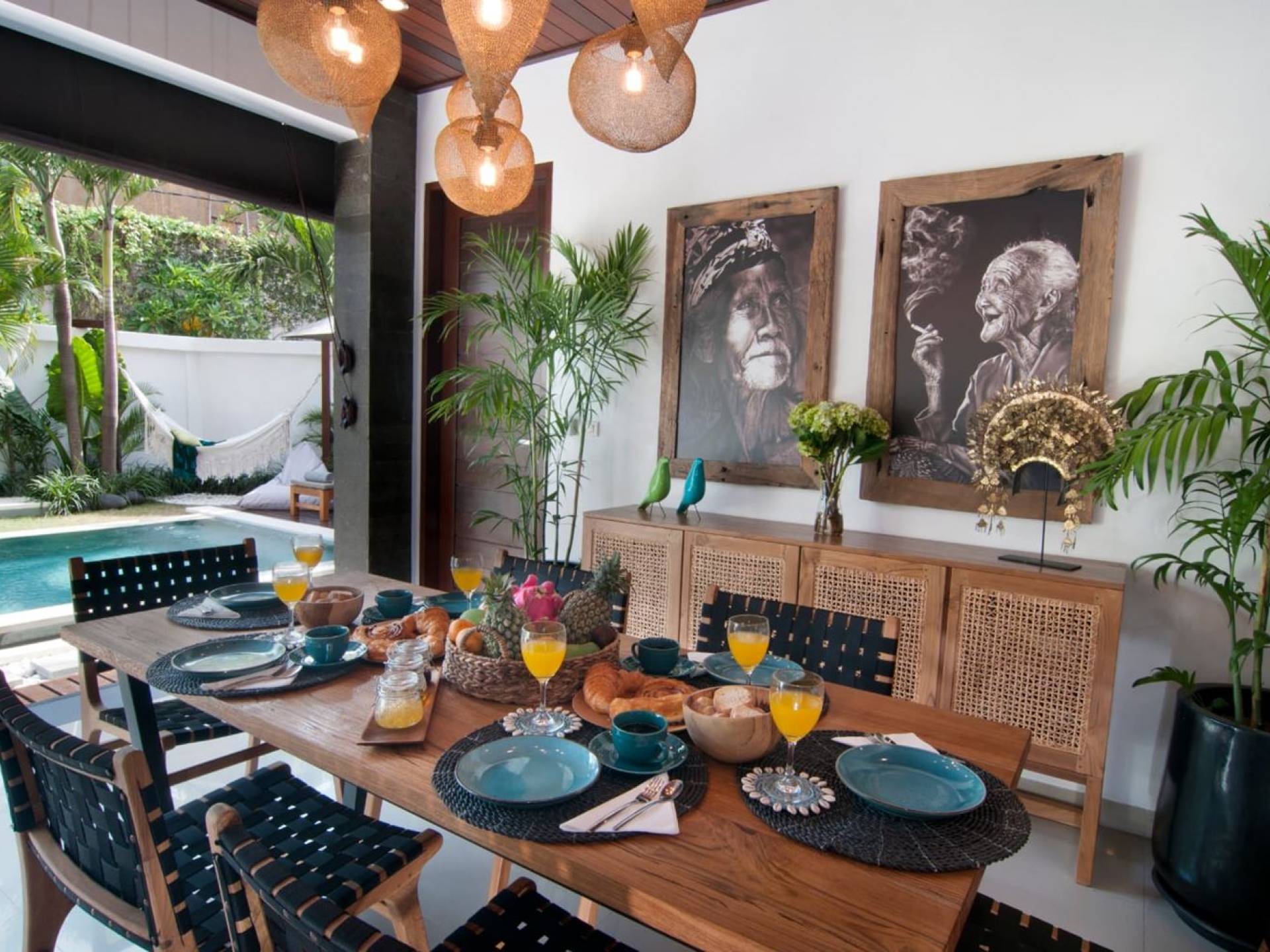 The living space features a timber rooftop equipped with a ceiling fan to provide that extra breeze. The interior design is ruled by gorgeous teak furniture, tropical plants, and tribal artwork. On one side stands a Balinese daybed-style sofa, facing a flat-screen TV with satellite channels and a DVD player. Behind it stands a timber dining table accompanied by 6 stylish designers chairs. The open kitchen is equipped with more than needed, including an oven, fridge, pots & pans, a microwave, water heater, a blender, and a toaster. The kitchen also features a bar and 3 stools to sit and have coffee in the morning or at any time of the day. The garden has all the features of a tropical oasis with plants and trees growing lushly around the inviting natural tiled swimming pool. At one end, guests can sunbathe on the two reclining chairs and if the heat gets too much for you, simply open the parasol to create a nice shady spot to read a book or take a little daytime nap.