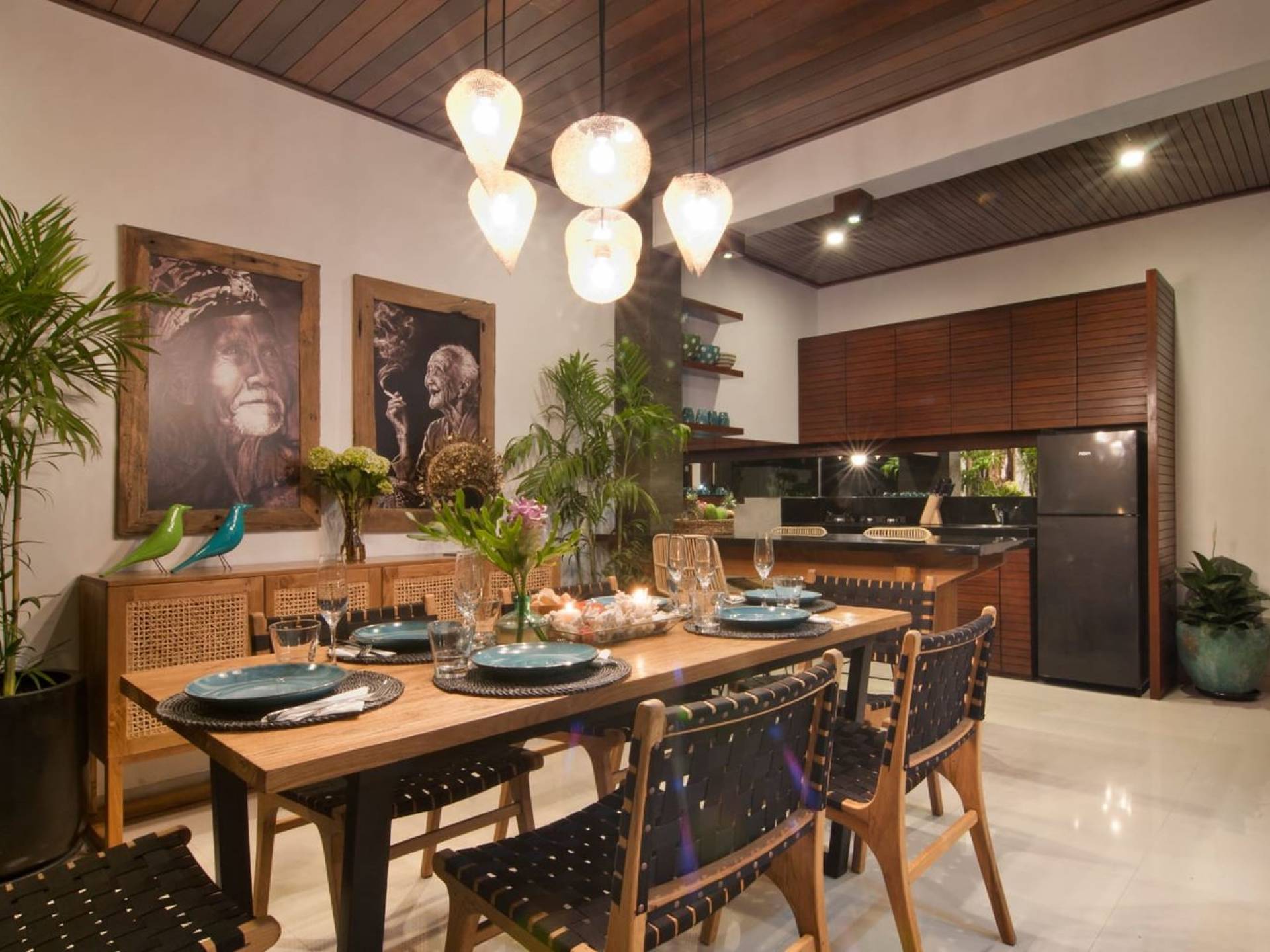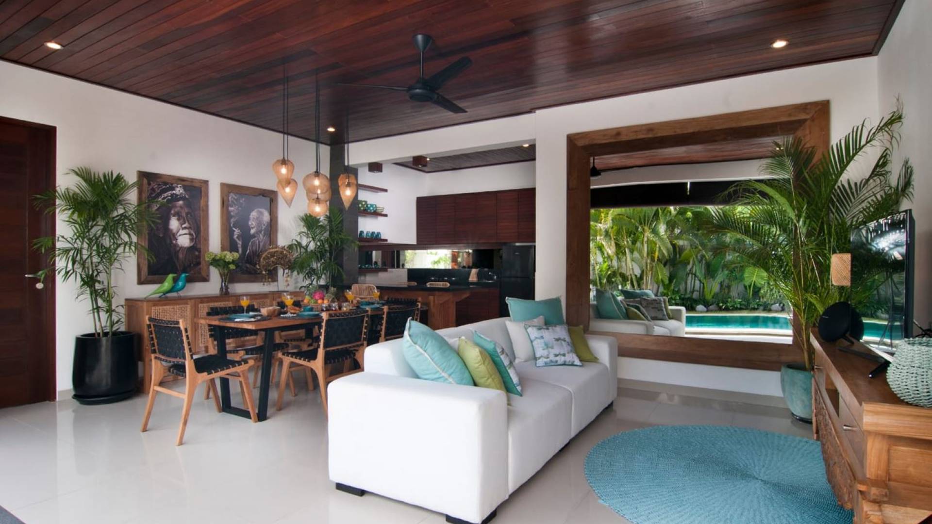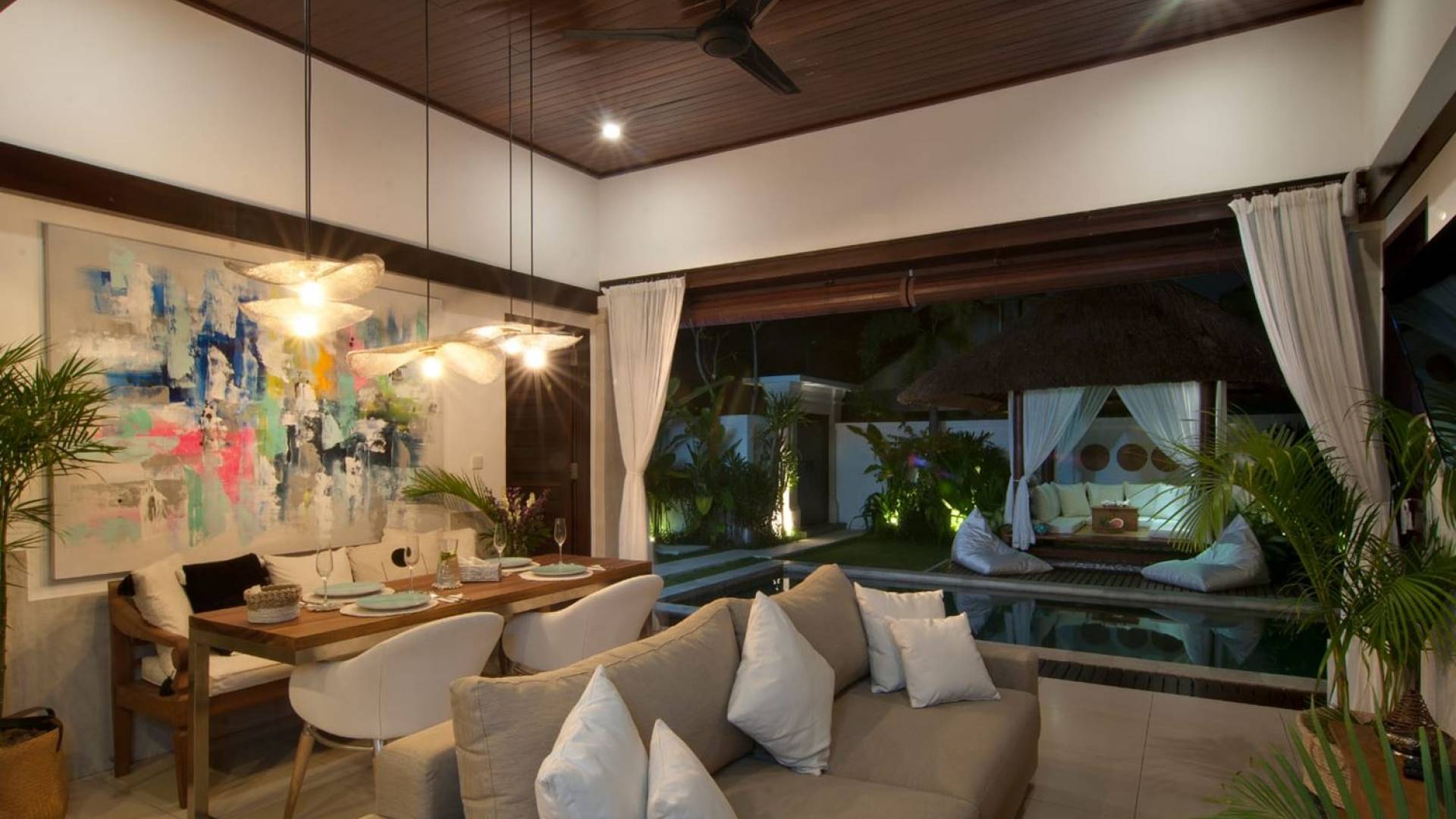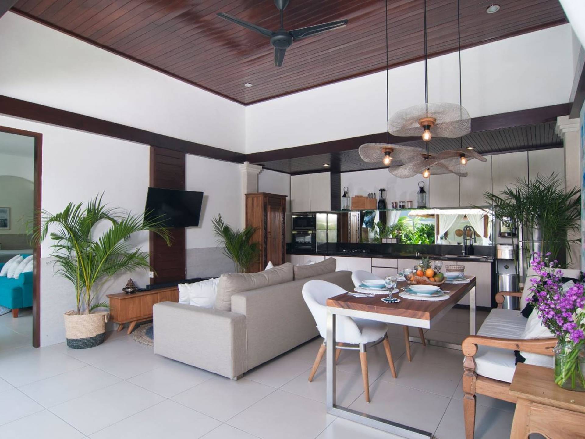 The living space features a timber rooftop equipped with a ceiling fan to provide that extra breeze. The interior design is ruled by gorgeous teak furniture, tropical plants, and tribal artwork. On one side stands a Balinese daybed-style sofa, facing a flat-screen TV with satellite channels and a DVD player. Behind it stands a timber dining table accompanied by 6 stylish designers chairs. The open kitchen is equipped with more than needed, including an oven, fridge, pots & pans, a microwave, water heater, a blender, and a toaster. The kitchen also features a bar and 3 stools to sit and have coffee in the morning or at any time of the day. The garden has all the features of a tropical oasis with plants and trees growing lushly around the inviting natural tiled swimming pool. At one end, guests can sunbathe on the two reclining chairs and if the heat gets too much for you, simply open the parasol to create a nice shady spot to read a book or take a little daytime nap.