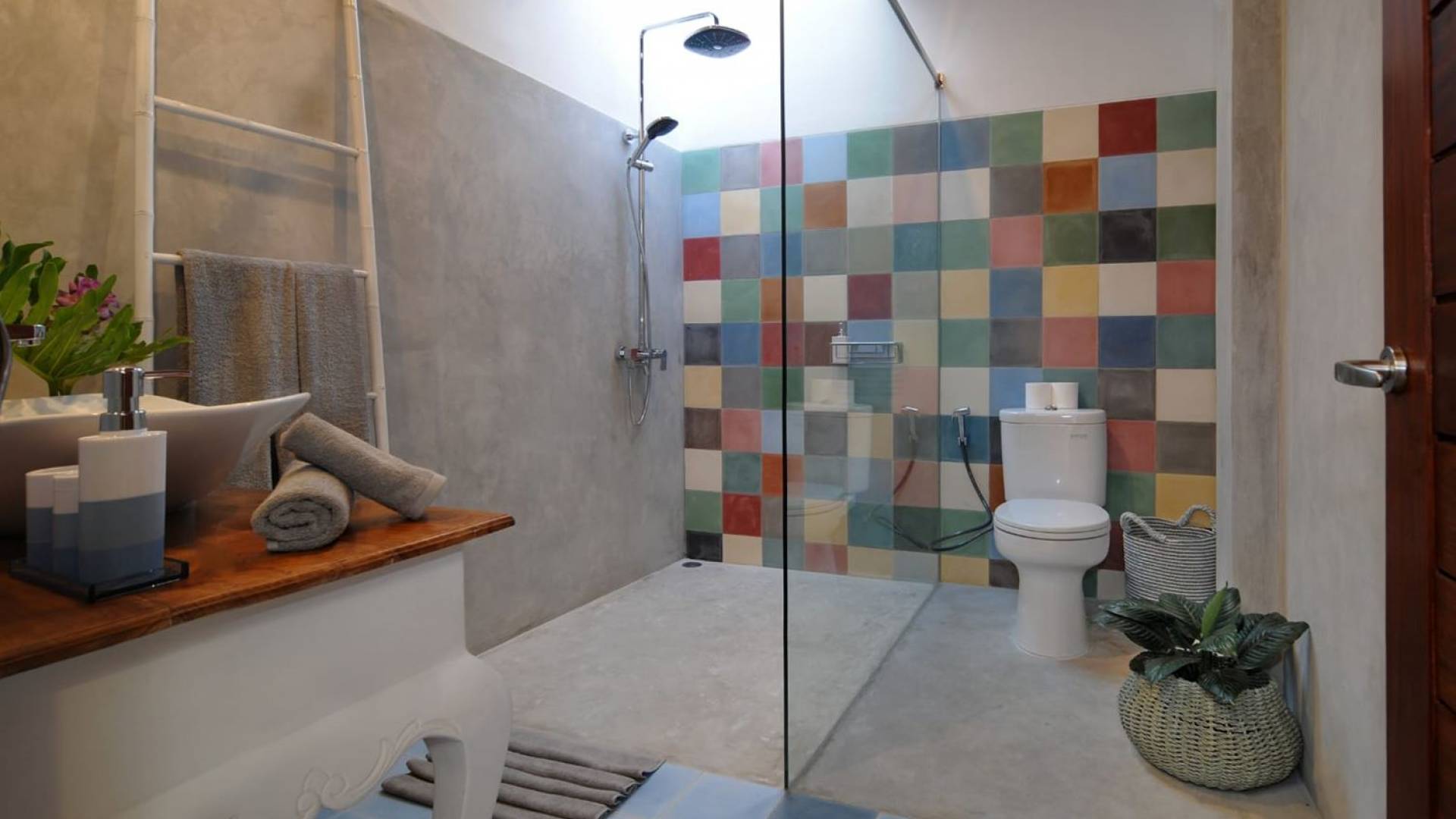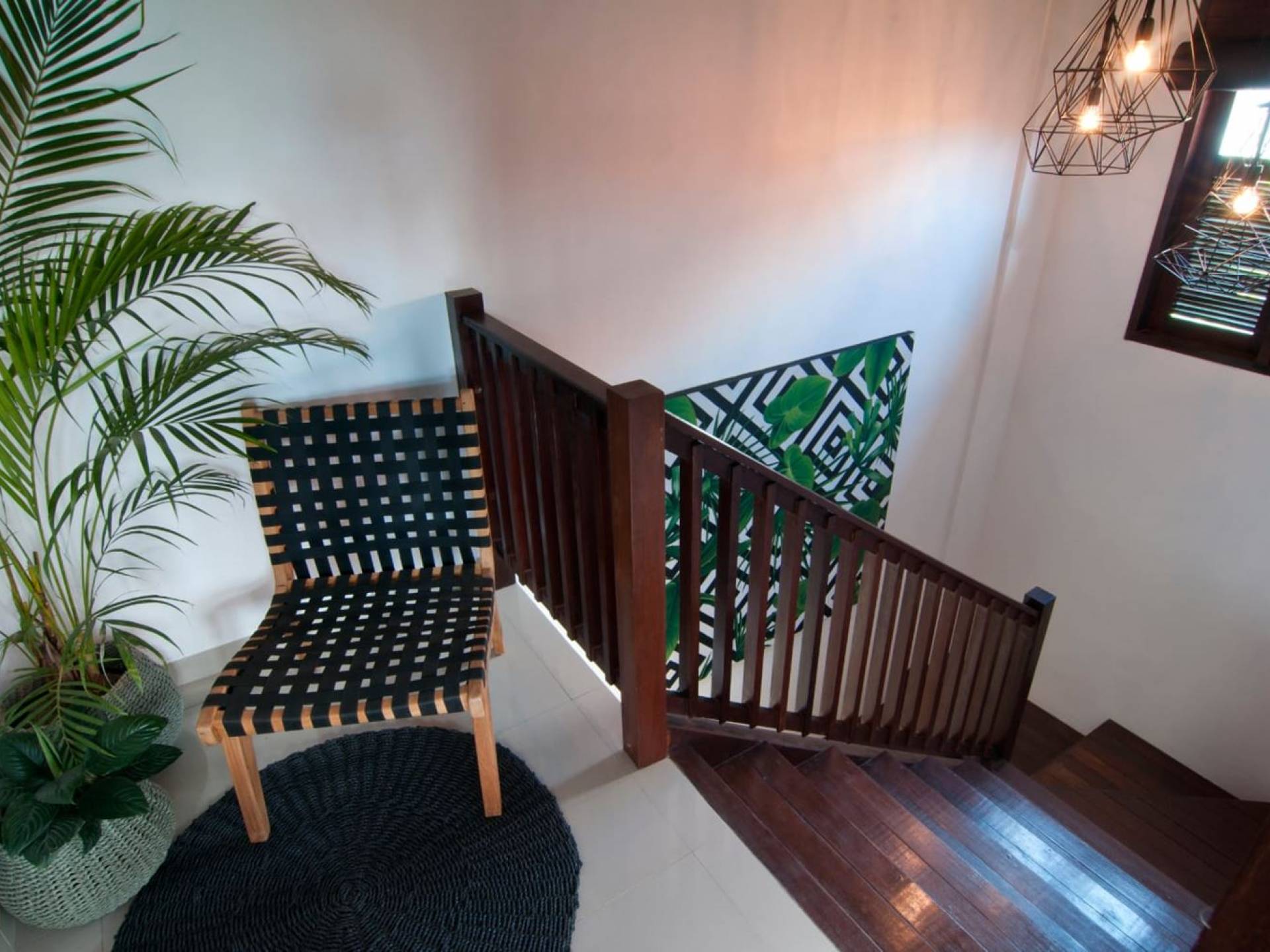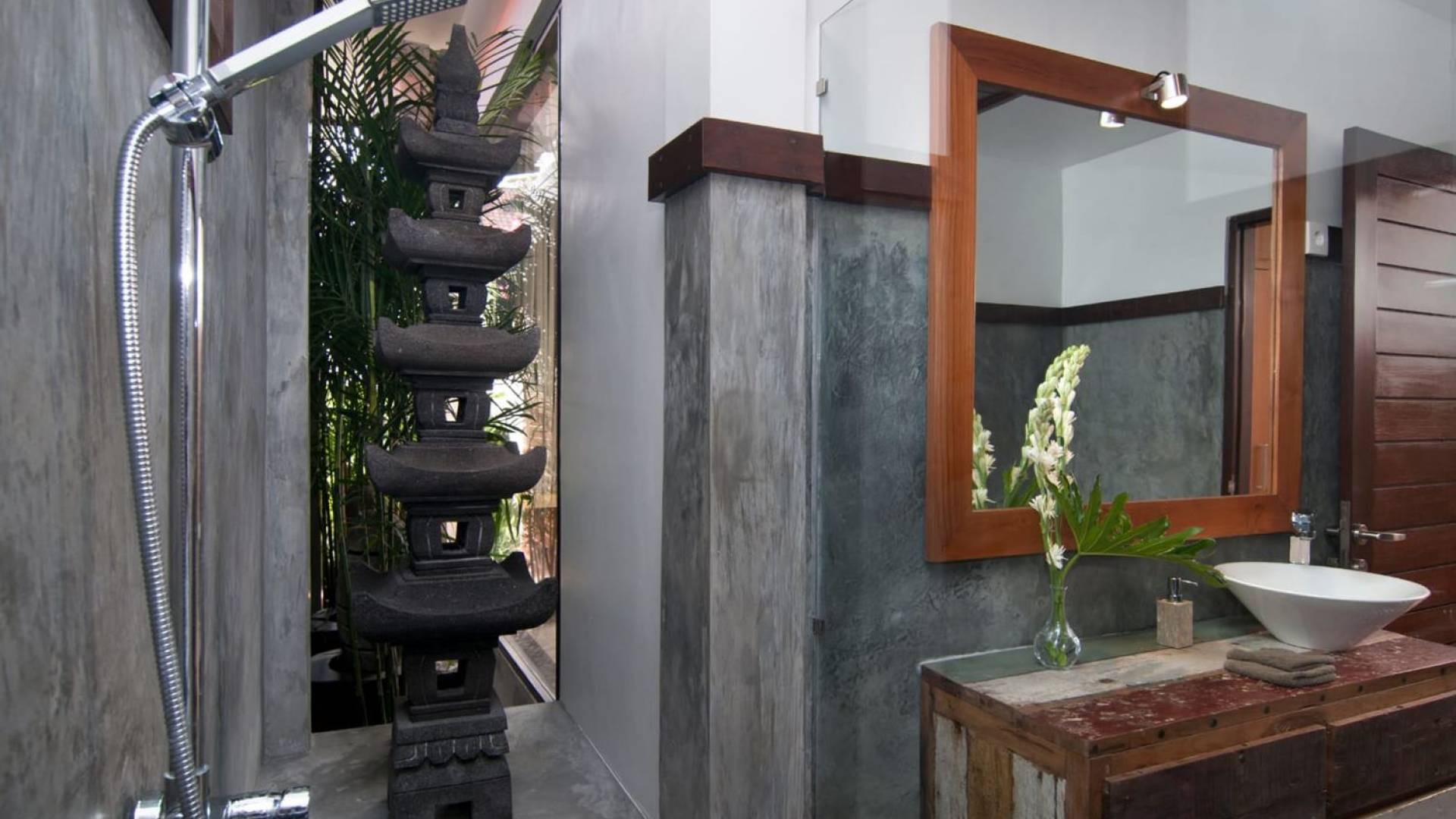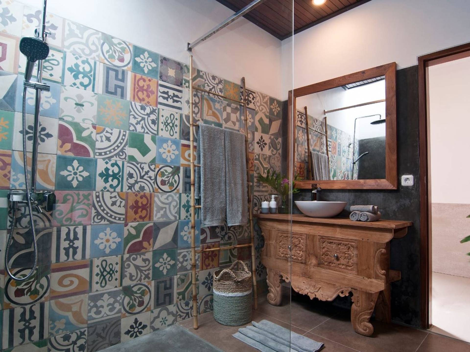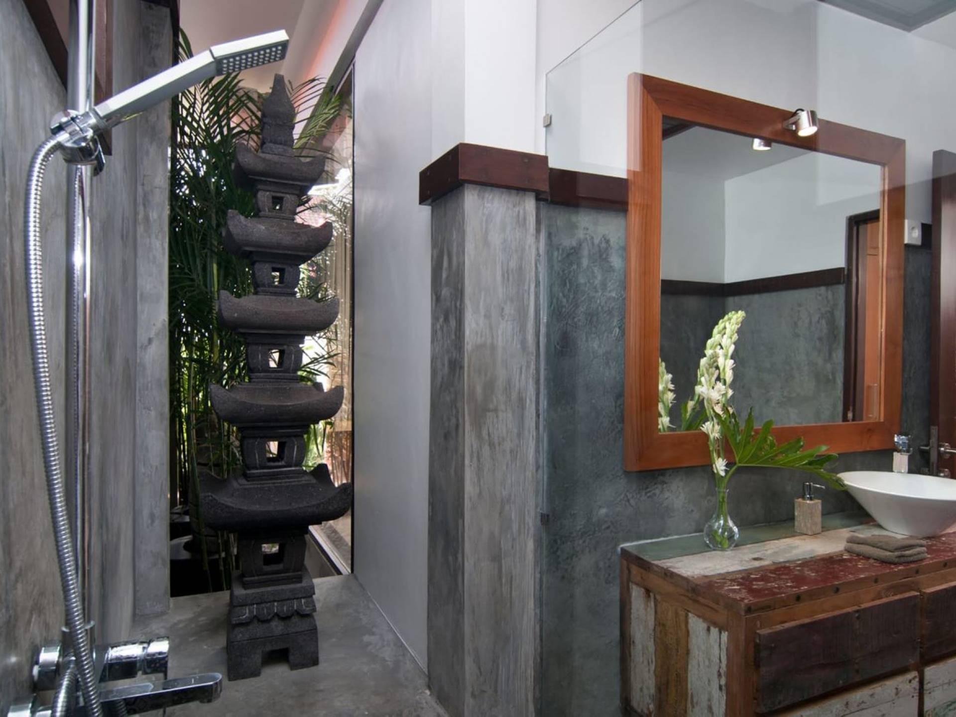 The living space features a timber rooftop equipped with a ceiling fan to provide that extra breeze. The interior design is ruled by gorgeous teak furniture, tropical plants, and tribal artwork. On one side stands a Balinese daybed-style sofa, facing a flat-screen TV with satellite channels and a DVD player. Behind it stands a timber dining table accompanied by 6 stylish designers chairs. The open kitchen is equipped with more than needed, including an oven, fridge, pots & pans, a microwave, water heater, a blender, and a toaster. The kitchen also features a bar and 3 stools to sit and have coffee in the morning or at any time of the day. The garden has all the features of a tropical oasis with plants and trees growing lushly around the inviting natural tiled swimming pool. At one end, guests can sunbathe on the two reclining chairs and if the heat gets too much for you, simply open the parasol to create a nice shady spot to read a book or take a little daytime nap.